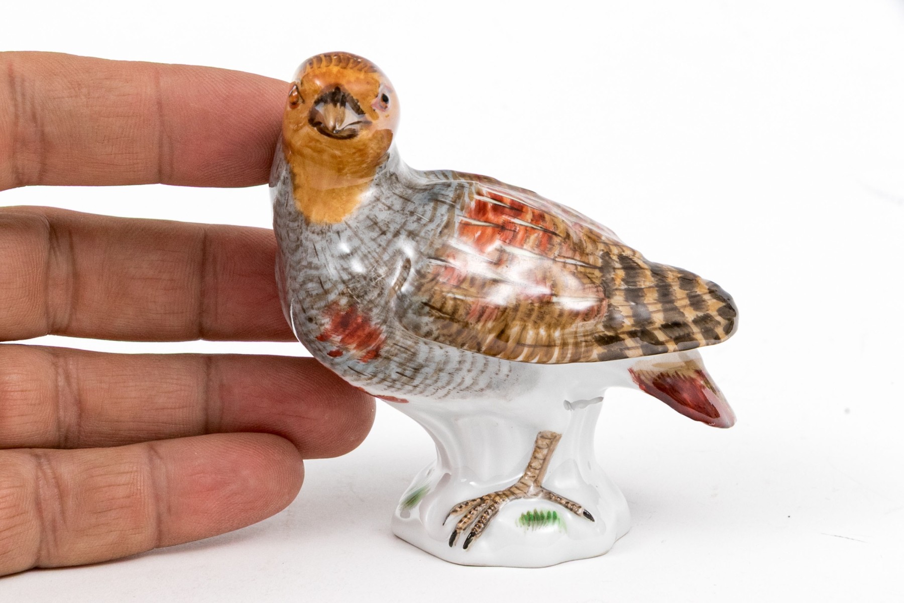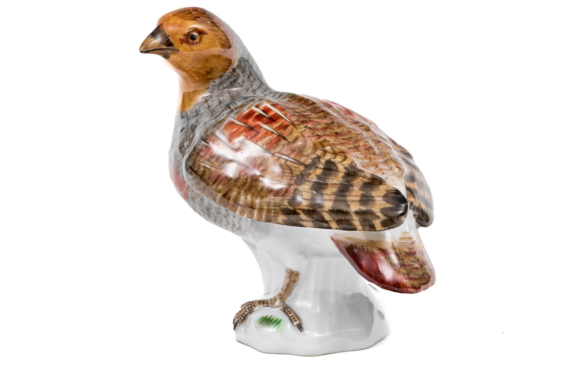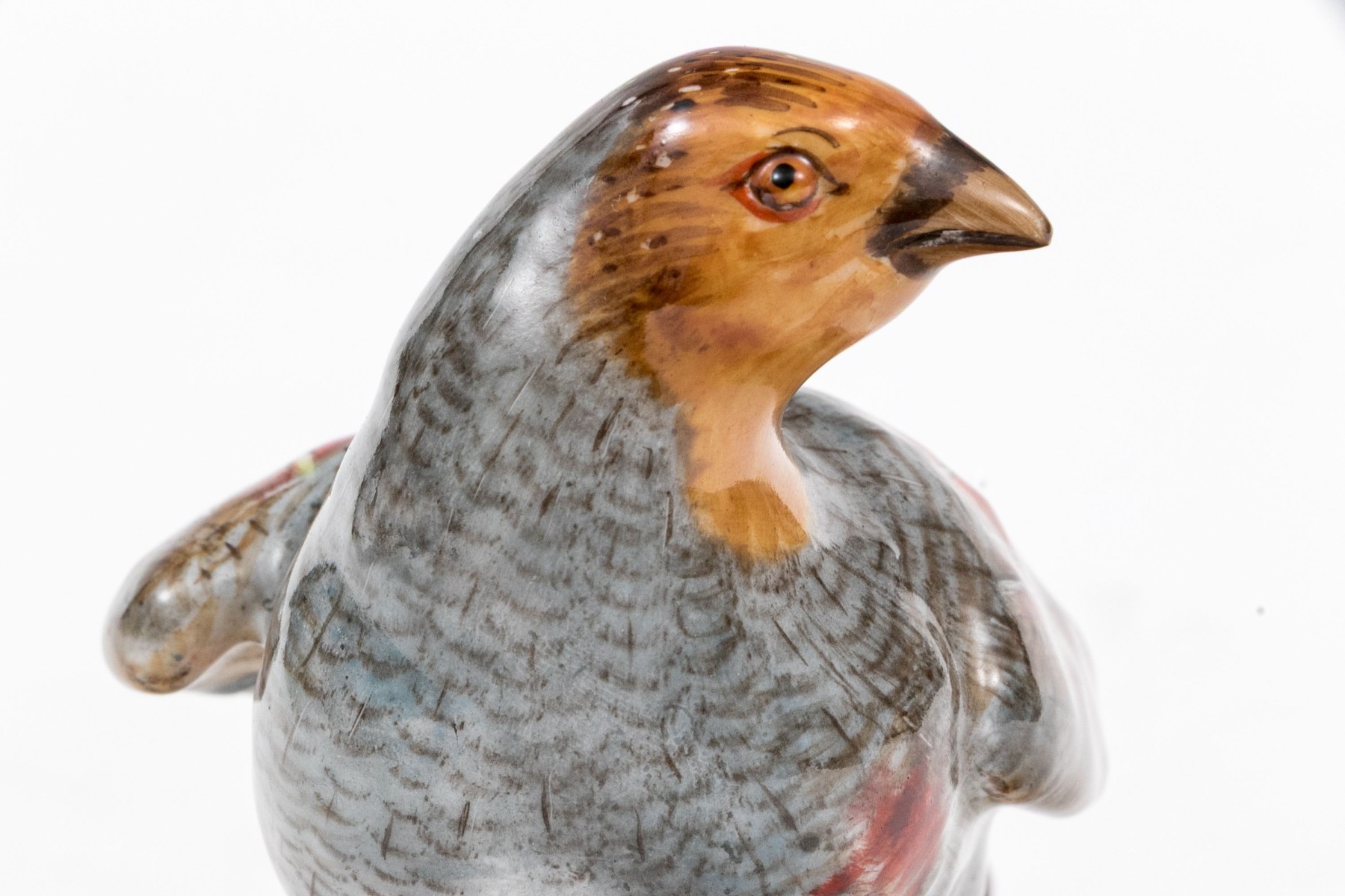 The fabulously depicted German Meissen hand-painted porcelain game bird is depicted atop a base with painted grass blades. The bird features wonderfully naturalistic polychrome painted decoration featuring hues of brown, red and greys.