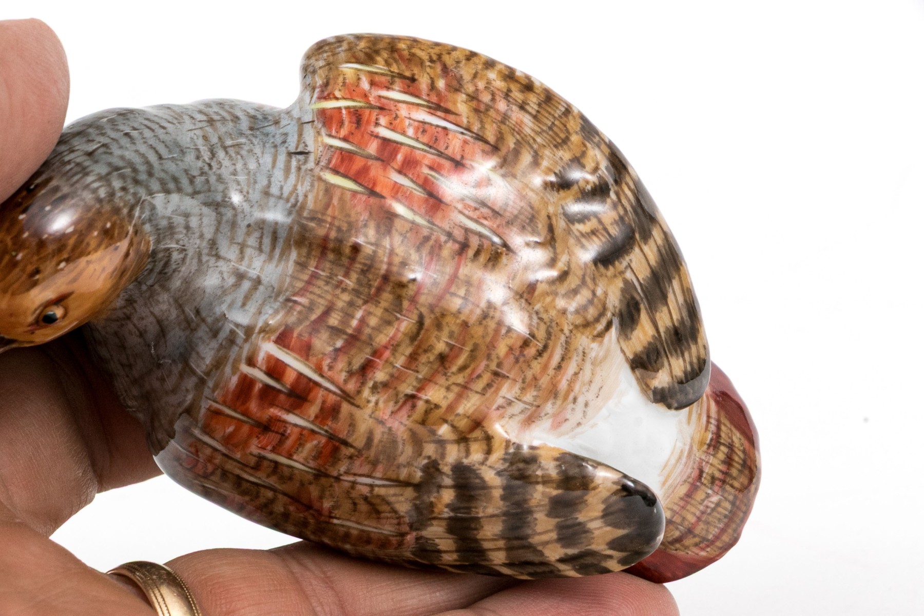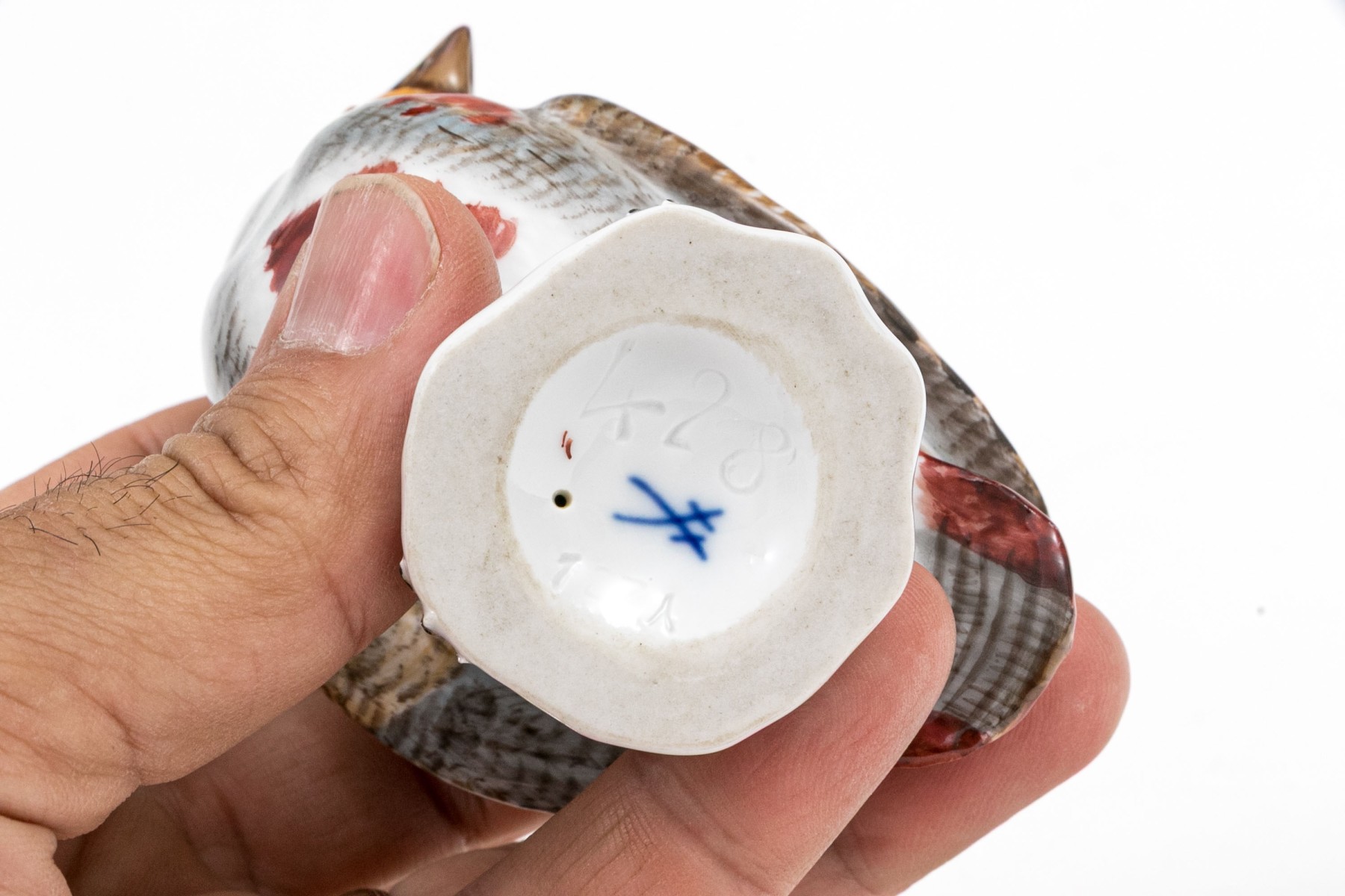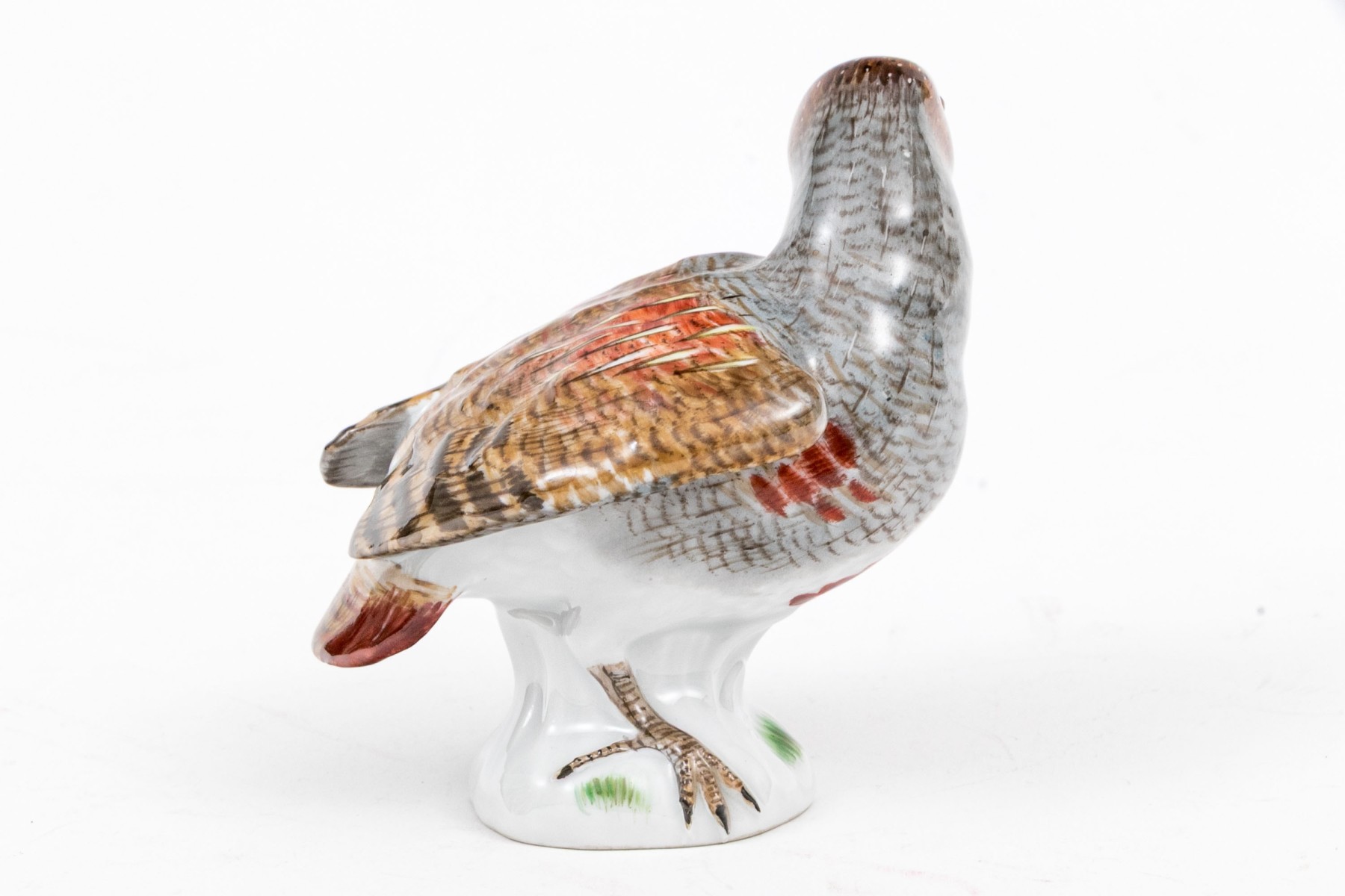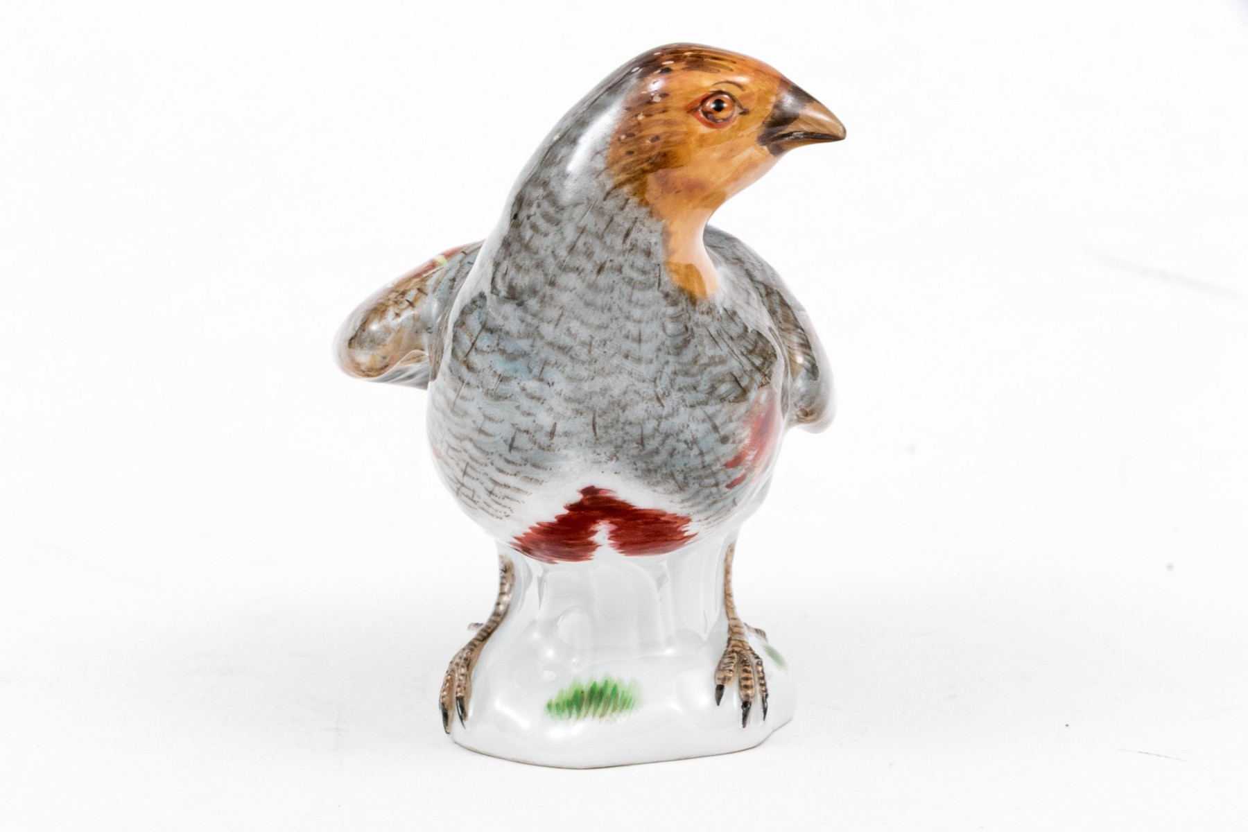 The fabulously depicted German Meissen hand-painted porcelain game bird is depicted atop a base with painted grass blades. The bird features wonderfully naturalistic polychrome painted decoration featuring hues of brown, red and greys.