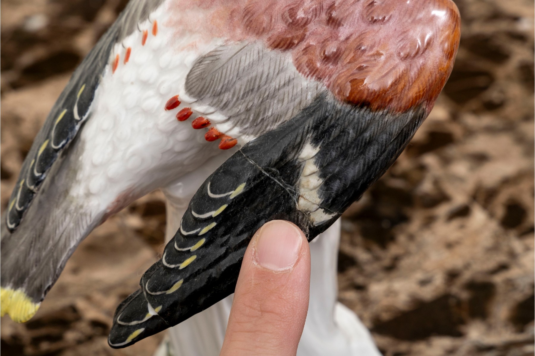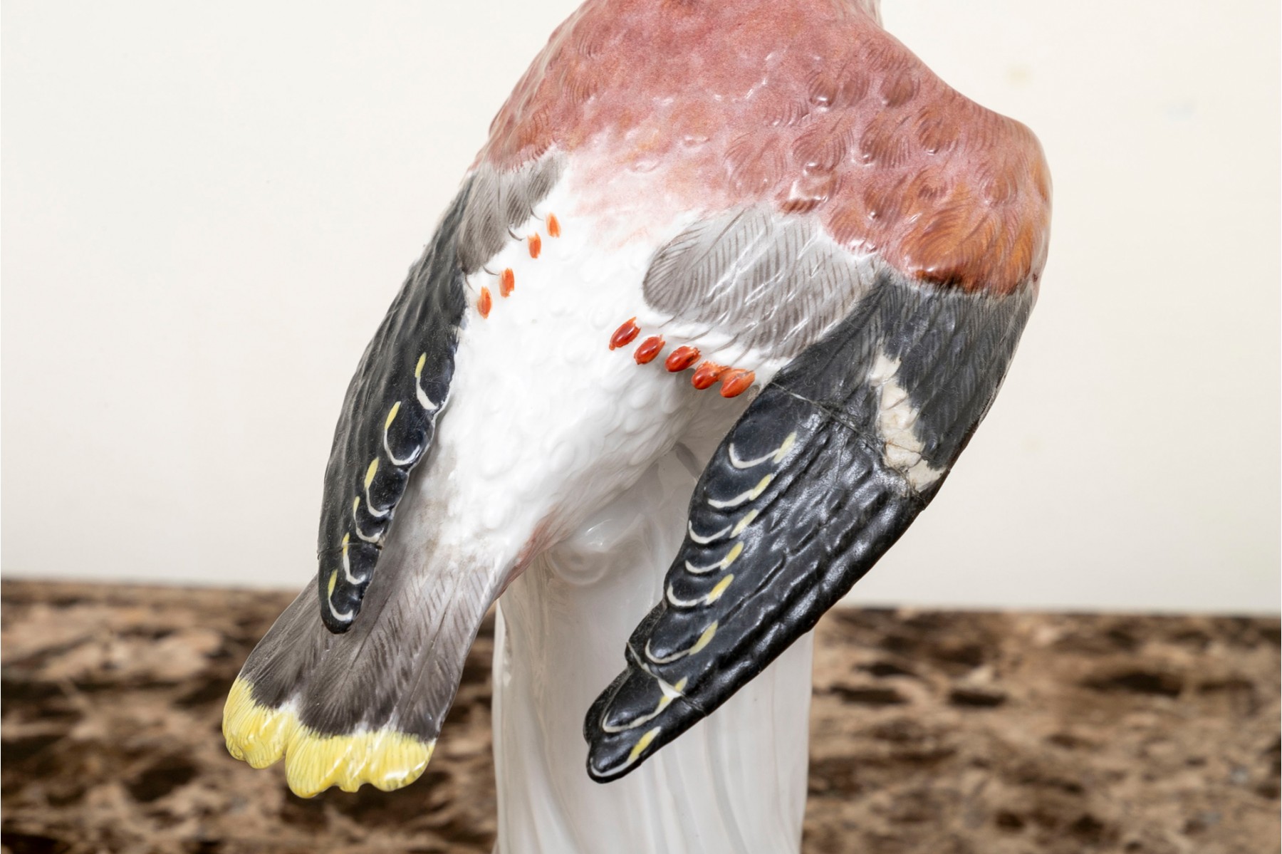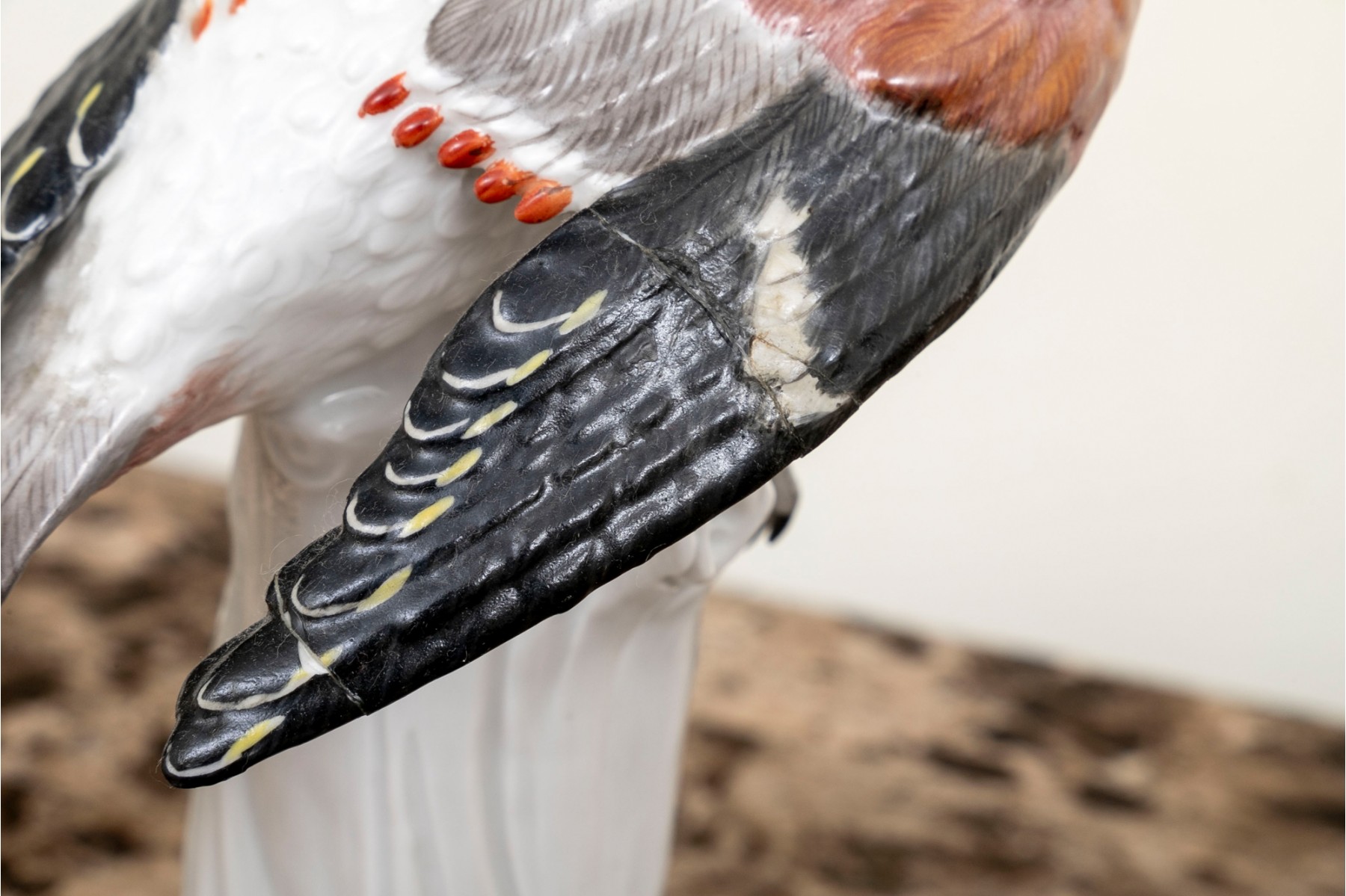 Condition: The bird's wing has been previously broken and repaired in two places, the mid wing and tip of wing. Both old repairs appear quite stable. Wear is commensurate with age and use.