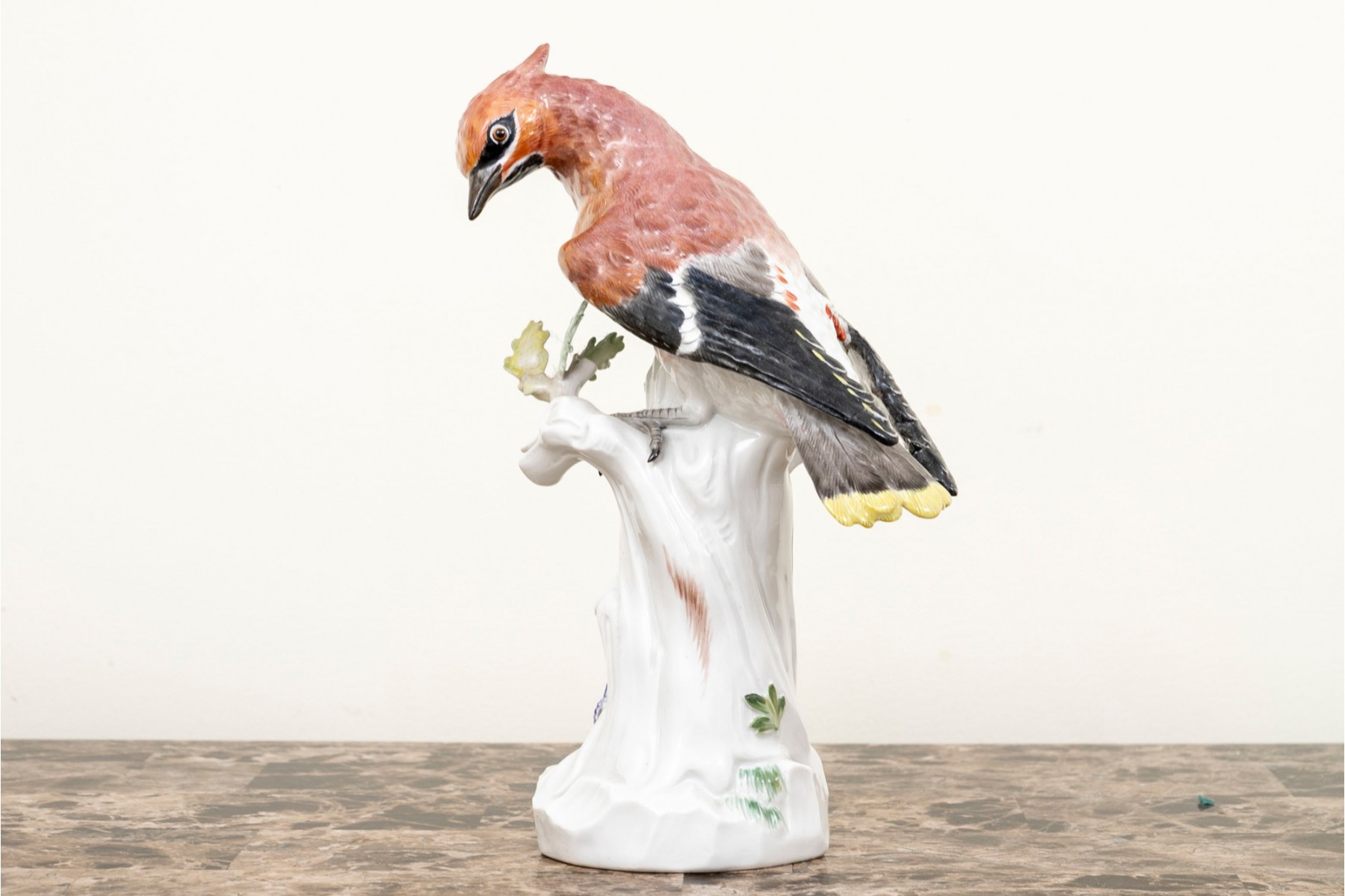 A hand painted polychrome bird looking down and perched on a white tree from stump with foliate.