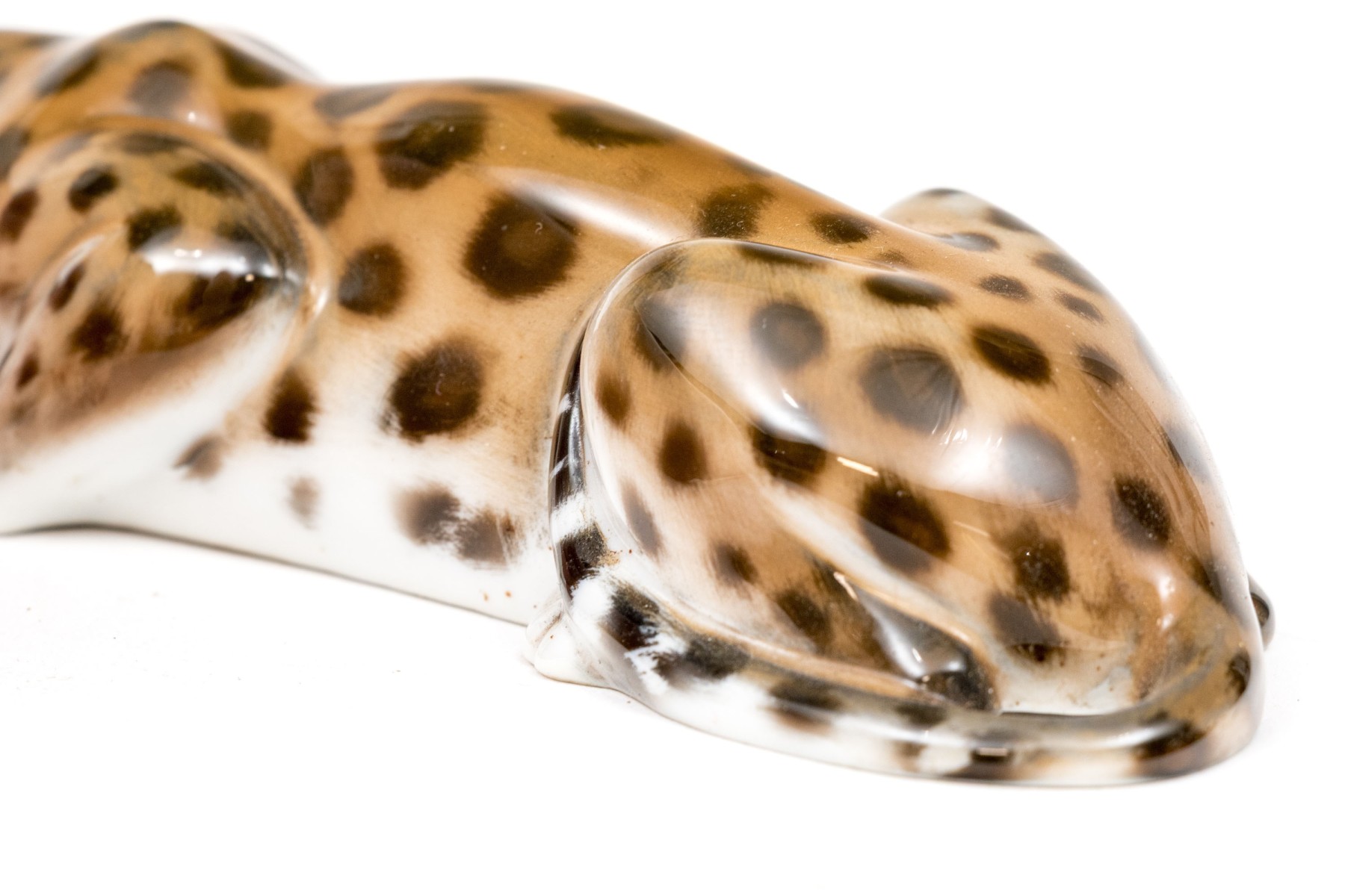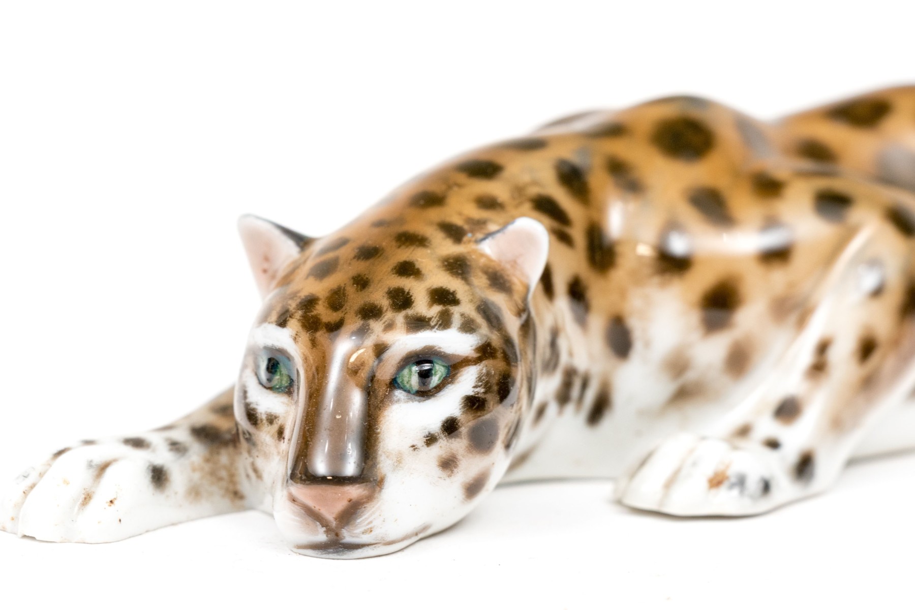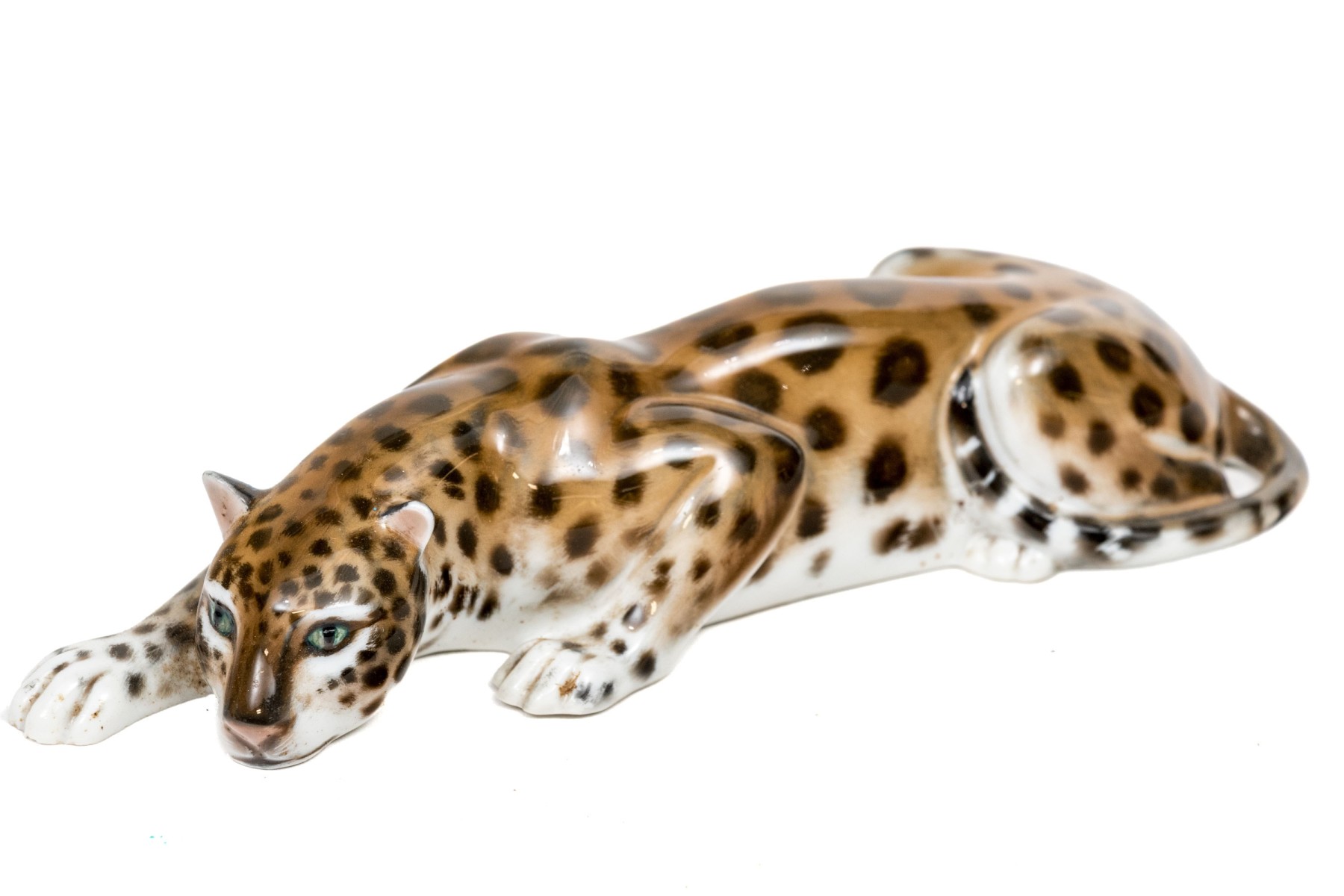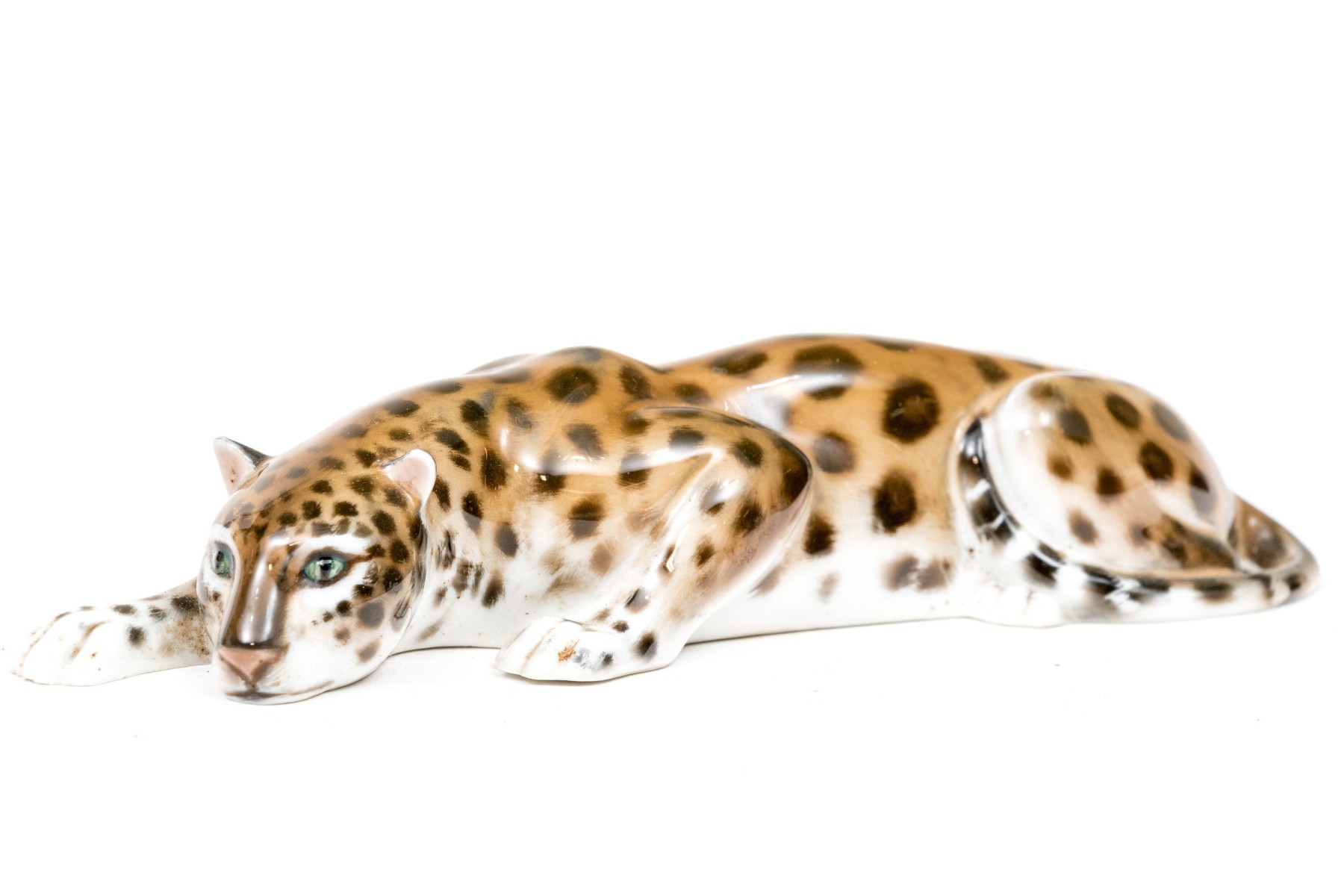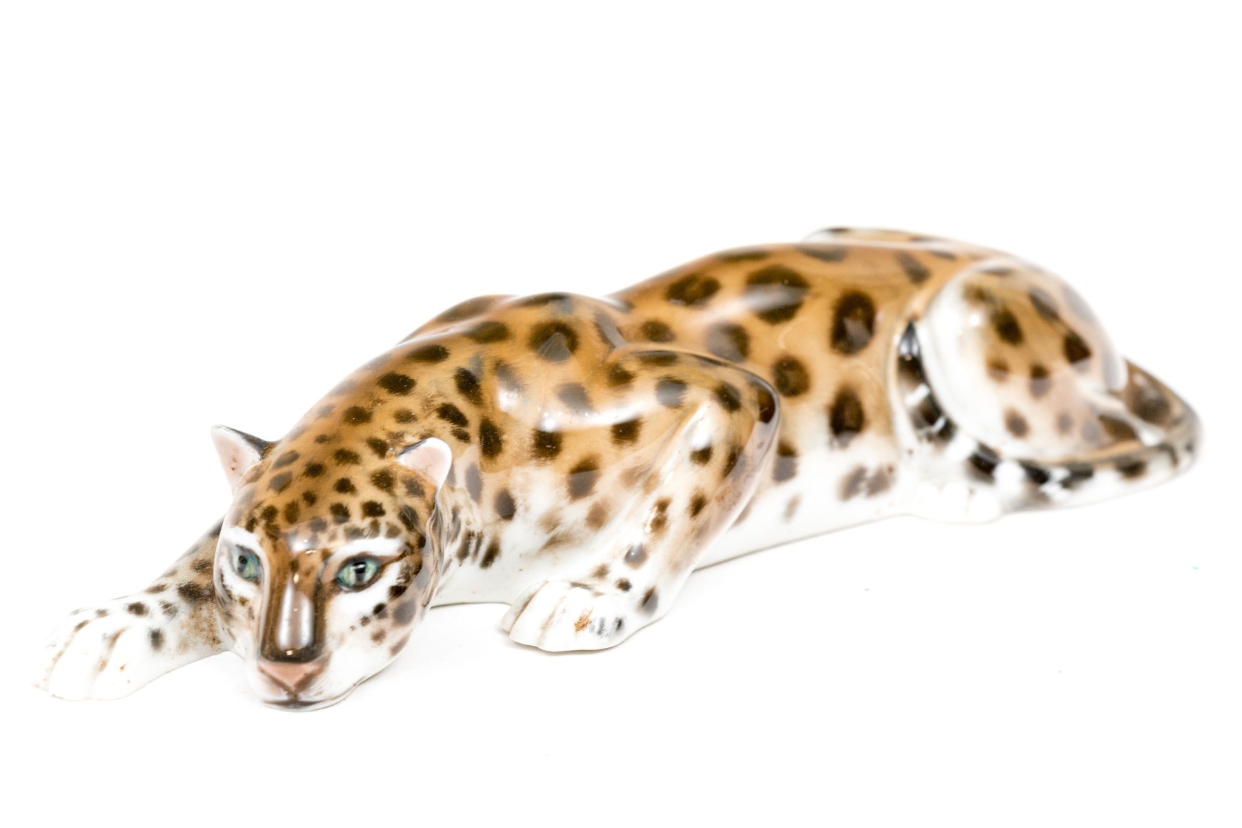 porcelain figurine of a leopard posed stalking low to the ground with front paws crouched full of energy. The leopard rests its chin on the ground, attentive with eye-catching green eyes. Beautifully hand-detailed in soft, warm-toned brown over white with dark brown spots. Marked underfoot.