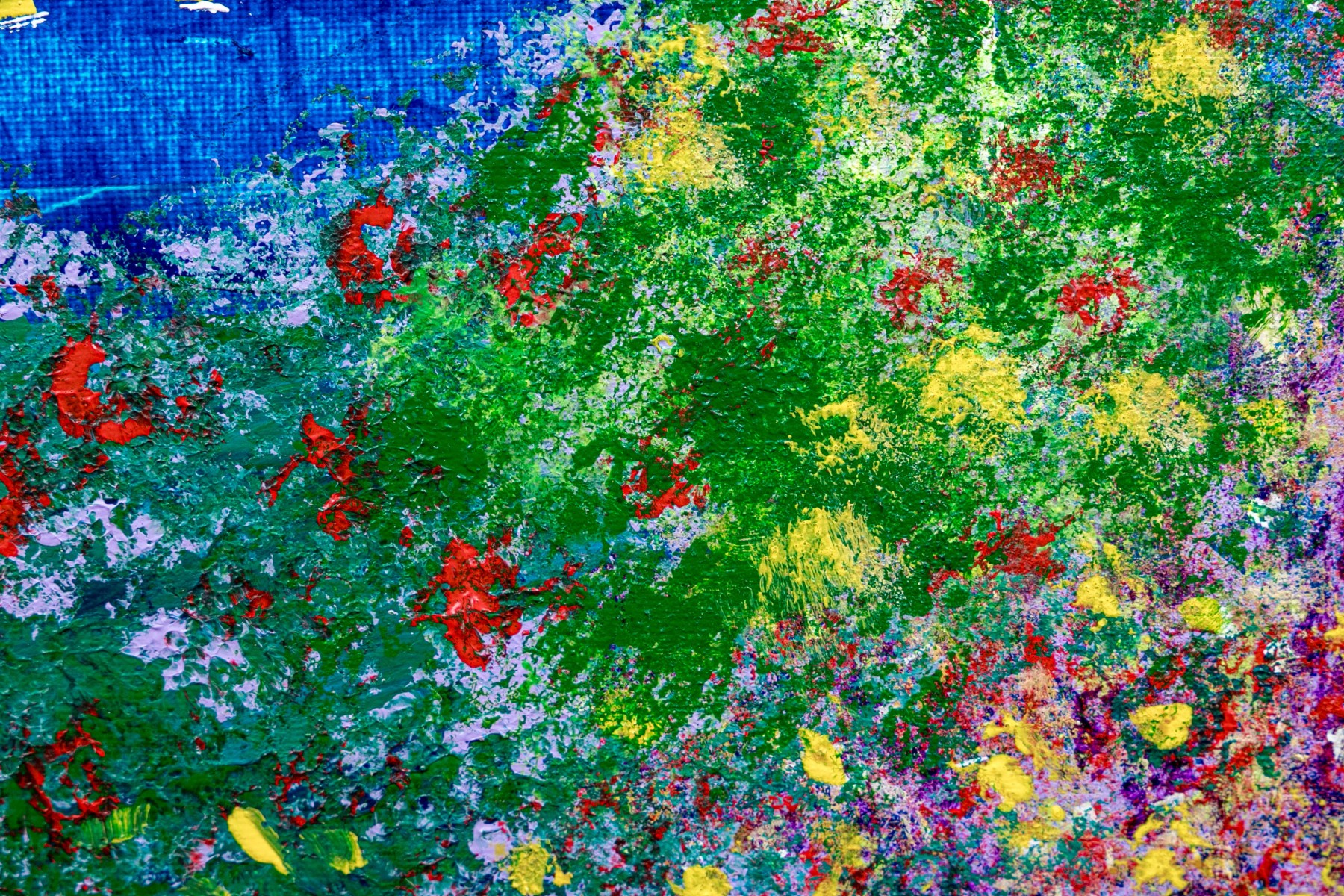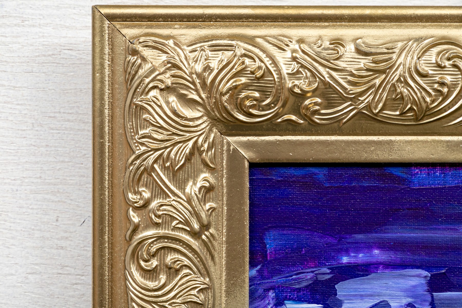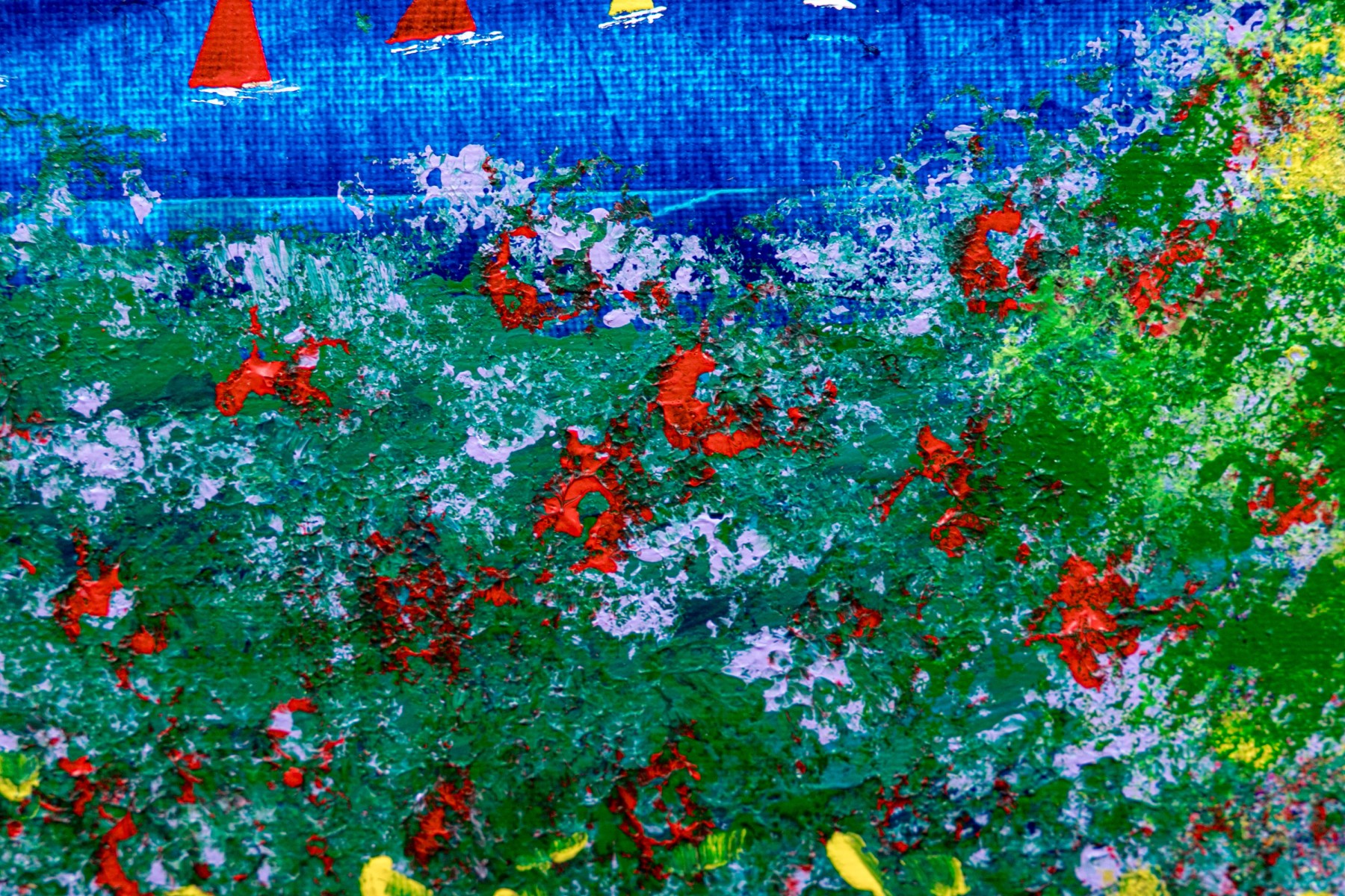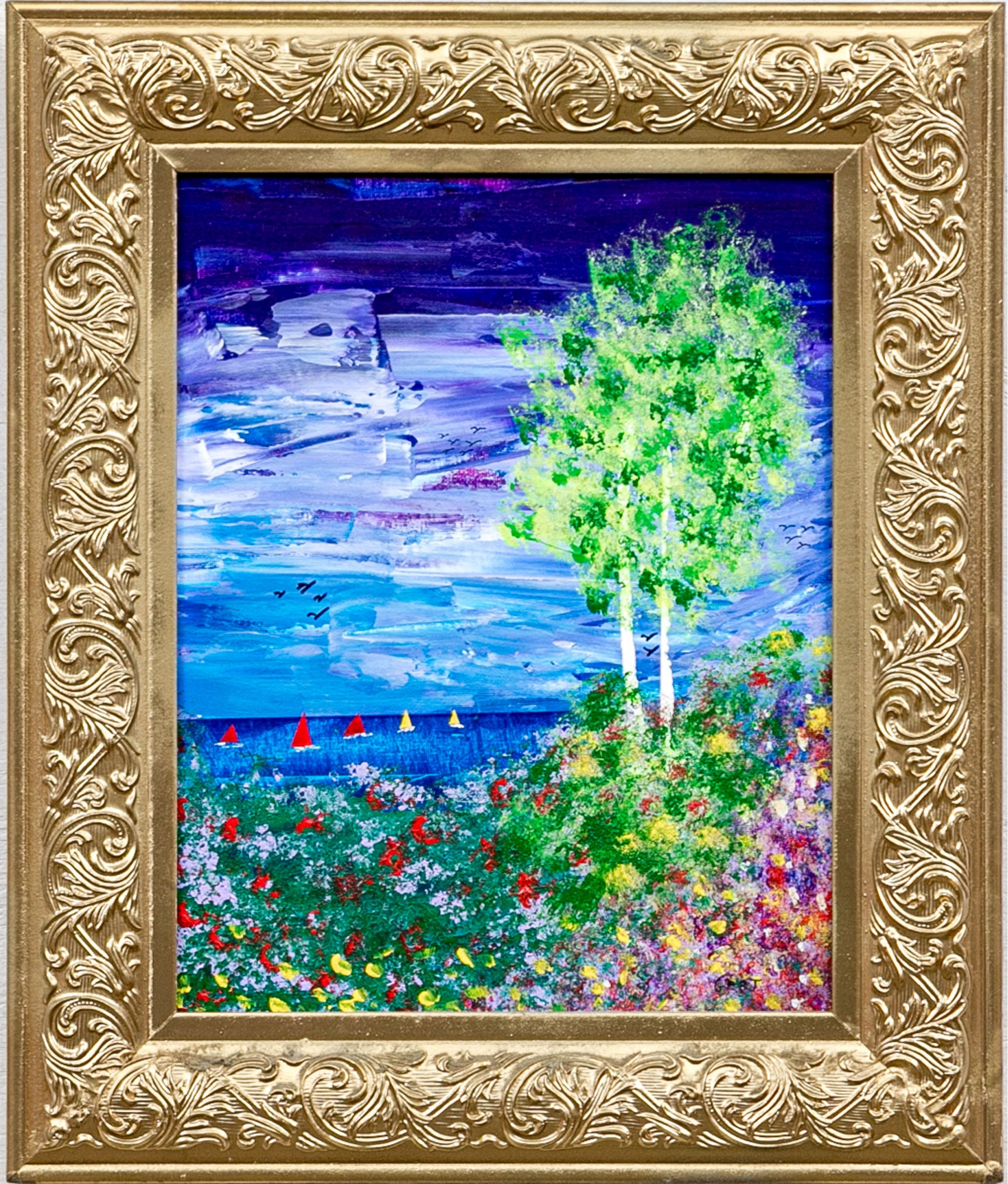 Signed lower right and on verso. One of the artist's iconic landscapes with tiny sailboats on the sea in the distance under purple skies. With a flower filled landscape dominated by two tall trees. Presented in a decorative gilt frame.