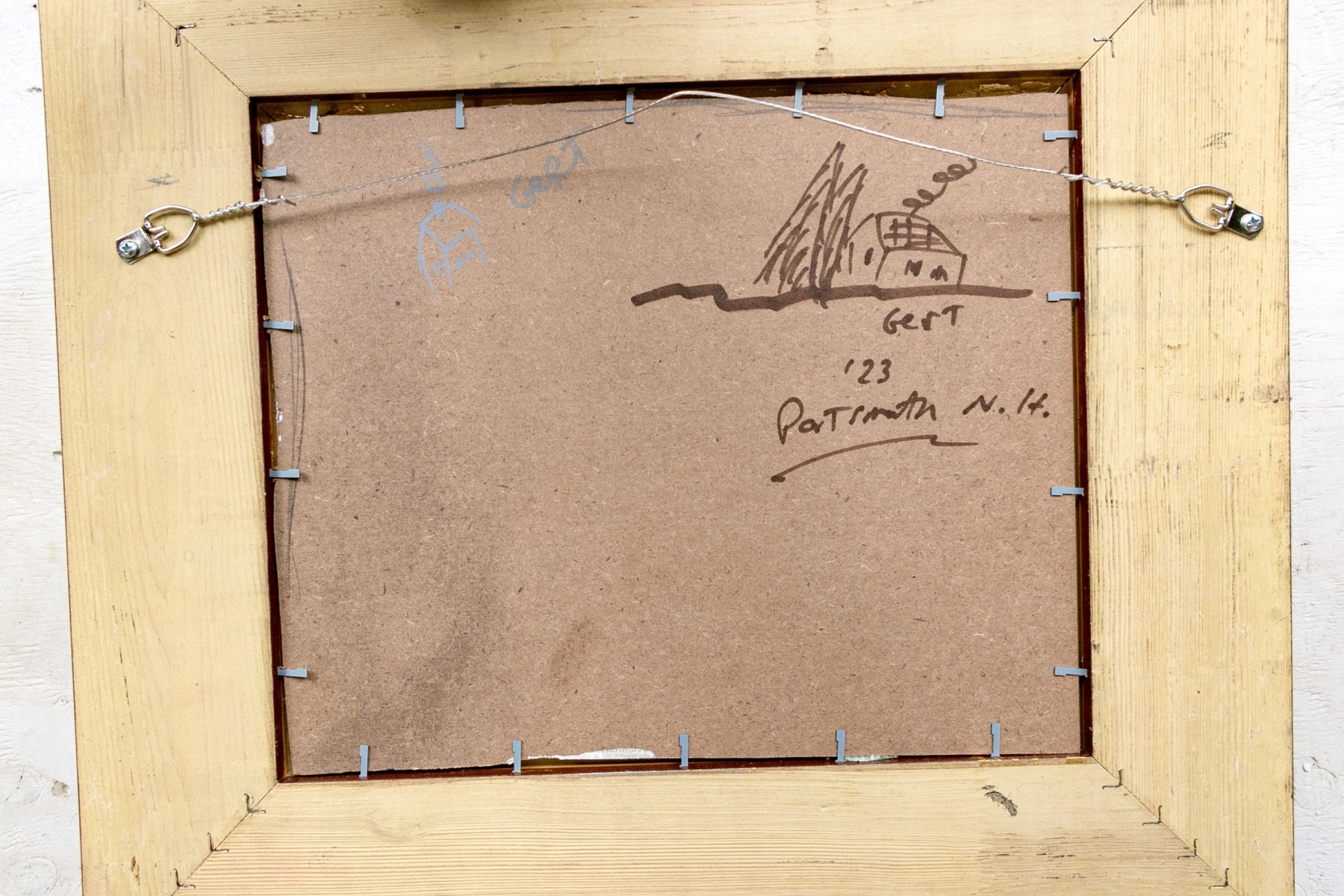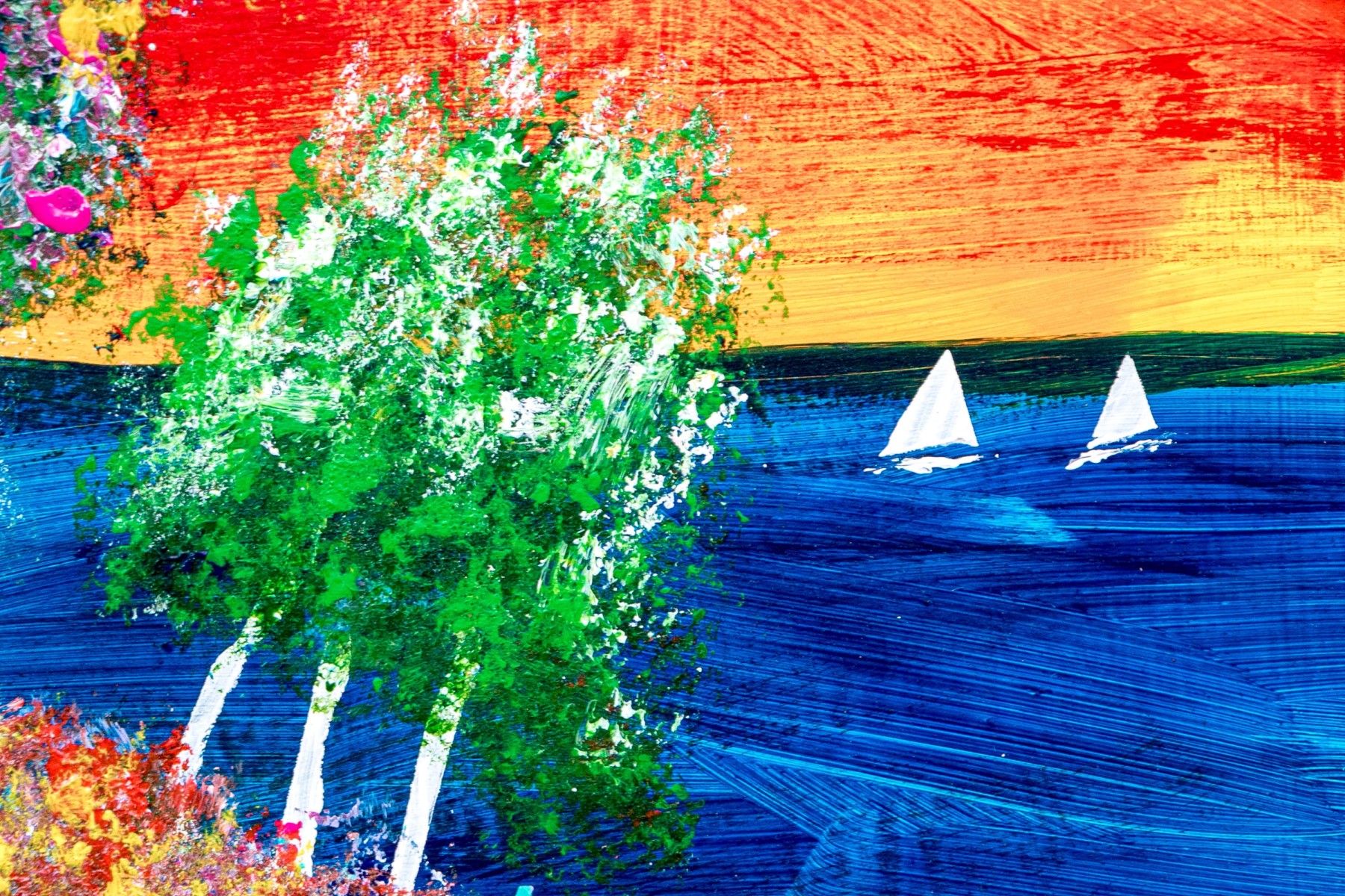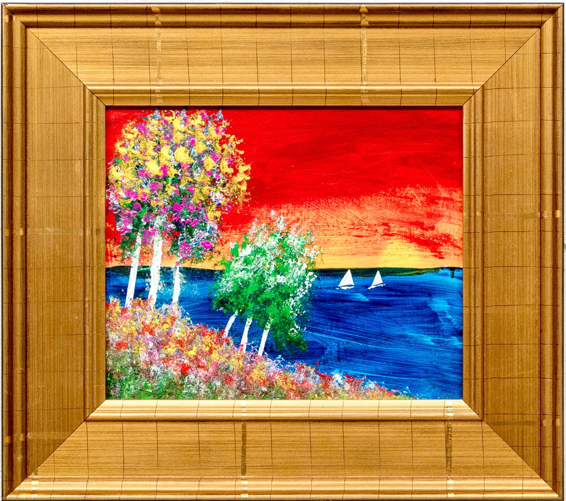 Signed lower left and on verso with date '23, title and sketch of a cottage. One of the artist's classic landscapes with white sailboats off a colorful verdant shore and here under a blazing red sky with the setting sun. Presented in a fine girl frame.