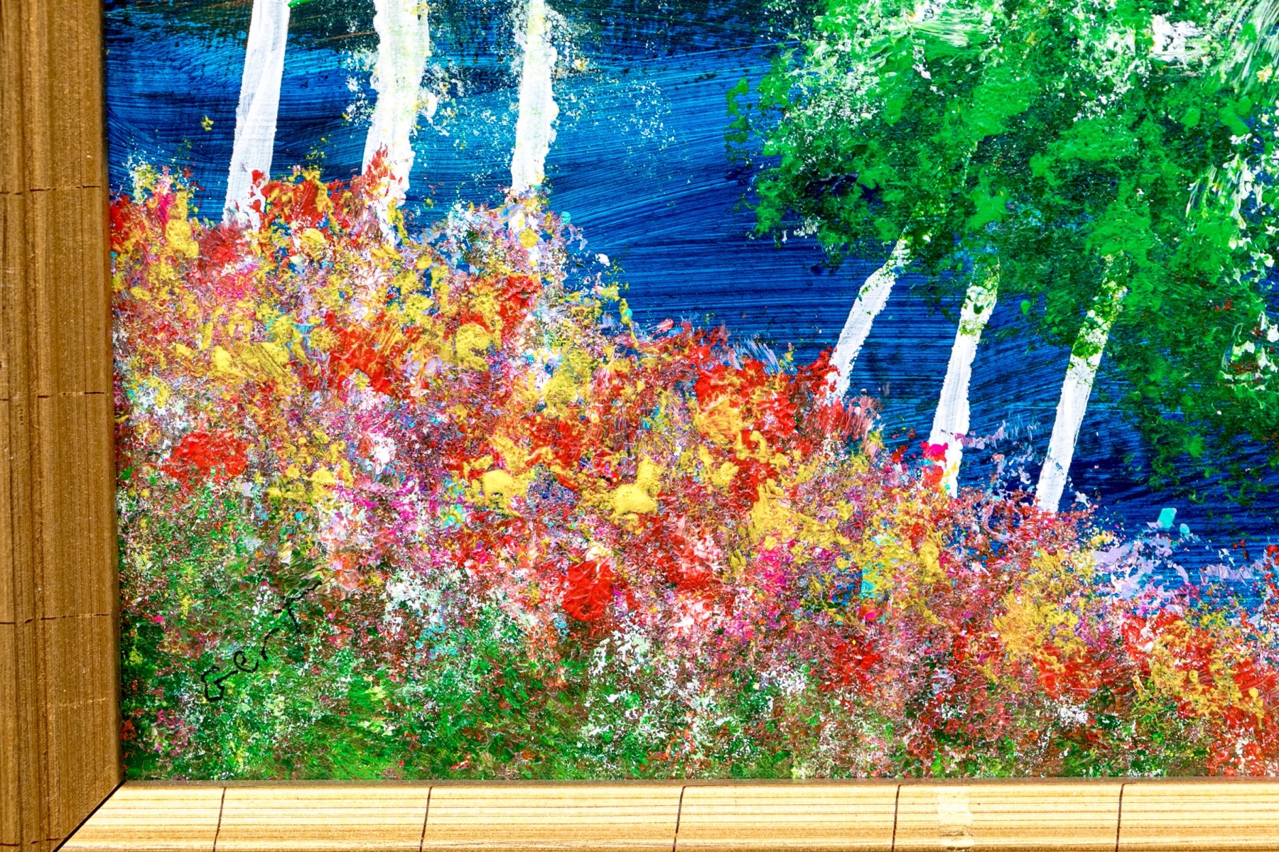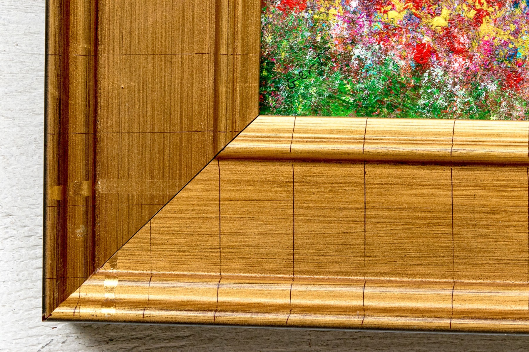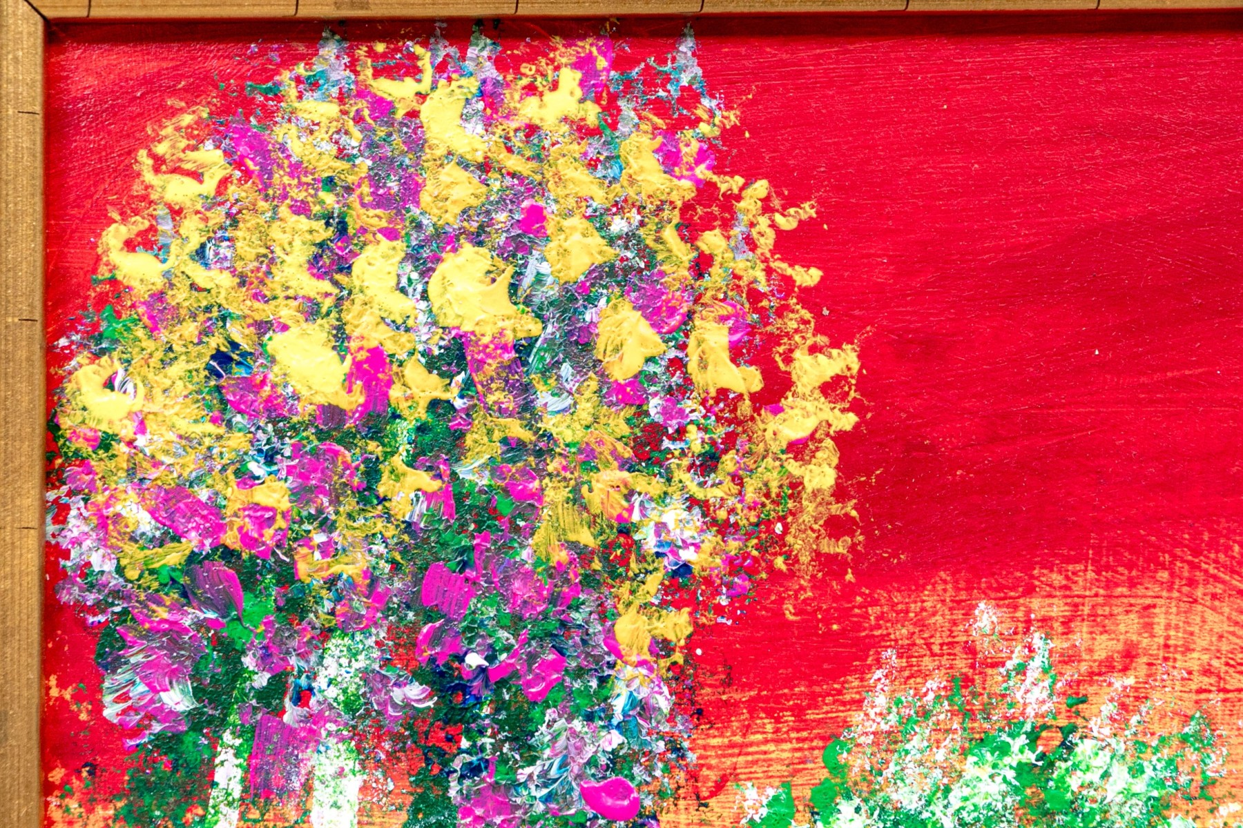 Signed lower left and on verso with date '23, title and sketch of a cottage. One of the artist's classic landscapes with white sailboats off a colorful verdant shore and here under a blazing red sky with the setting sun. Presented in a fine girl frame.