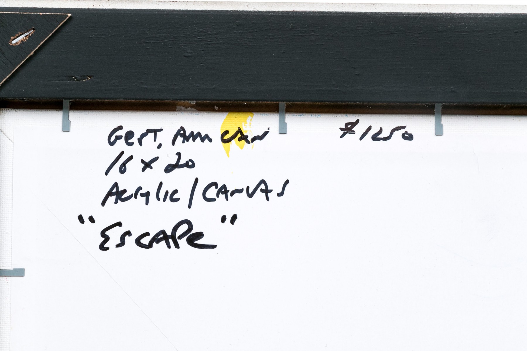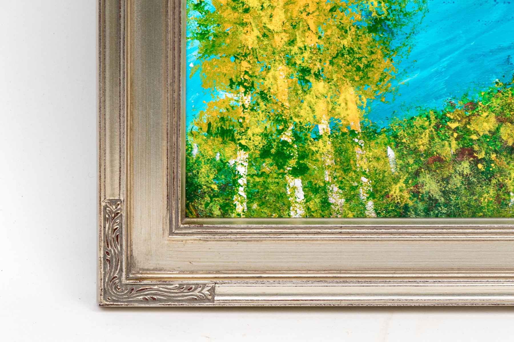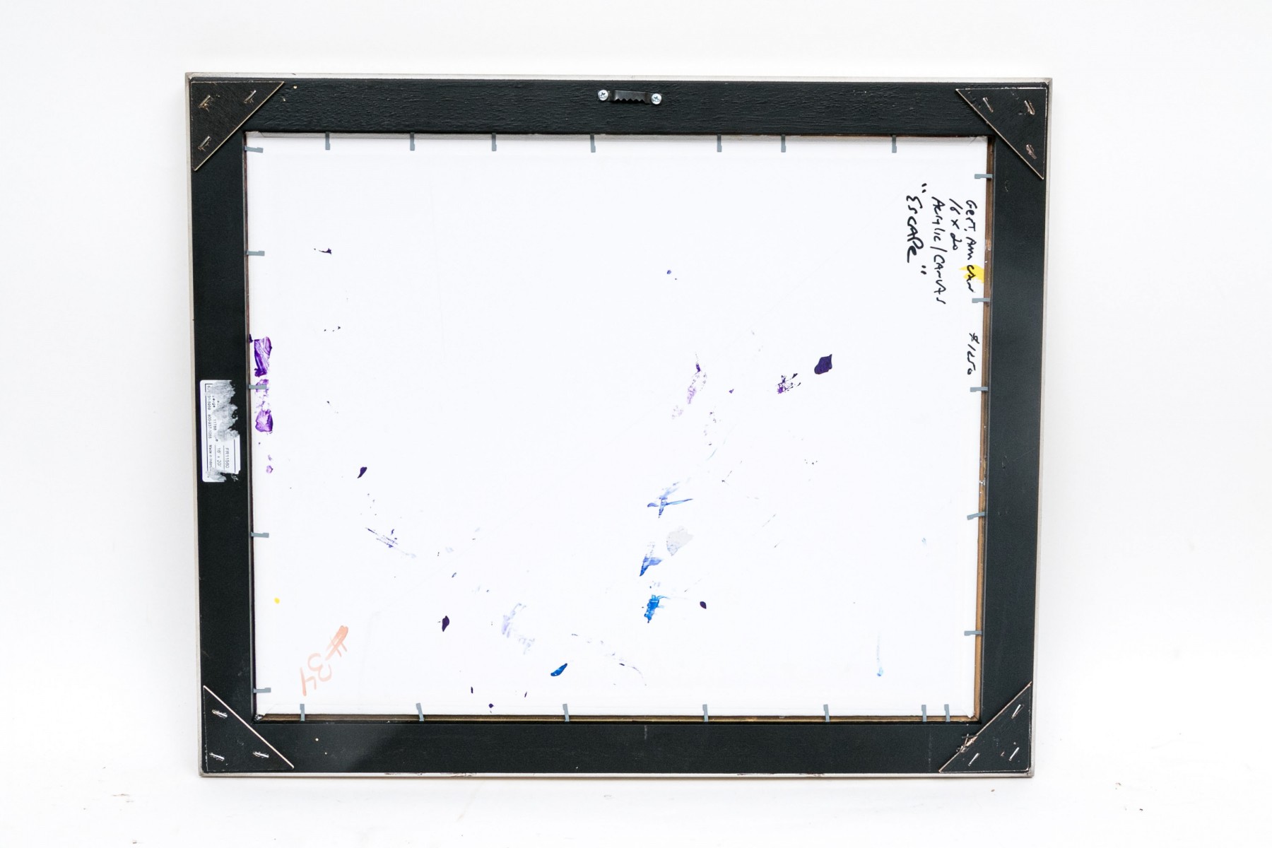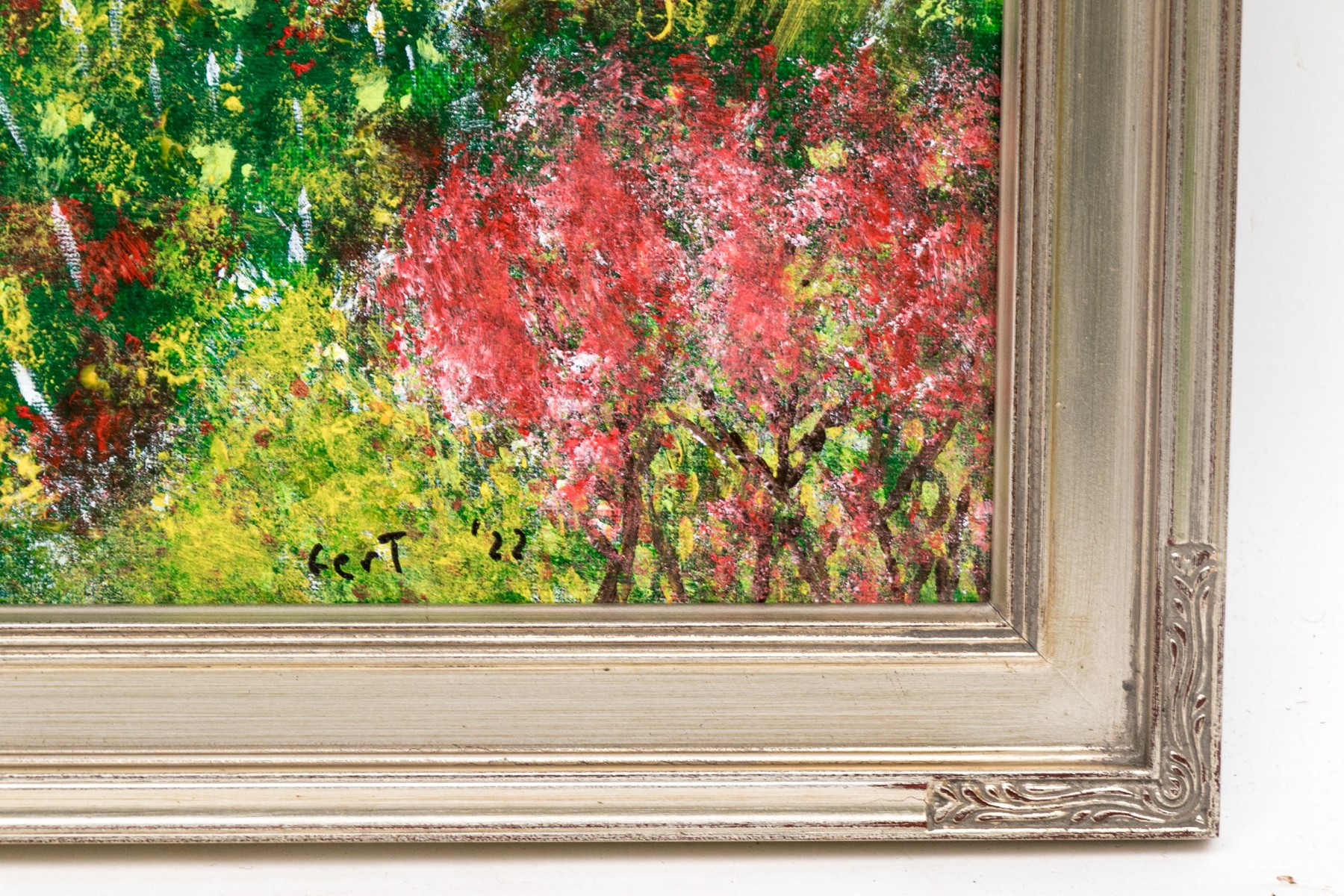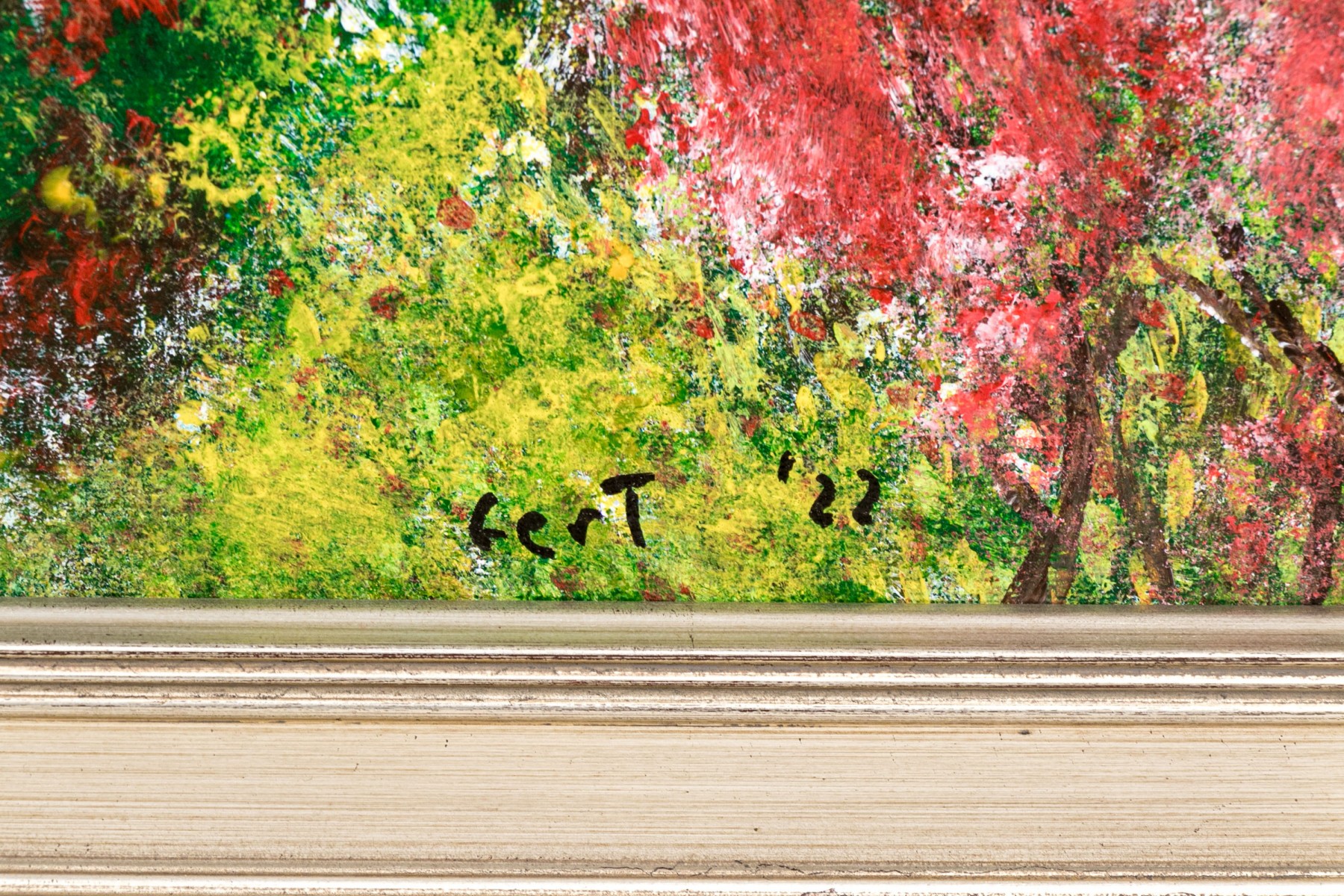 Signed and dated '22 lower right. Signed with the title "Escape" on verso. One of his flaming artworks with red skies above white sailboats on the water in a lush green and flowery landscape. Presented in a silver gilt frame with foliate decorated corners.