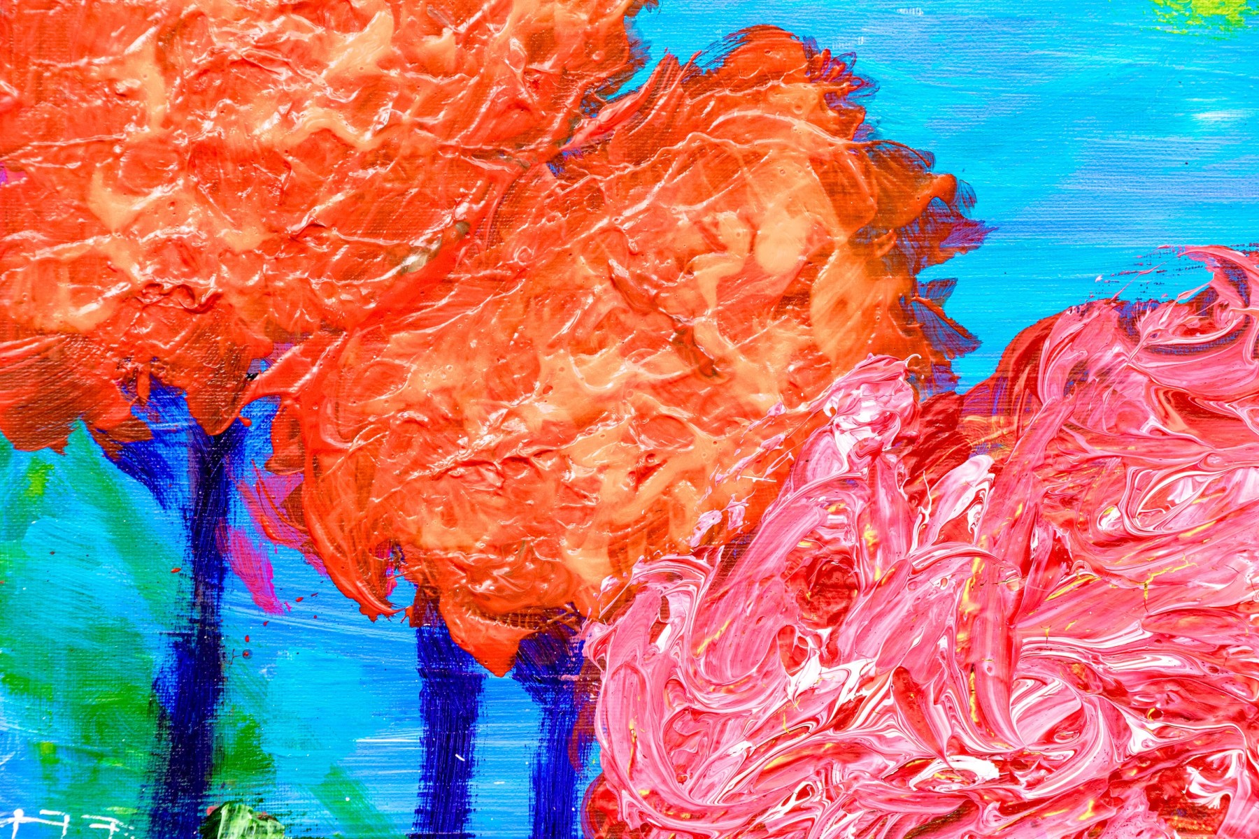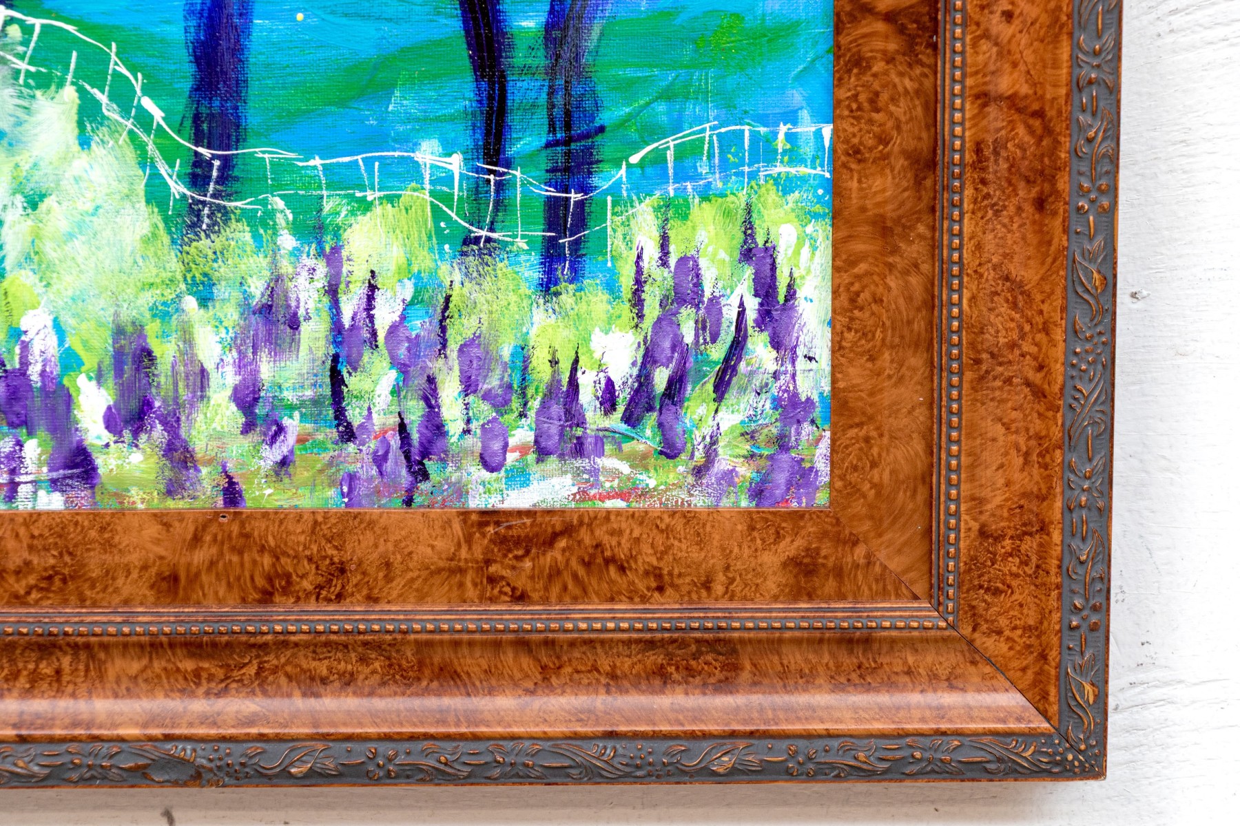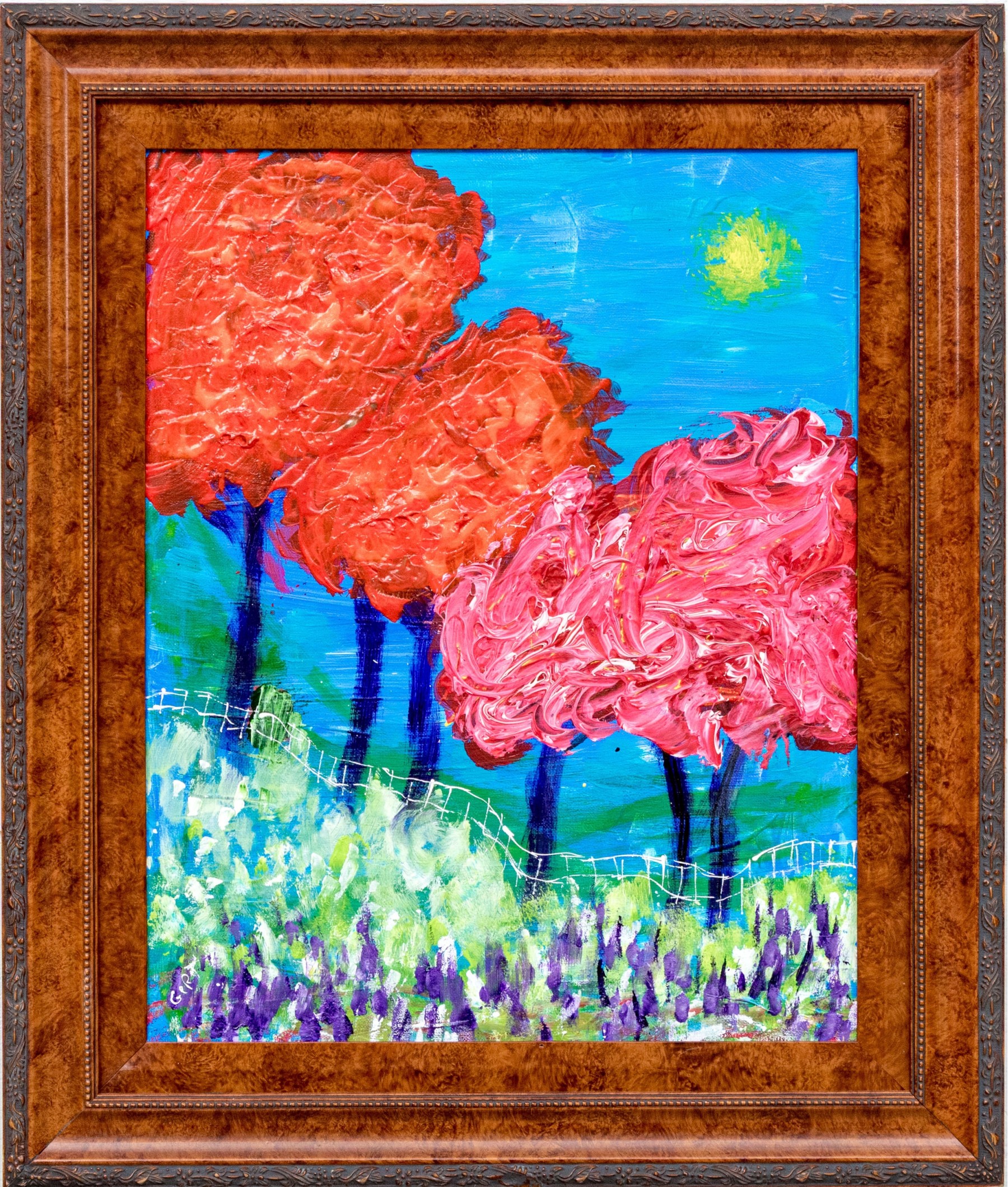 Signed lower left in white, additionally signed, dated and titled with a small drawing on verso to canvas. The acrylic on canvas depicts an Expressionist style landscape with red and pink tree foliage with thick impasto lending depth. A white fence traverses the landscape with wild flowers including purple flowers along the lower trim.