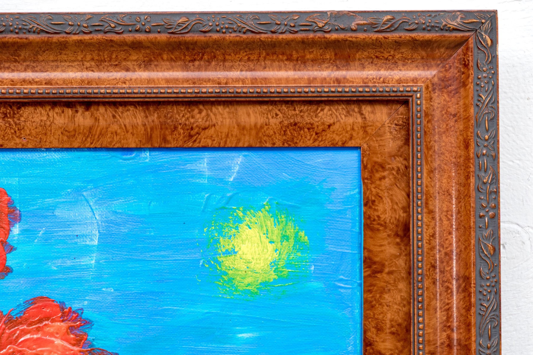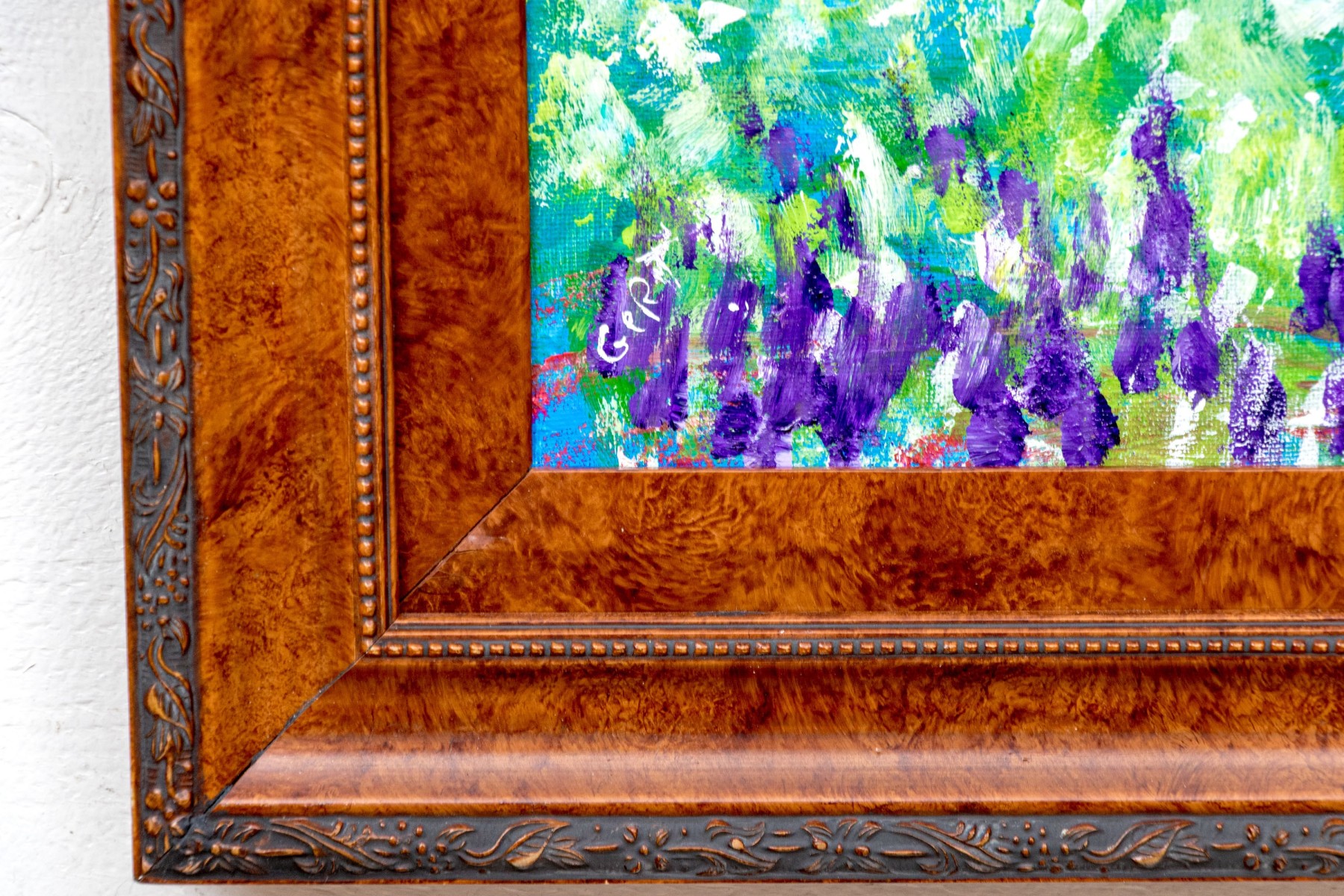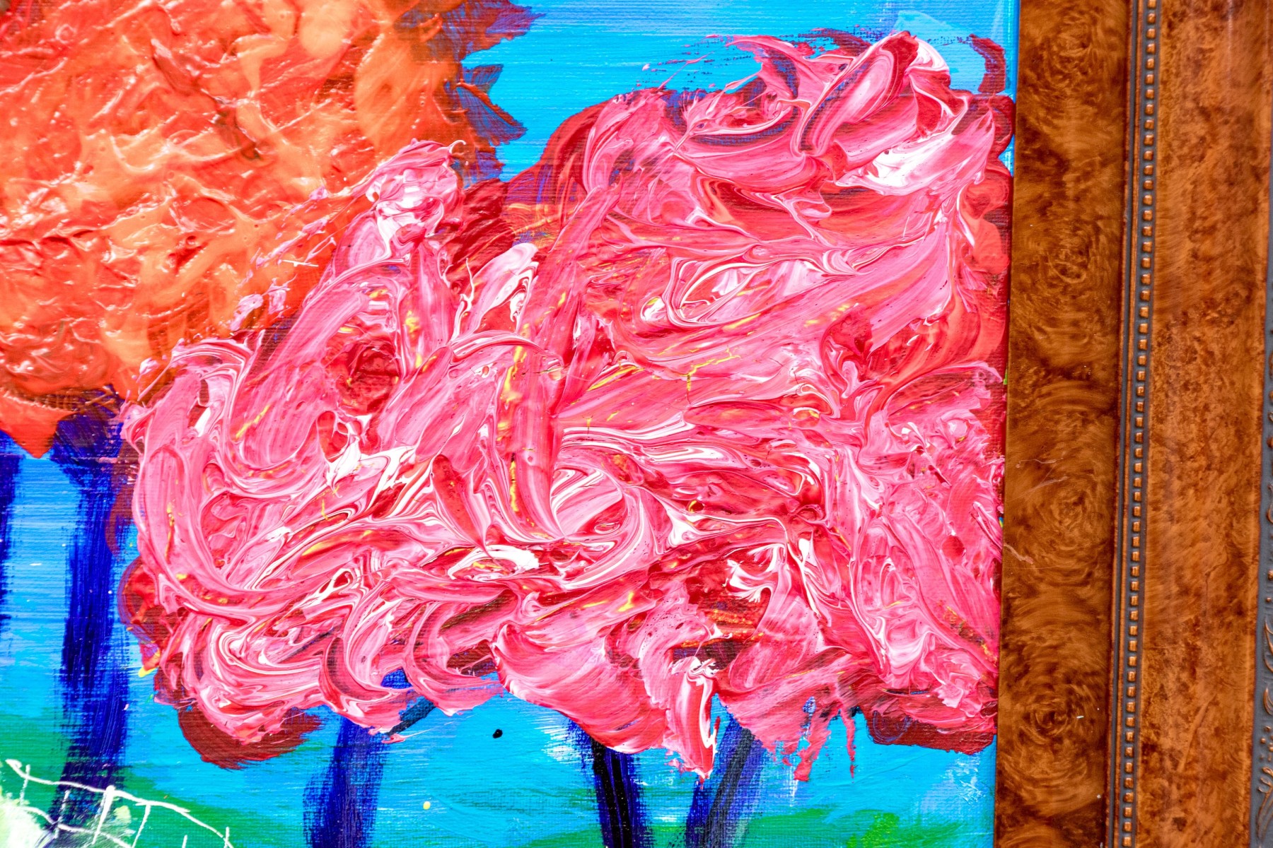 Signed lower left in white, additionally signed, dated and titled with a small drawing on verso to canvas. The acrylic on canvas depicts an Expressionist style landscape with red and pink tree foliage with thick impasto lending depth. A white fence traverses the landscape with wild flowers including purple flowers along the lower trim.