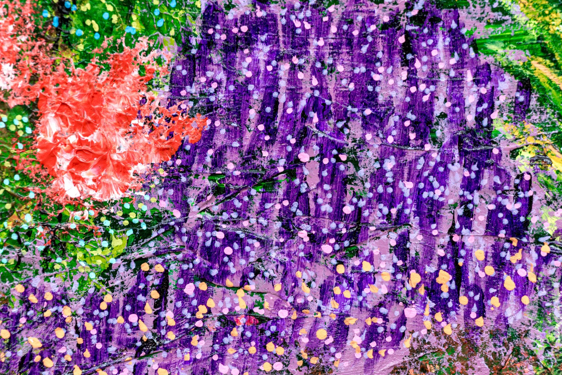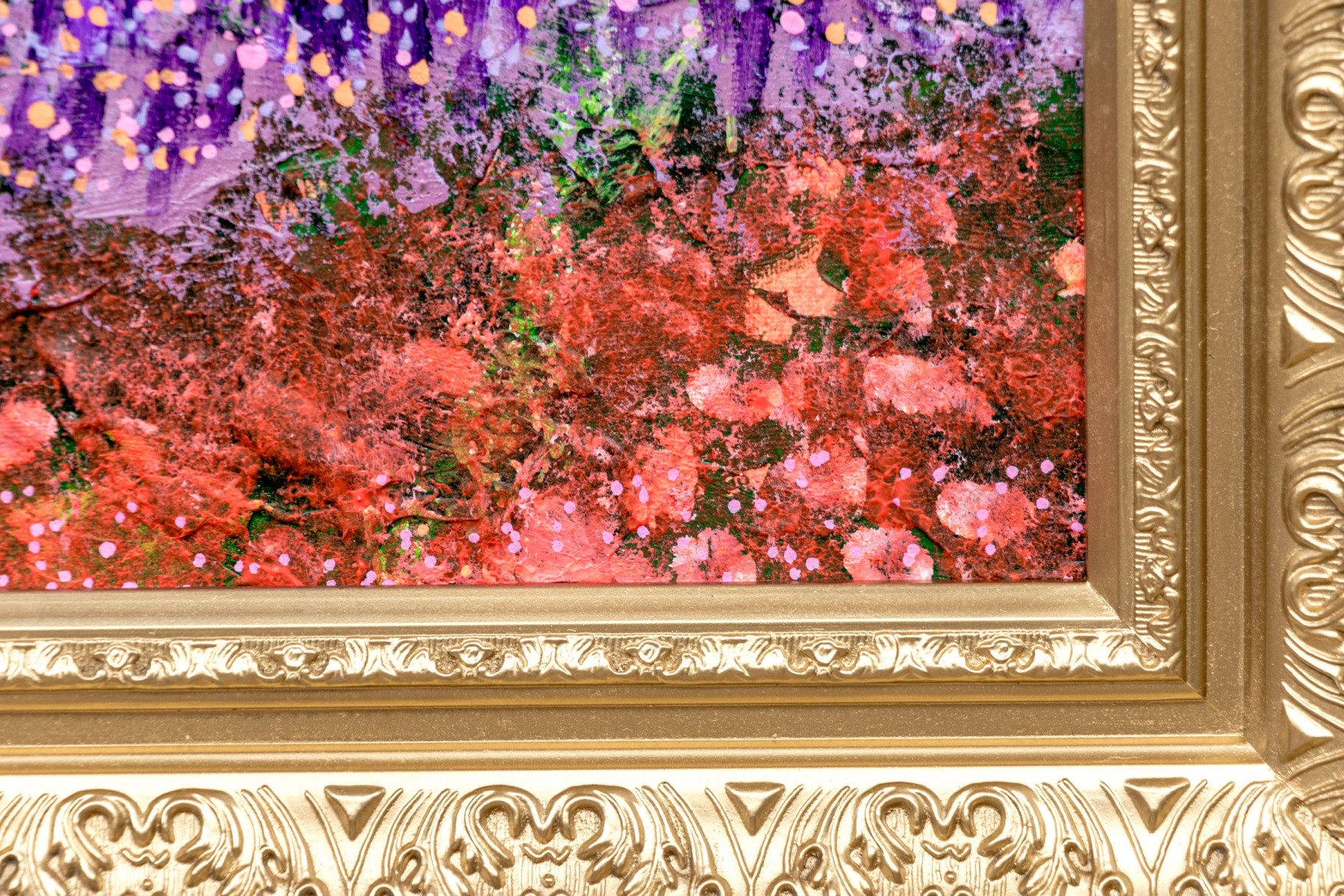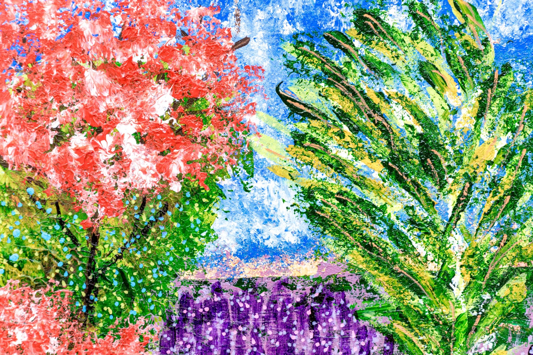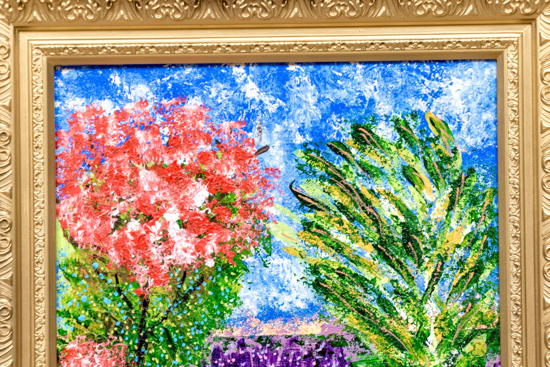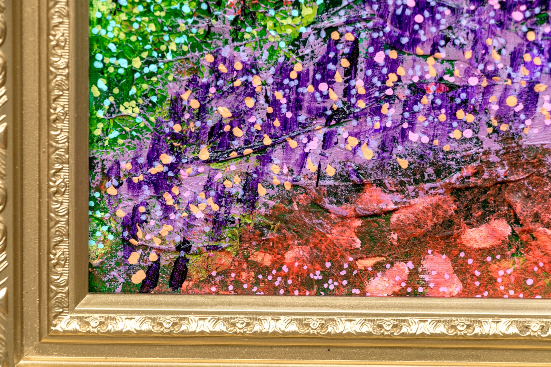 The wonderfully vibrant acrylic on canvas painting exhibits hints of Expressionism with the artists use of vibrant and bold fields of color to depict the natural landscape brimming with trees in bloom and flower fields with the blue sky above.