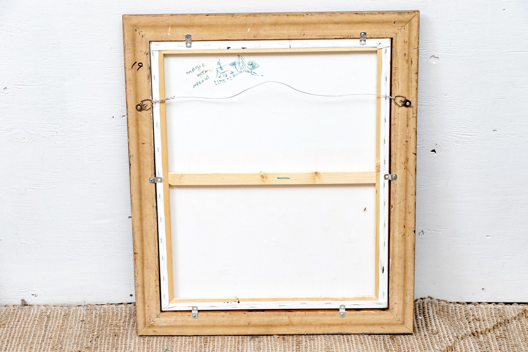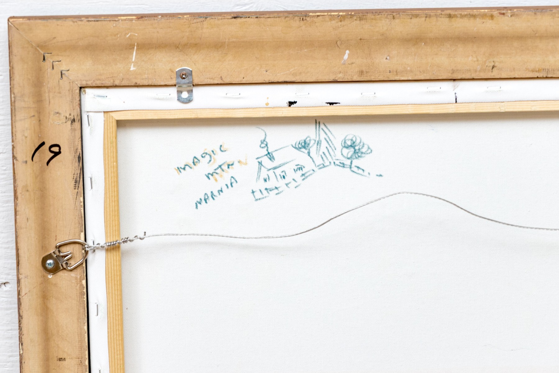 Signed in white lower right quadrant near trim and titled with a small drawn image on verso to canvas.