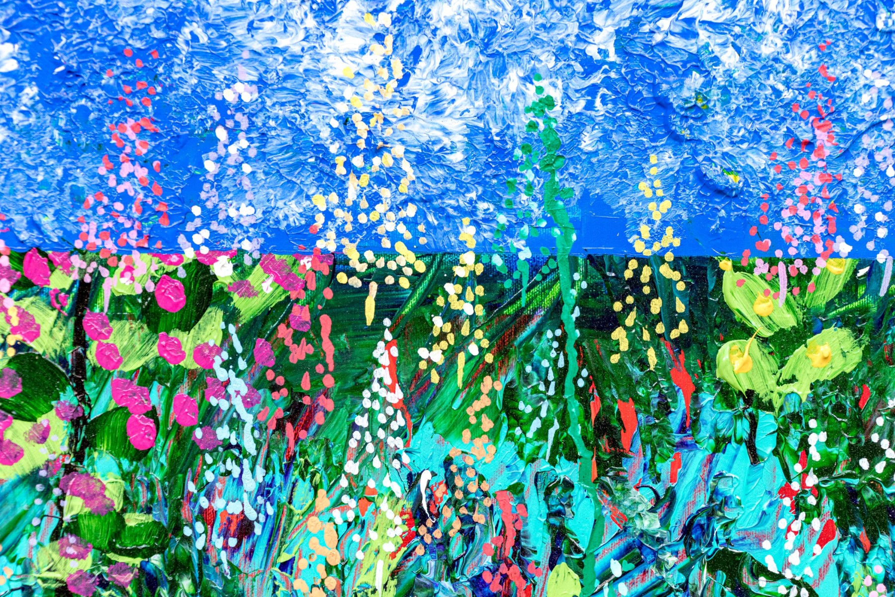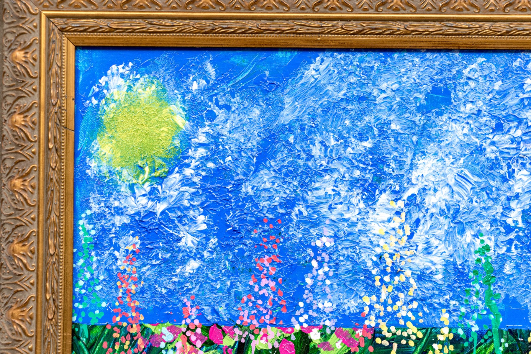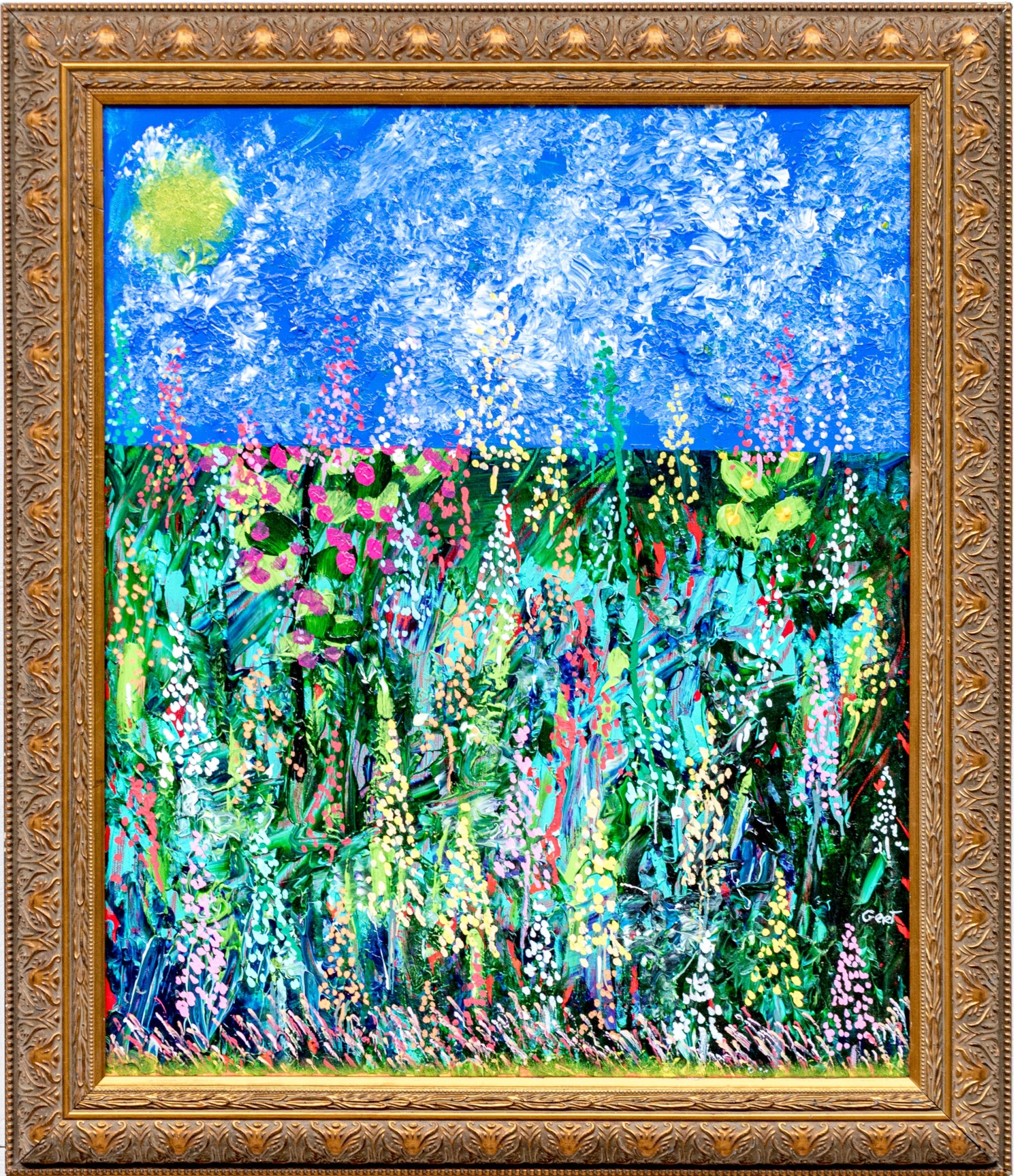 The acrylic on canvas painting depicts a vibrant and colorful landscape with blue sky above and green grasses and polychromatic lush wildflowers. Sun can be seen as a yellow orb in the upper left quadrant, high in the sky.