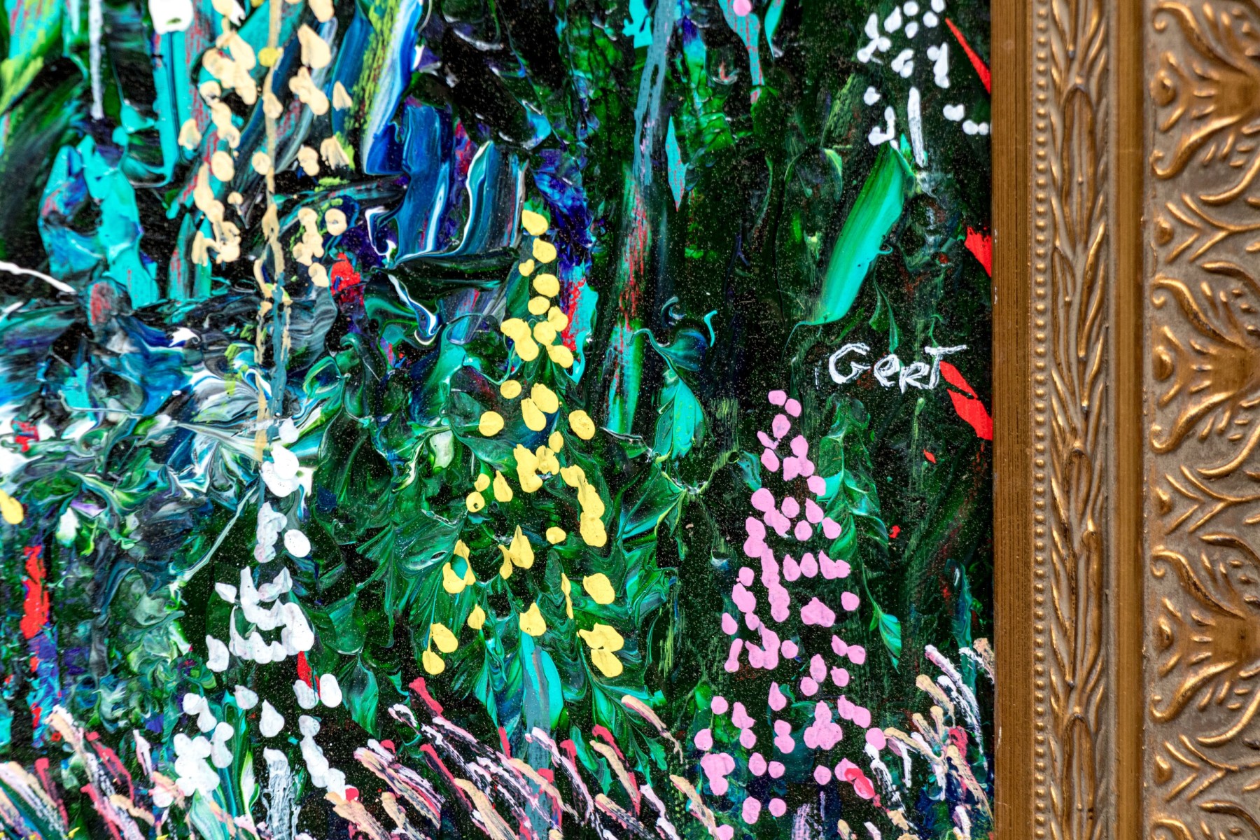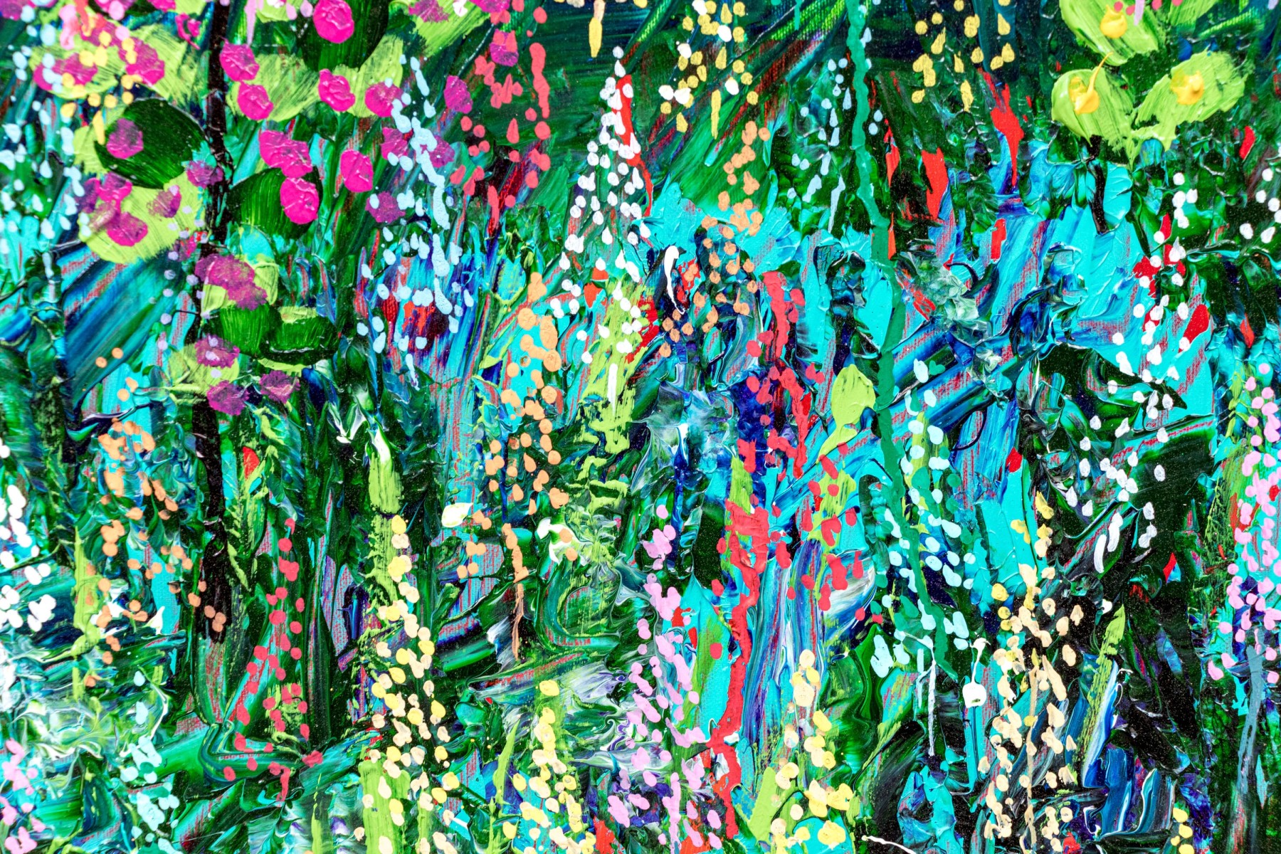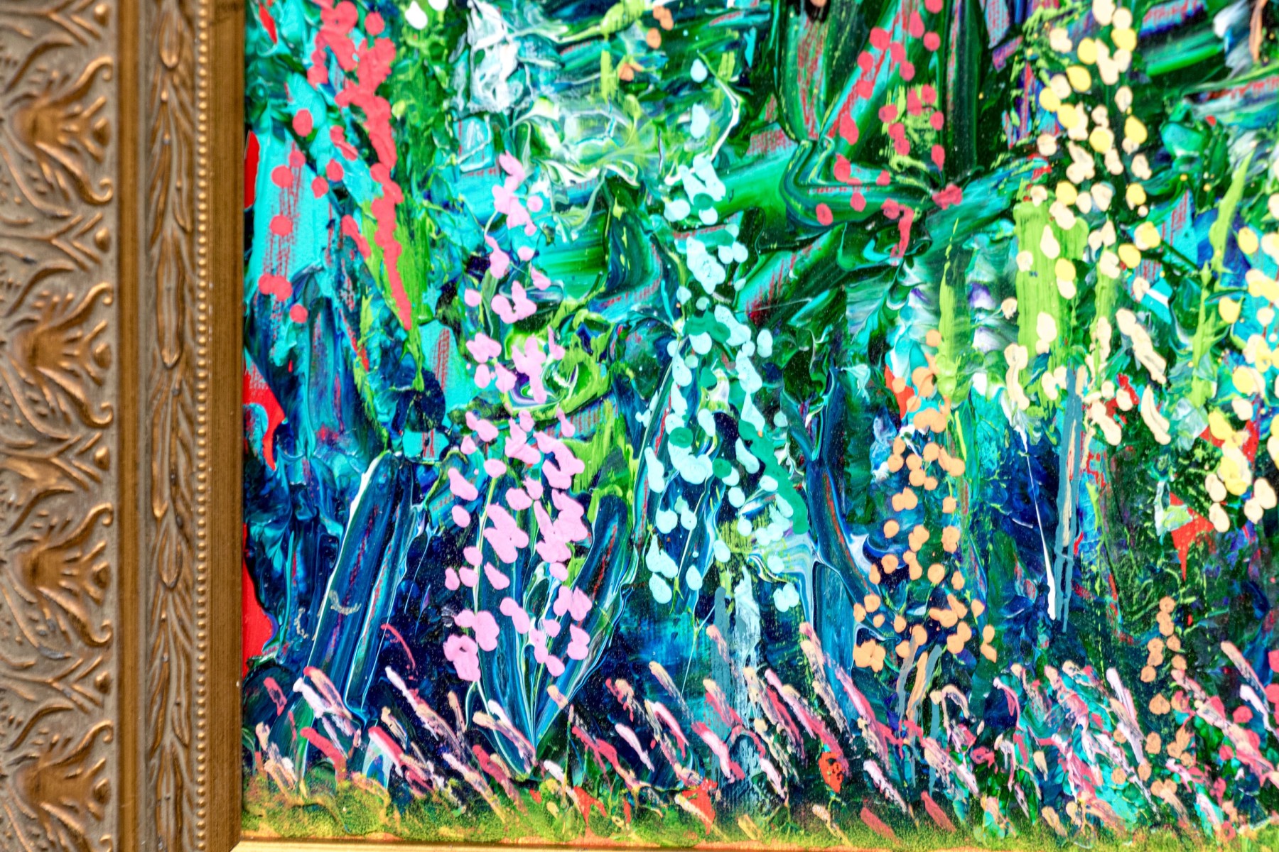 The acrylic on canvas painting depicts a vibrant and colorful landscape with blue sky above and green grasses and polychromatic lush wildflowers. Sun can be seen as a yellow orb in the upper left quadrant, high in the sky.