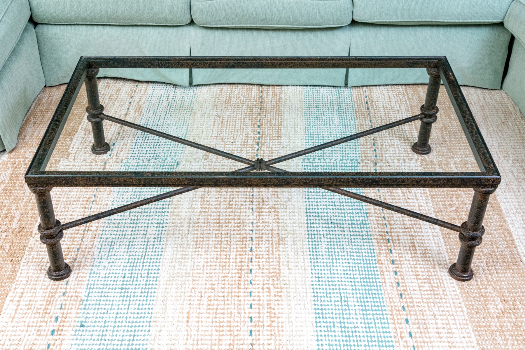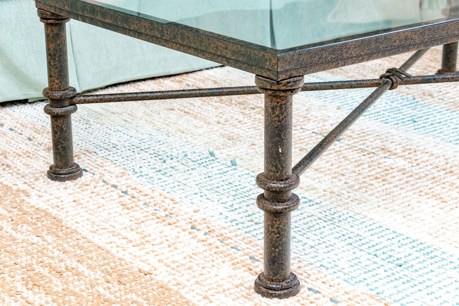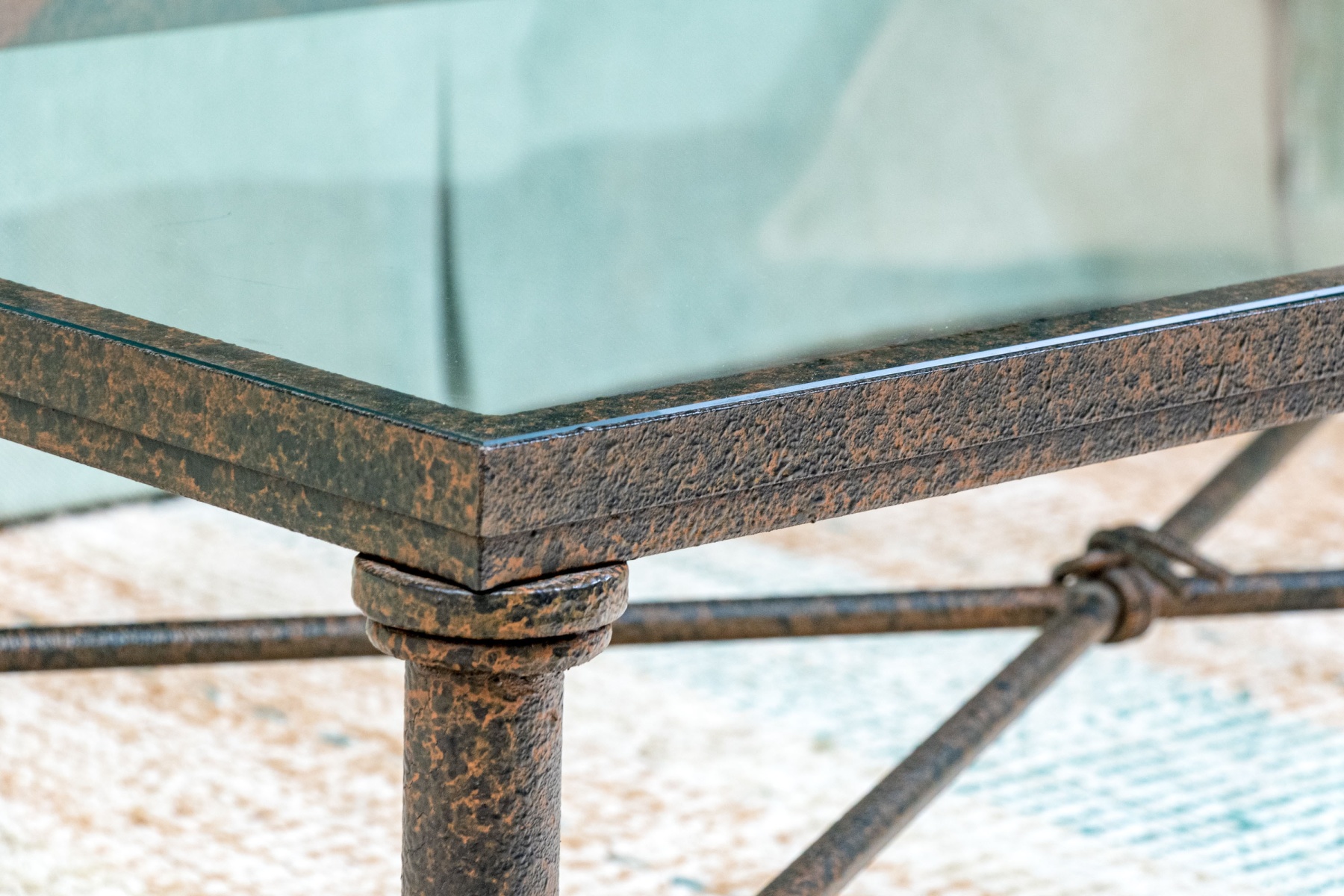 A fabulous industrial chic cocktail table drawing inspiration from Giacometti and elegant 19th century influence, showcasing a rectangular glass top on an antiqued black frame with red oxide spotting lending great texture and visual intrigue. The frame sports cylindrical legs on tiered circular feet, supported by an X-stretcher with a small ringed knop at the center and banded accents connecting to the legs.
