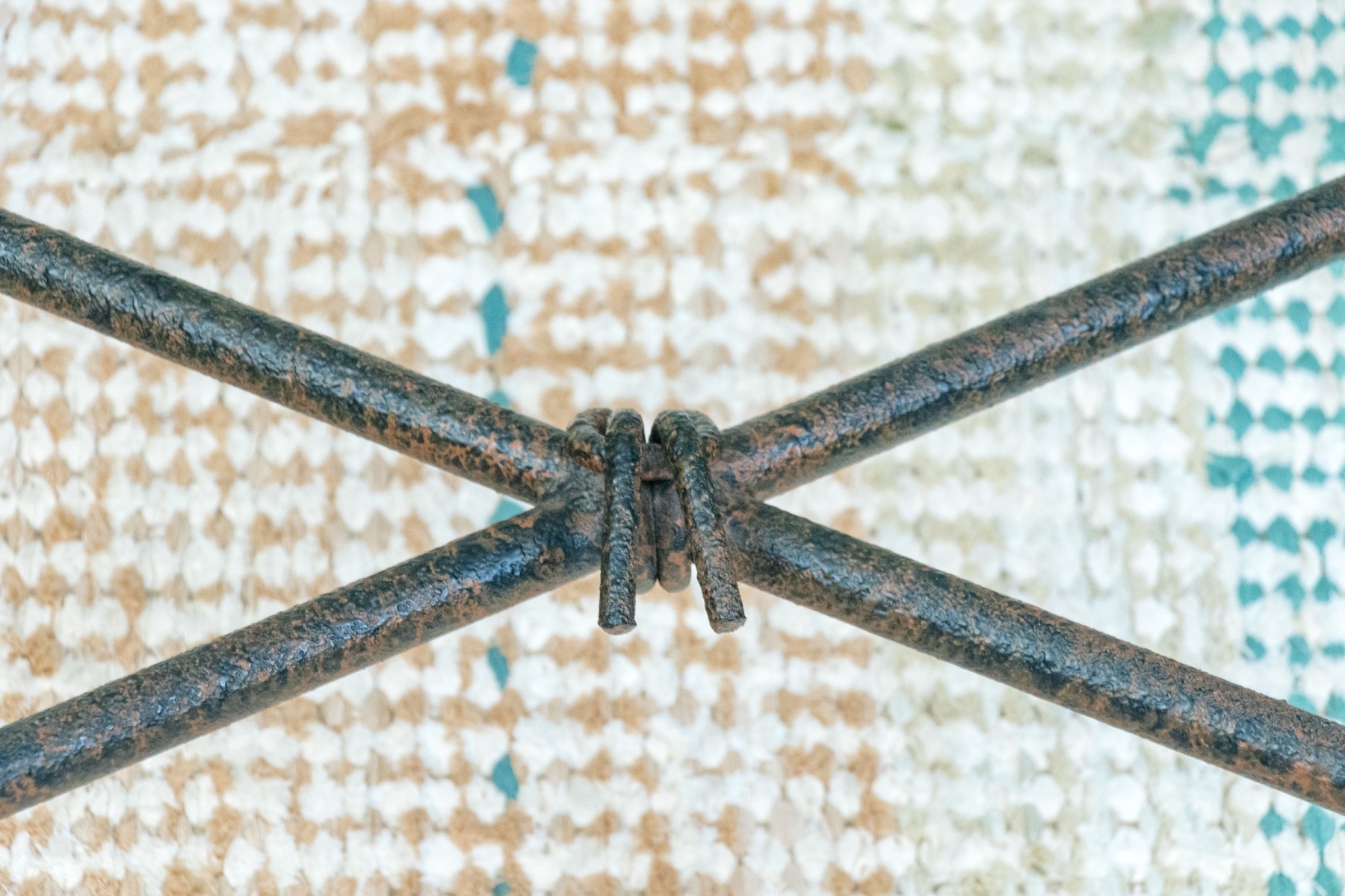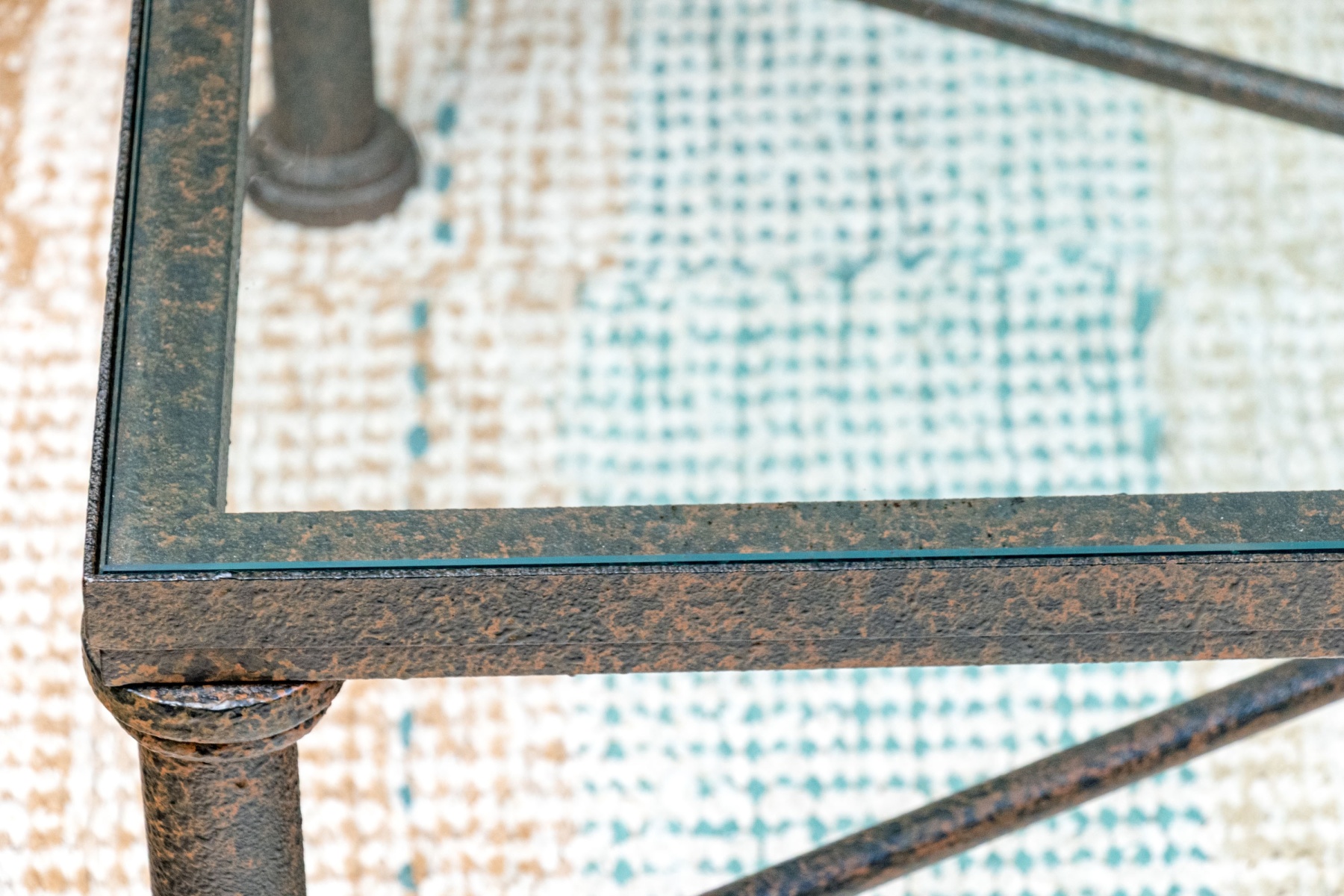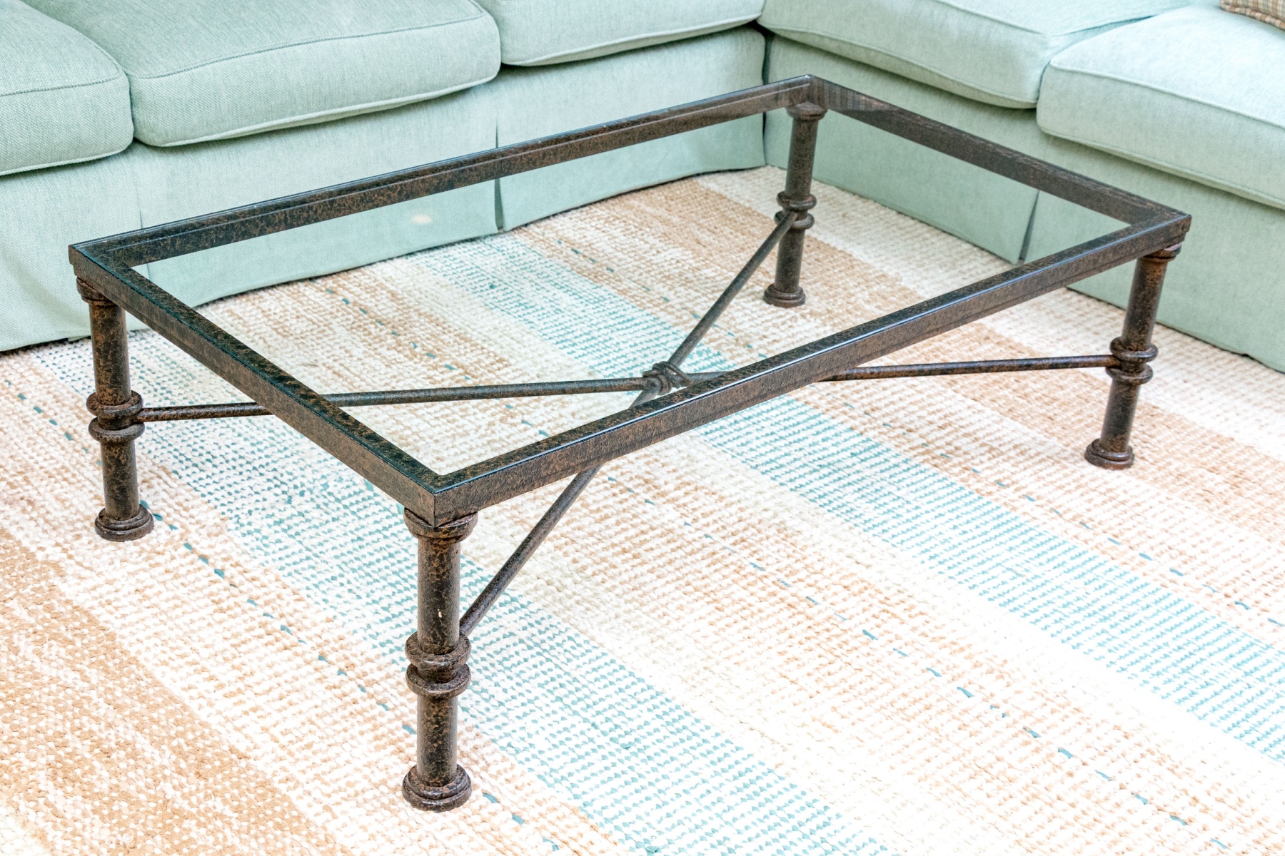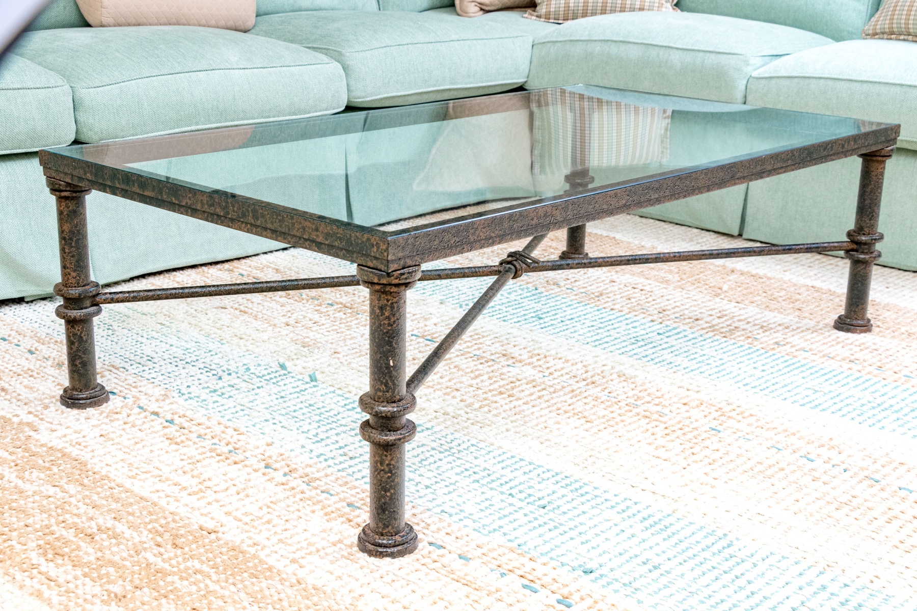 A fabulous industrial chic cocktail table drawing inspiration from Giacometti and elegant 19th century influence, showcasing a rectangular glass top on an antiqued black frame with red oxide spotting lending great texture and visual intrigue. The frame sports cylindrical legs on tiered circular feet, supported by an X-stretcher with a small ringed knop at the center and banded accents connecting to the legs.