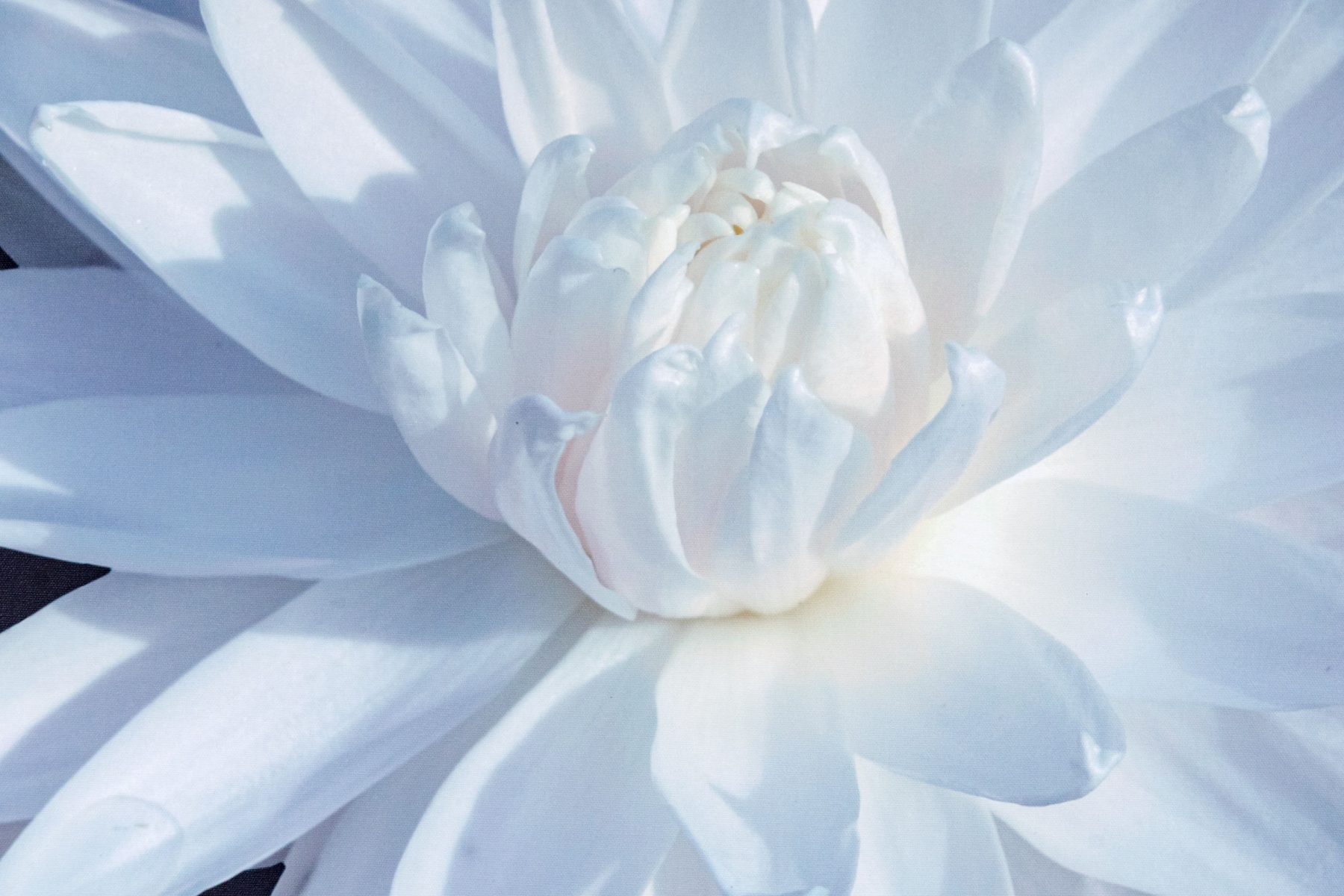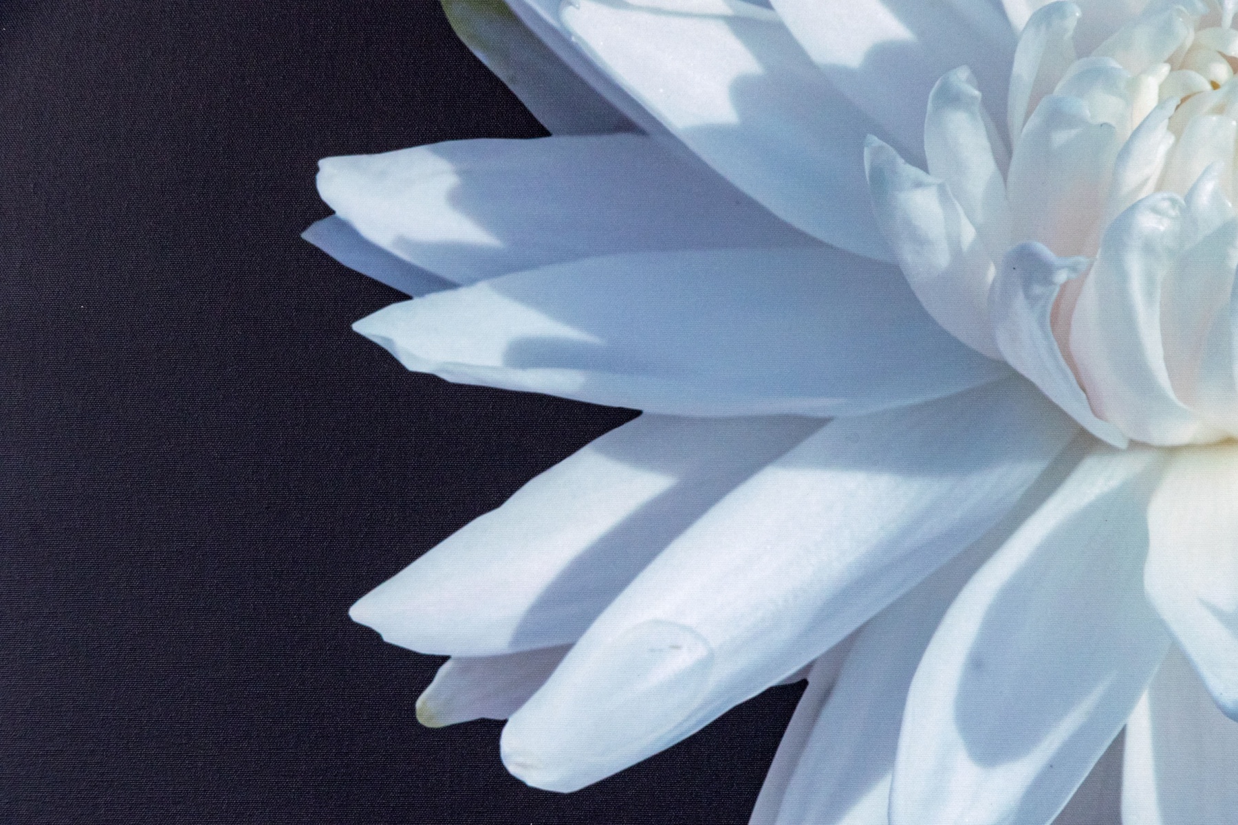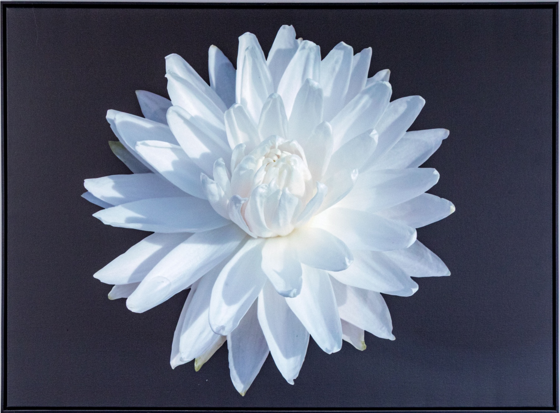 A beautiful decorative giclee on canvas depicting a white water lily with gentle yellow and blue undertones floating on blue-black water to create a soft, meditative atmosphere. Displayed in a black floater frame.