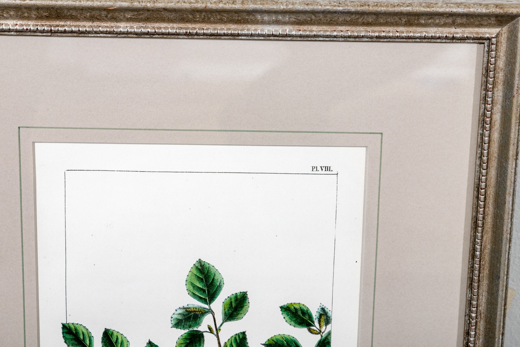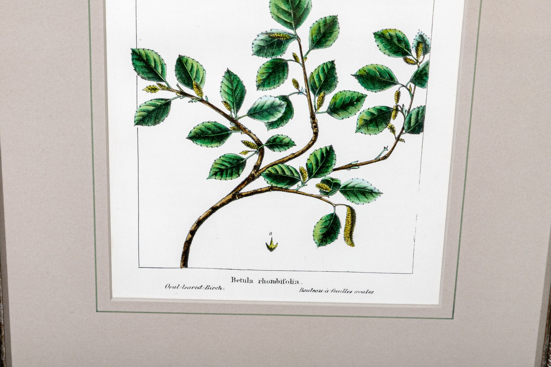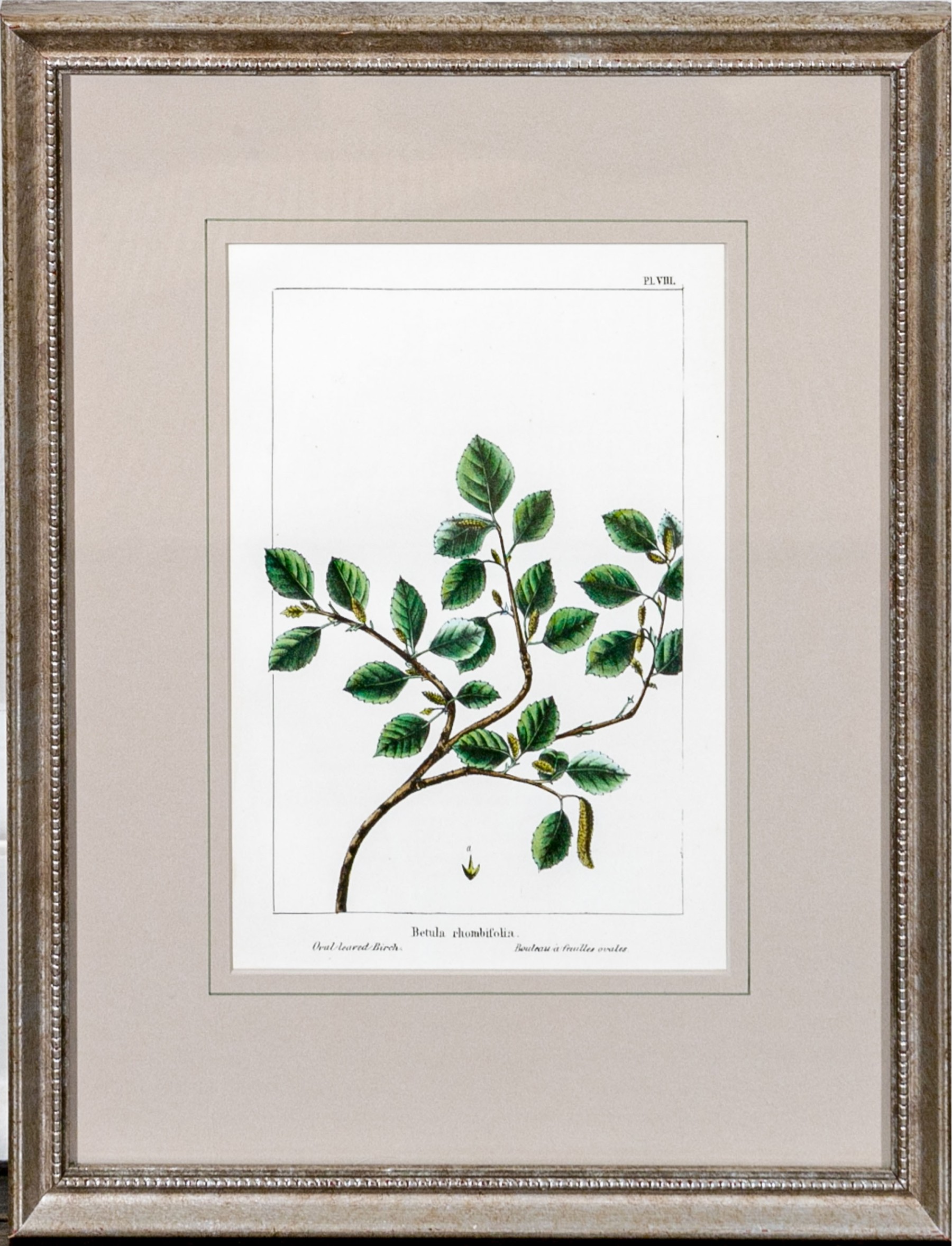 A color print after an antique color botanical engraving- Oak-leafed Birch. Presented nicely matted in a silver gilt frame with glass.