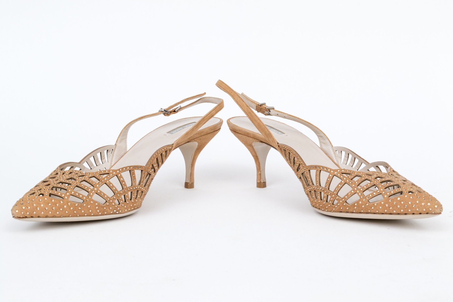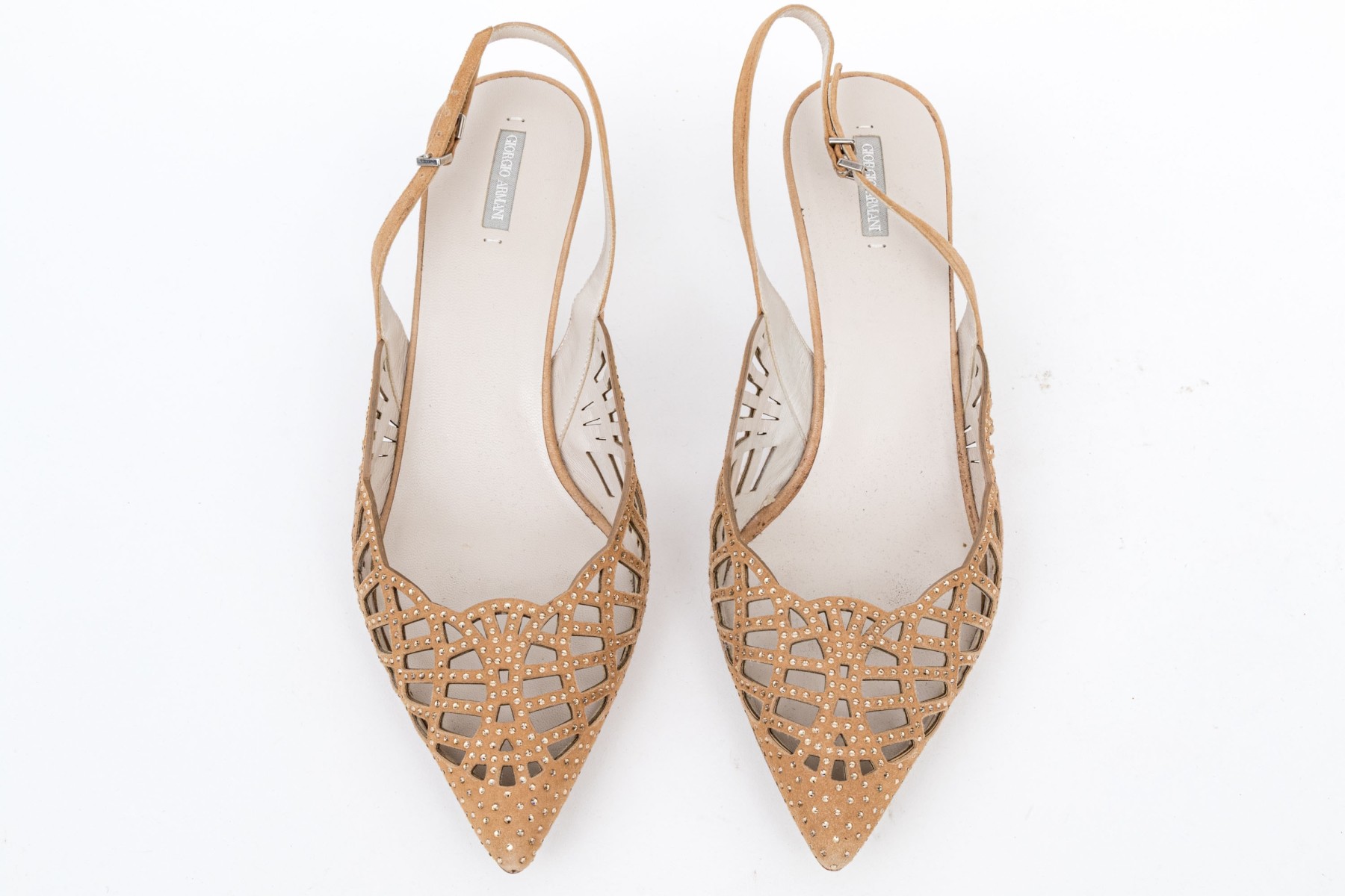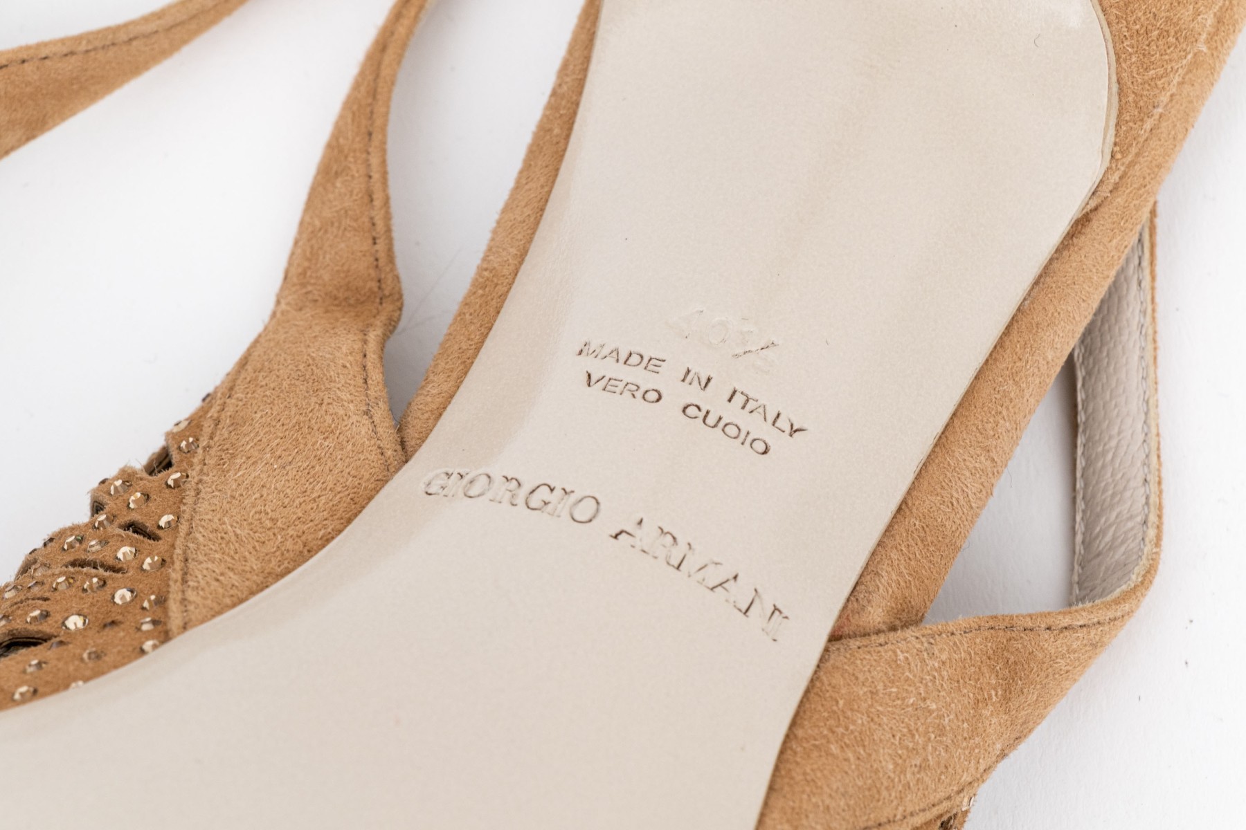 Giorgio Armani lovely pierced tan suede and rhinestone slingbacks, size 40 1/2
