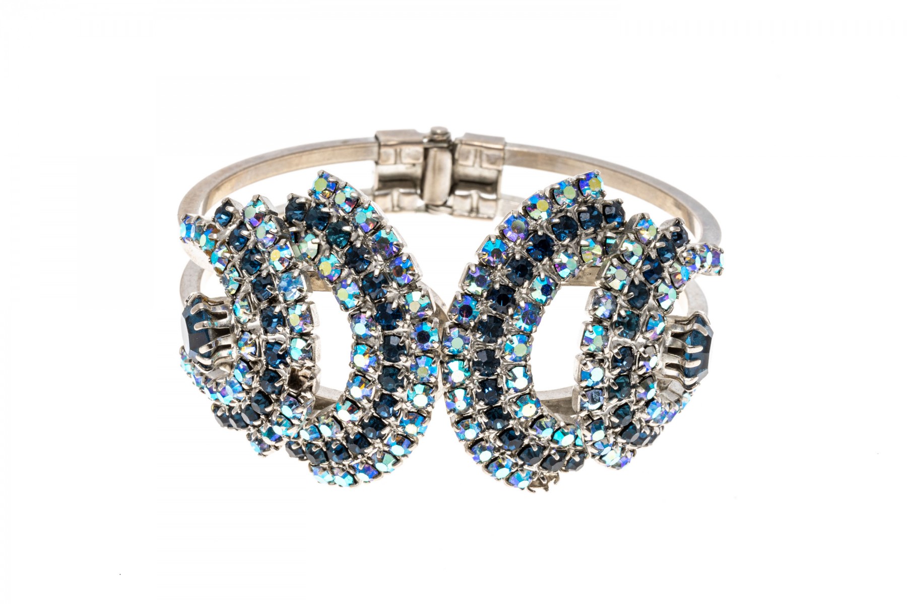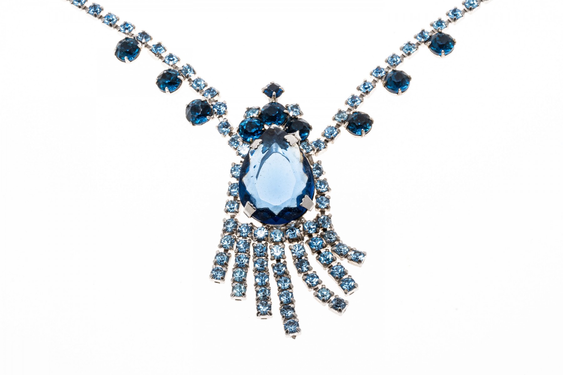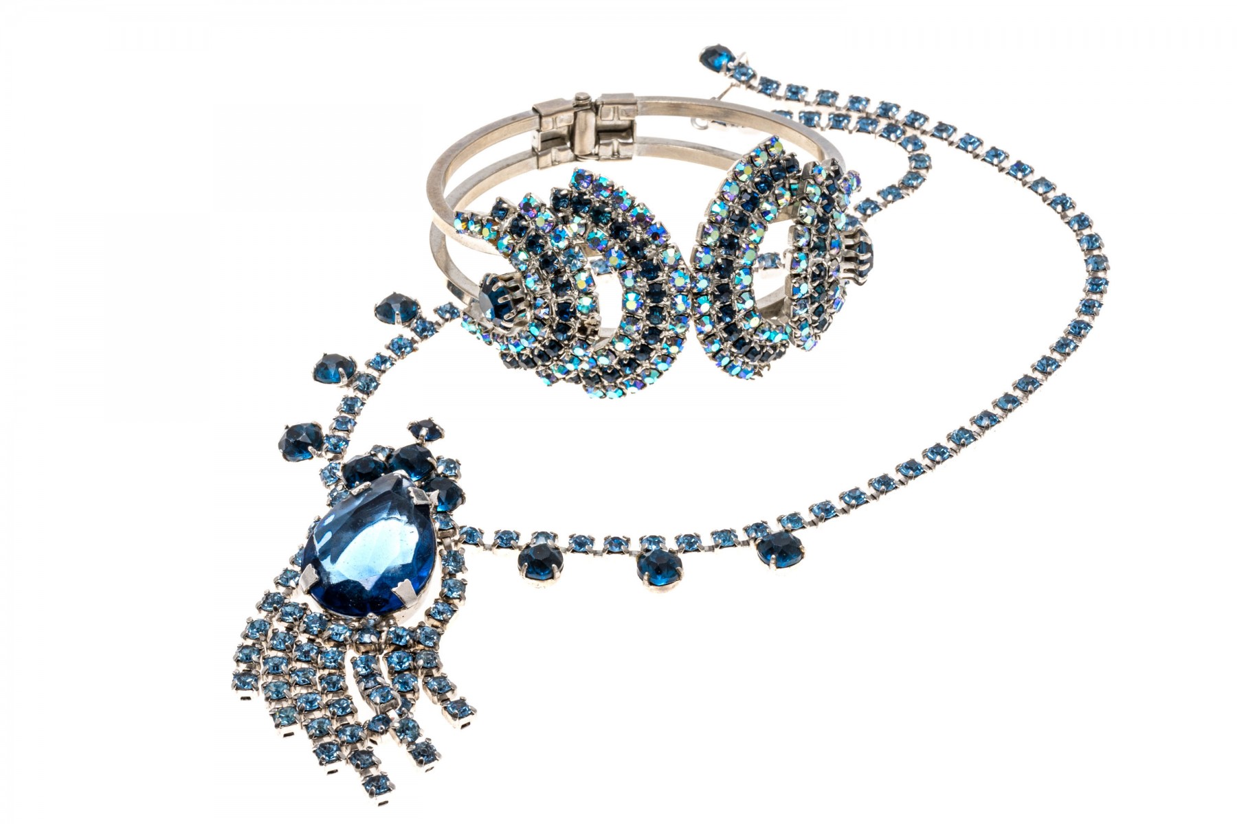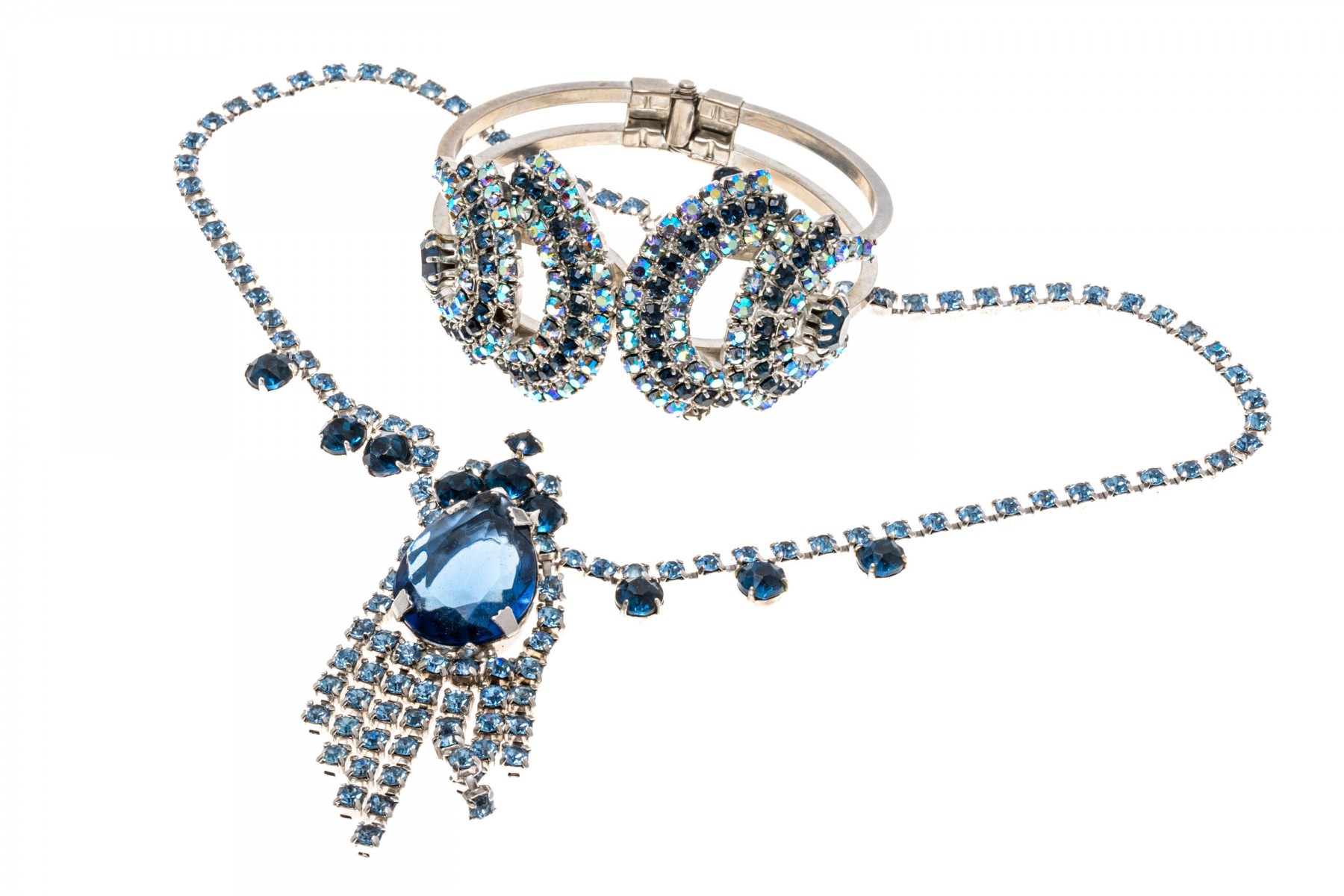A glamorous hinged fashion bangle bracelet and fashion drop style necklace with an array of dark and light blue simulate stones. The necklace has a hook style clasp.