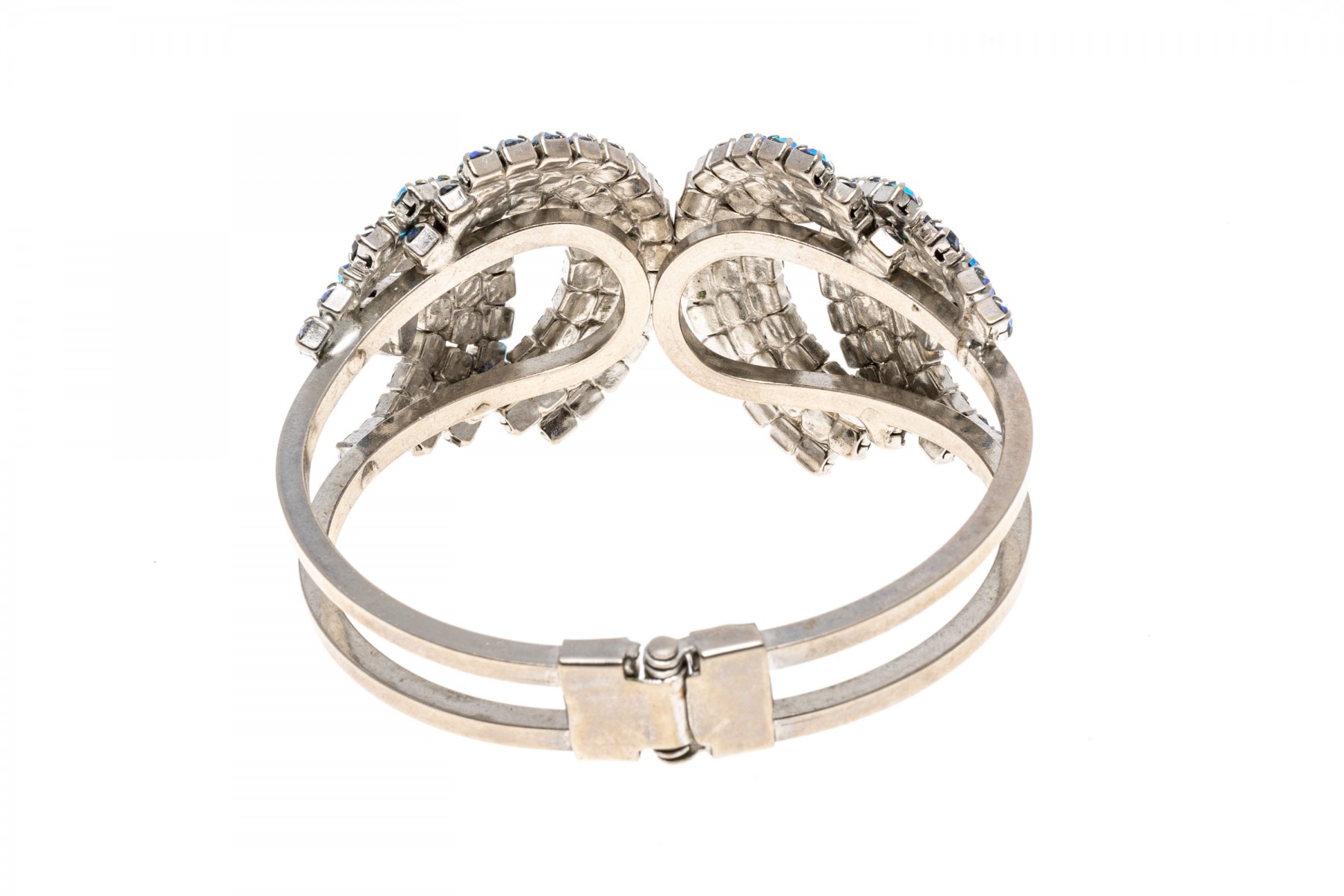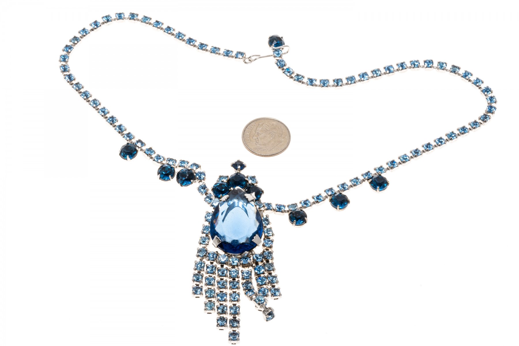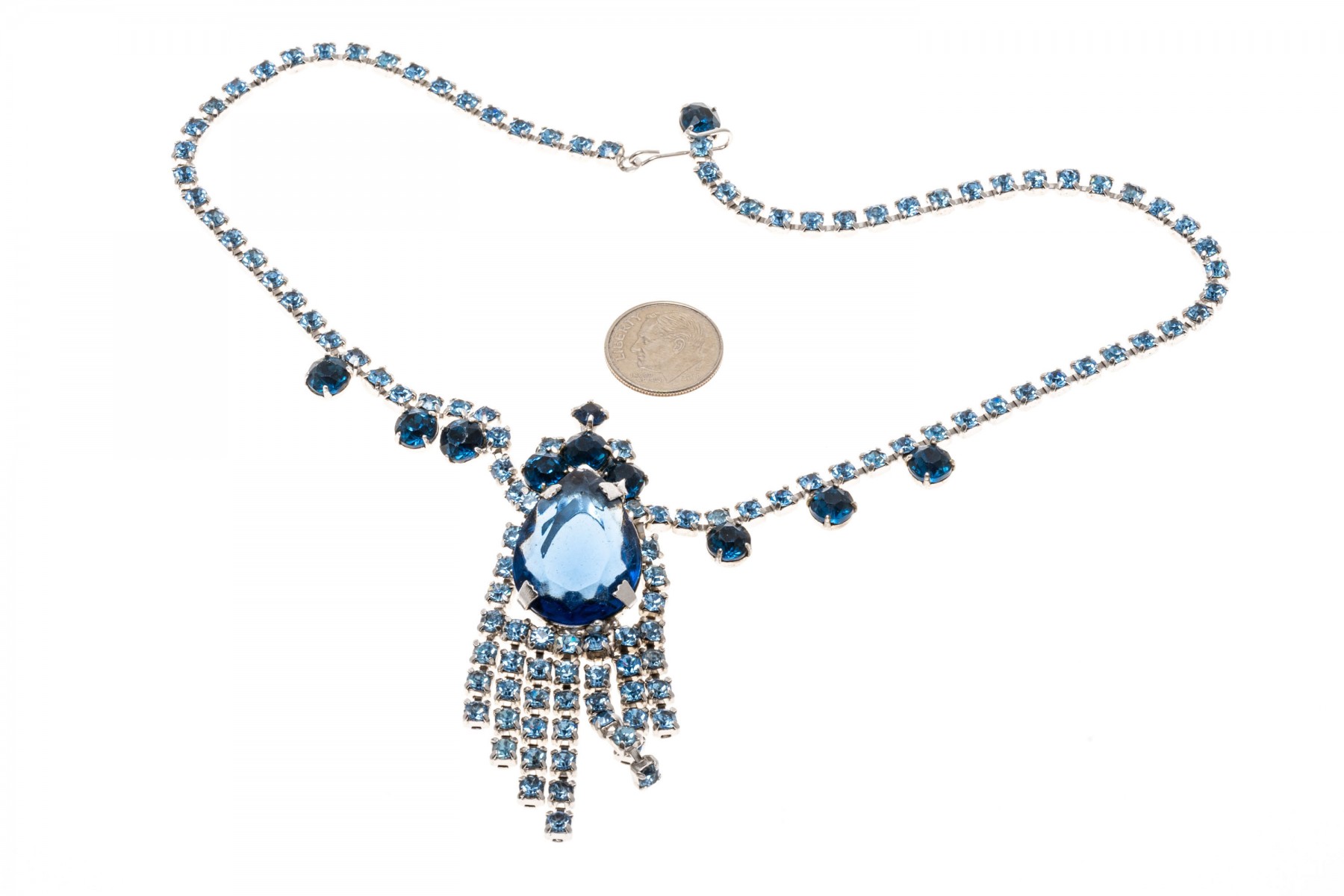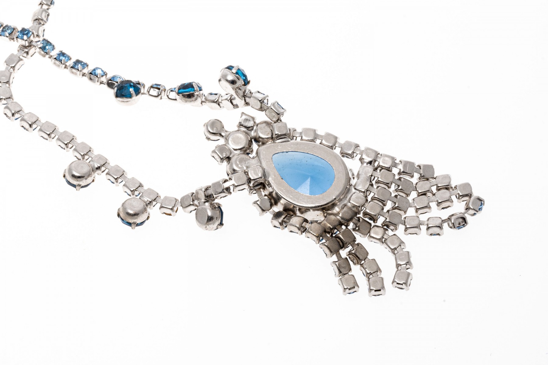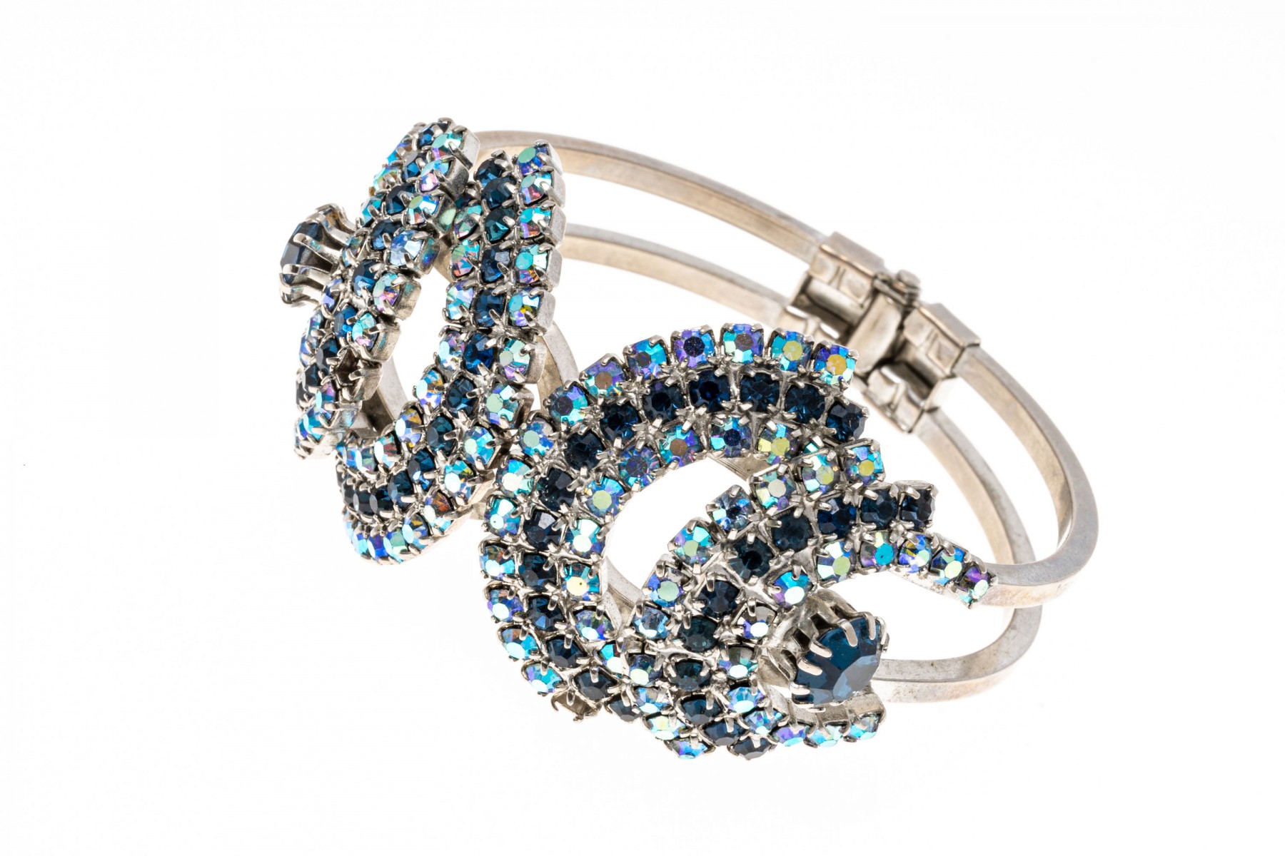 A glamorous hinged fashion bangle bracelet and fashion drop style necklace with an array of dark and light blue simulate stones. The necklace has a hook style clasp.