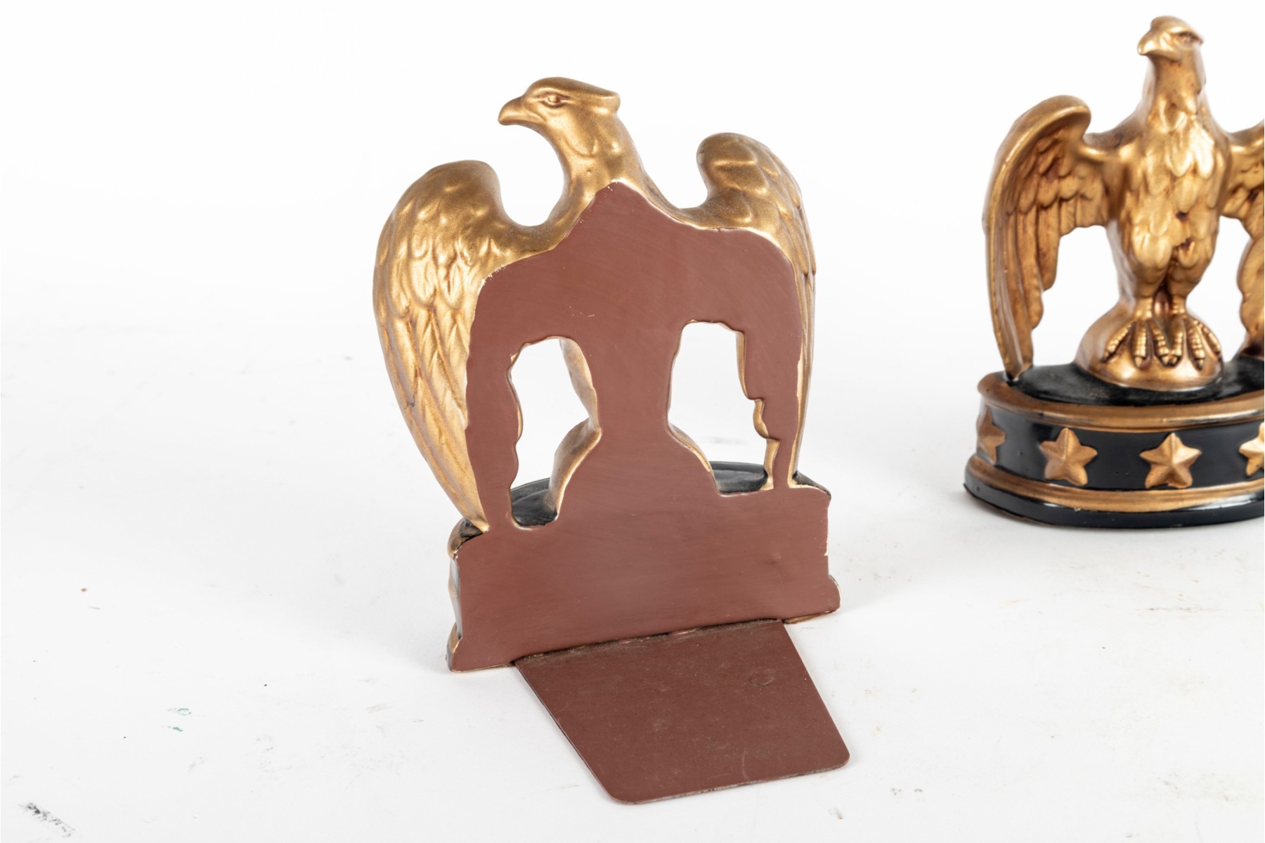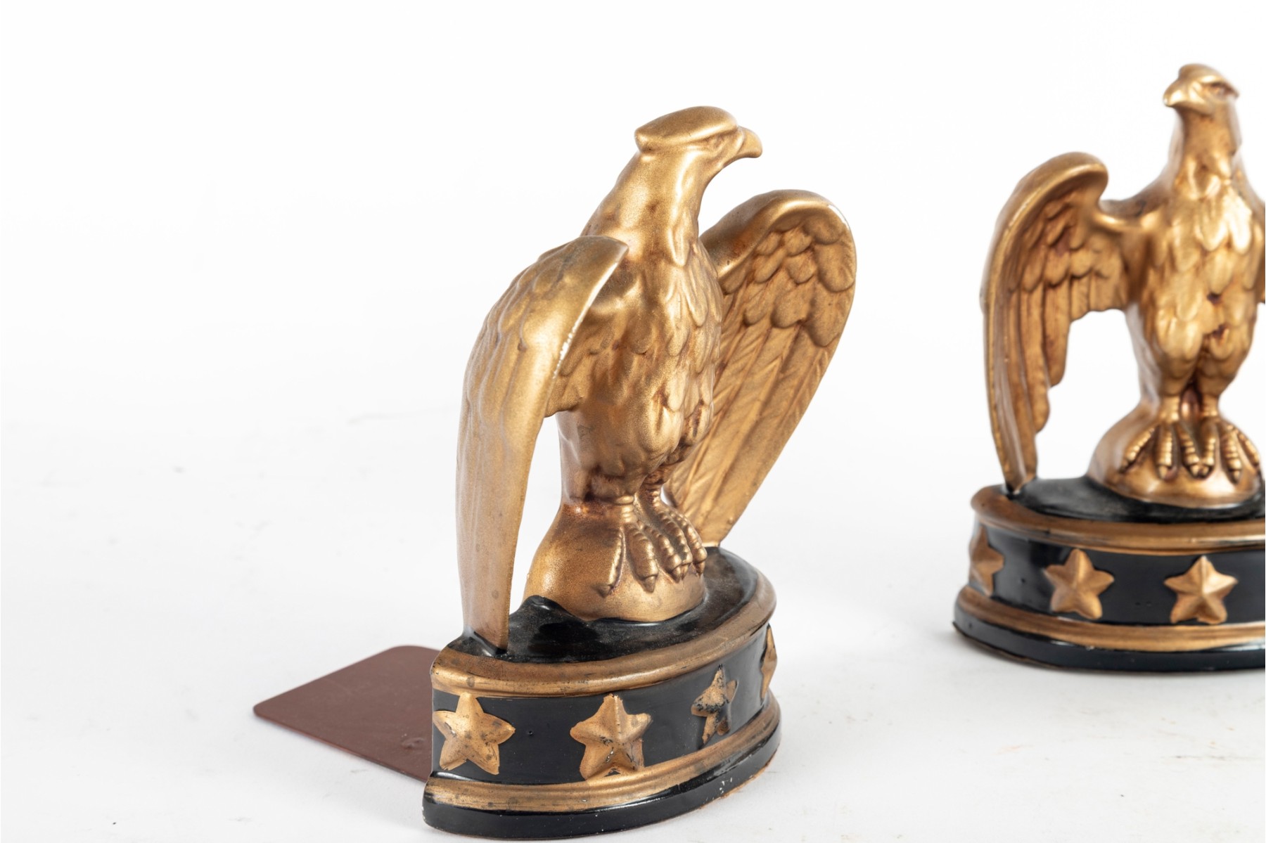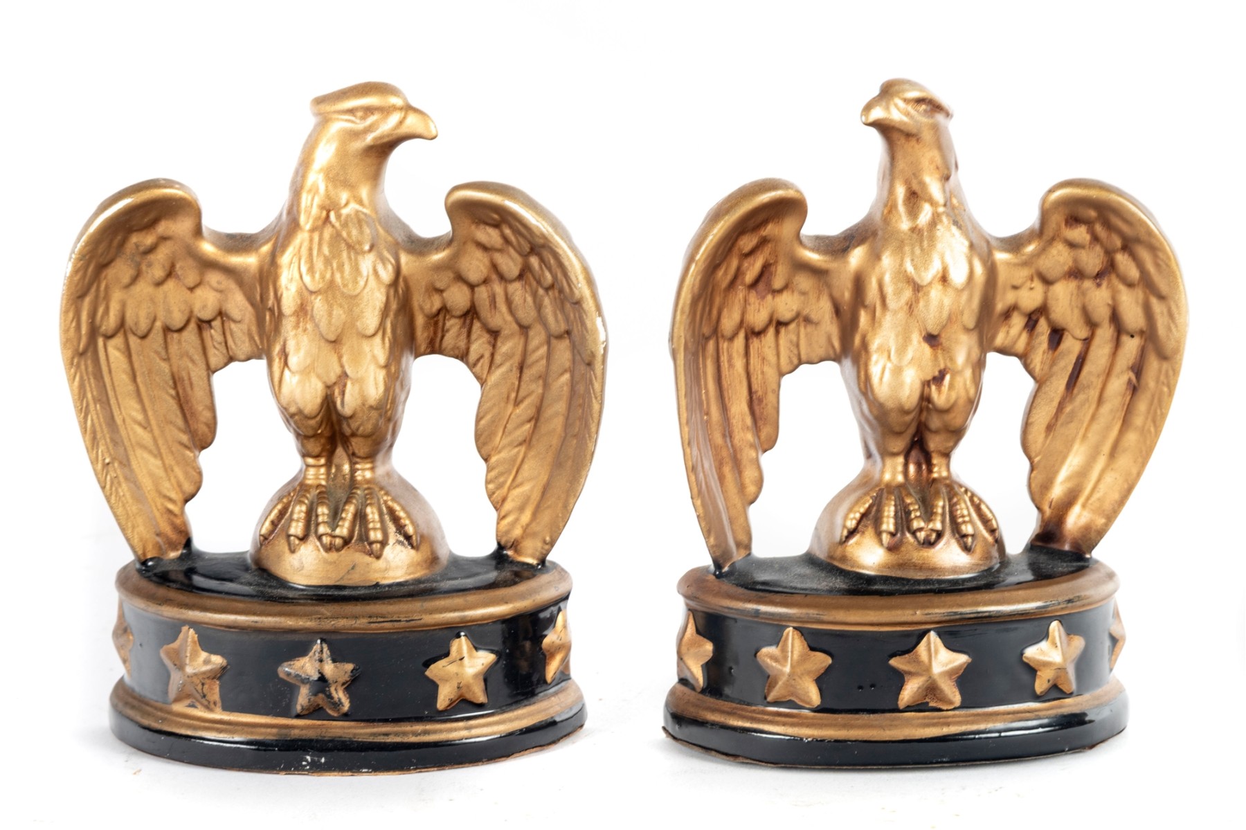 A striking pair of Federal style glazed ceramic bookends, each modeled as a gilt eagle with wings partially spread, perched upon a rounded black plinth accented with raised gold stars.