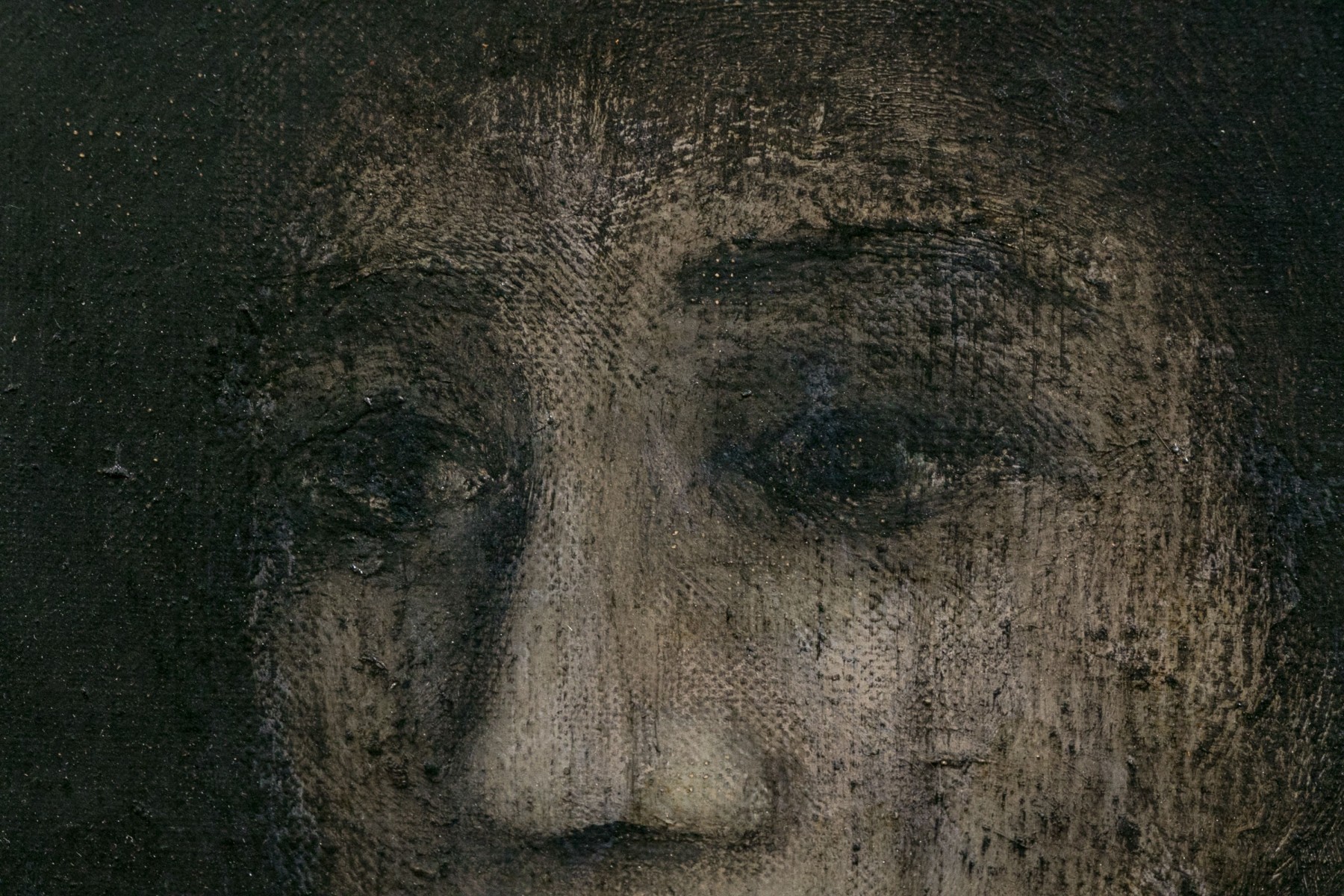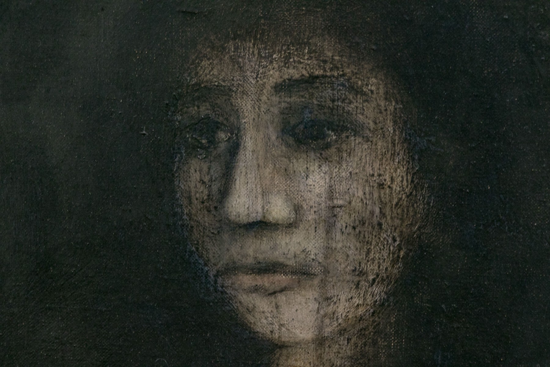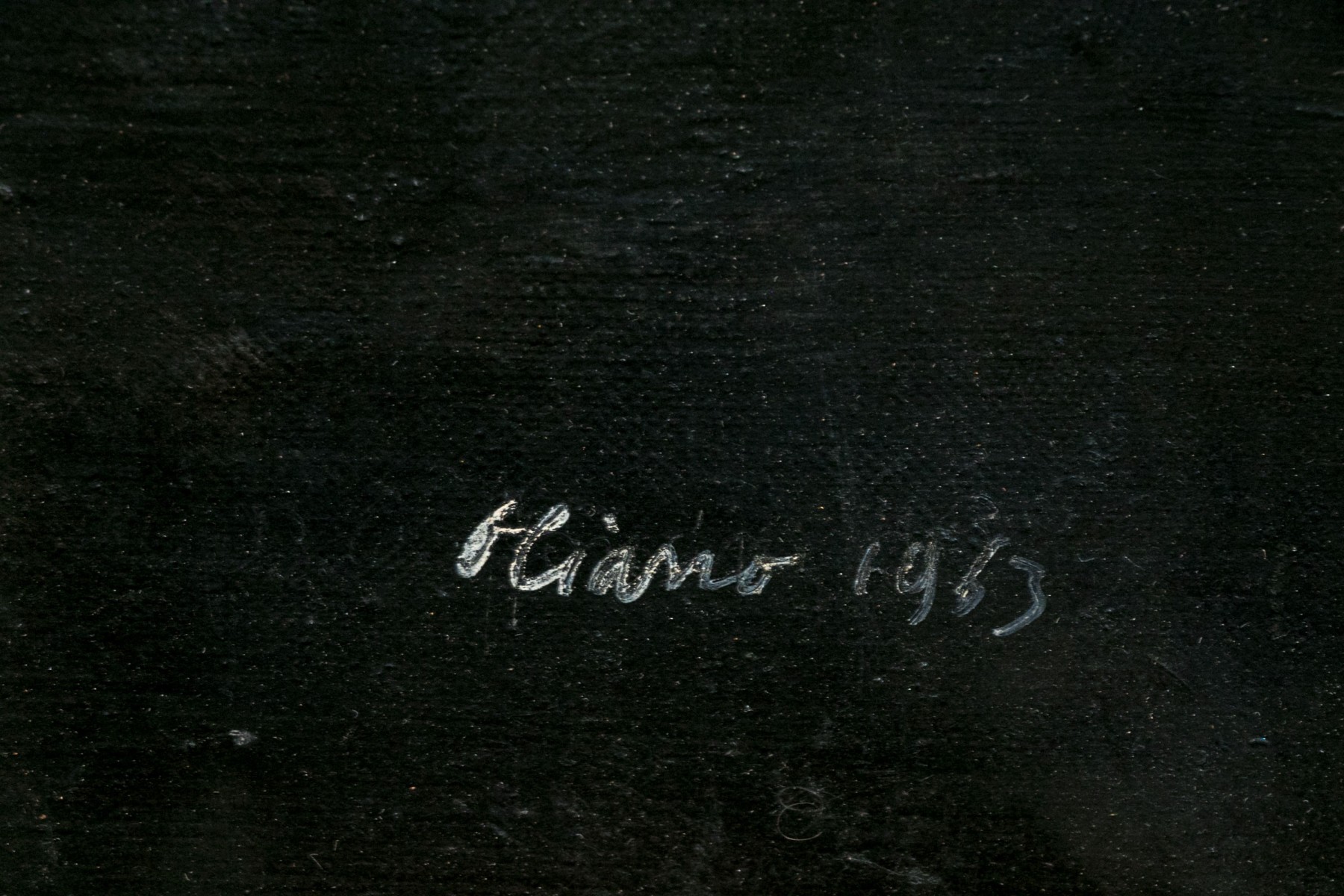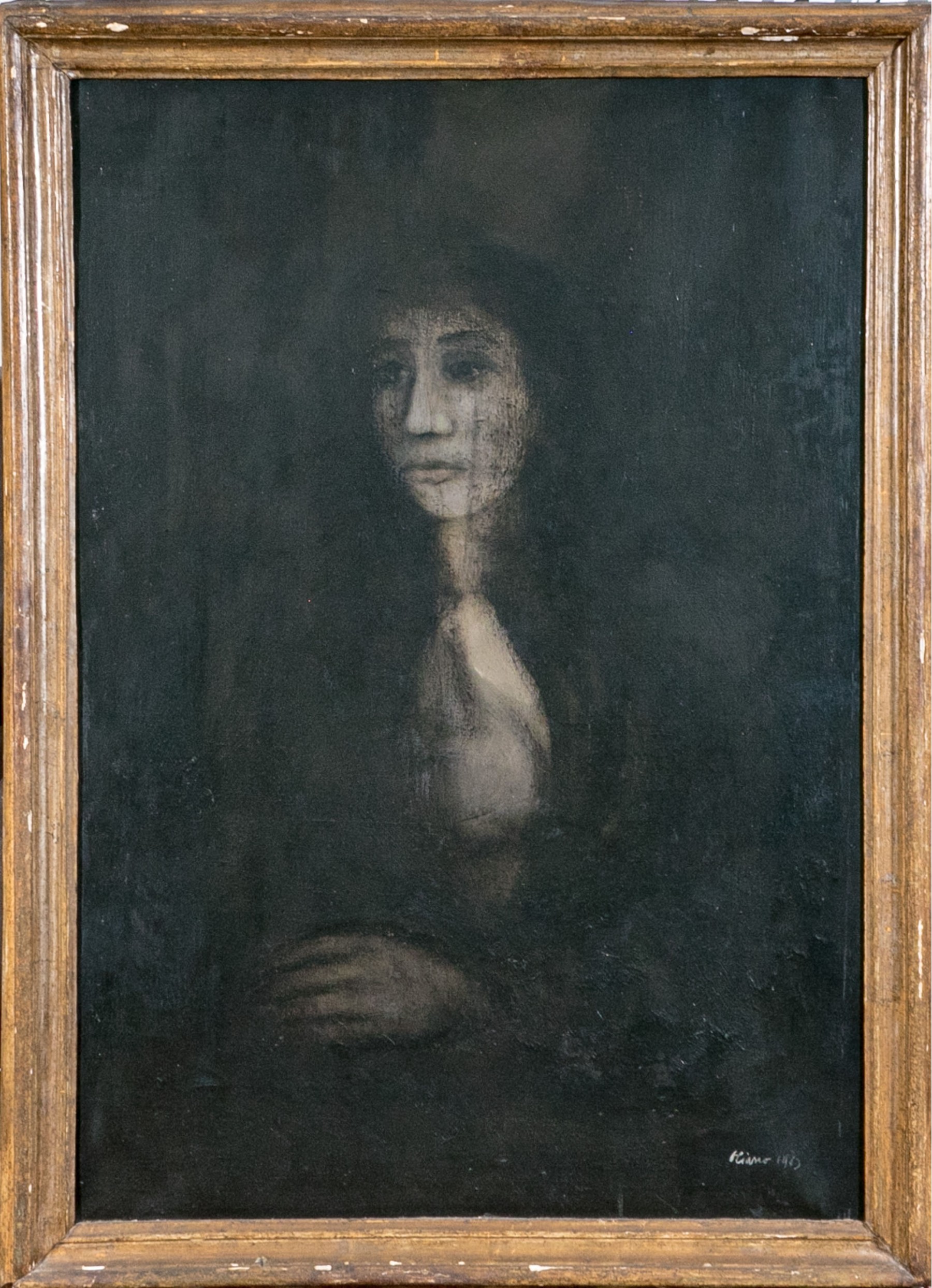 Signed and dated 1963 lower right, signed on verso and inscribed Allesi a Monforte in black. Inscribed indistinctly in red on verso as well. An elegant but somber portrait of a long haired lady, her face and blouse white against the black grounds. Presented in a painted wood frame.