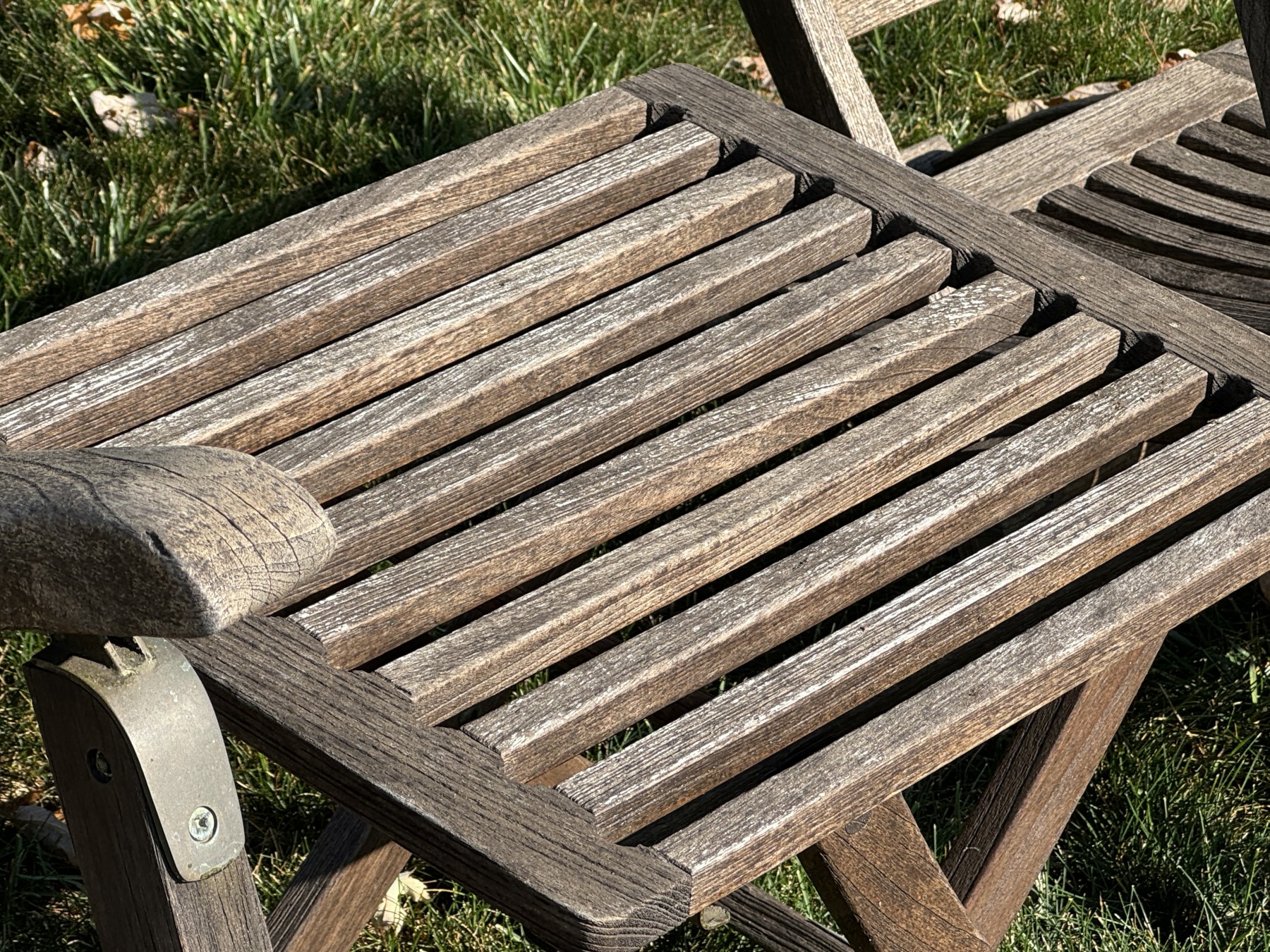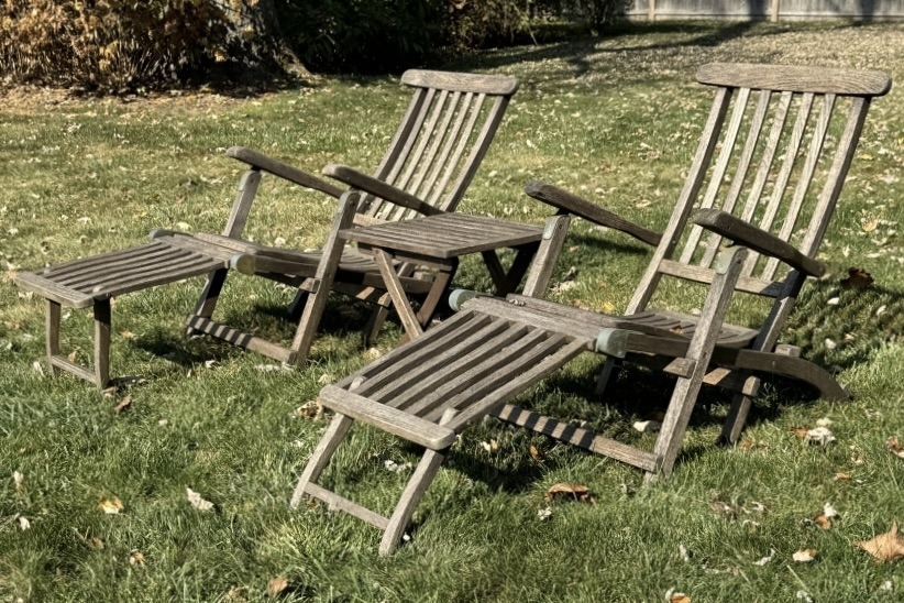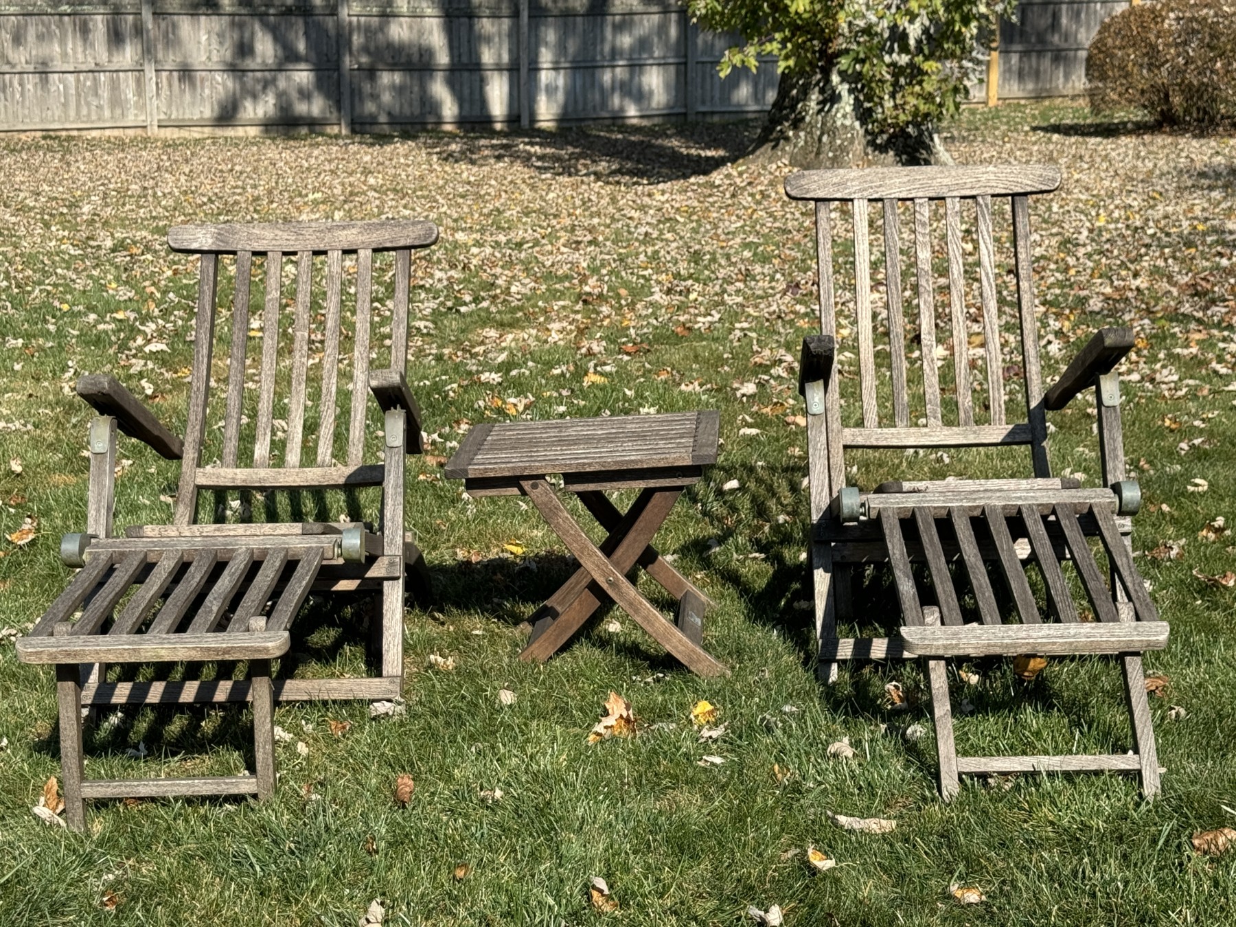 The quality Gloucester teak chaise lounge chairs have custom seat cushions and come together with a collapsible side table. Dimensions: Chaise lounge chairs: 34" H x 22 1/2" W x 57" D, 14" SH // Side table: 17 1/4" H x 16 3/4" W x 19" D