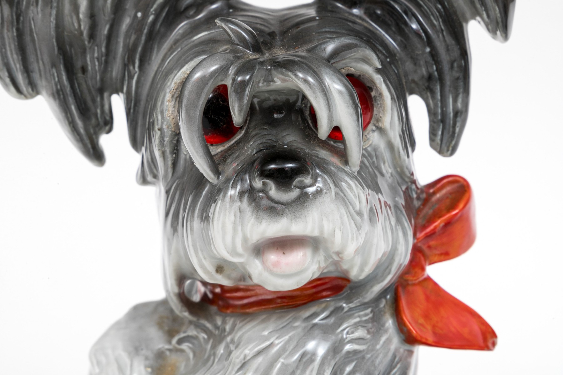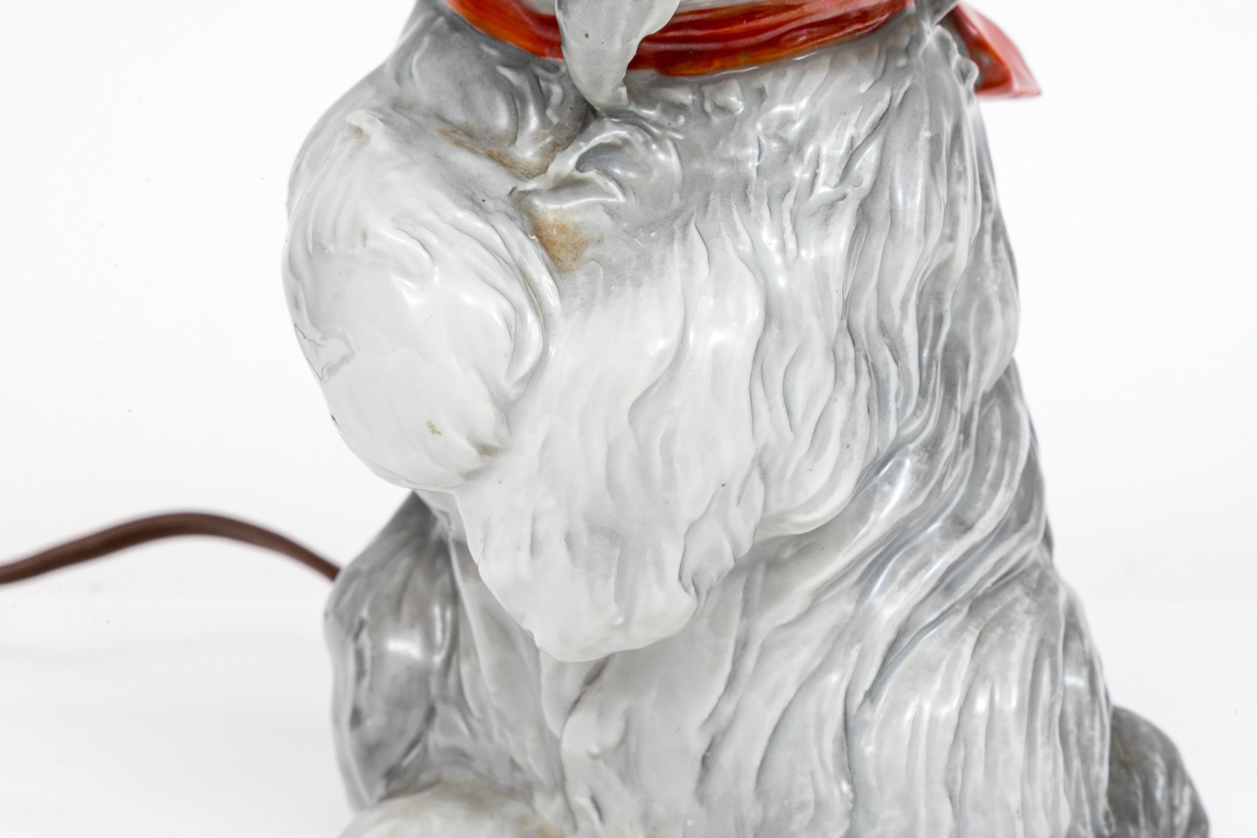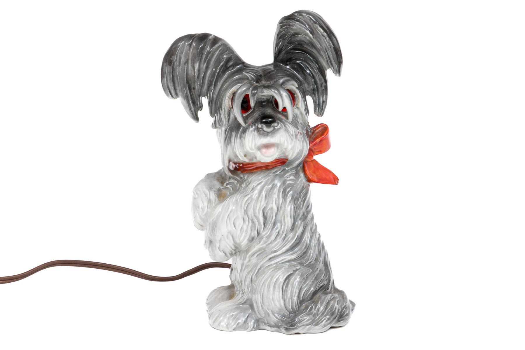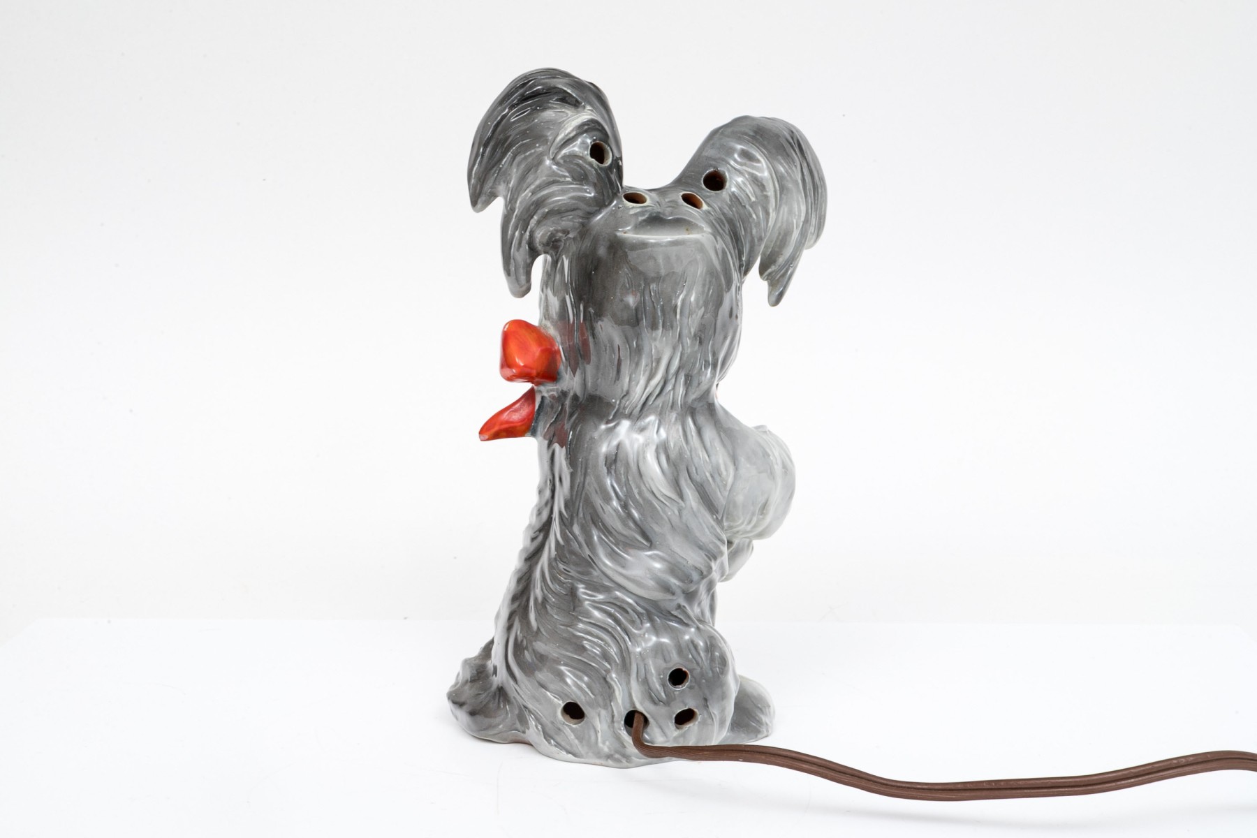 Goebel adorable vintage skye silky papillon terrier scent lamp, with gradiant grey and white toning, orange eyes and an orange bow, a scent reservoir in the back, and a light bulb interior, with cord