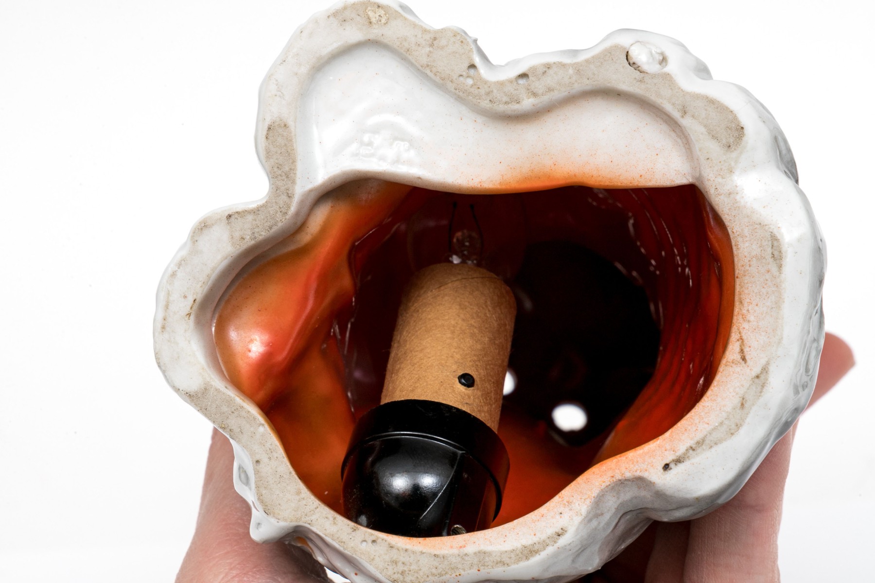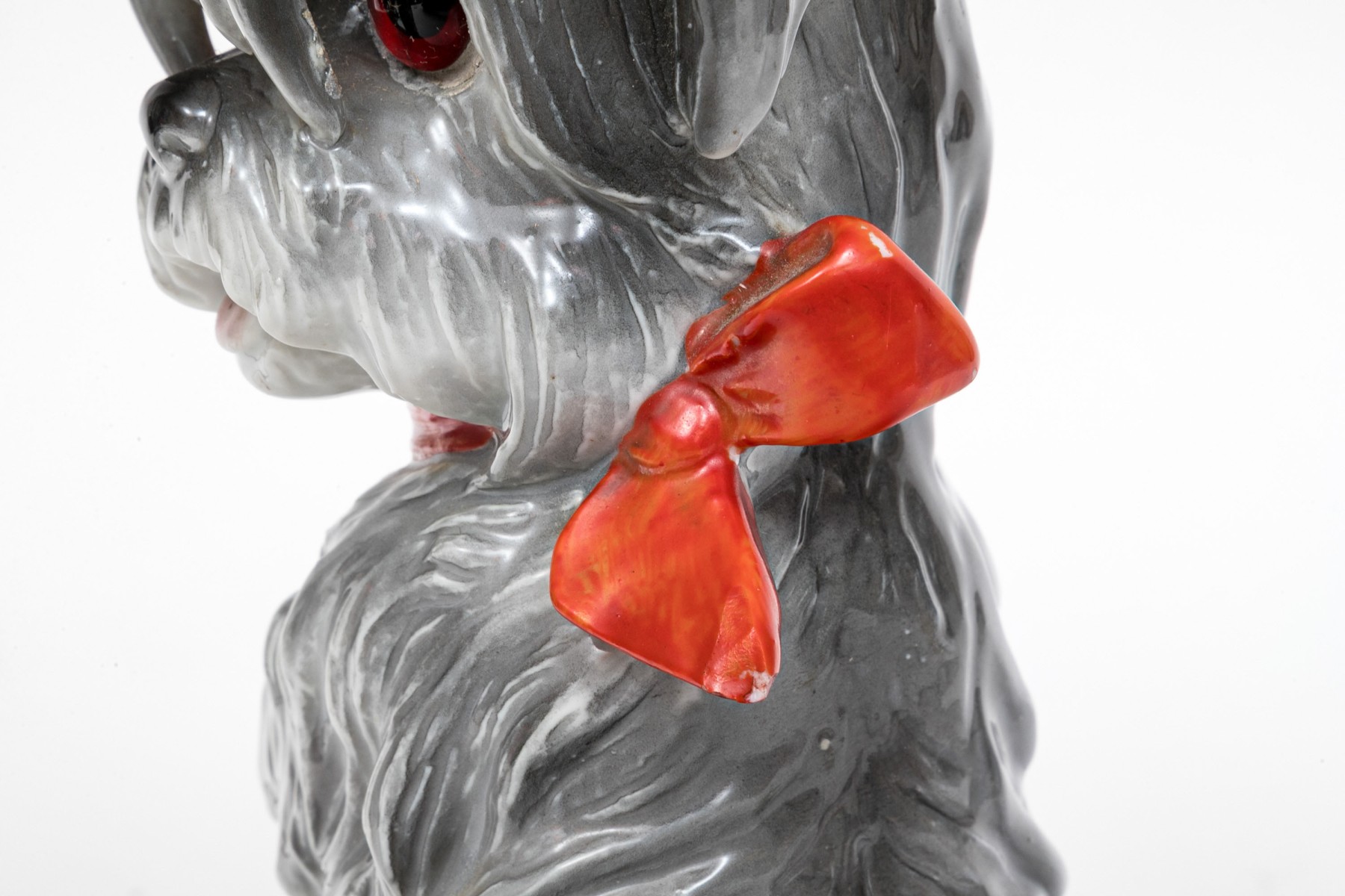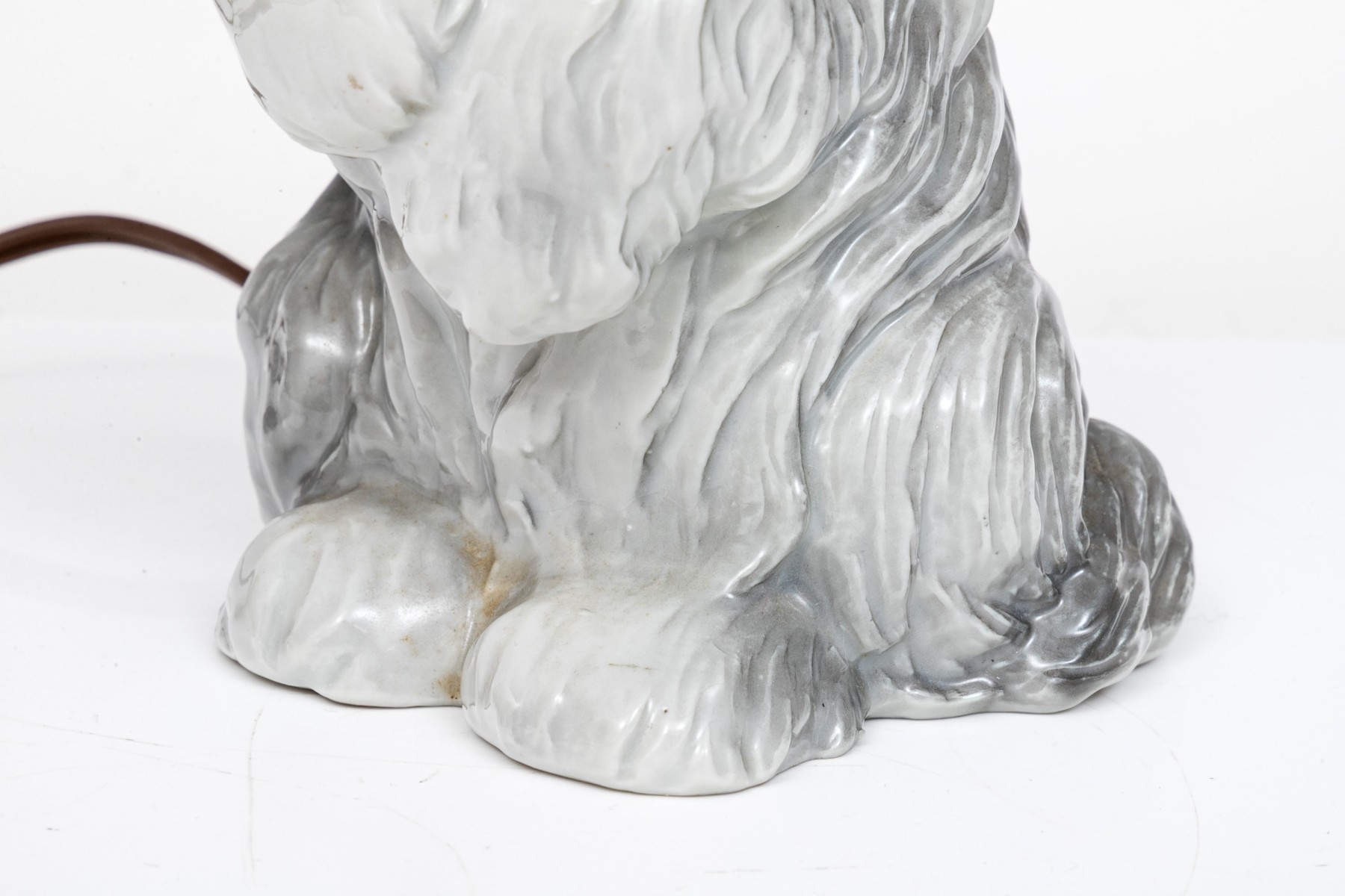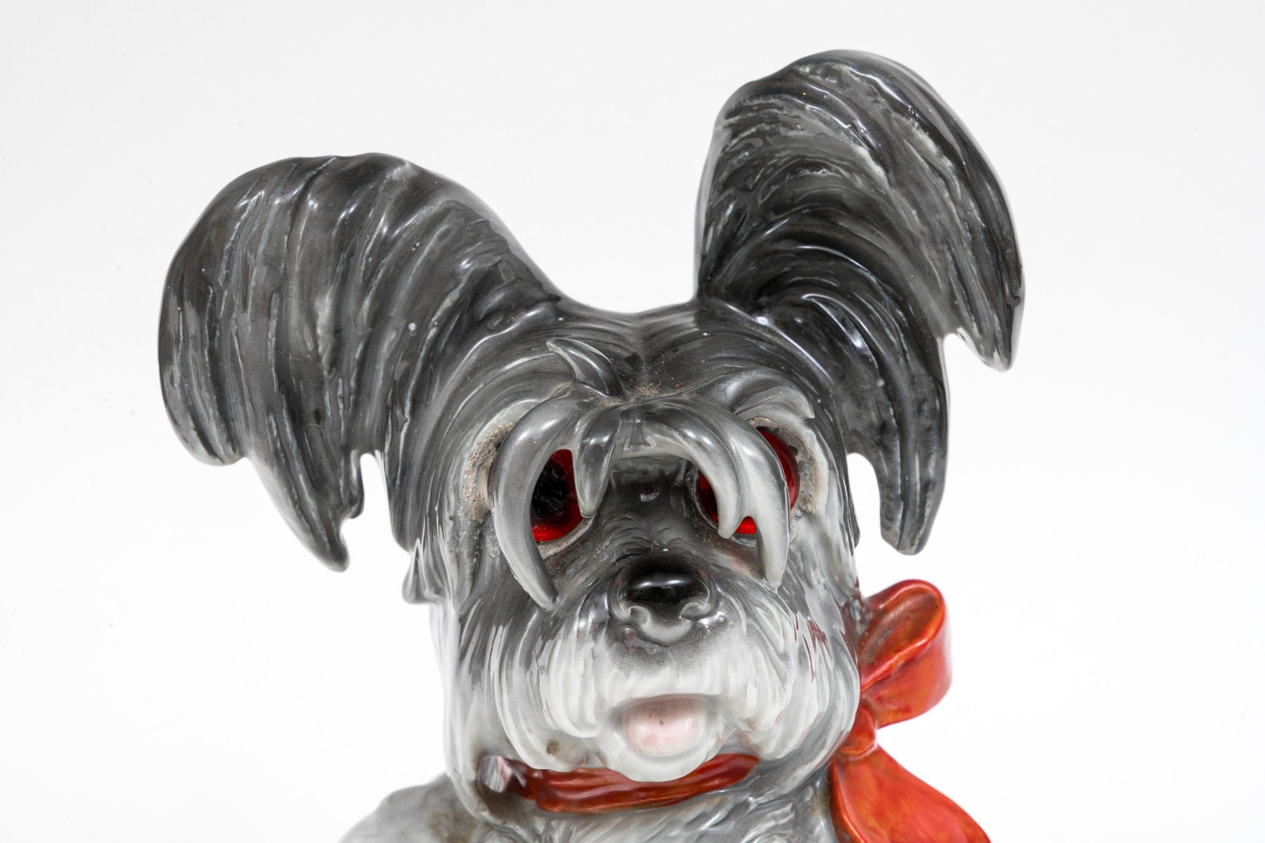 Goebel adorable vintage skye silky papillon terrier scent lamp, with gradiant grey and white toning, orange eyes and an orange bow, a scent reservoir in the back, and a light bulb interior, with cord