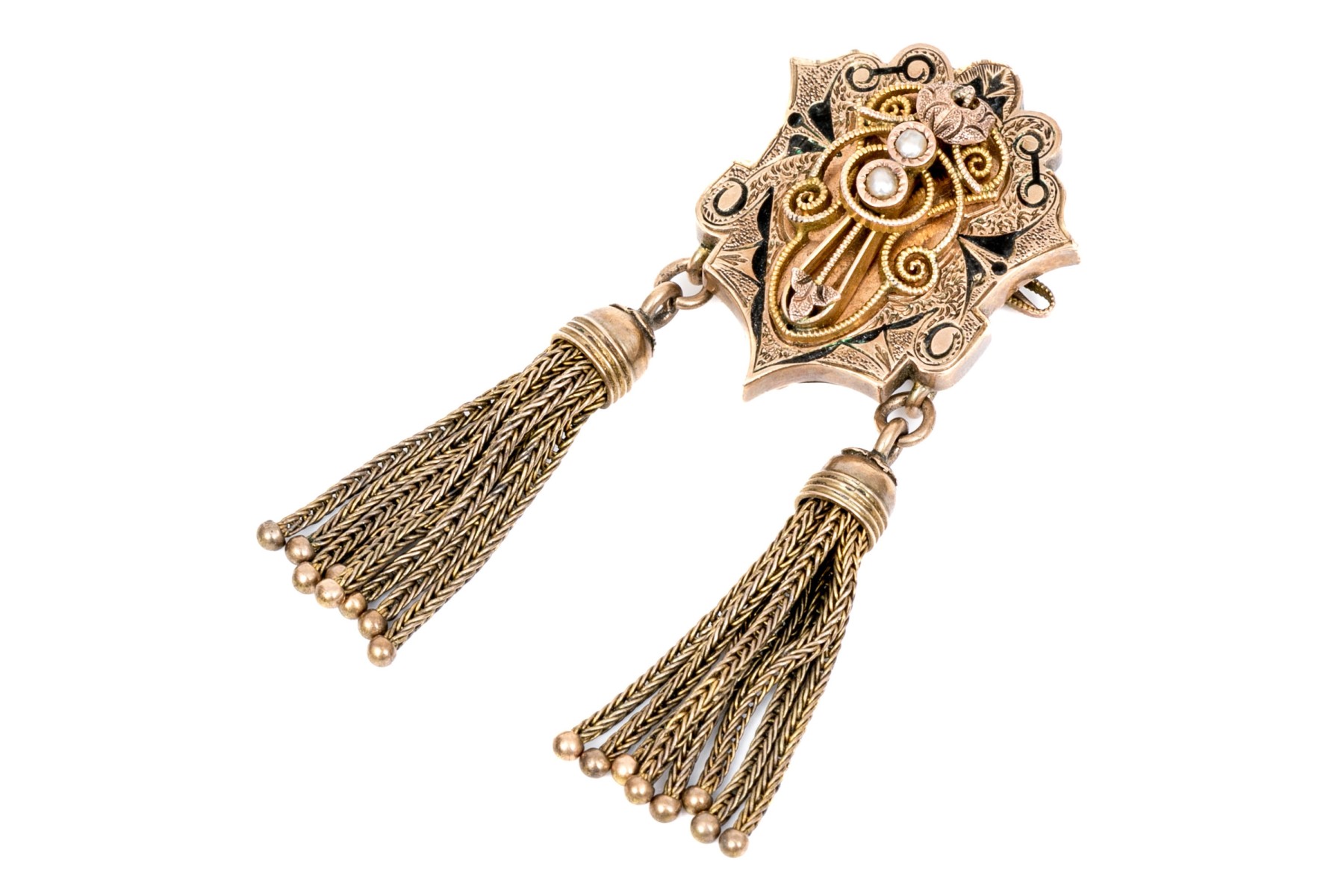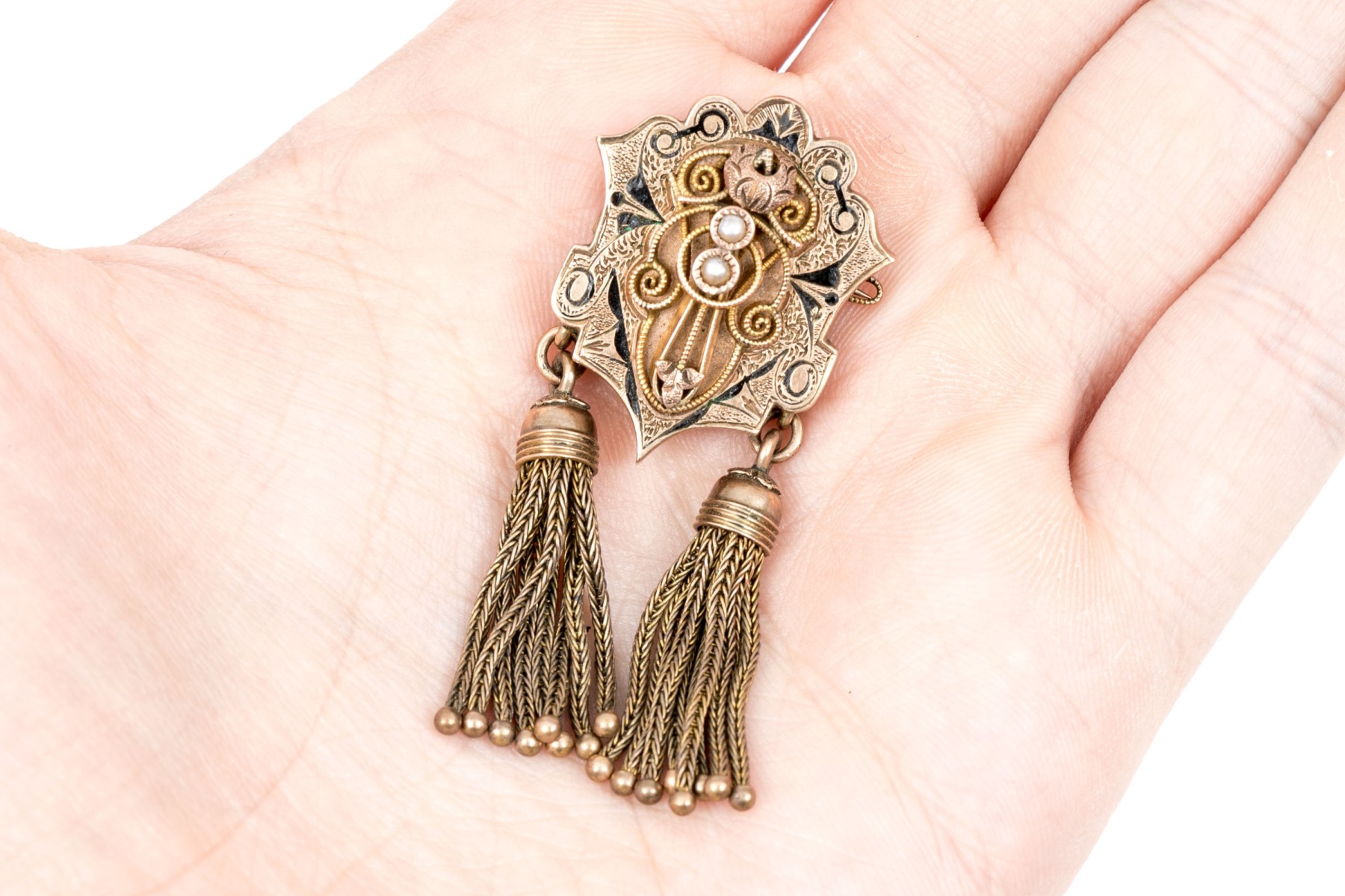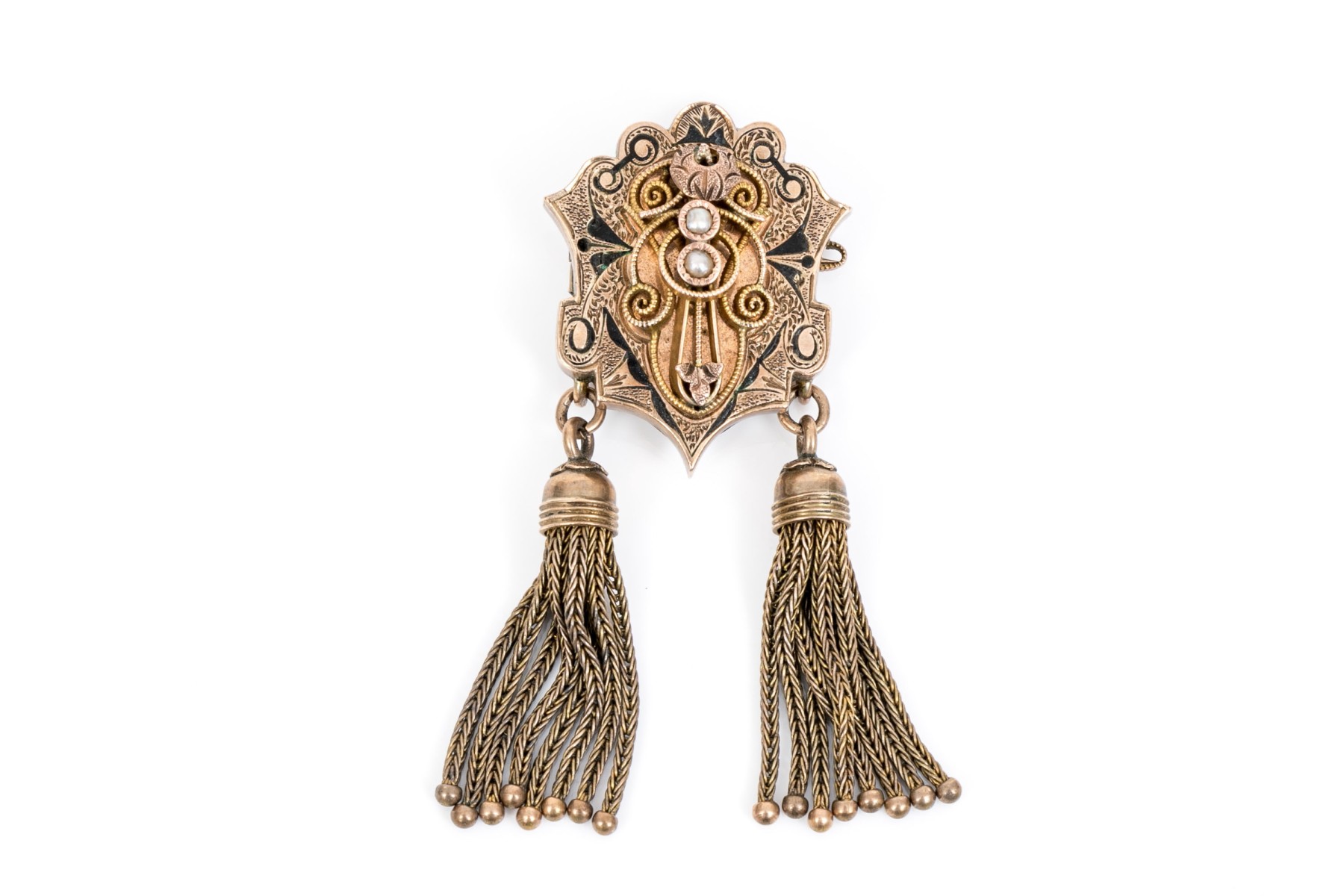 Gold filled antique fringed mourners brooch with black enamel and seed pearls