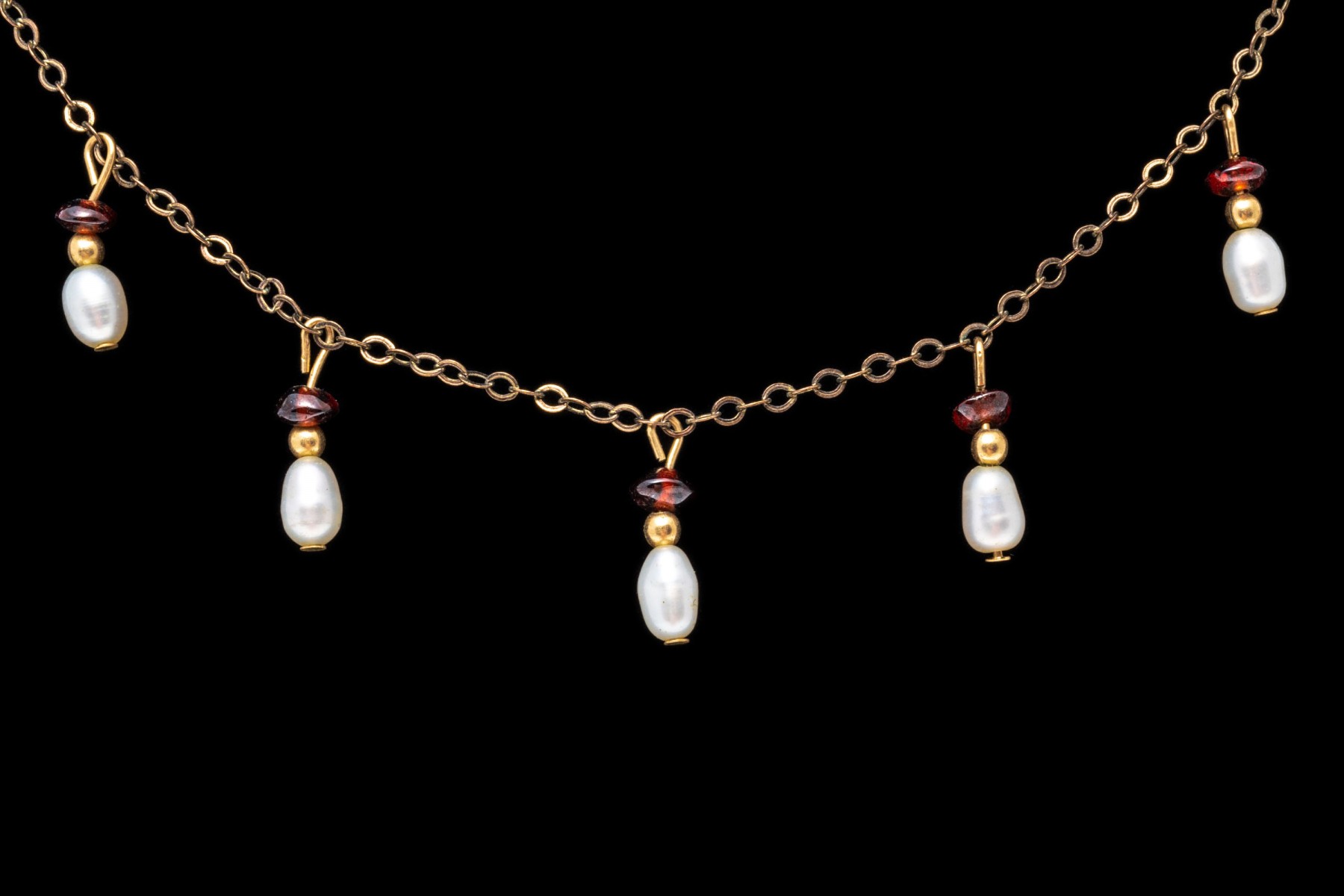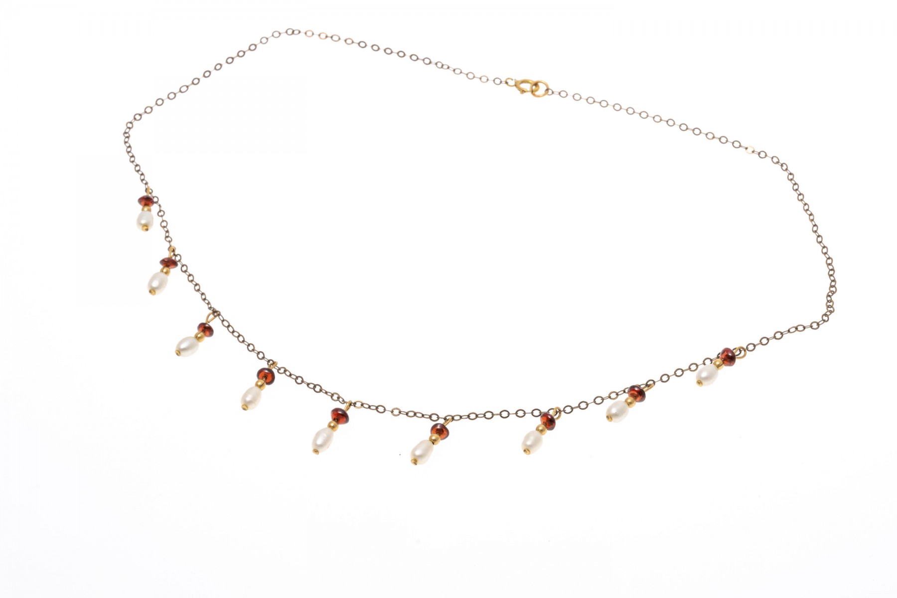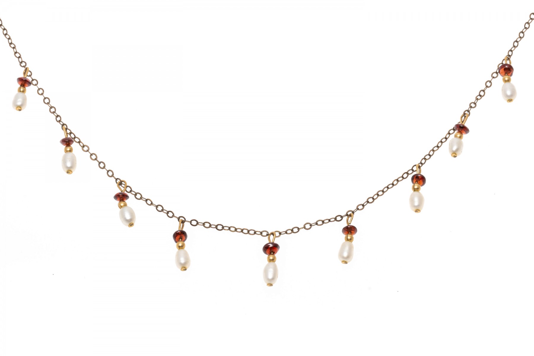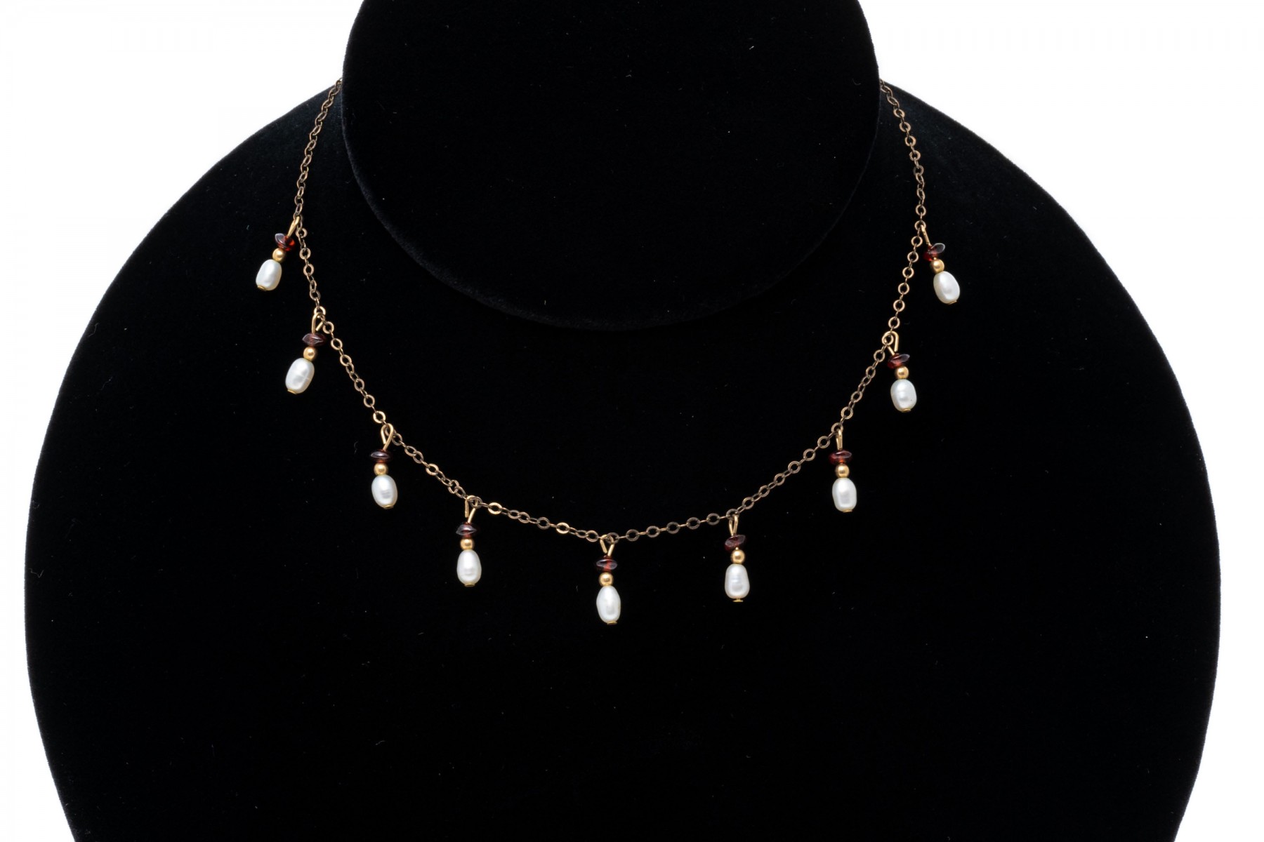 A gold filled necklace. Set at stations along this elegant necklace are baroque pearls and garnet beads. The necklaces secures with a spring ring clasp.