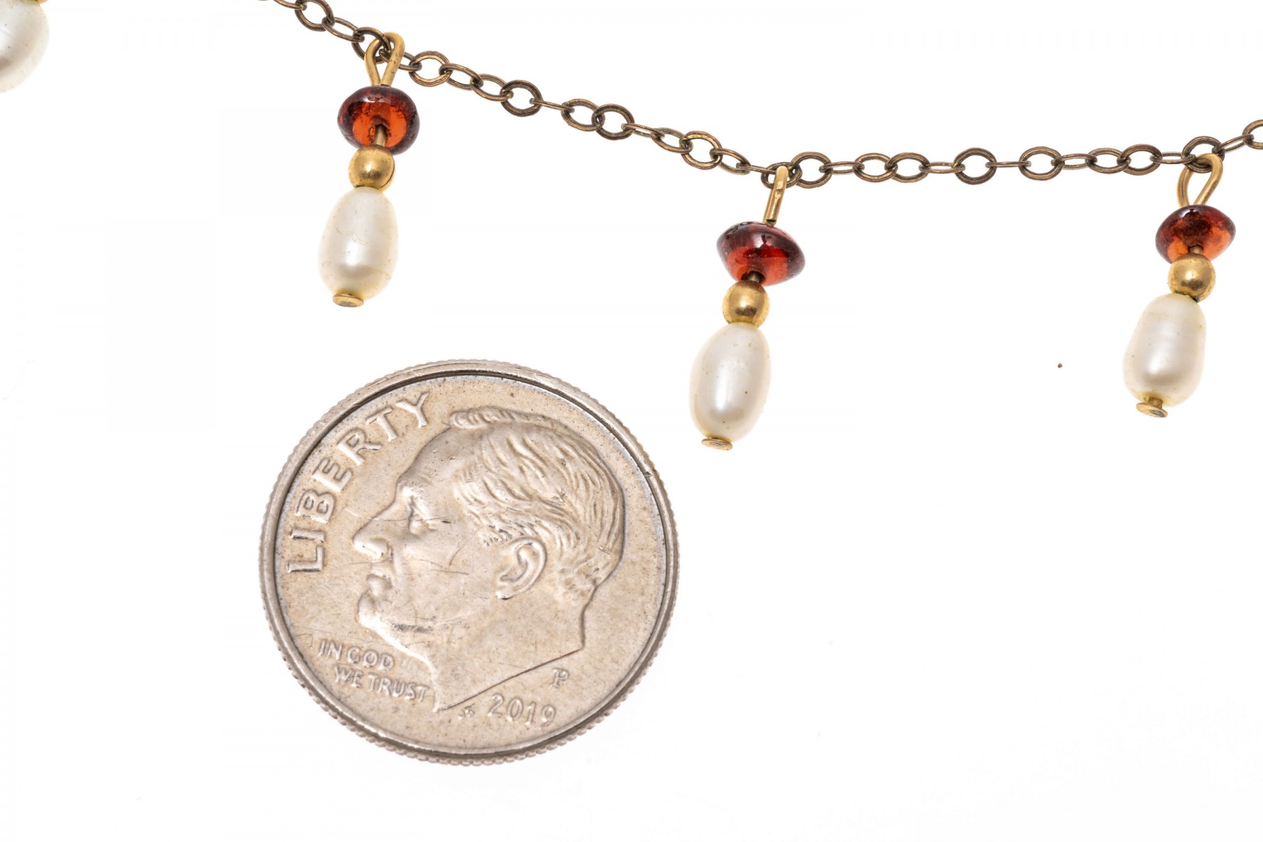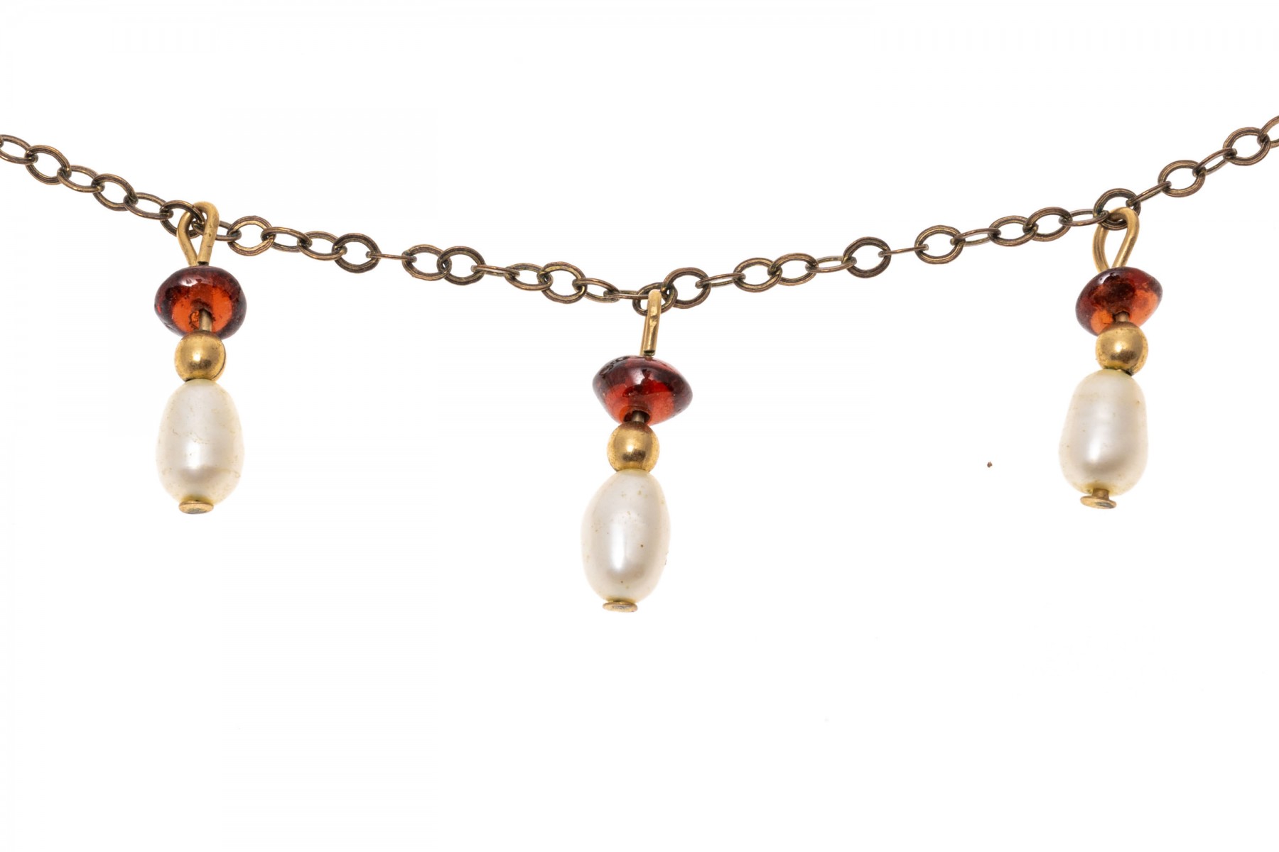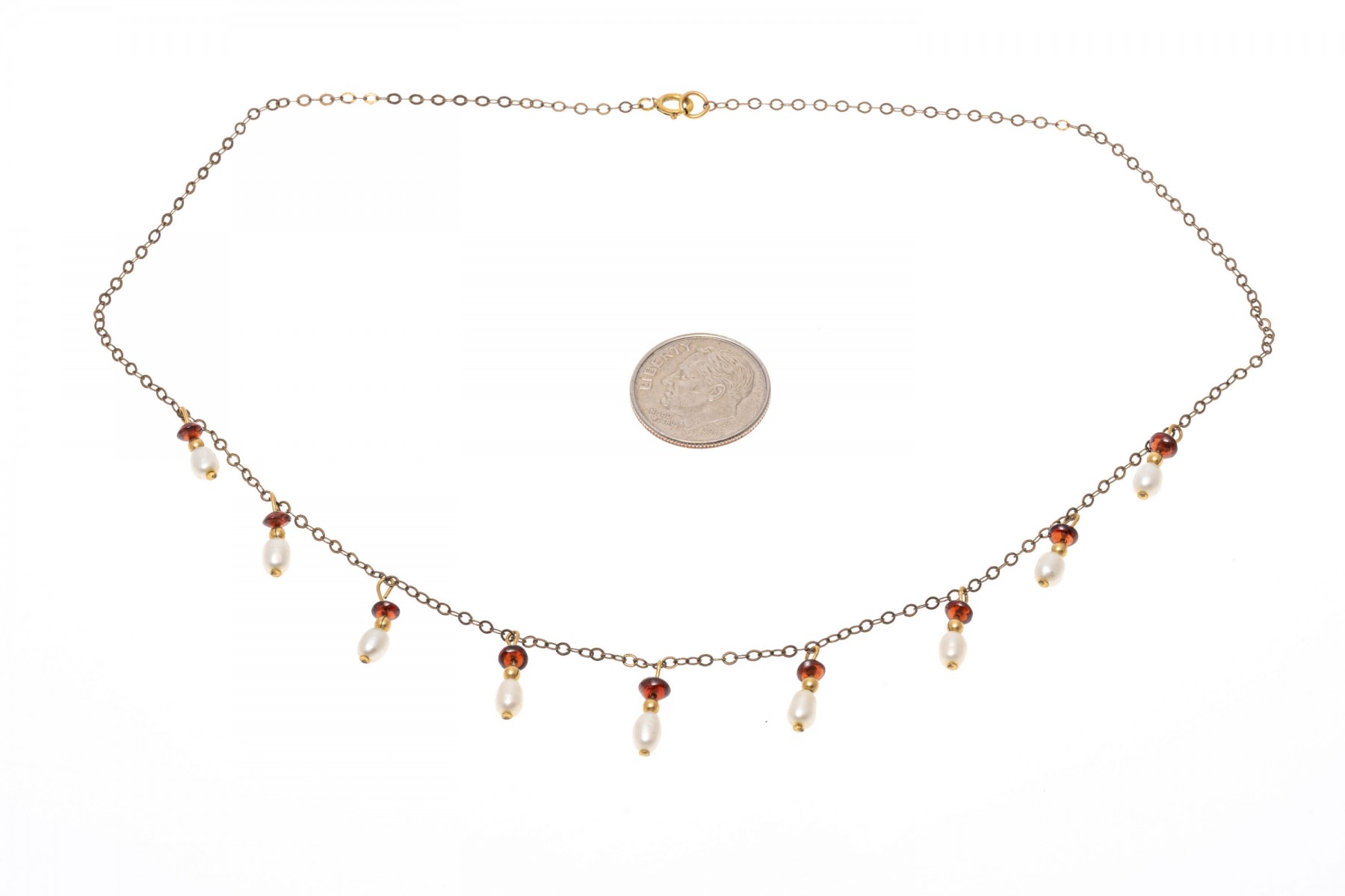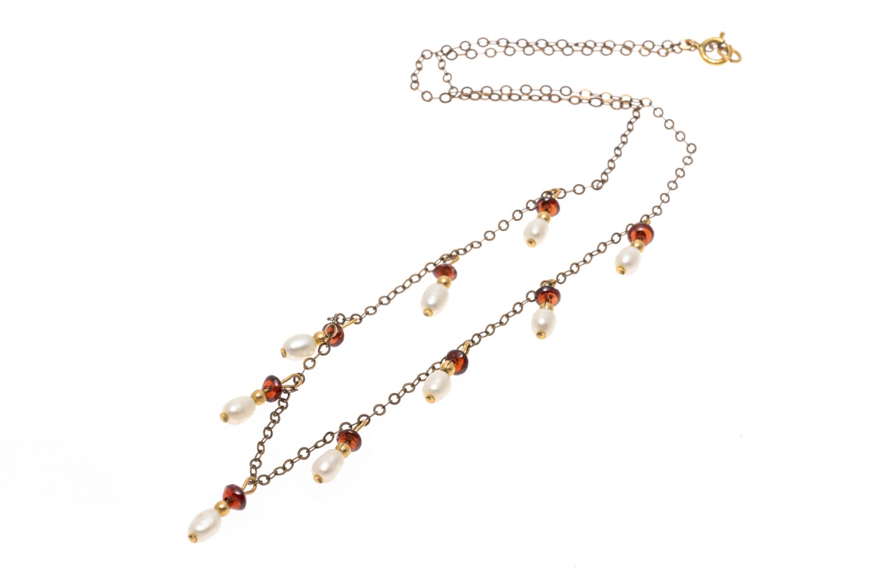 A gold filled necklace. Set at stations along this elegant necklace are baroque pearls and garnet beads. The necklaces secures with a spring ring clasp.