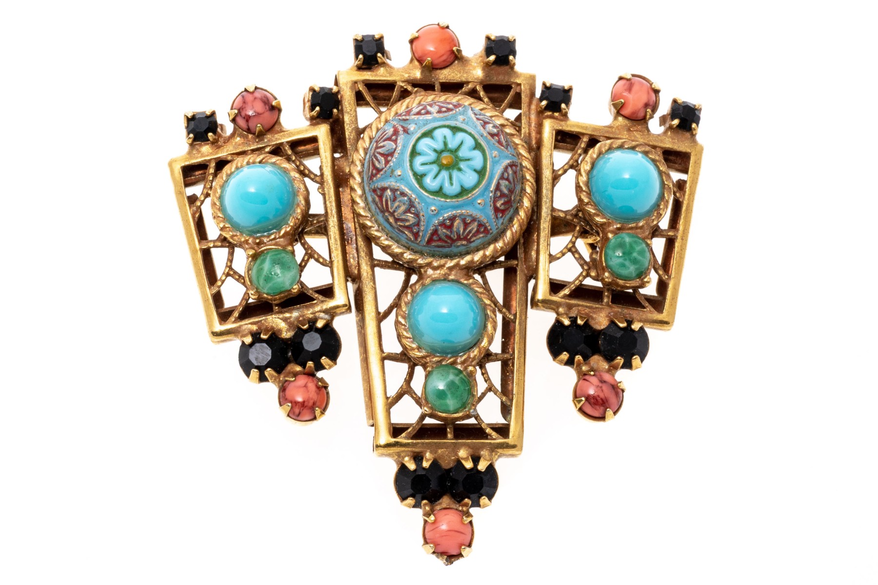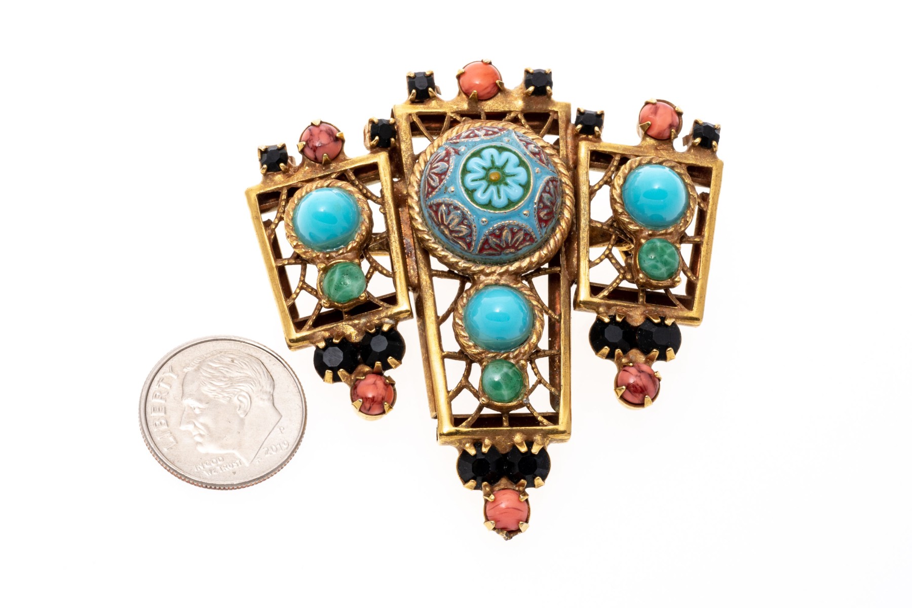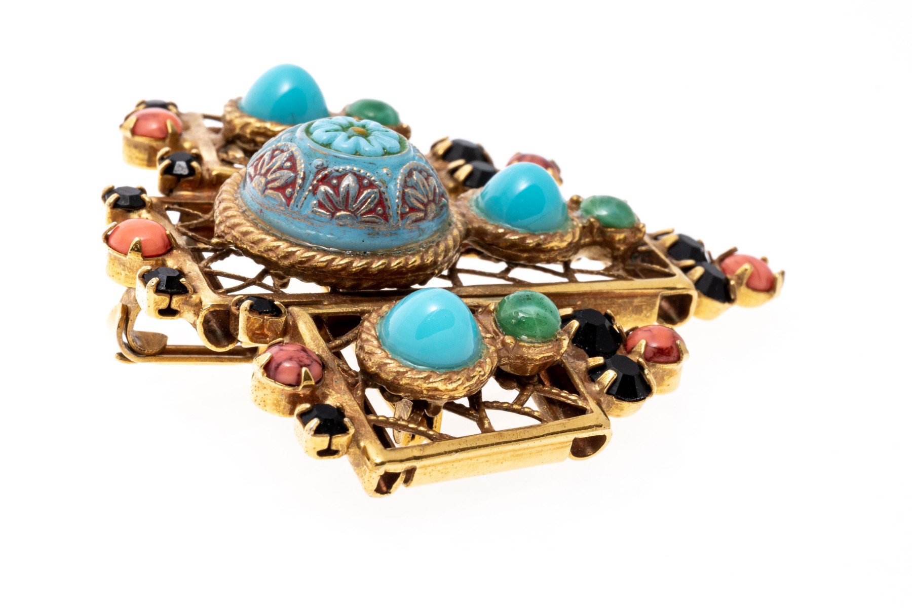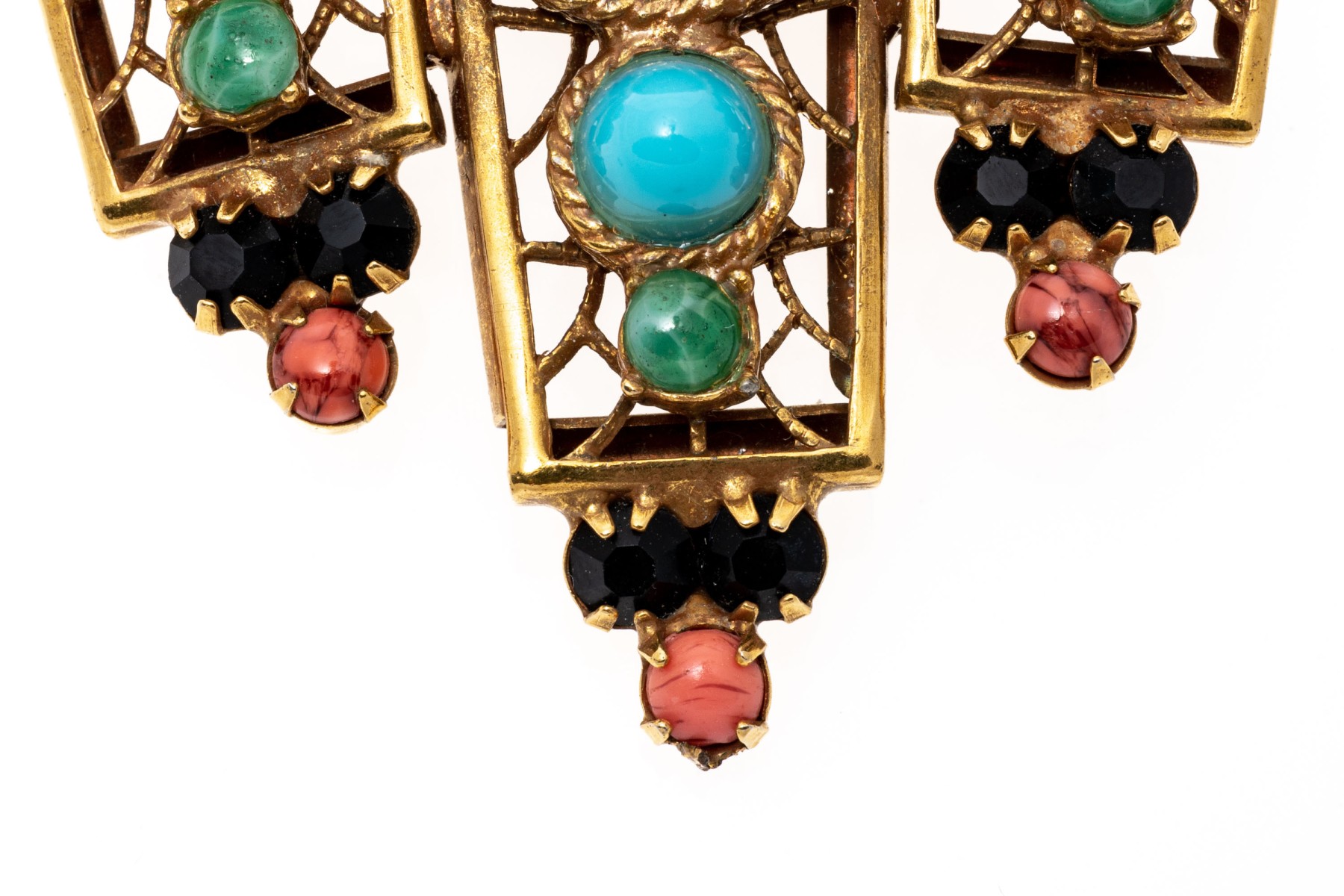 Gold plated gold pin/pendant. This decorative pin is set with multi-colored glass stones - coral, turquoise blue, black and green, set into a filgreed vertical profile. The pin can also be worn as a pendant.