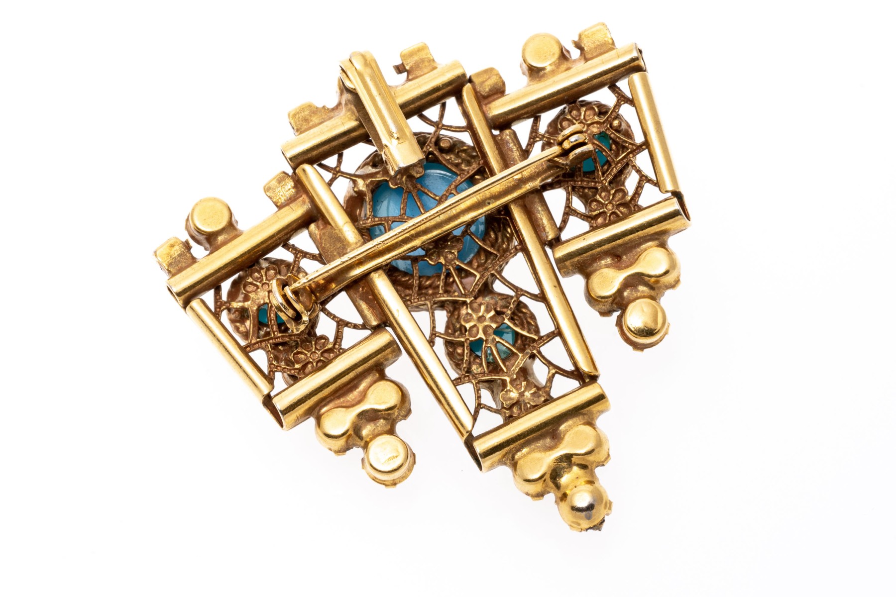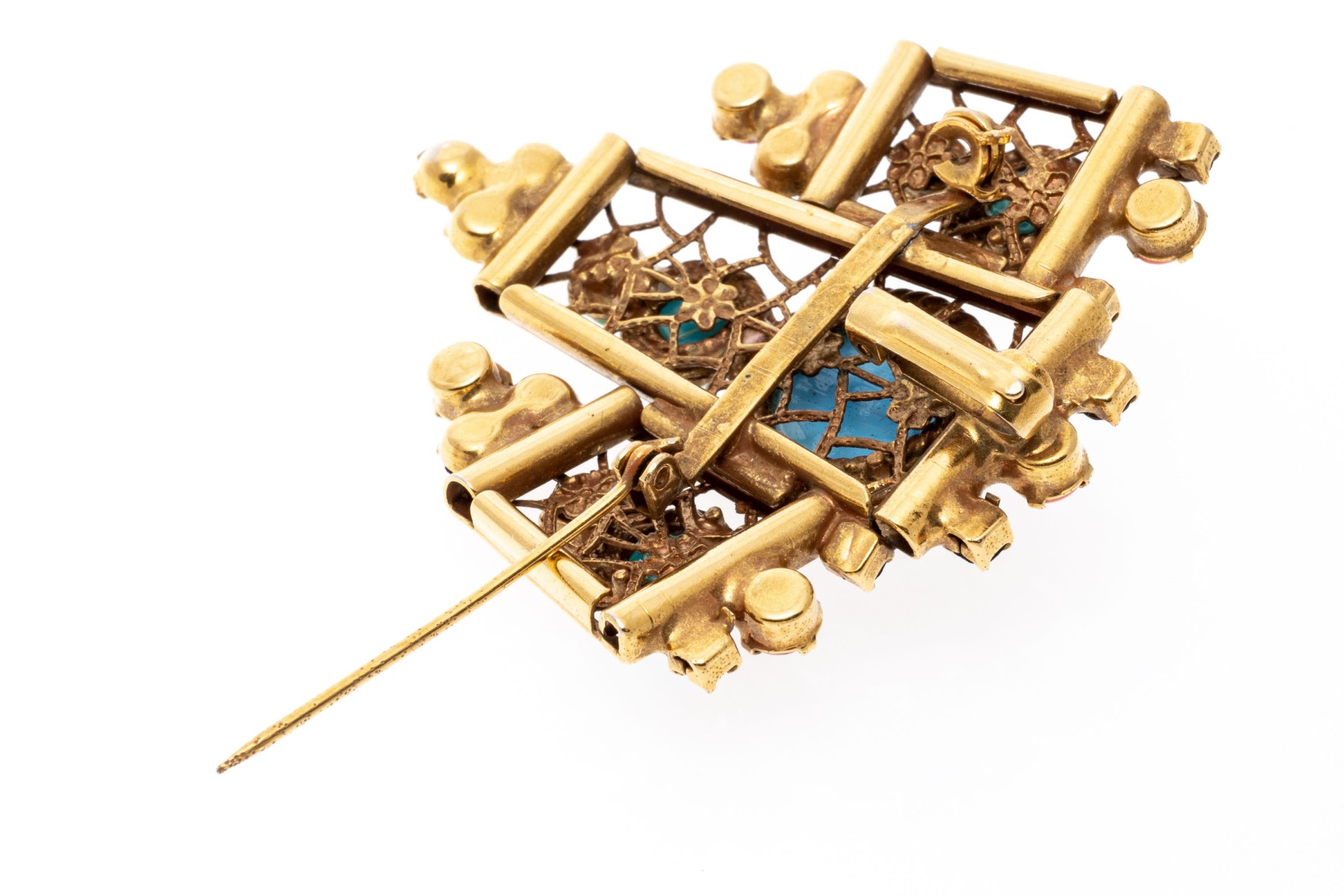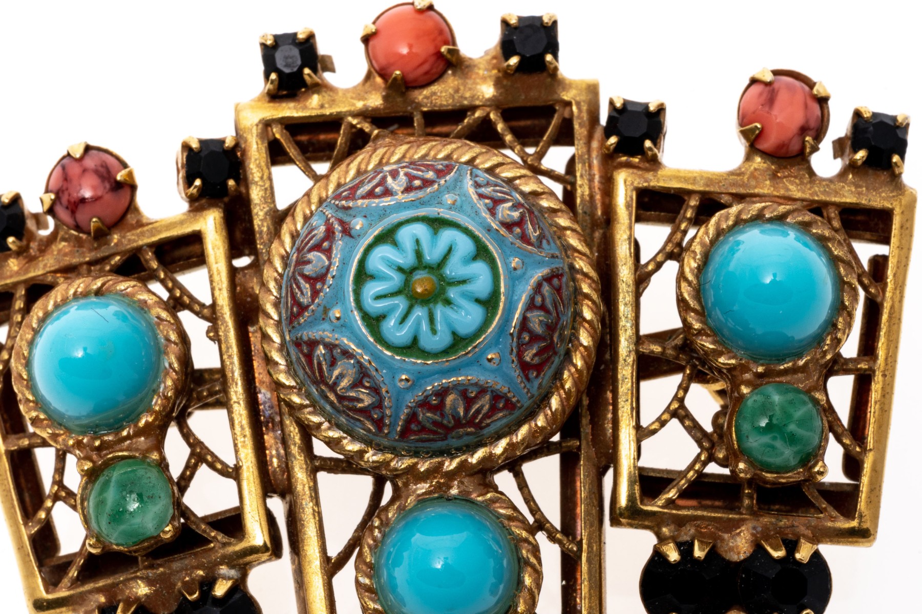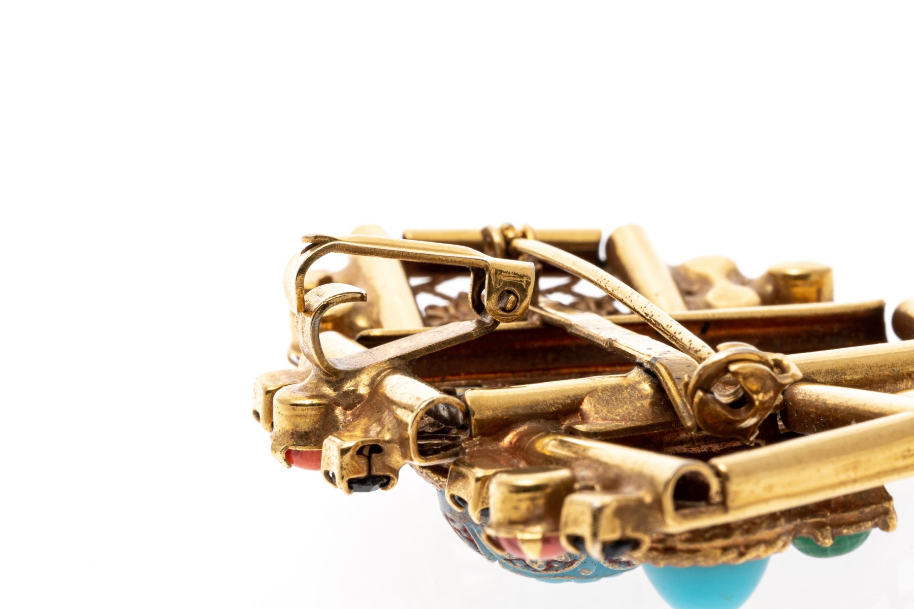 Gold plated gold pin/pendant. This decorative pin is set with multi-colored glass stones - coral, turquoise blue, black and green, set into a filgreed vertical profile. The pin can also be worn as a pendant.
