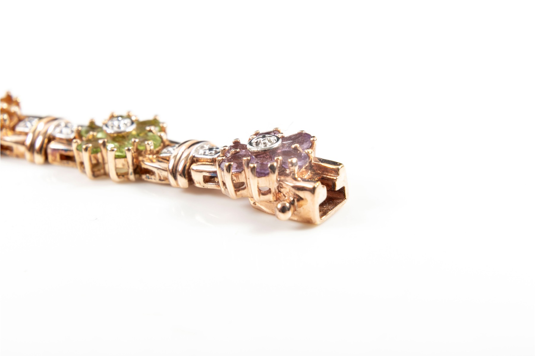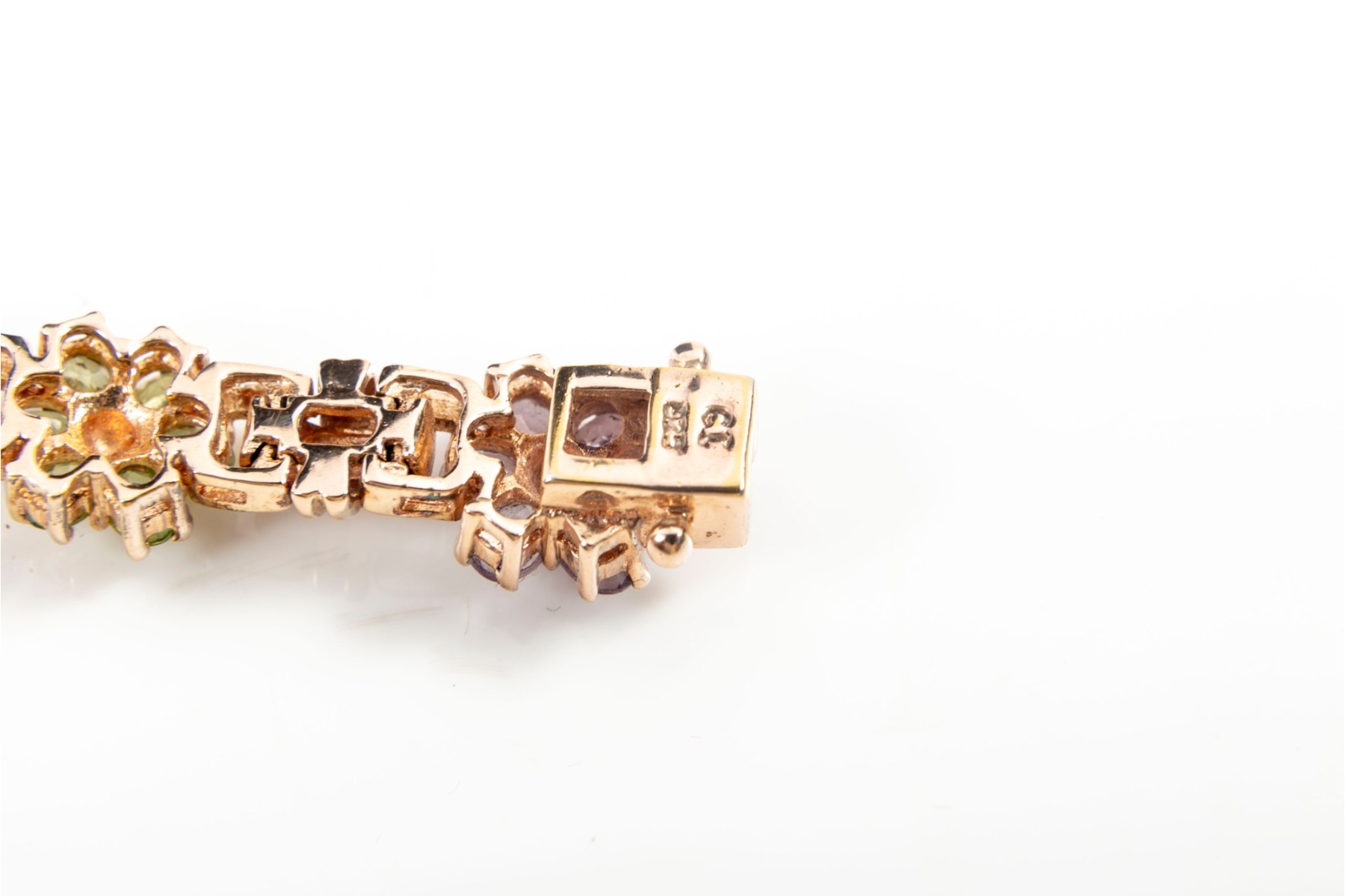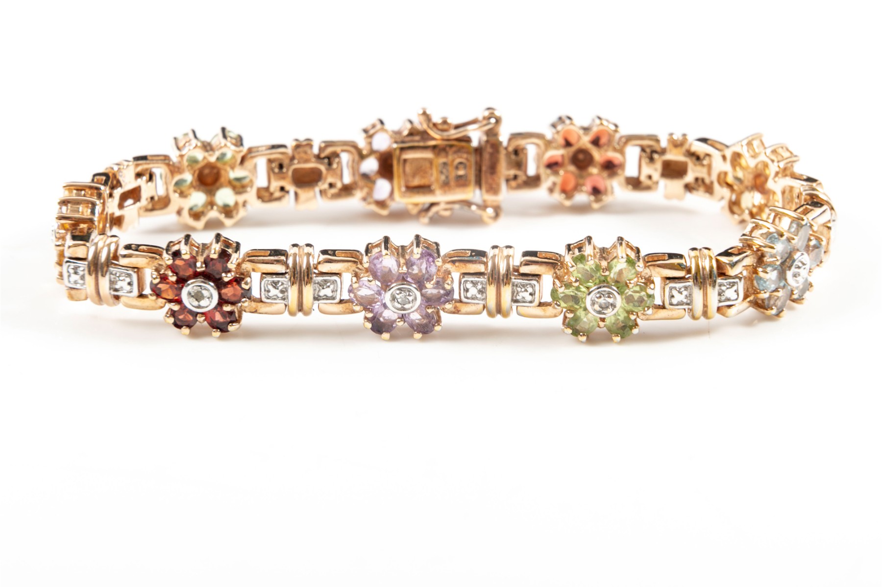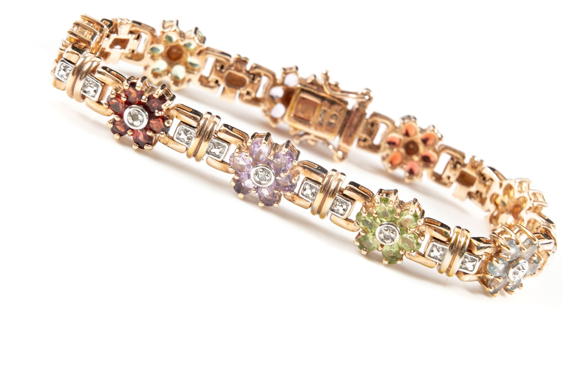 A gorgeous bracelet composed of gold-plated 925 sterling silver, adorned with prong-set garnets, amethyst, emeralds, citrines and topaz stones in brilliant oval cuts.