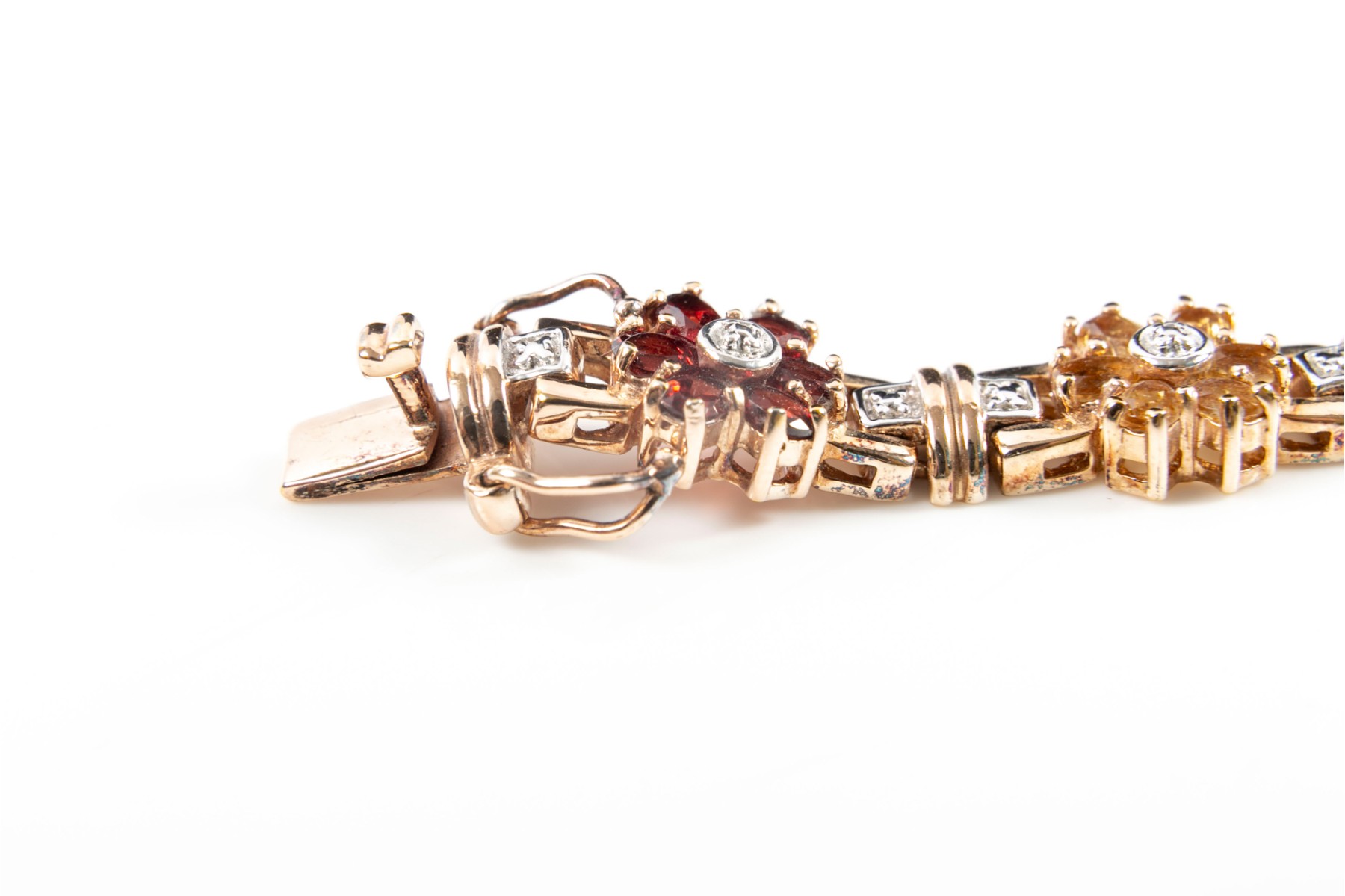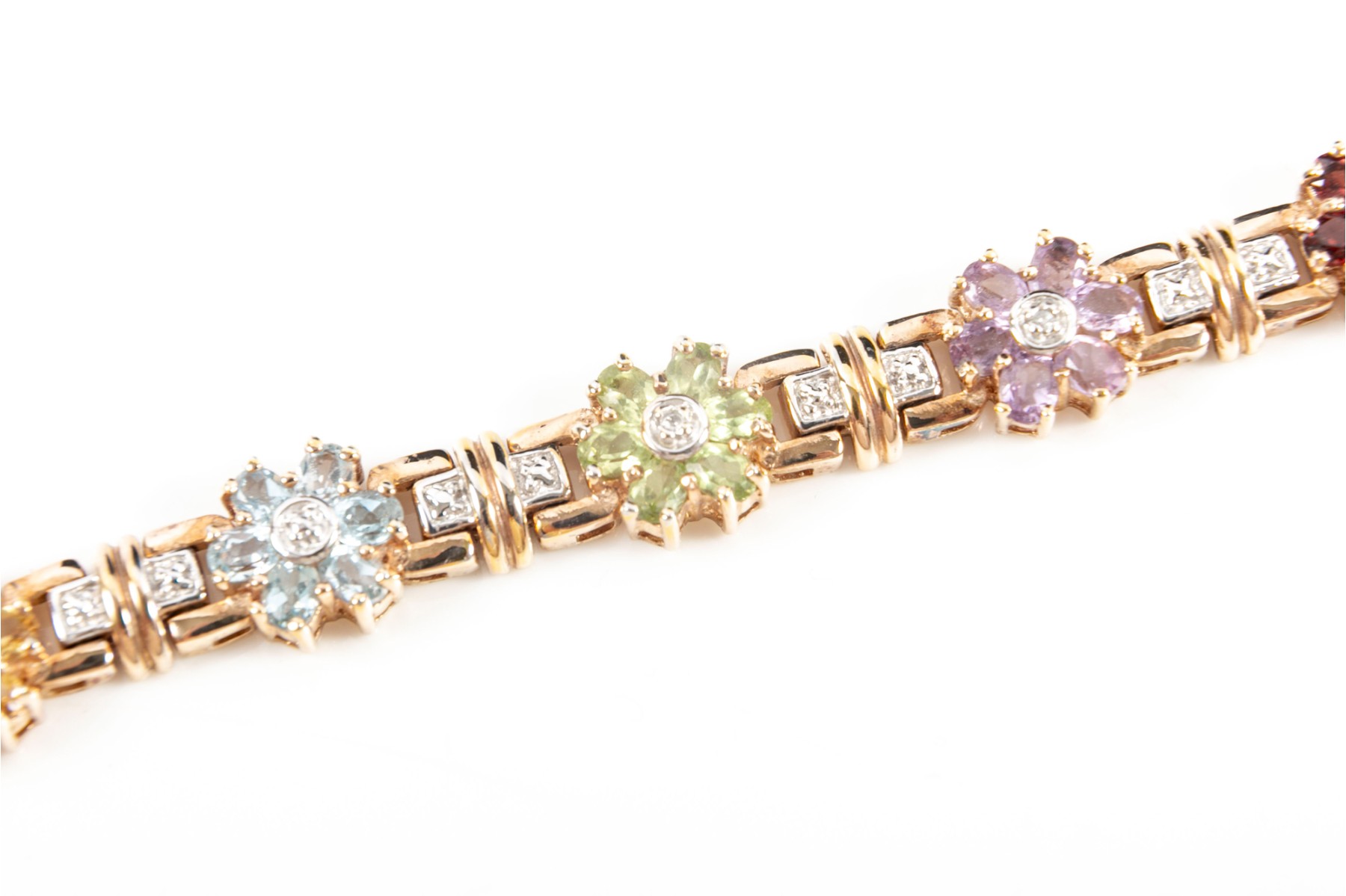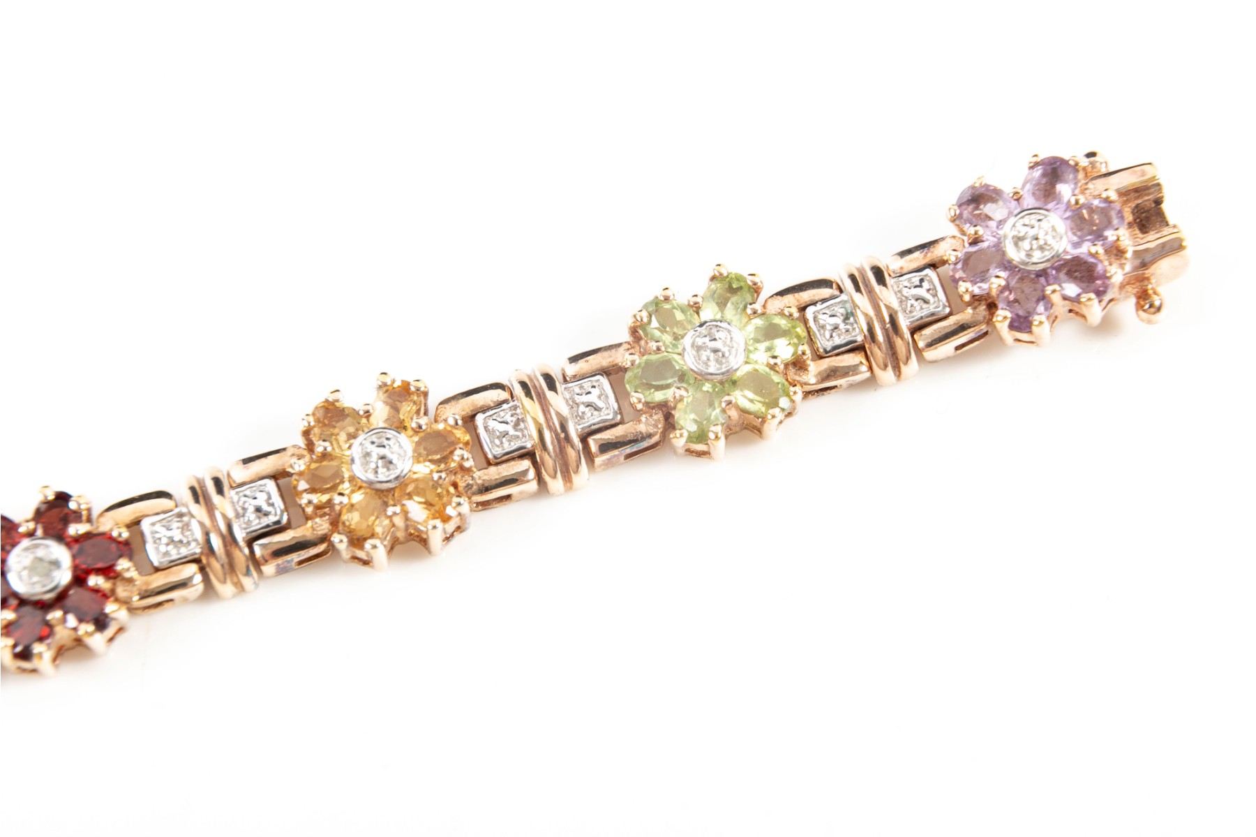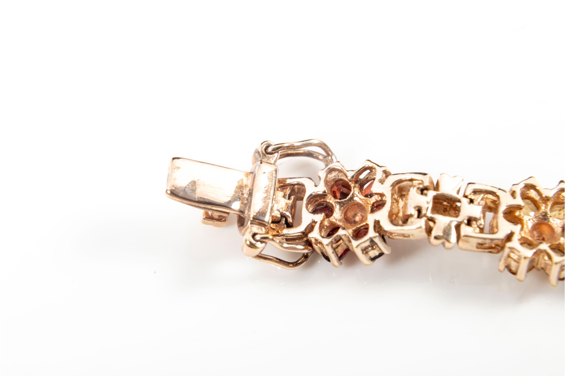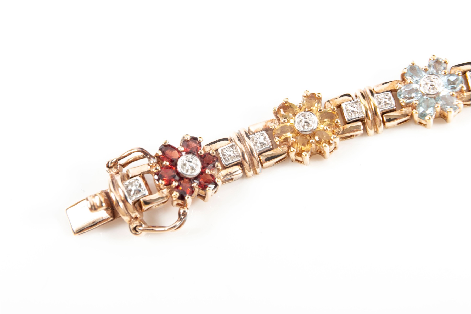 A gorgeous bracelet composed of gold-plated 925 sterling silver, adorned with prong-set garnets, amethyst, emeralds, citrines and topaz stones in brilliant oval cuts.
