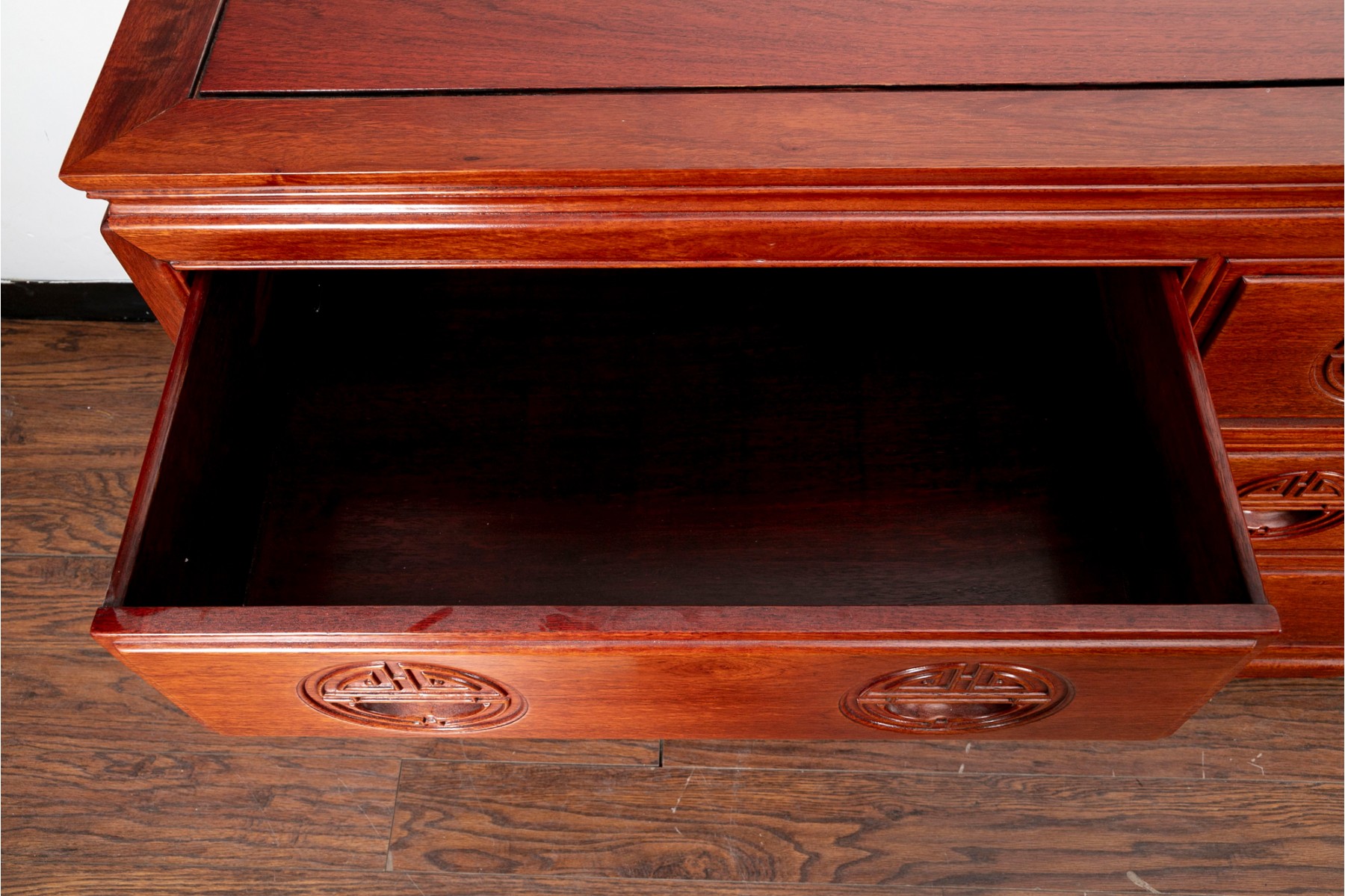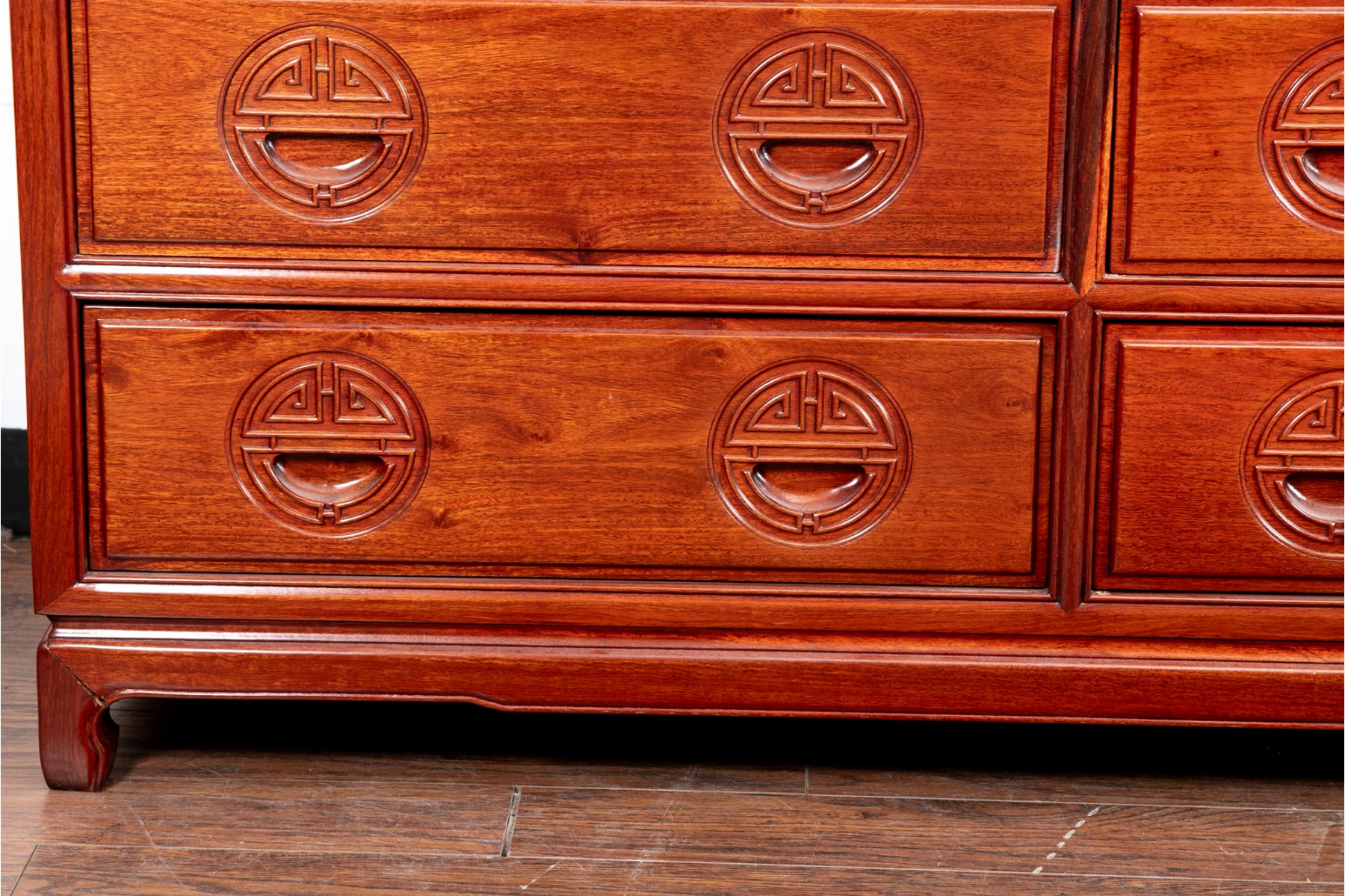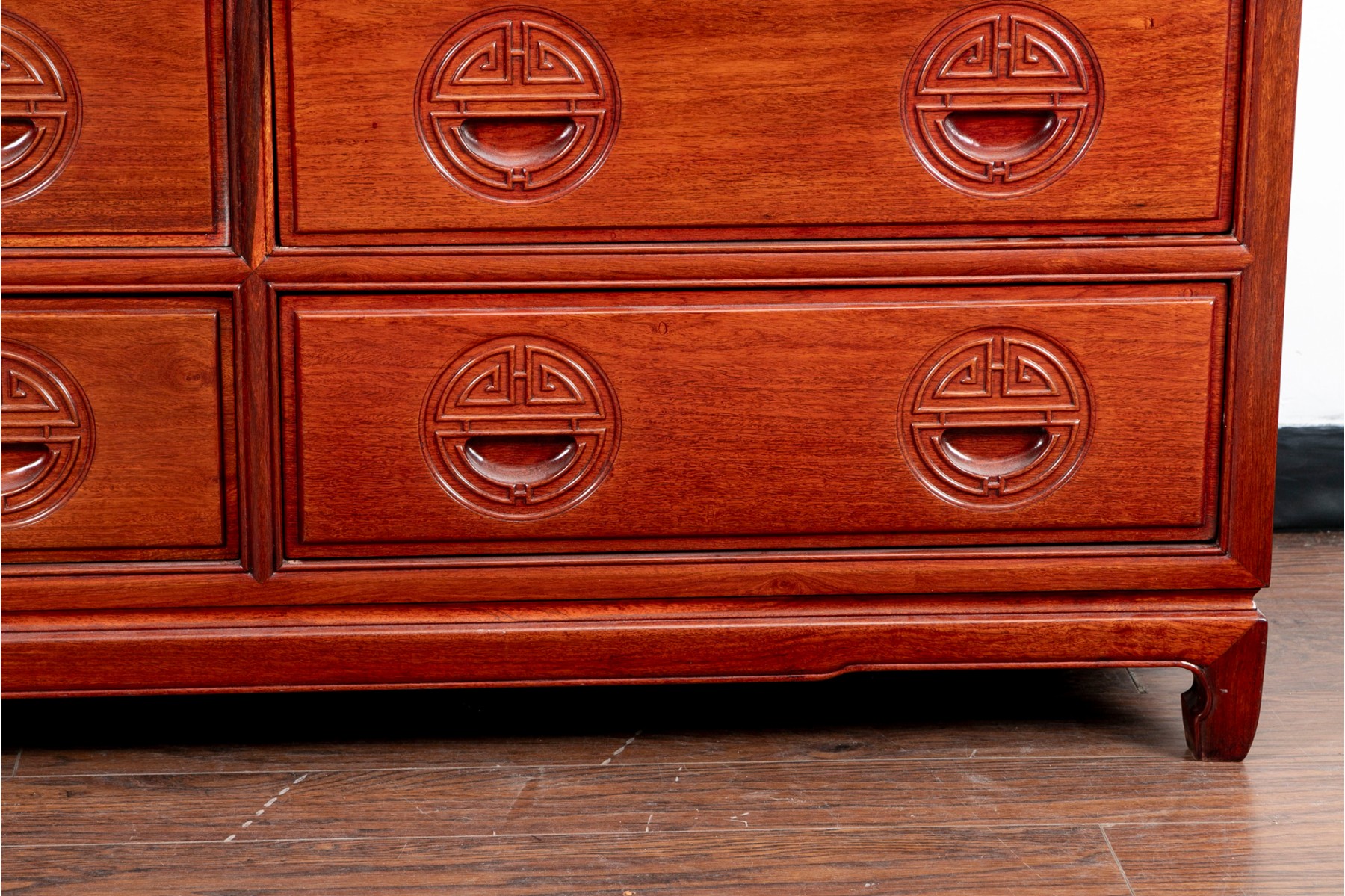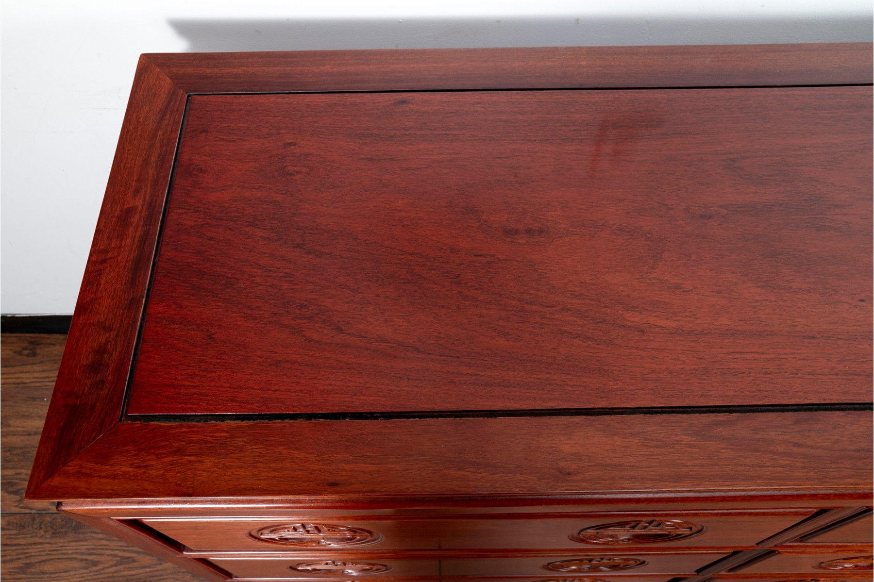 A Chinese dresser in a gorgeous rosewood finish, displaying six drawers each adorned with two handles on circular relief medallions. Simply and elegantly designed with sleek, trimmed lines throughout.