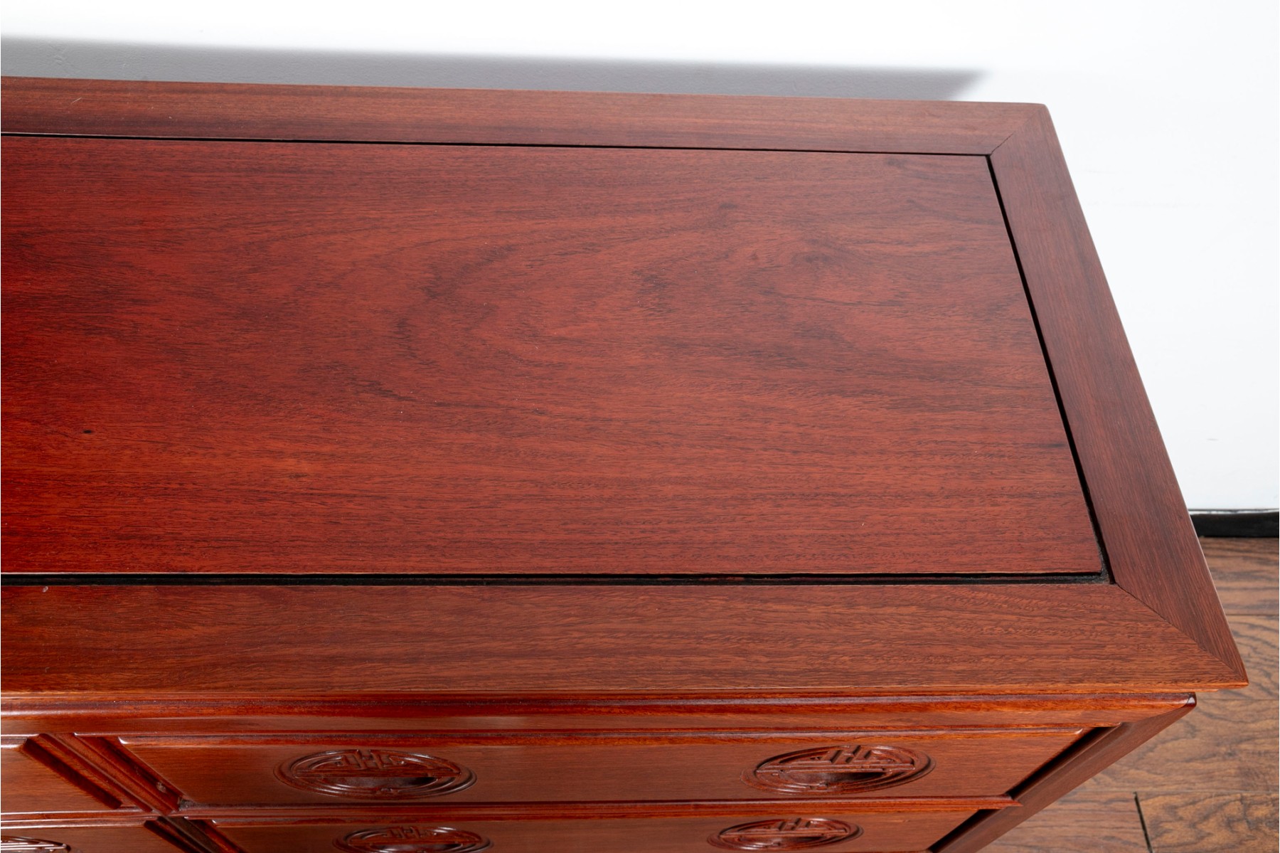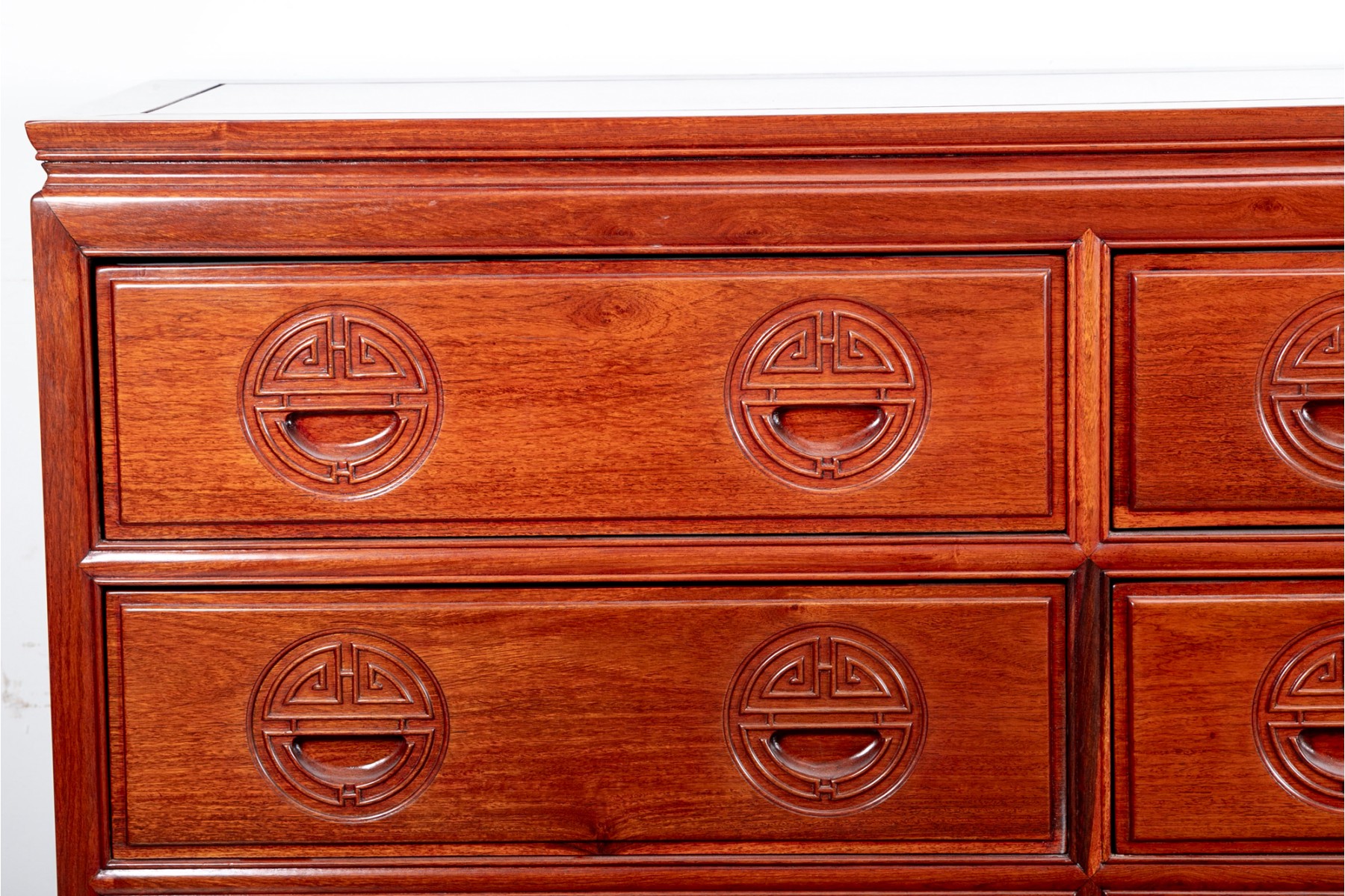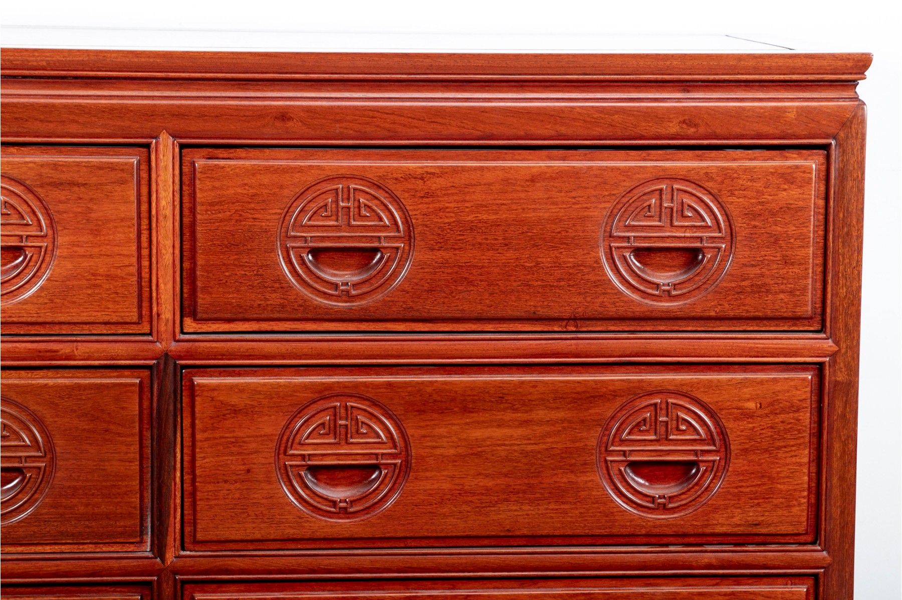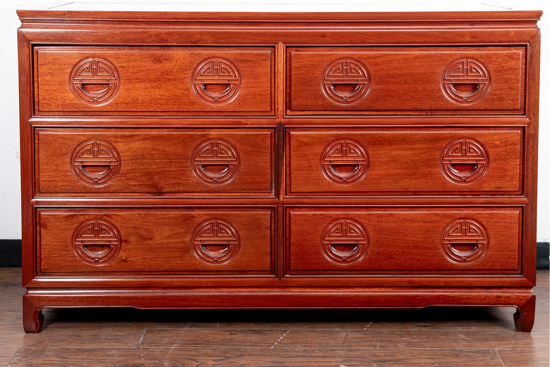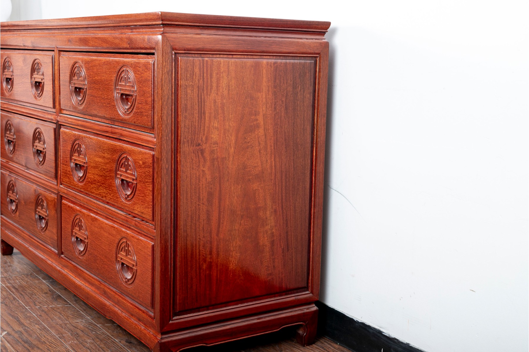 A Chinese dresser in a gorgeous rosewood finish, displaying six drawers each adorned with two handles on circular relief medallions. Simply and elegantly designed with sleek, trimmed lines throughout.