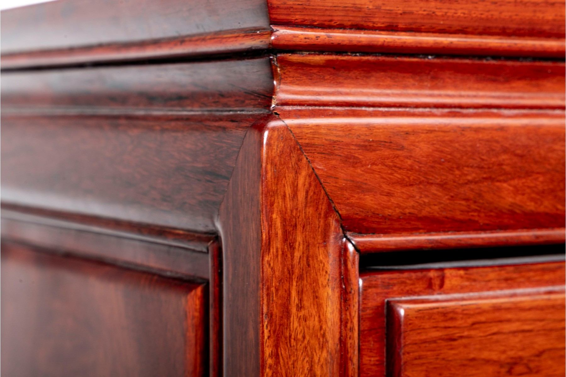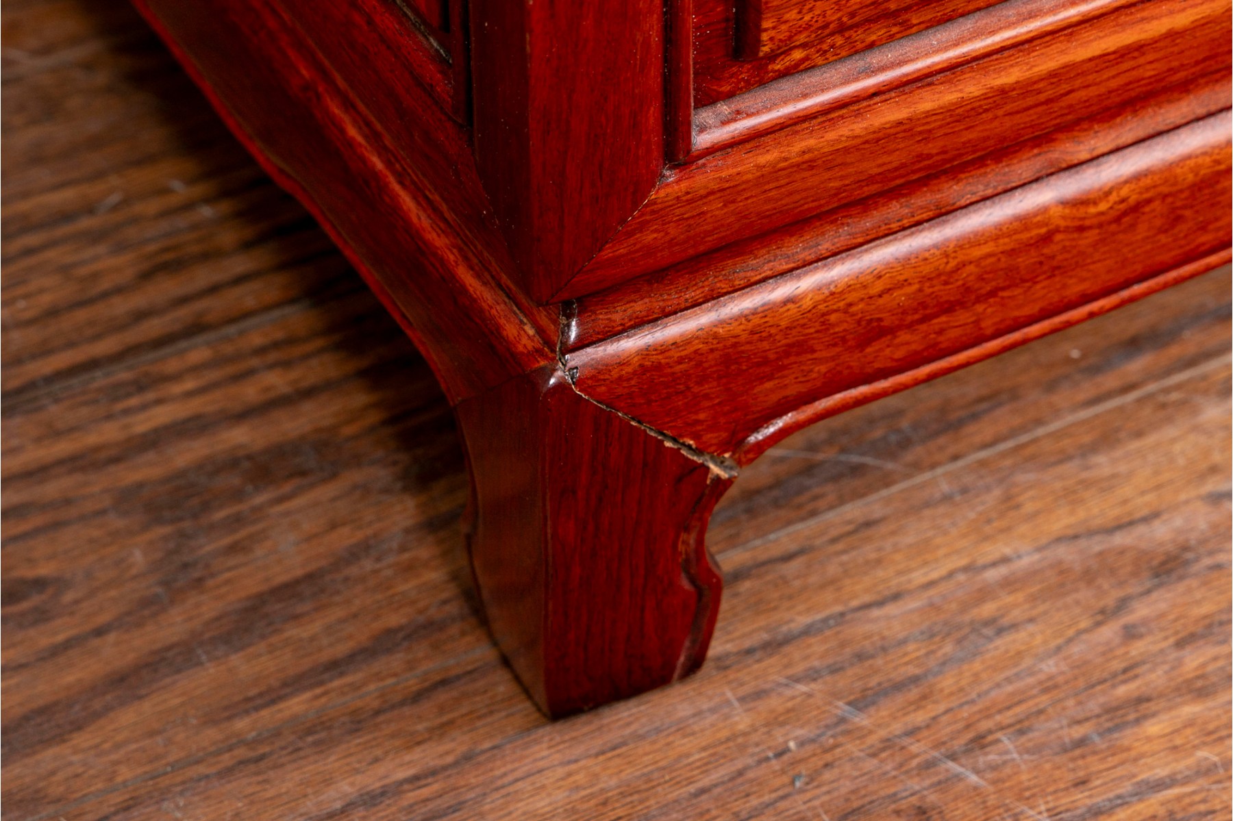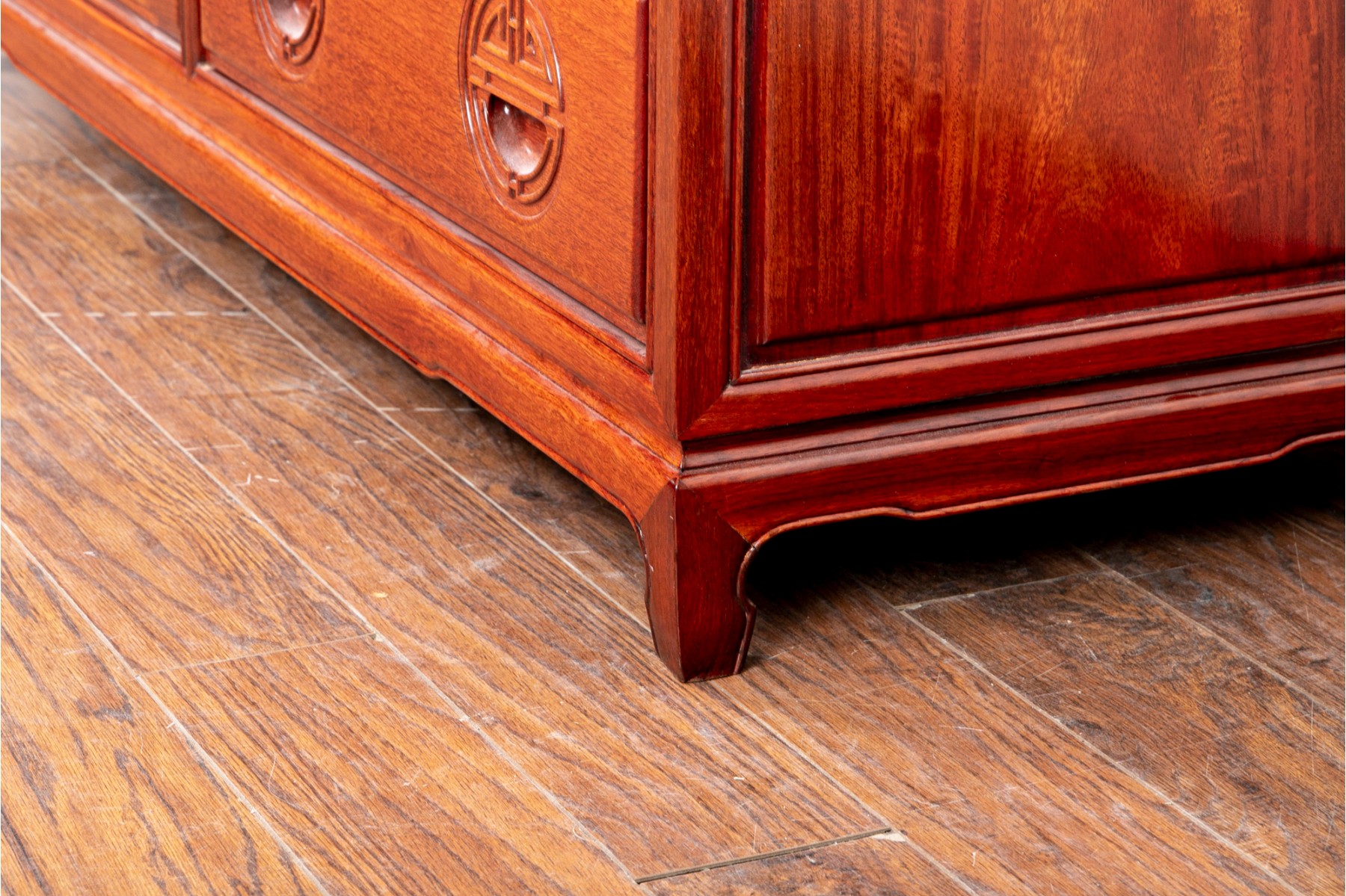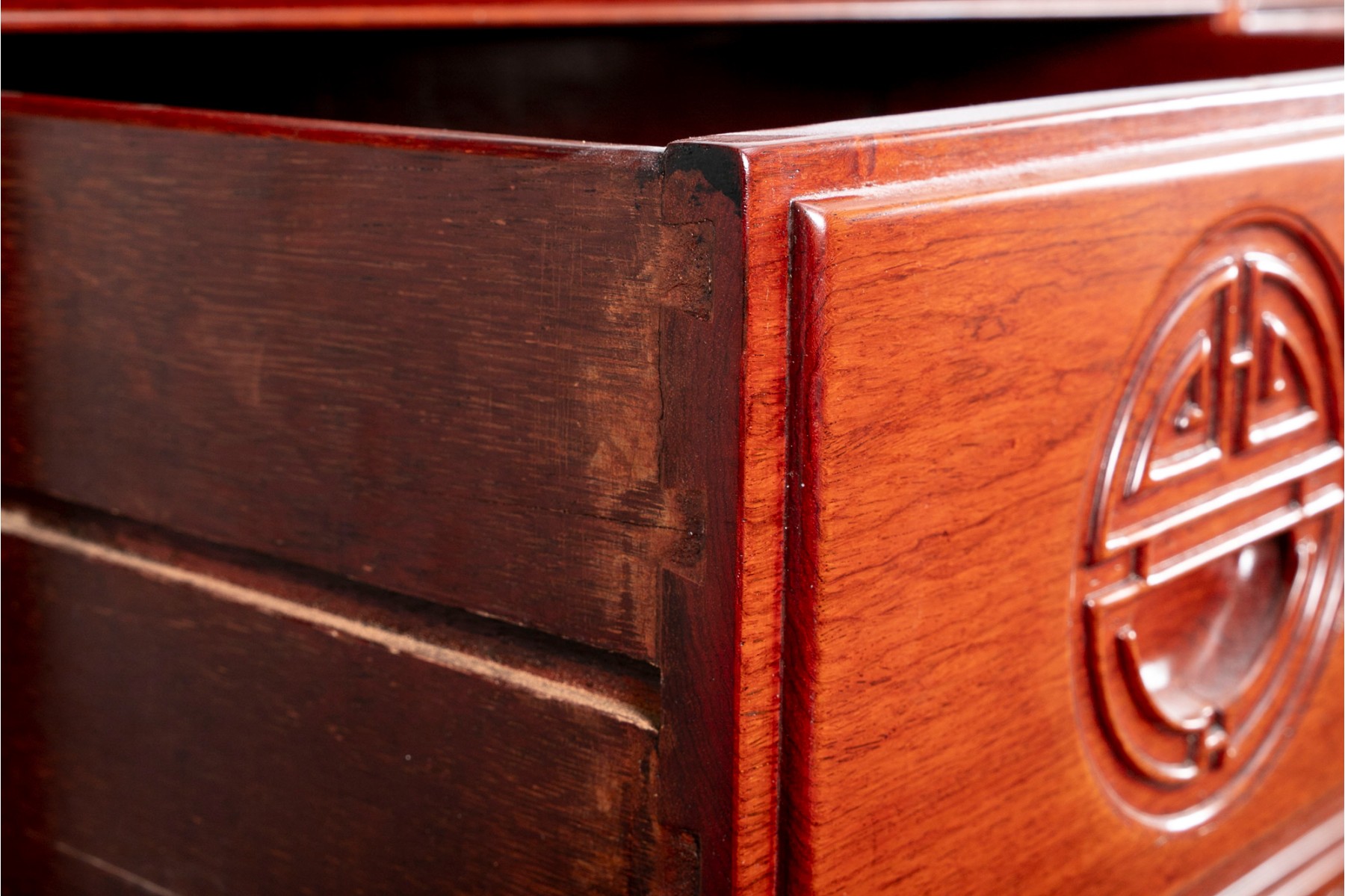 A Chinese dresser in a gorgeous rosewood finish, displaying six drawers each adorned with two handles on circular relief medallions. Simply and elegantly designed with sleek, trimmed lines throughout.