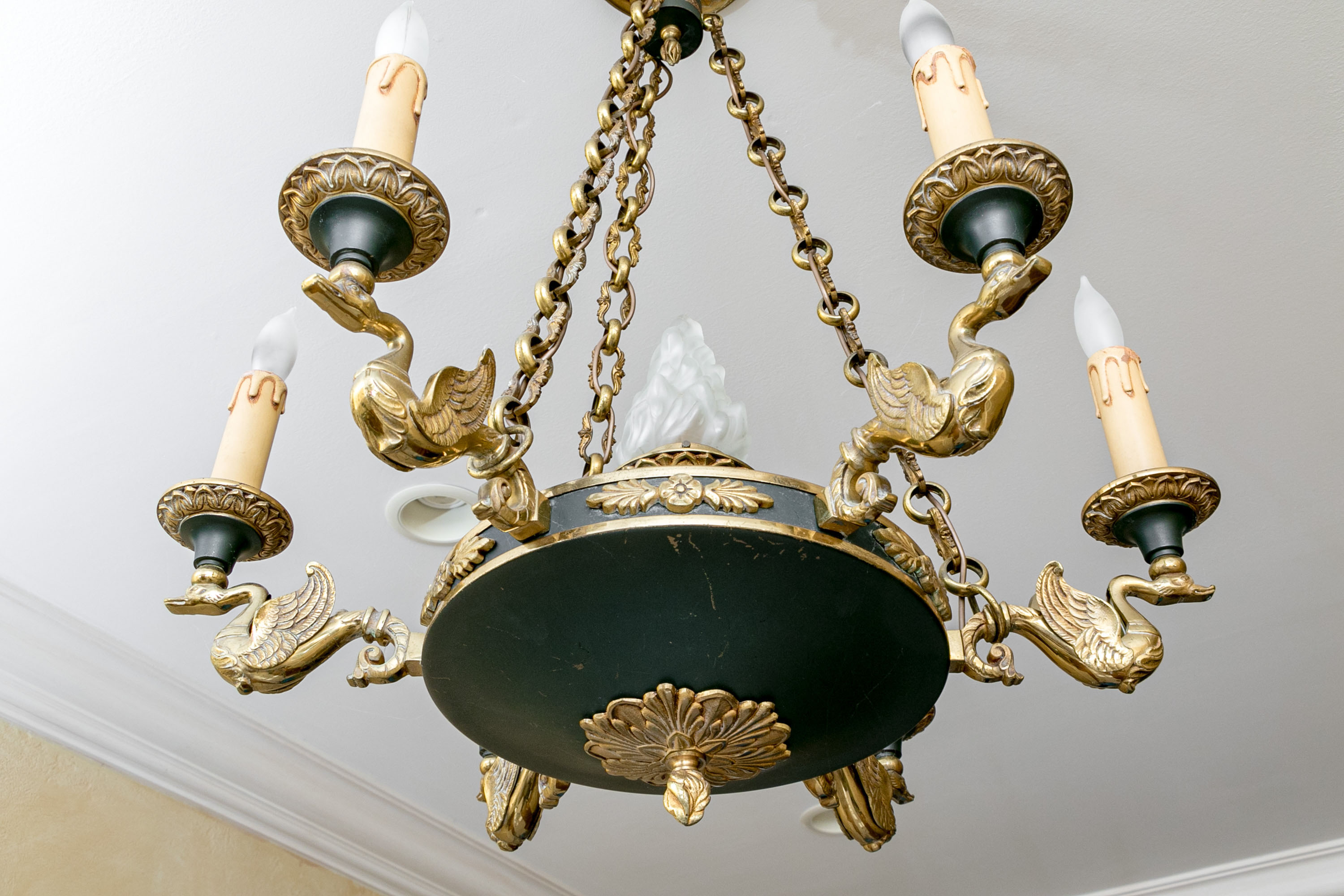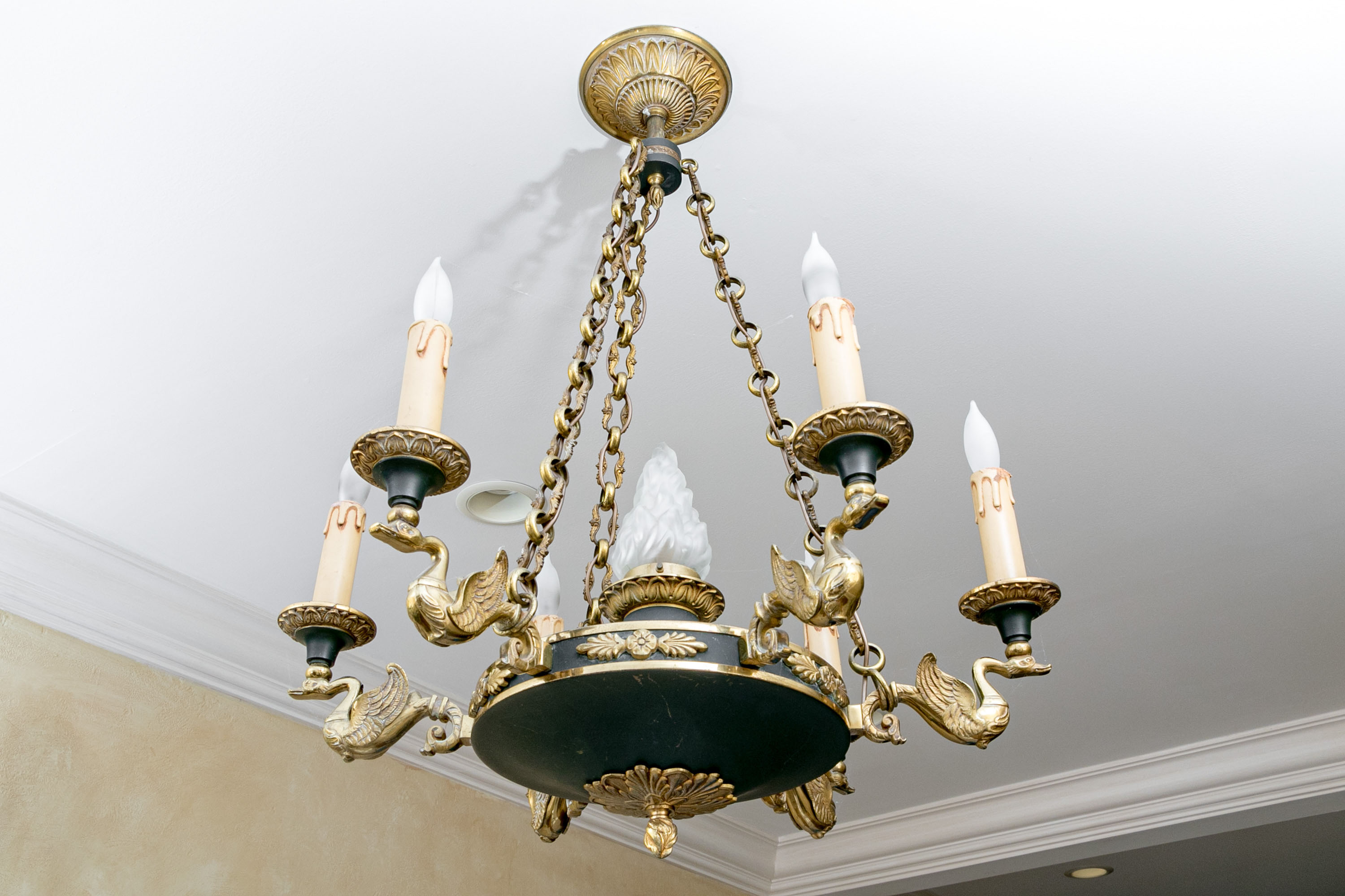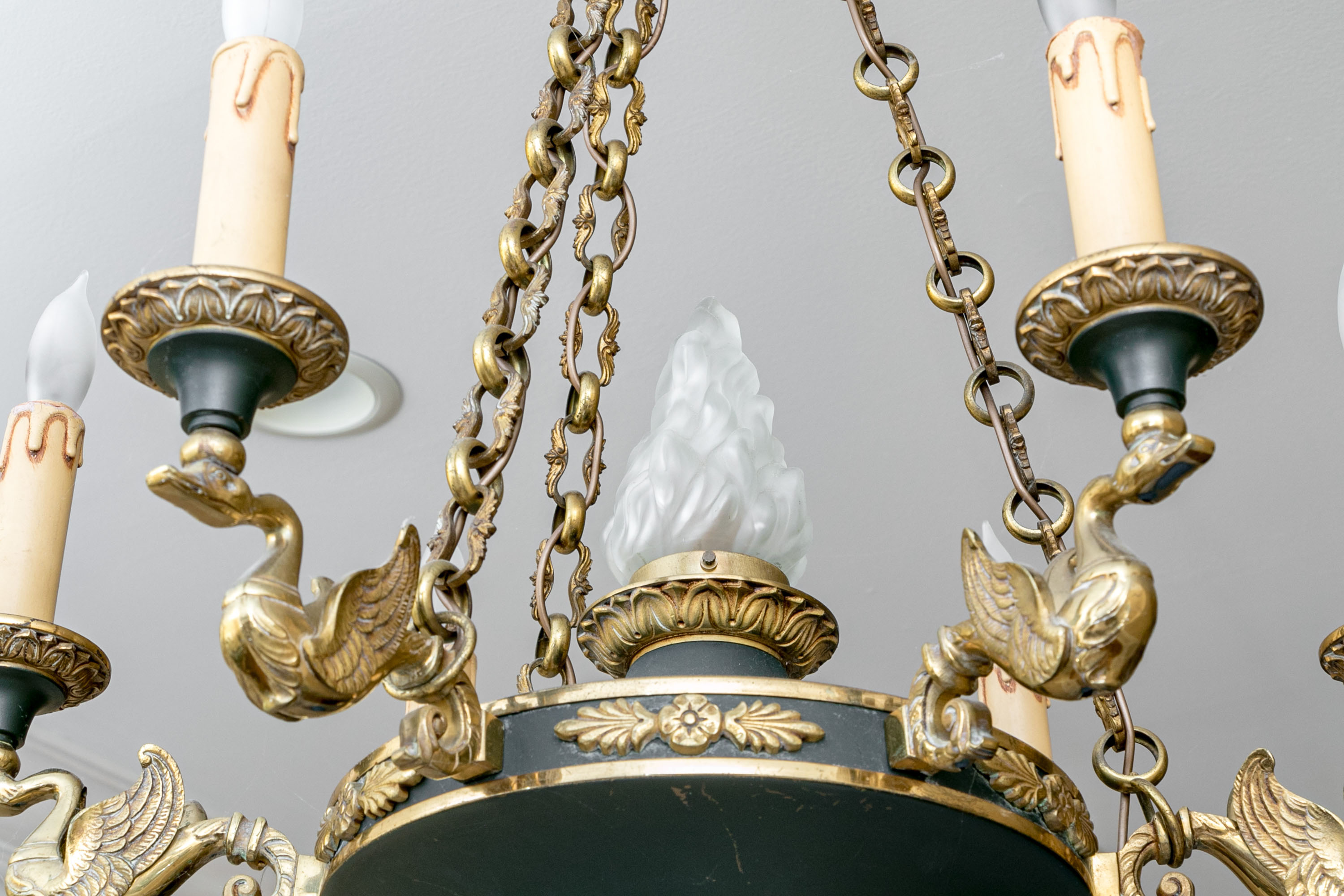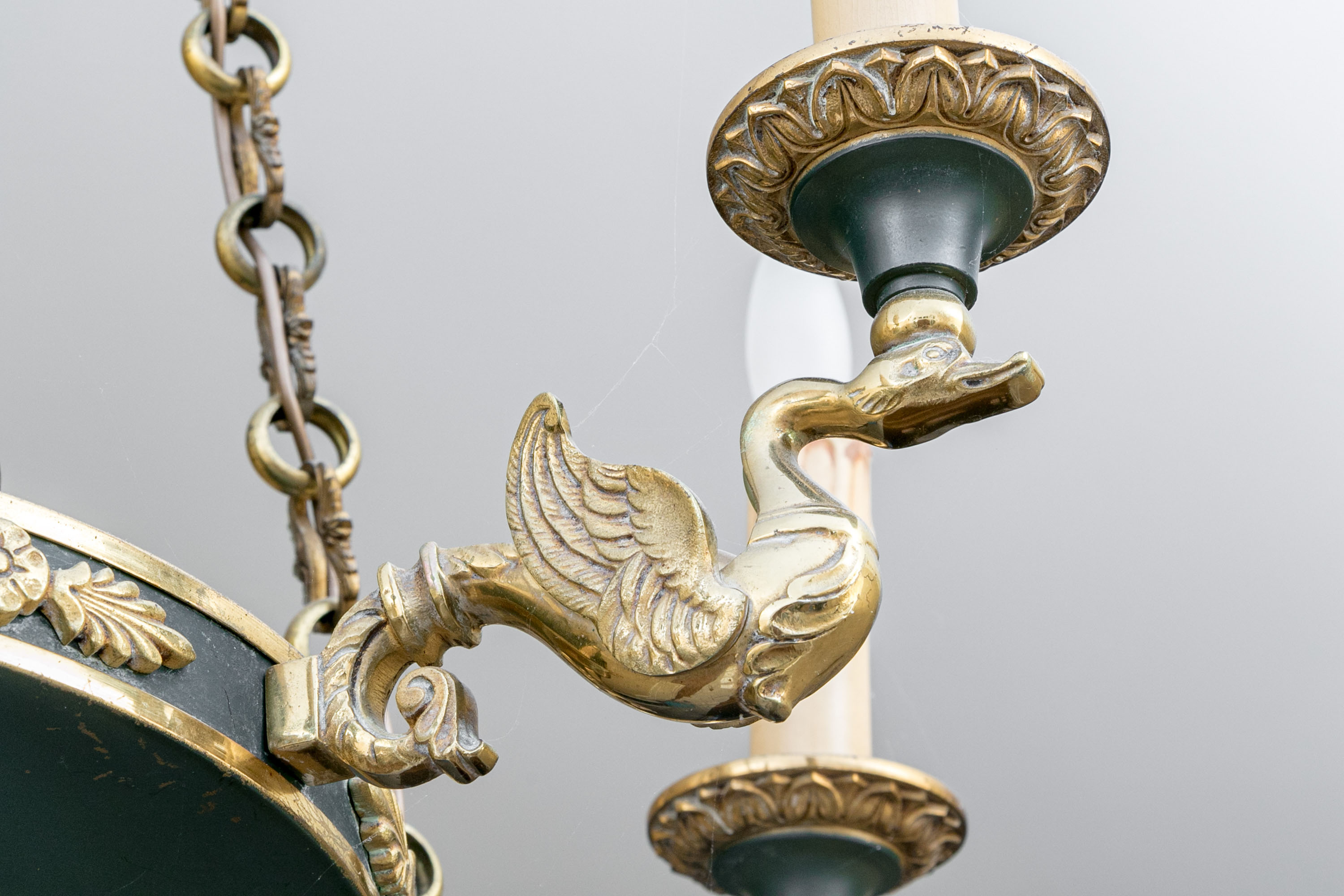 A stunning French Empire style electric chandelier showcasing an elegantly fluted wall mount with three shapely cable chains supporting a black domed disc font with six brass swan form arms and candle sockets.