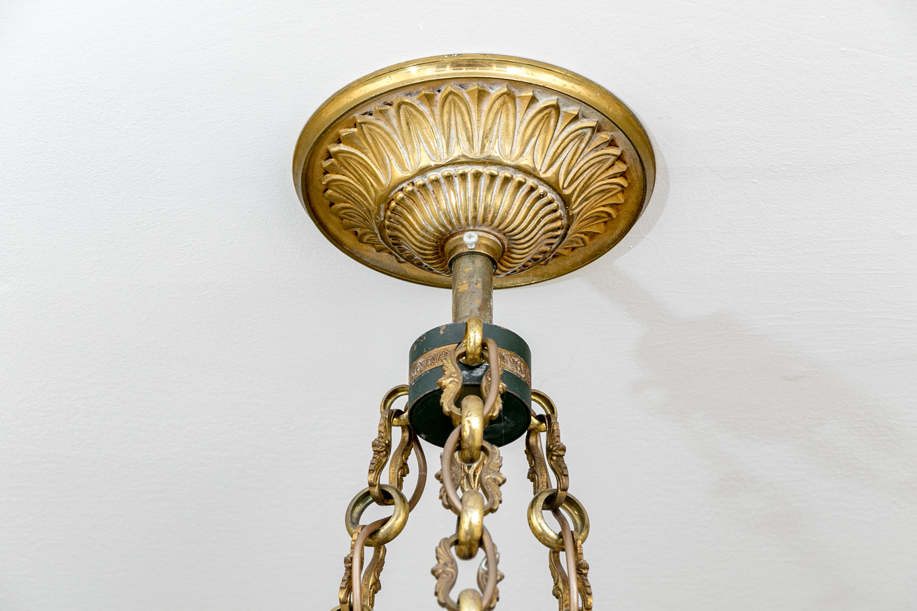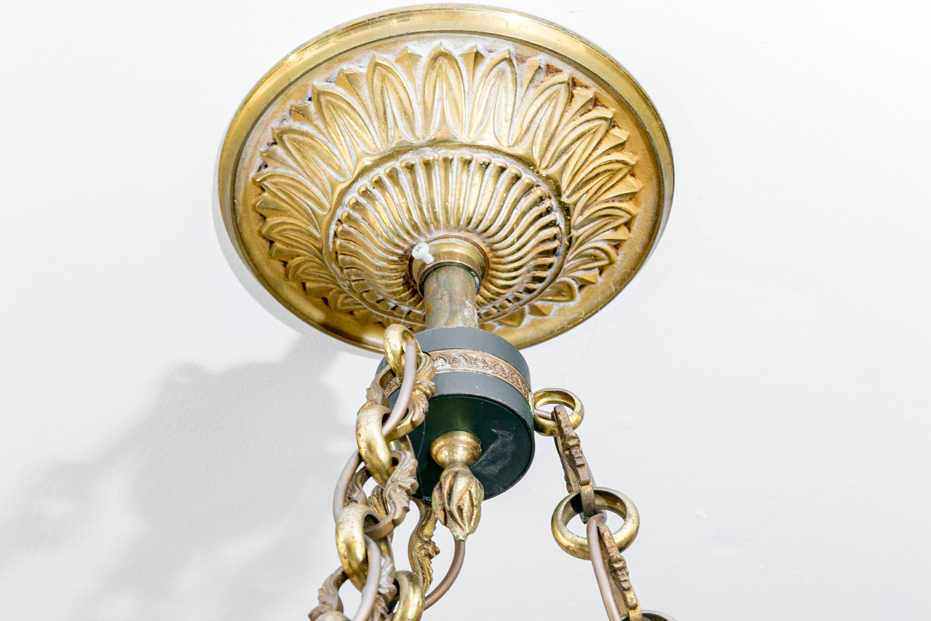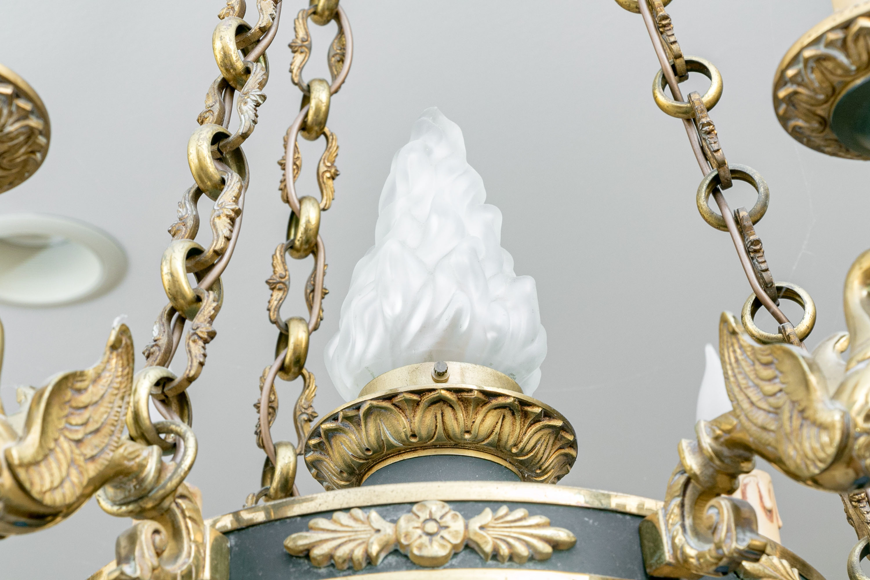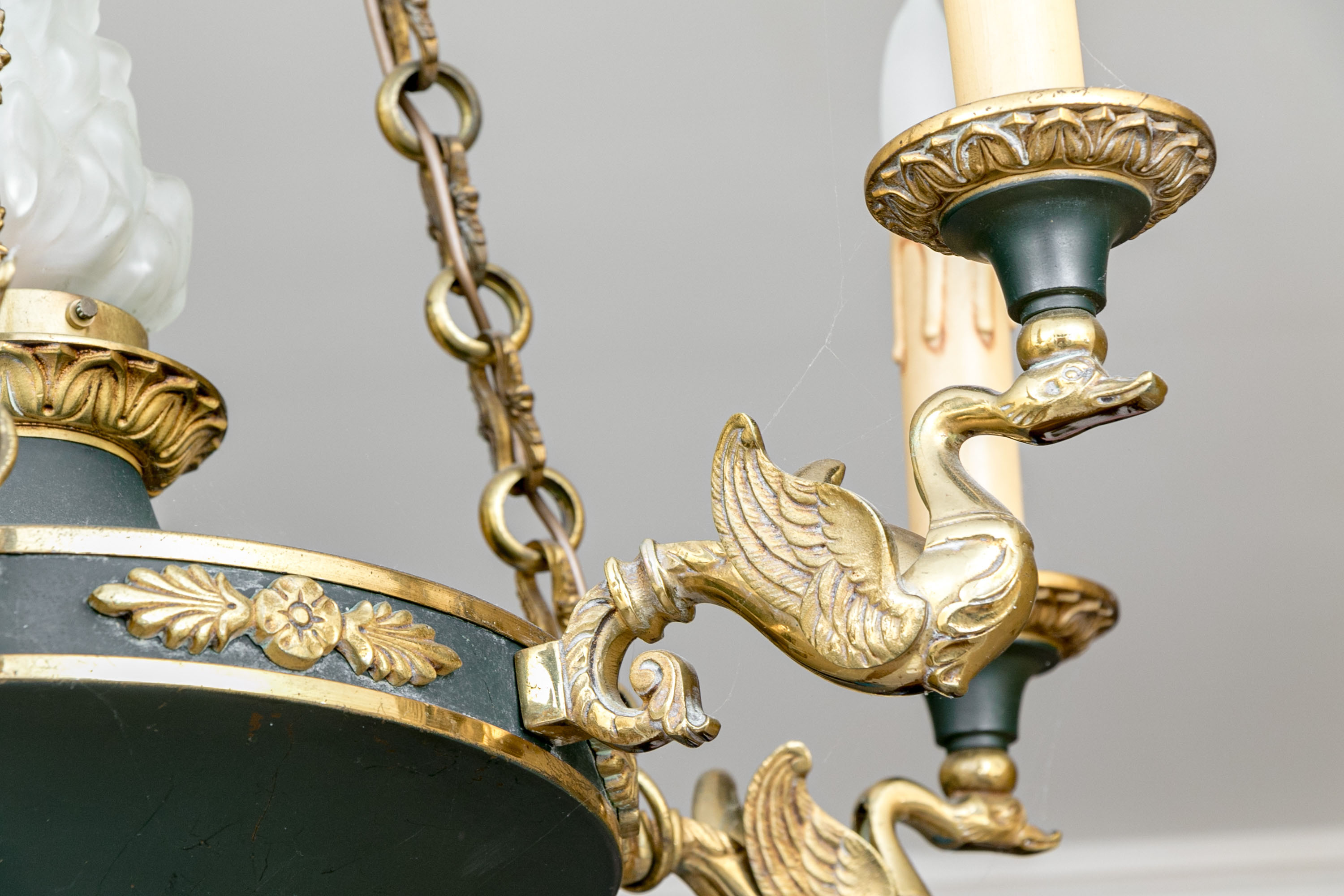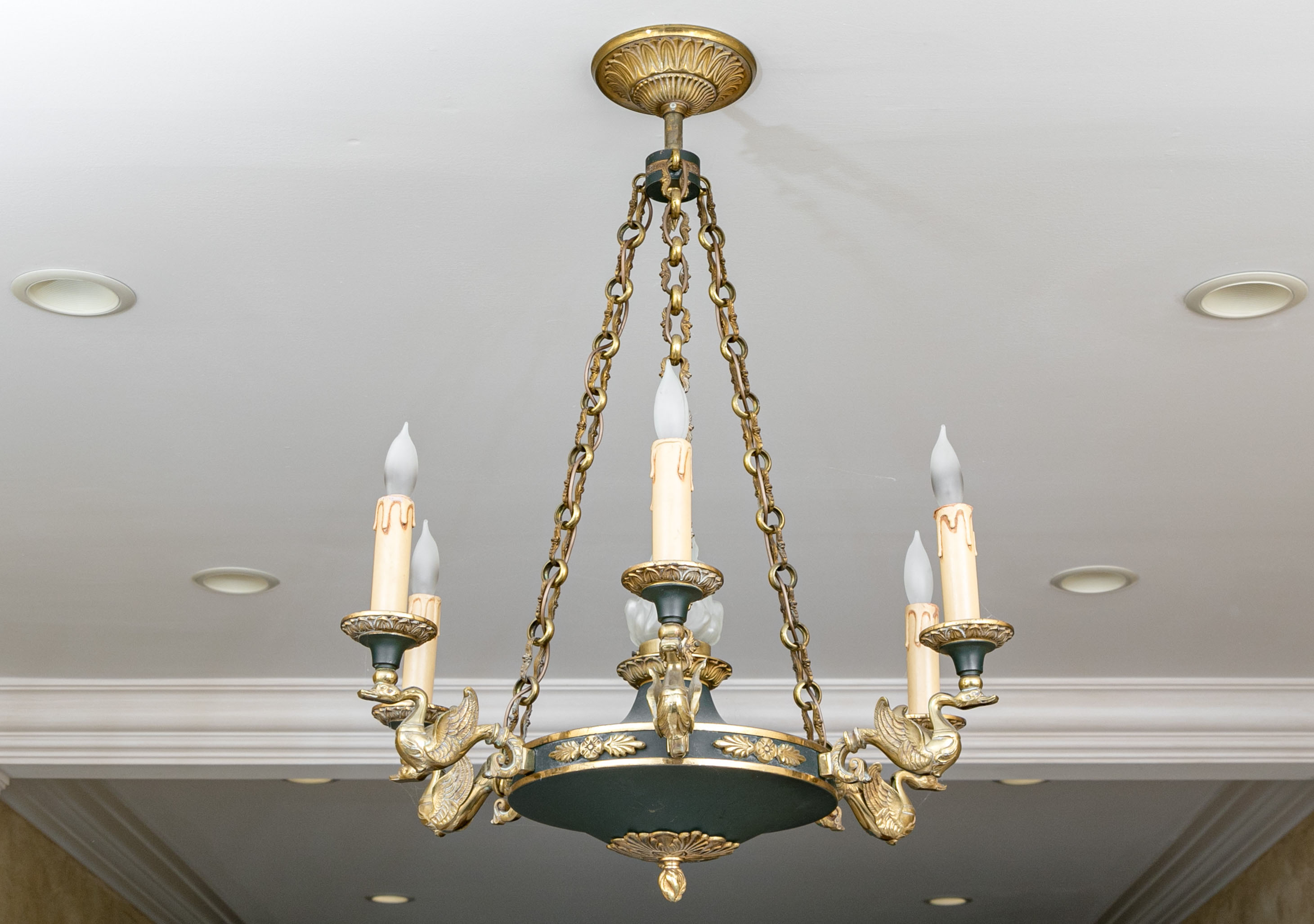 A stunning French Empire style electric chandelier showcasing an elegantly fluted wall mount with three shapely cable chains supporting a black domed disc font with six brass swan form arms and candle sockets.