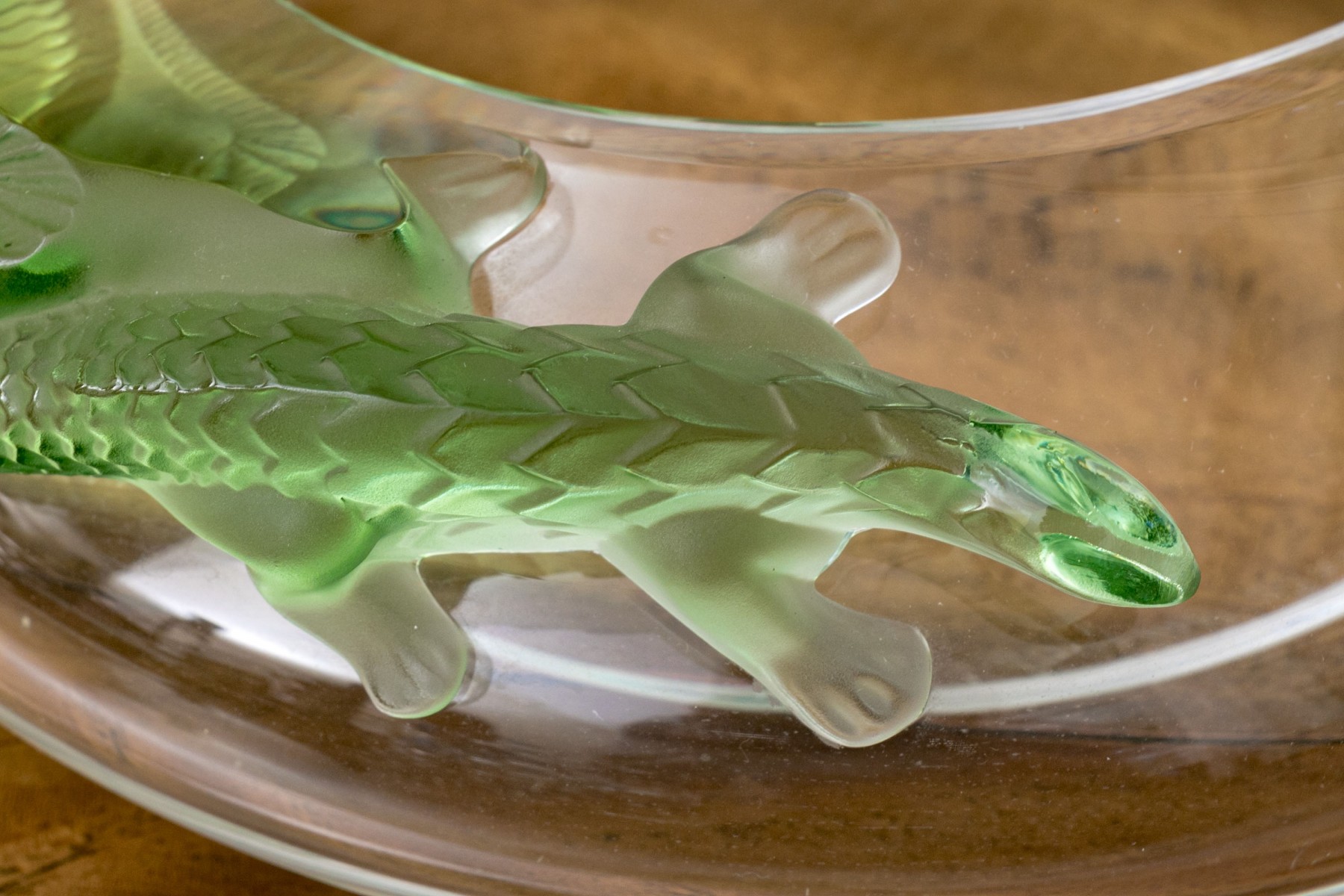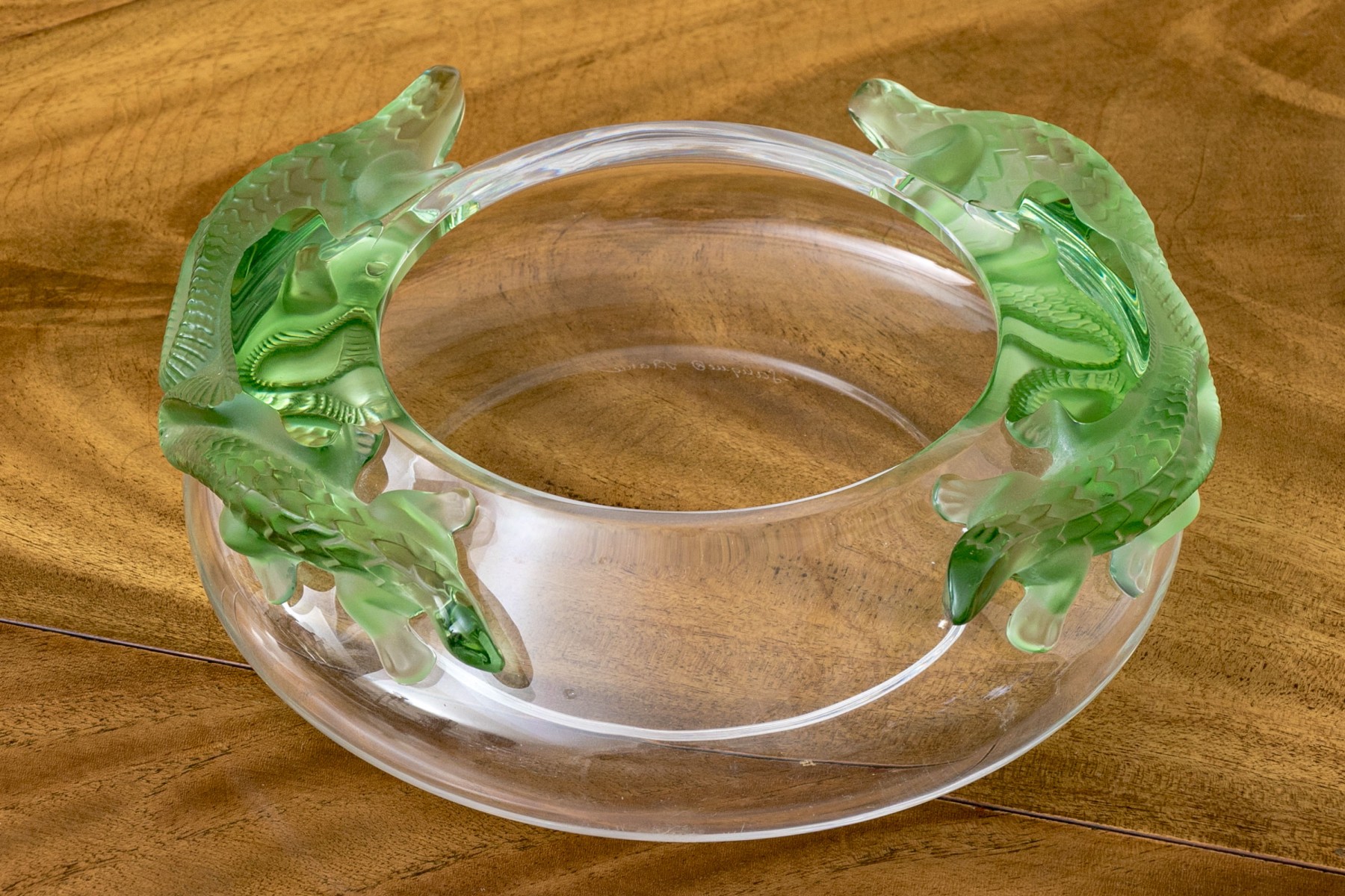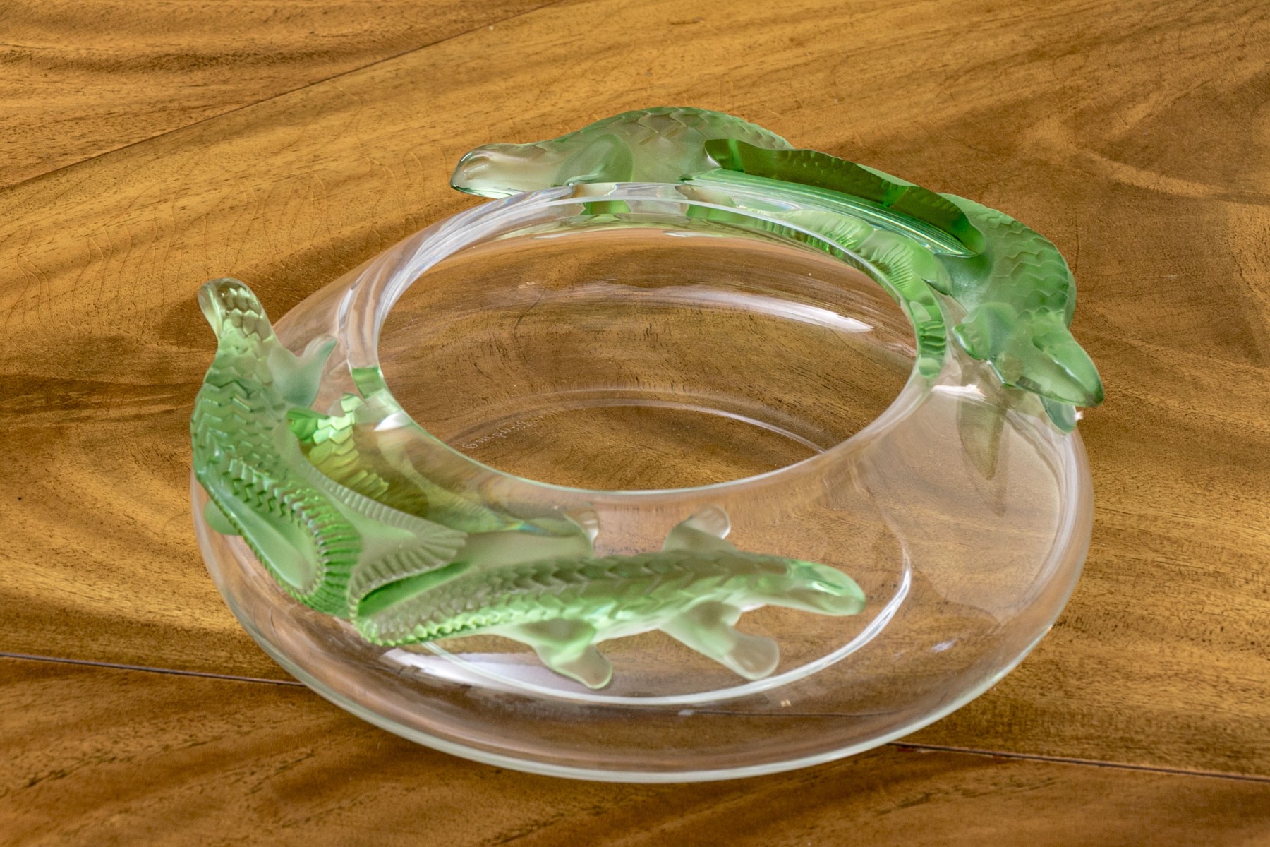 Signed underfoot, 'Lalique / France'. The translucent circular bowl features green tinted lizards to the shoulder just beyond the mouth rim, moulded in relief.