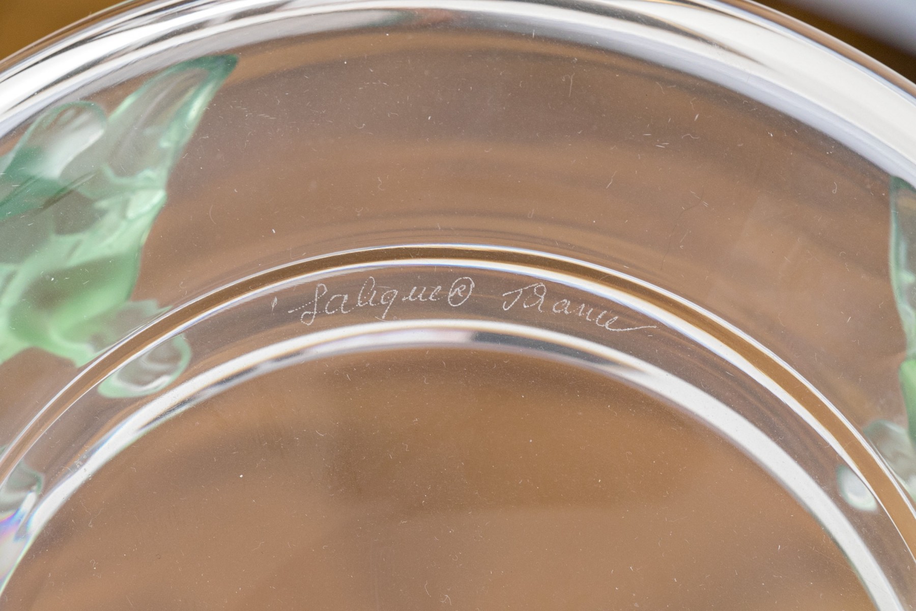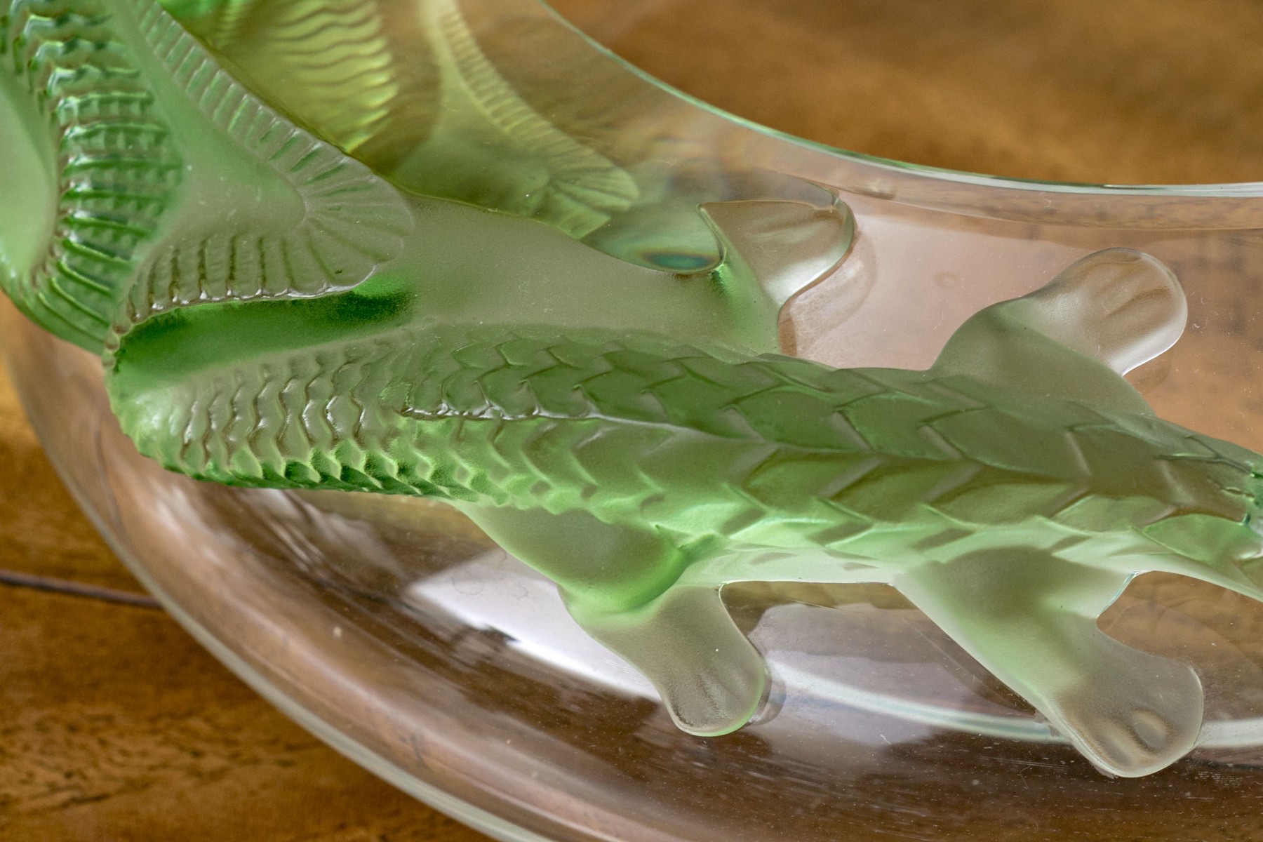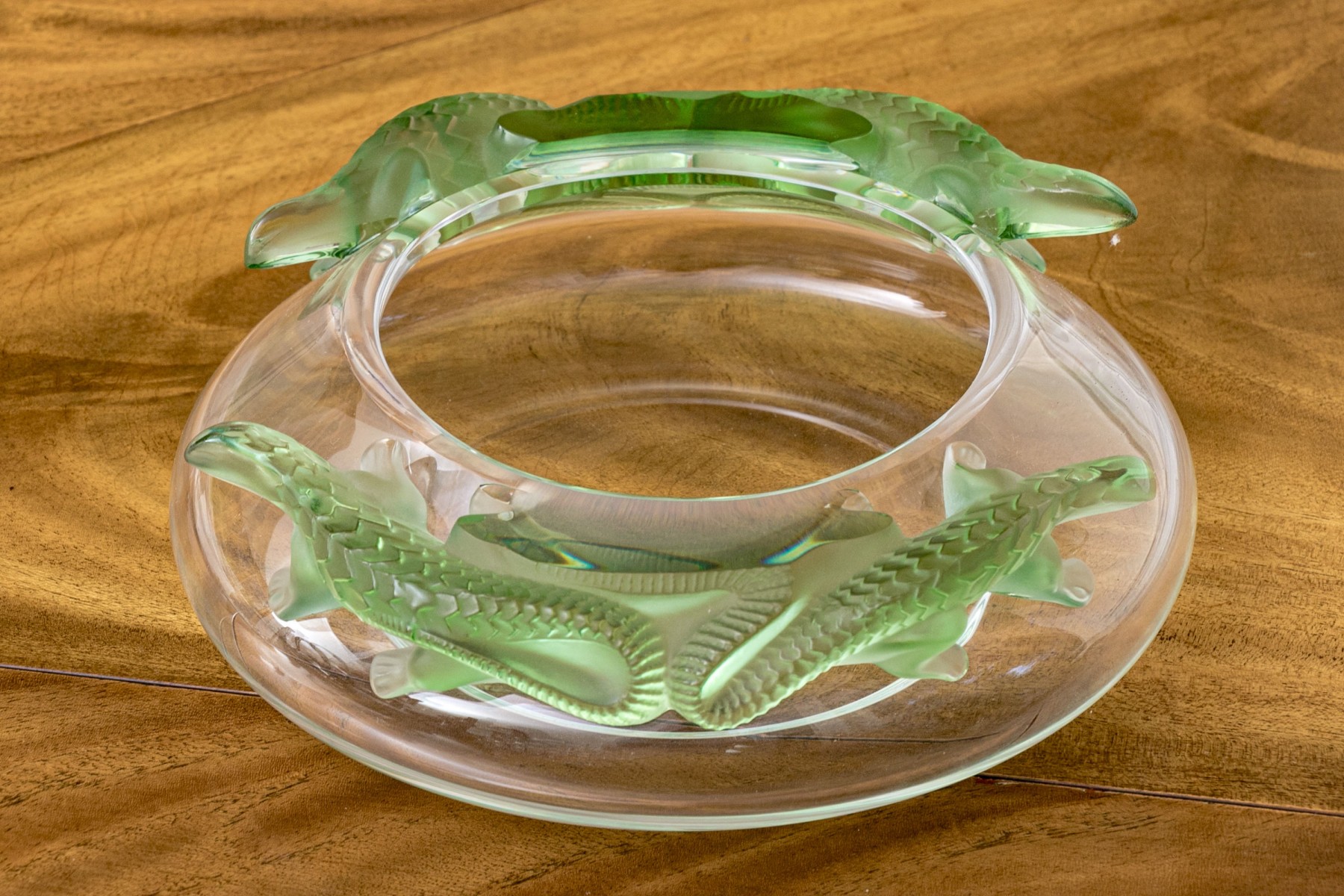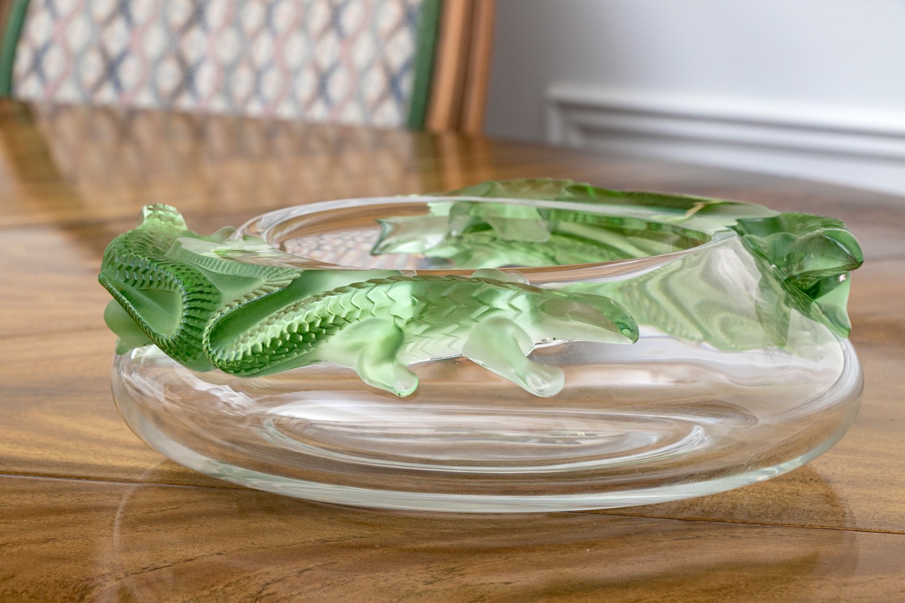 Signed underfoot, 'Lalique / France'. The translucent circular bowl features green tinted lizards to the shoulder just beyond the mouth rim, moulded in relief.