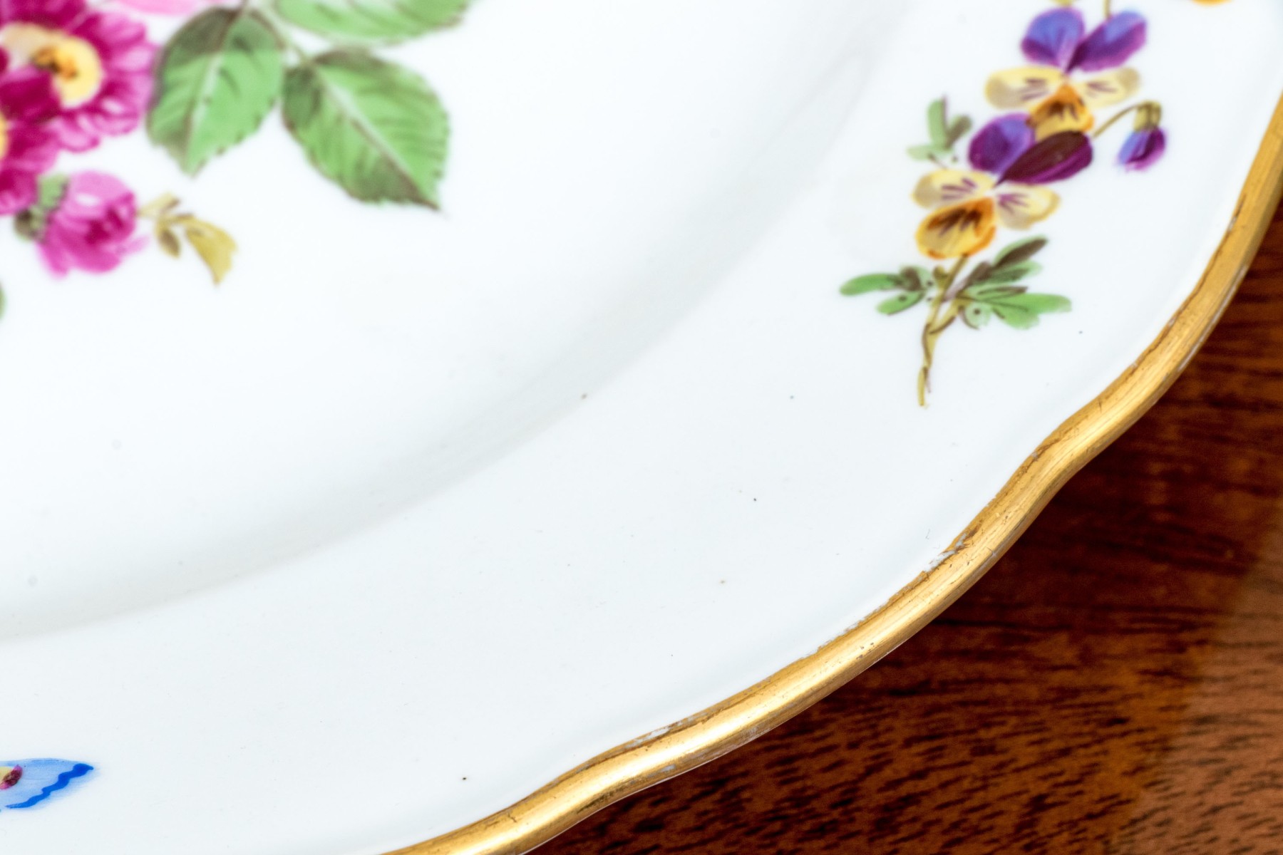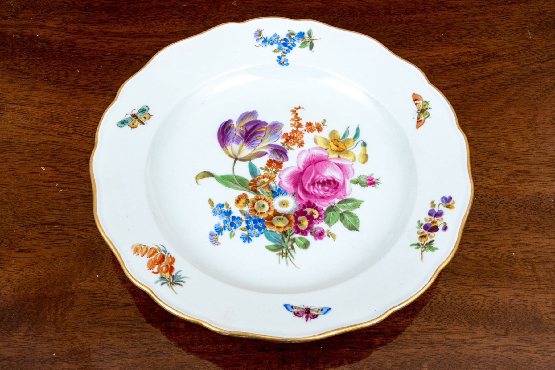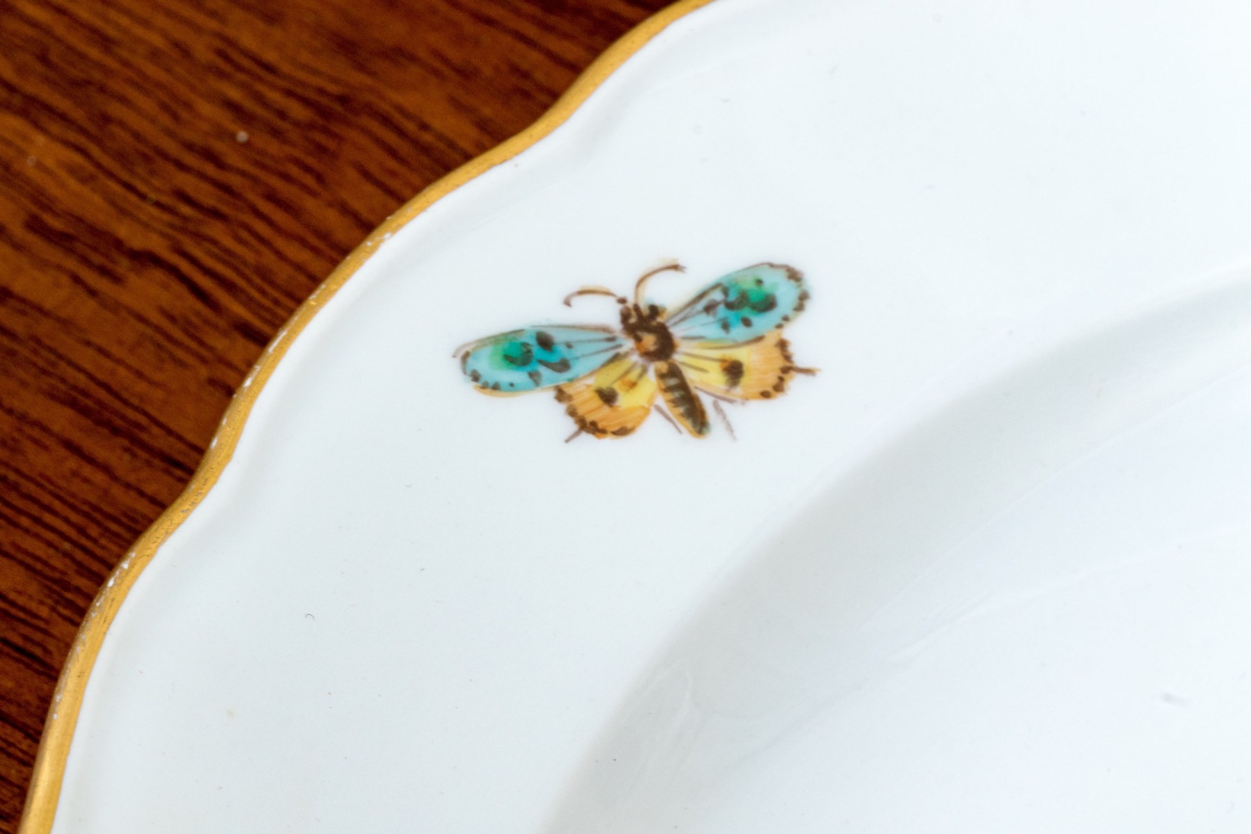 A gorgeous Meissen porcelain plate sporting a gilt scalloped rim and a hand-painted design of moths and floral sprays around a colorful bouquet center.