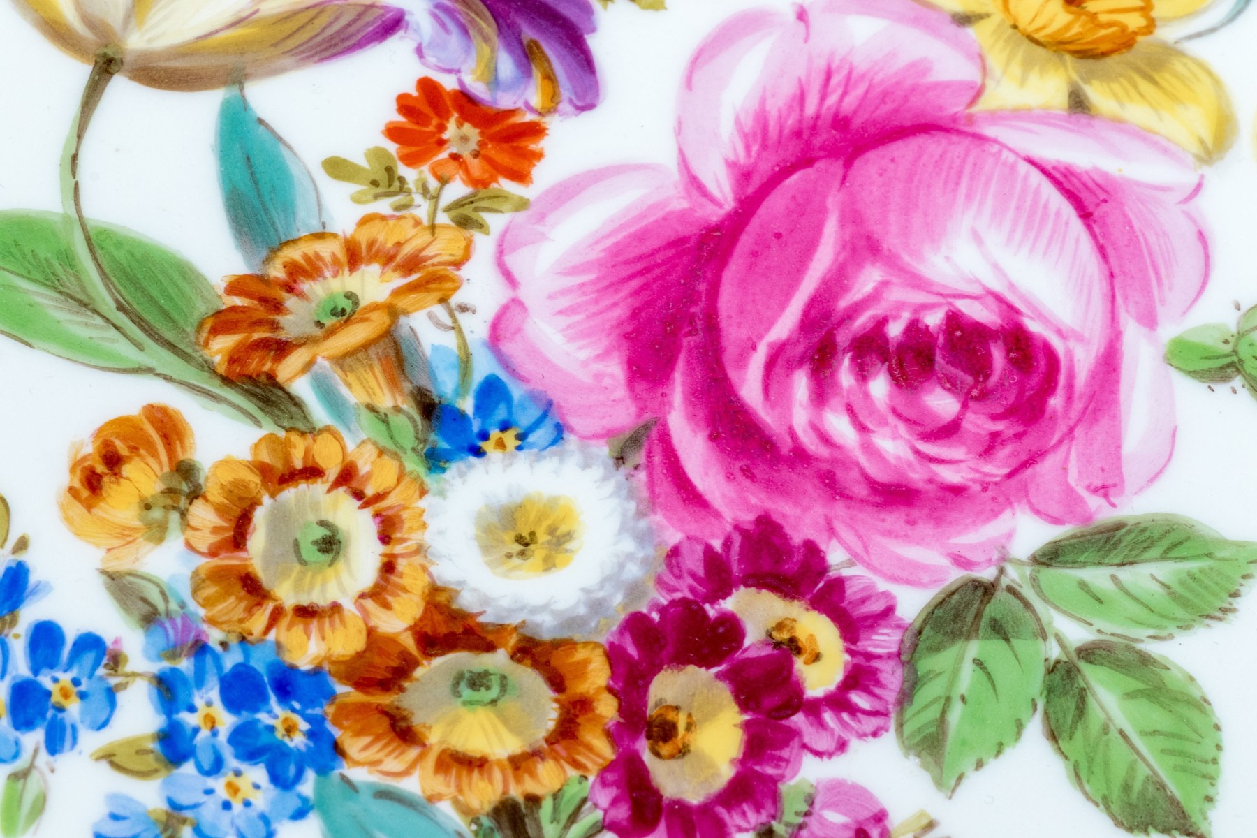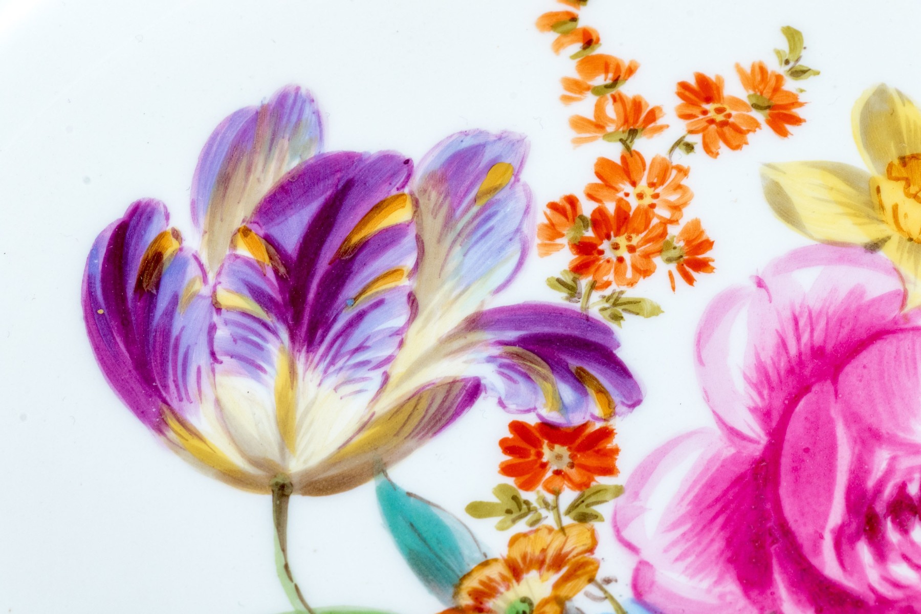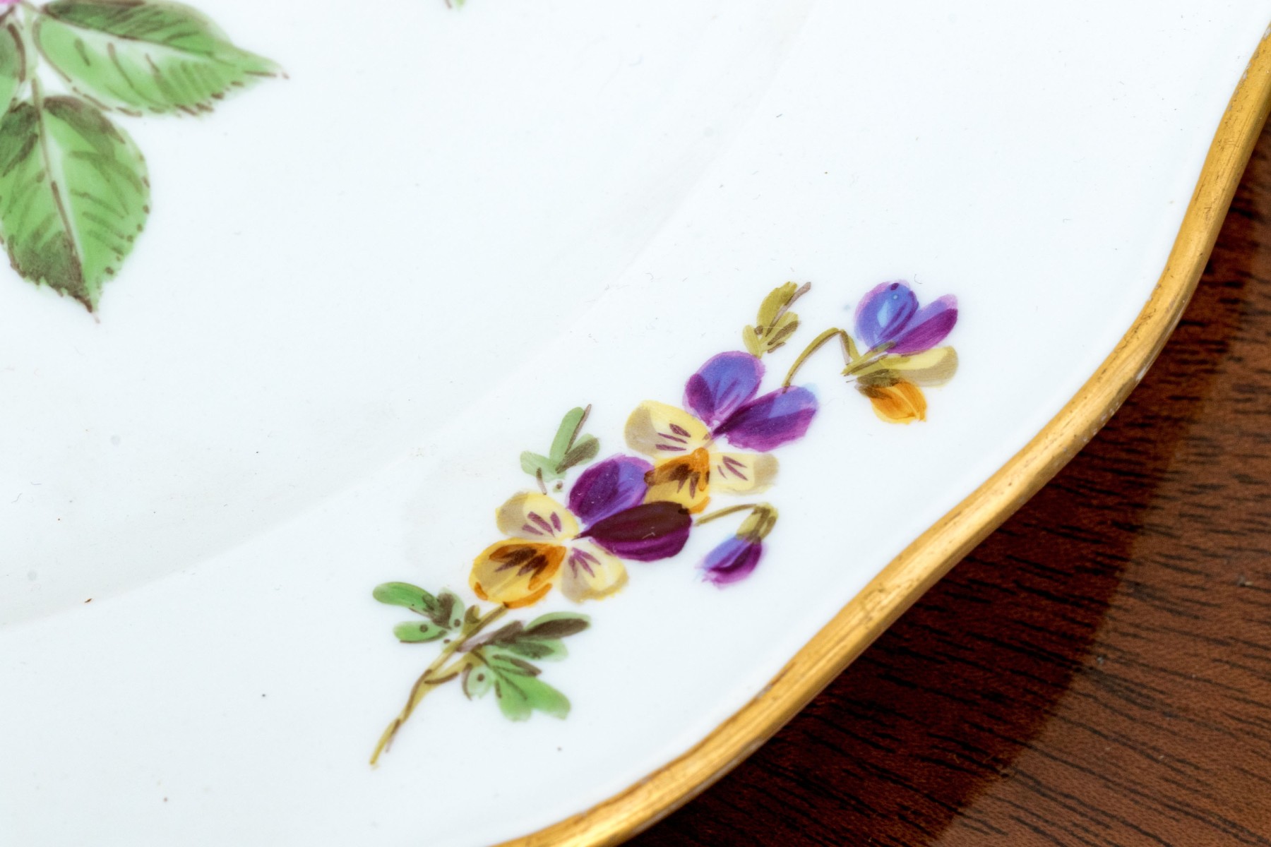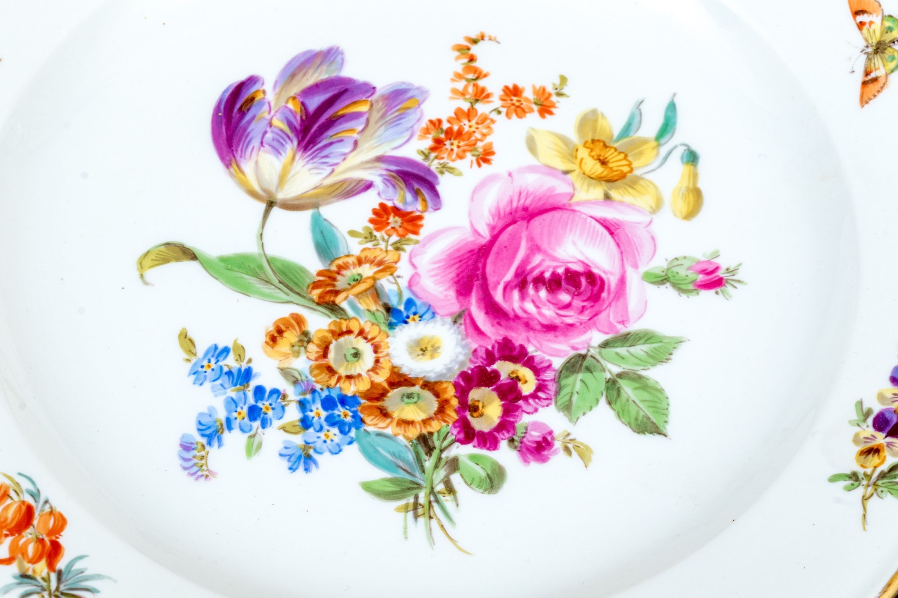 A gorgeous Meissen porcelain plate sporting a gilt scalloped rim and a hand-painted design of moths and floral sprays around a colorful bouquet center.