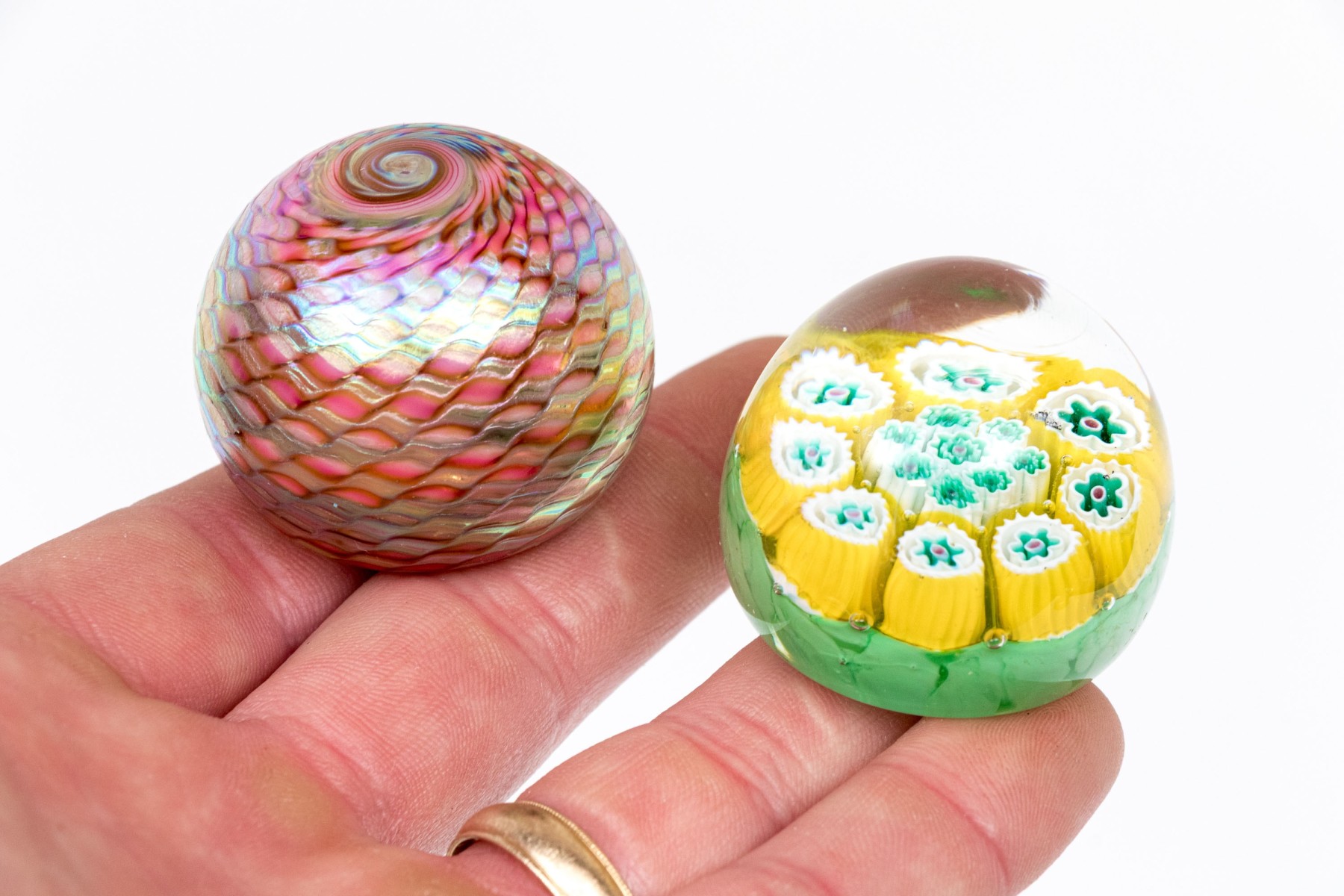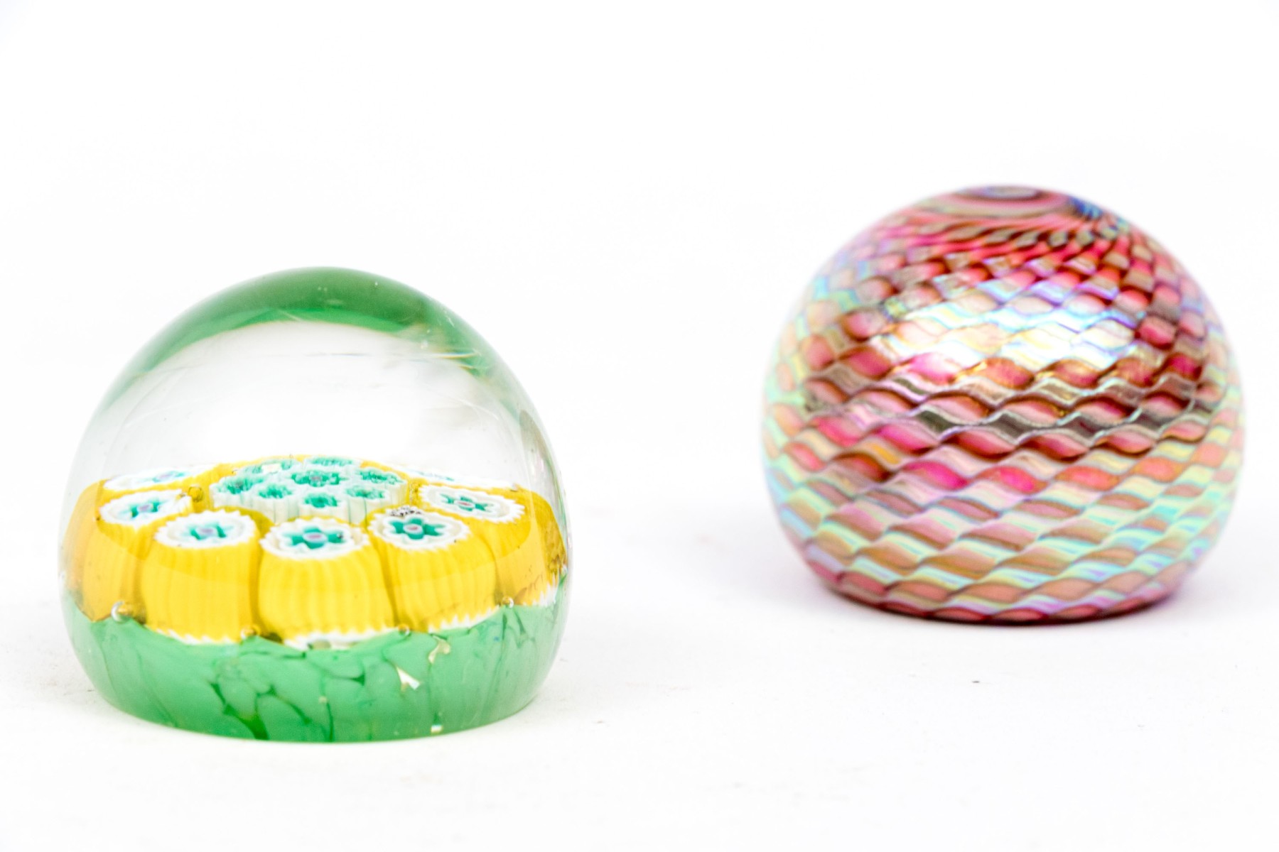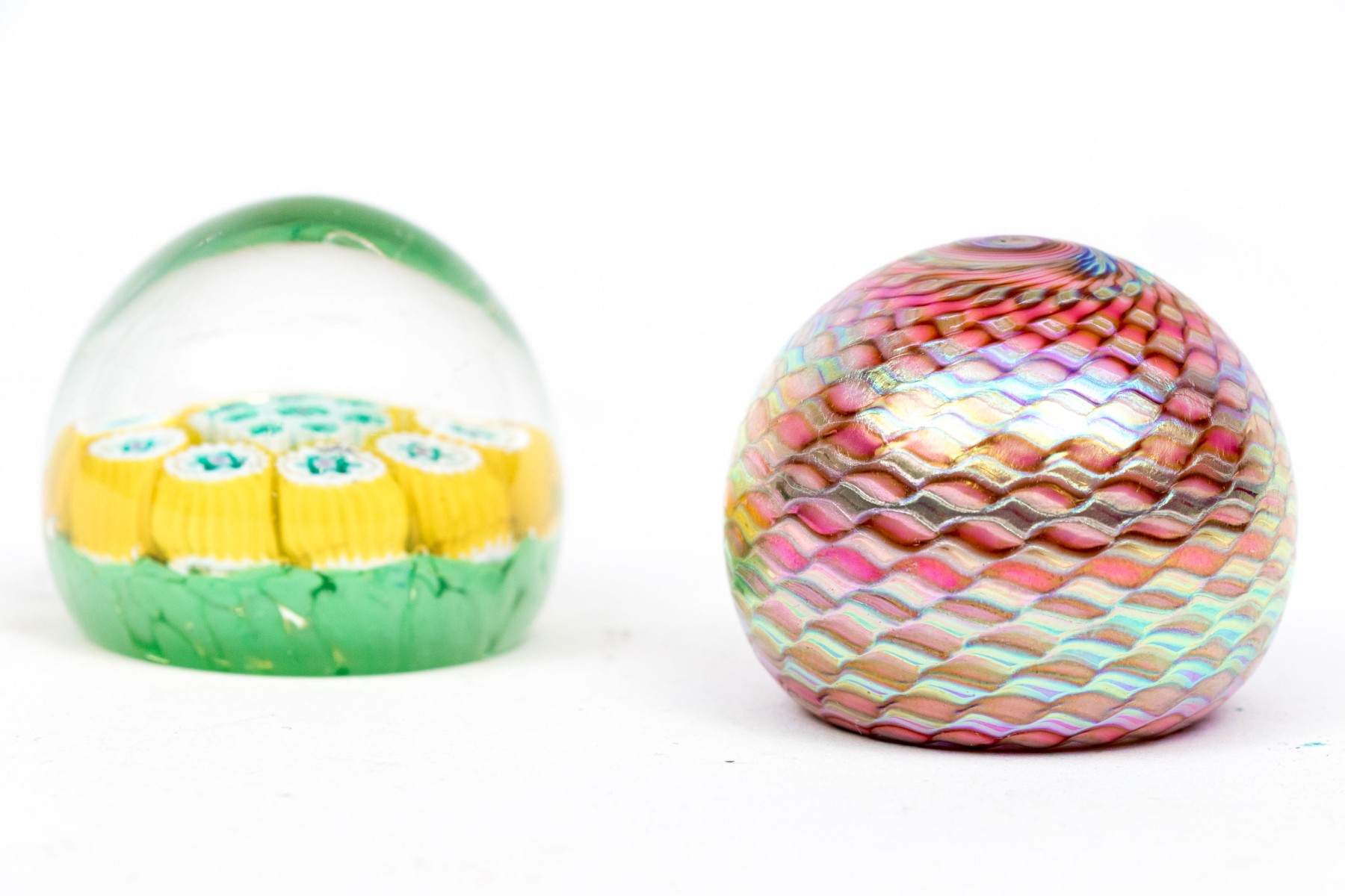 Each is wonderfully formed and decorated. One with a millefleur style cased polychromatic decorative motif and the second with a vibrant, swirled pattern and signed indistinctly underneath.