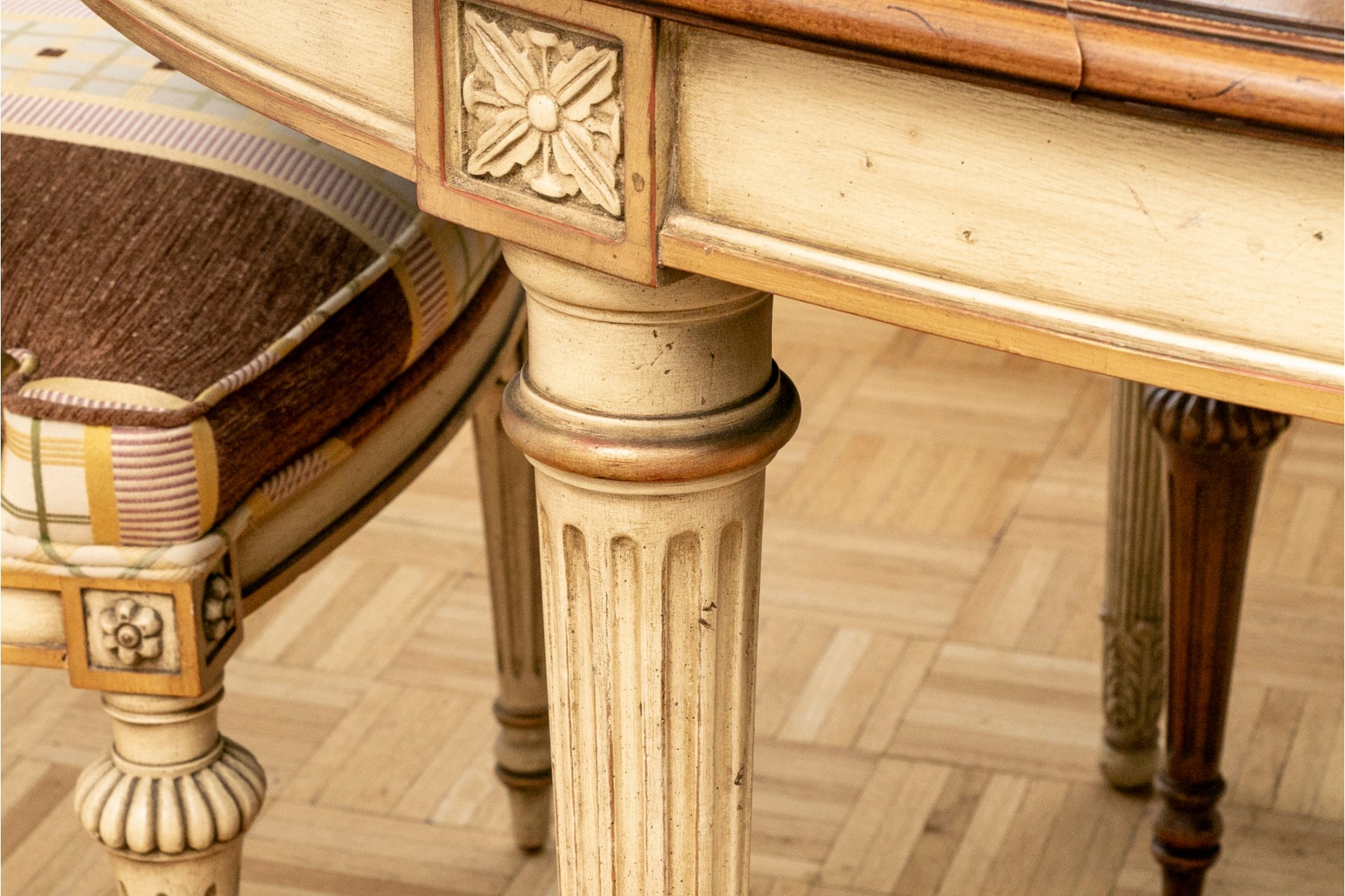 The dining table, with its beautifully carved details and graceful lines, serves as the focal point of sophistication. Accompanied by six exquisite chairs, this set creates an atmosphere of opulence and charm in any formal dining setting.