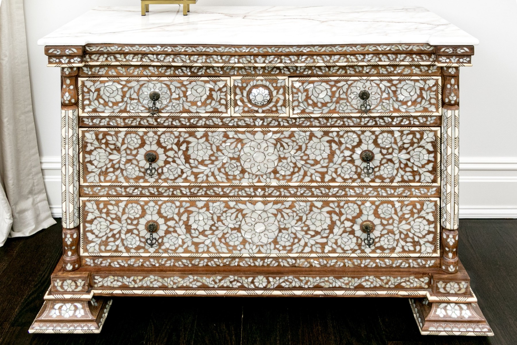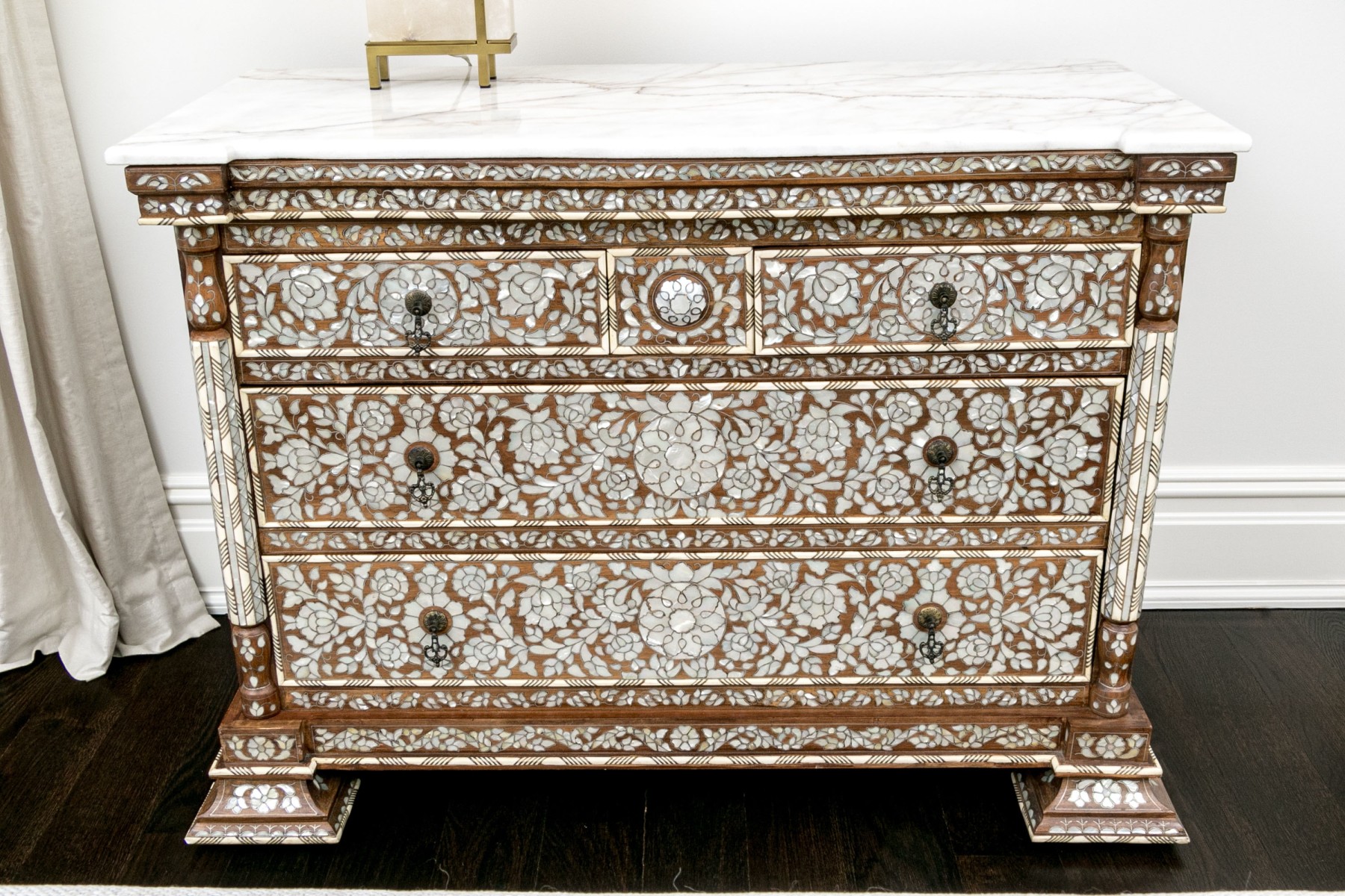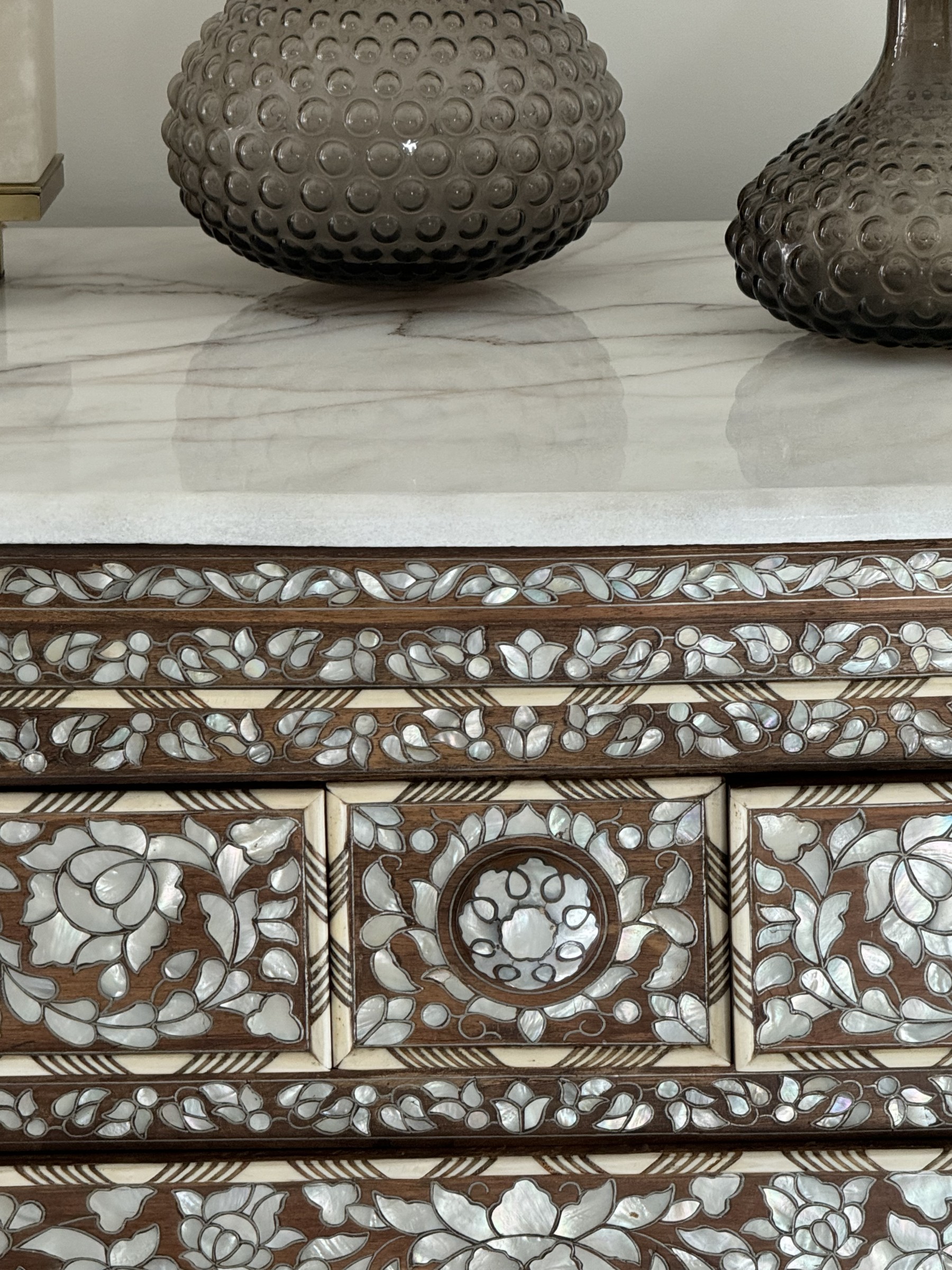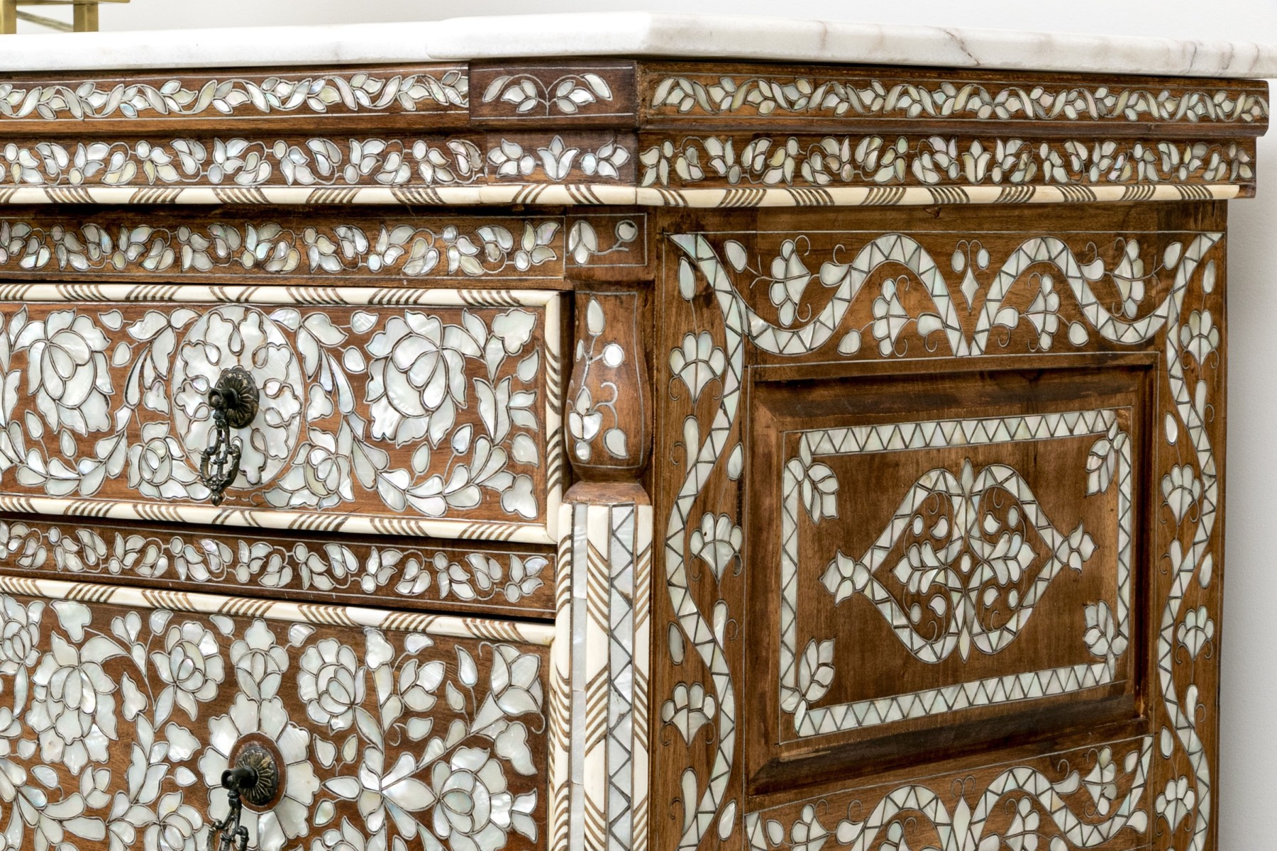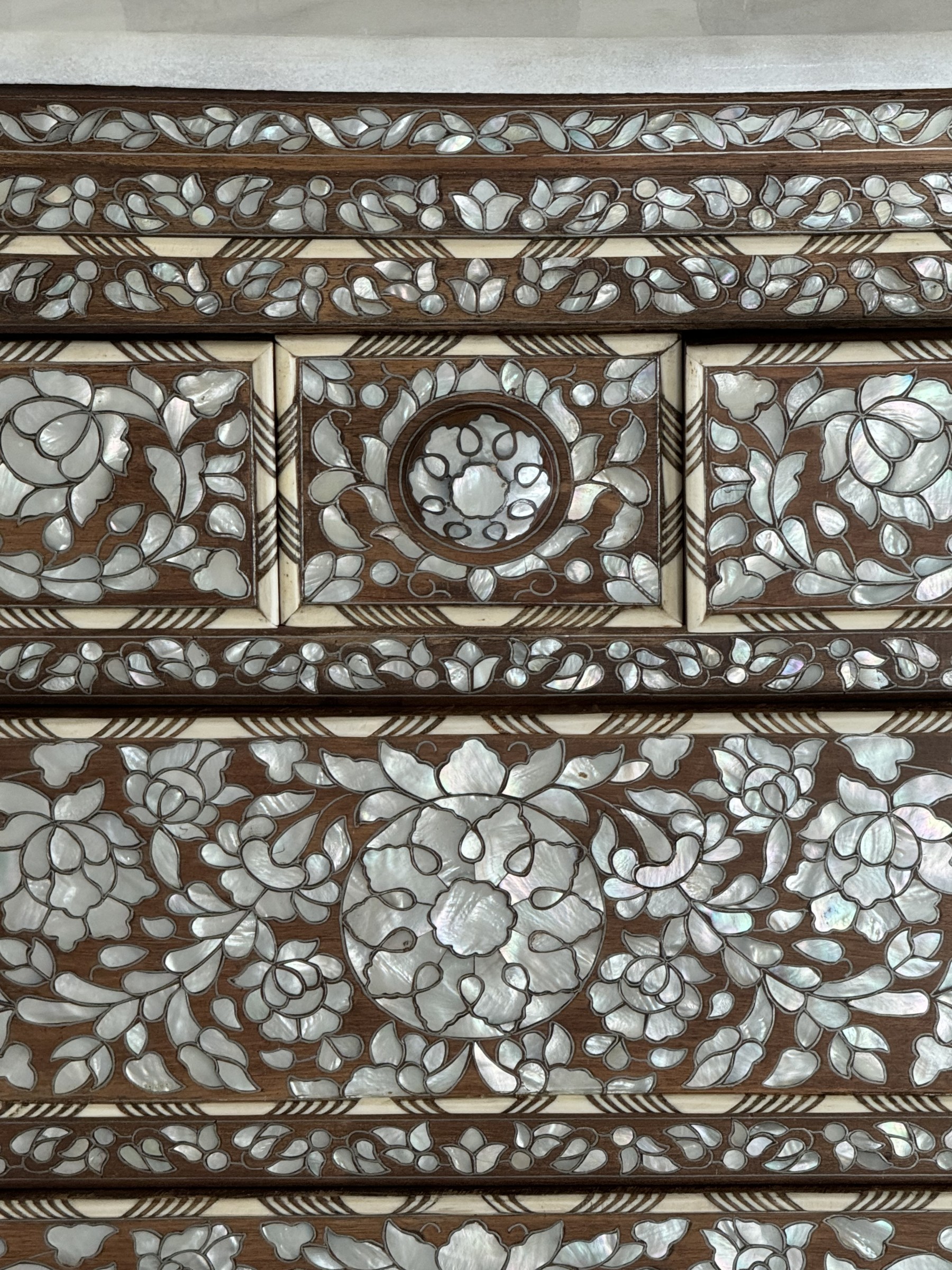 This very special chest is solid wood with a mother of pearl botanical inlay patterning overlay. The top is a beautiful white marble with a subtle brown veining that compliments the wood tones. The drawers have antique style metal pulls. Sophisticated artistry and craftsmanship goes into the detailed botanic pattern on the drawers, top and sides of this delightful chest. Condition in appearance looks almost new - two drawers do not close flush flat and need slight oil adjustment or use as is. The chest comes from a pristine home where it has been excellently maintained - and used decoratively with very lite use. Size 49 L x 23 D x 34.5 H