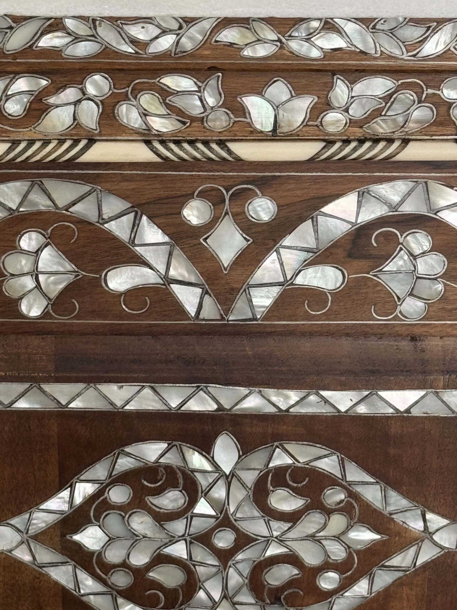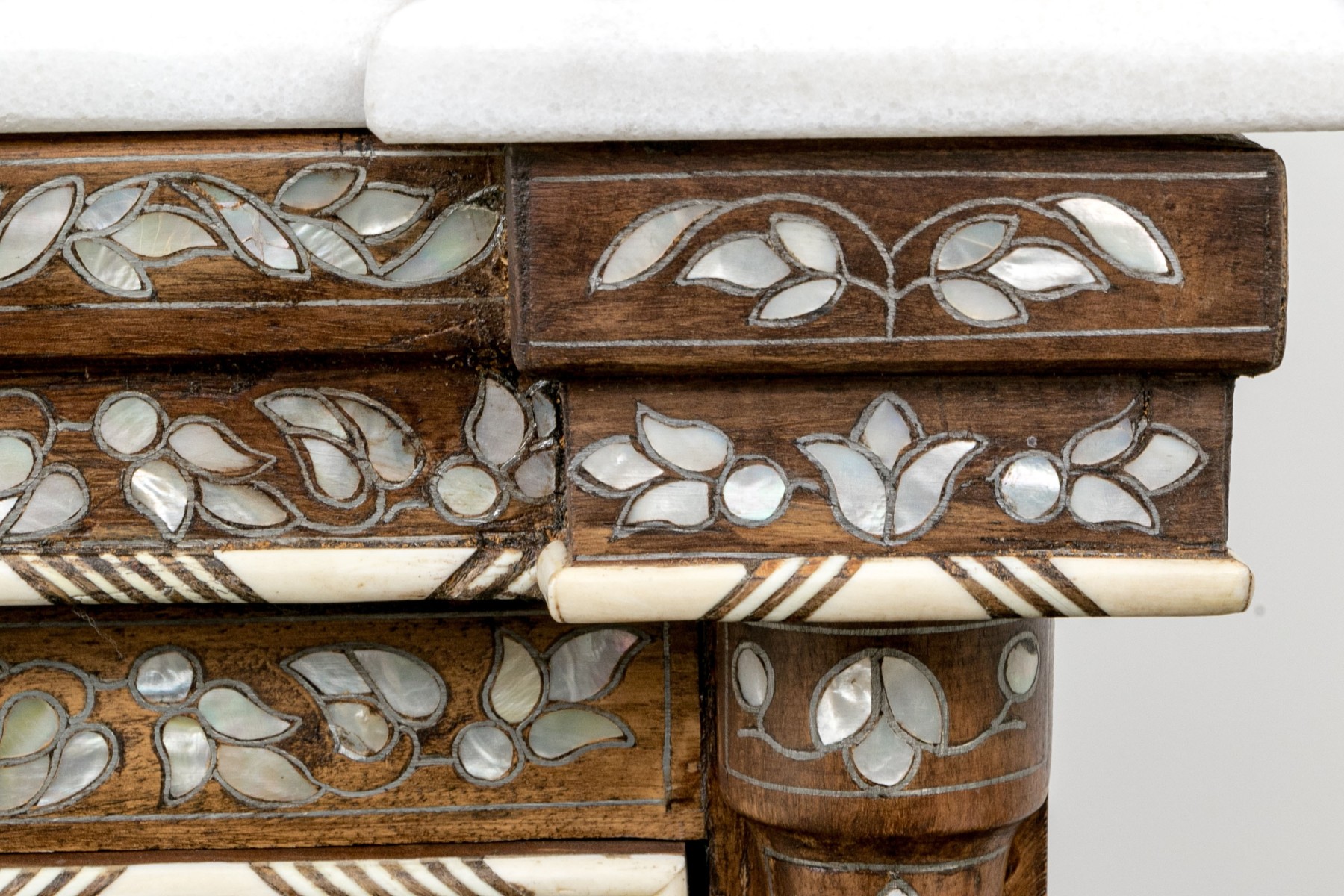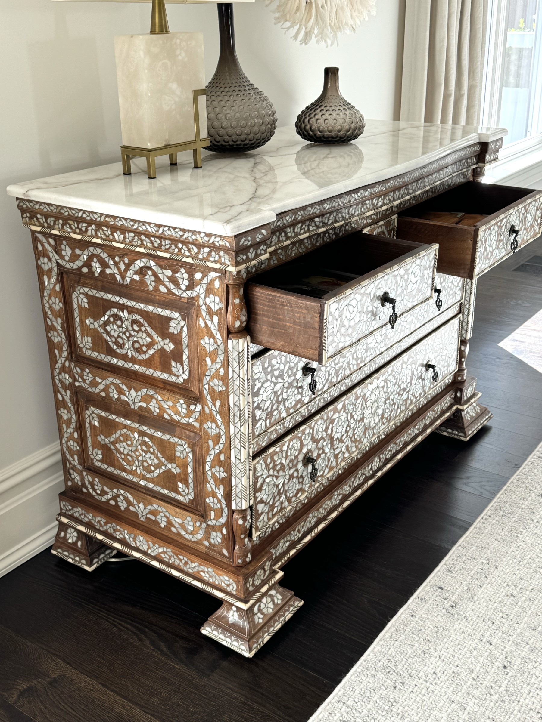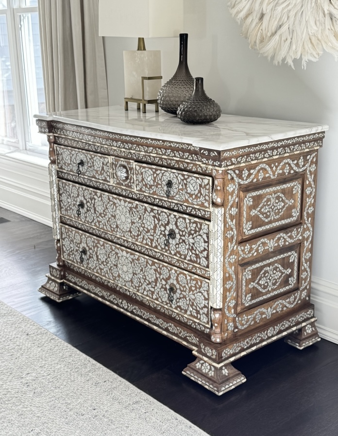 This very special chest is solid wood with a mother of pearl botanical inlay patterning overlay. The top is a beautiful white marble with a subtle brown veining that compliments the wood tones. The drawers have antique style metal pulls. Sophisticated artistry and craftsmanship goes into the detailed botanic pattern on the drawers, top and sides of this delightful chest. Condition in appearance looks almost new - two drawers do not close flush flat and need slight oil adjustment or use as is. The chest comes from a pristine home where it has been excellently maintained - and used decoratively with very lite use. Size 49 L x 23 D x 34.5 H