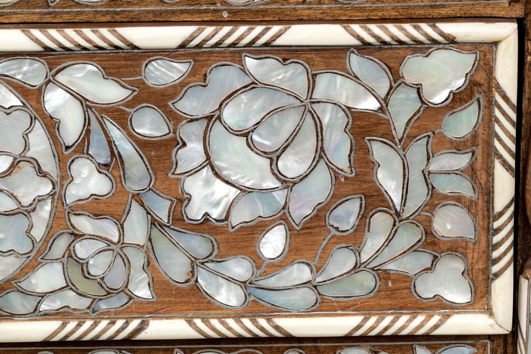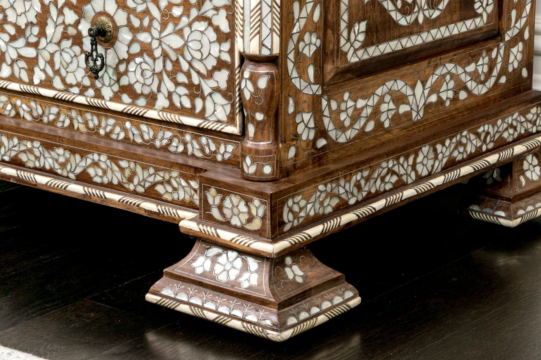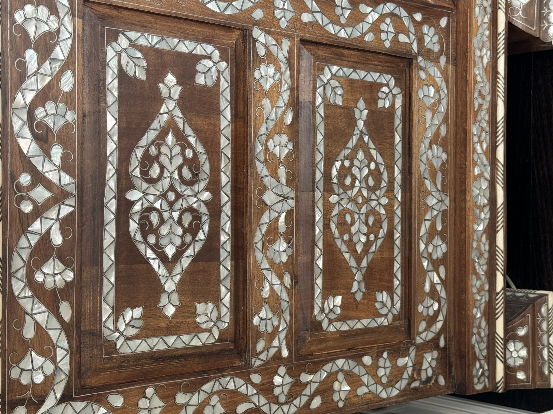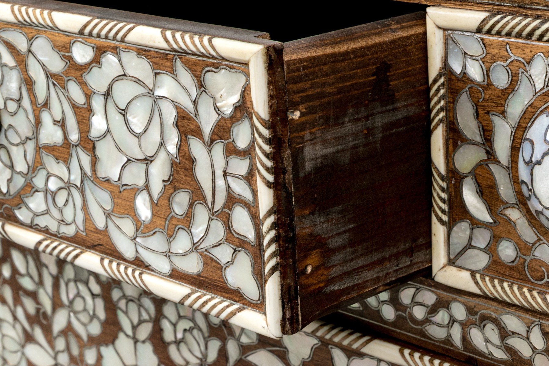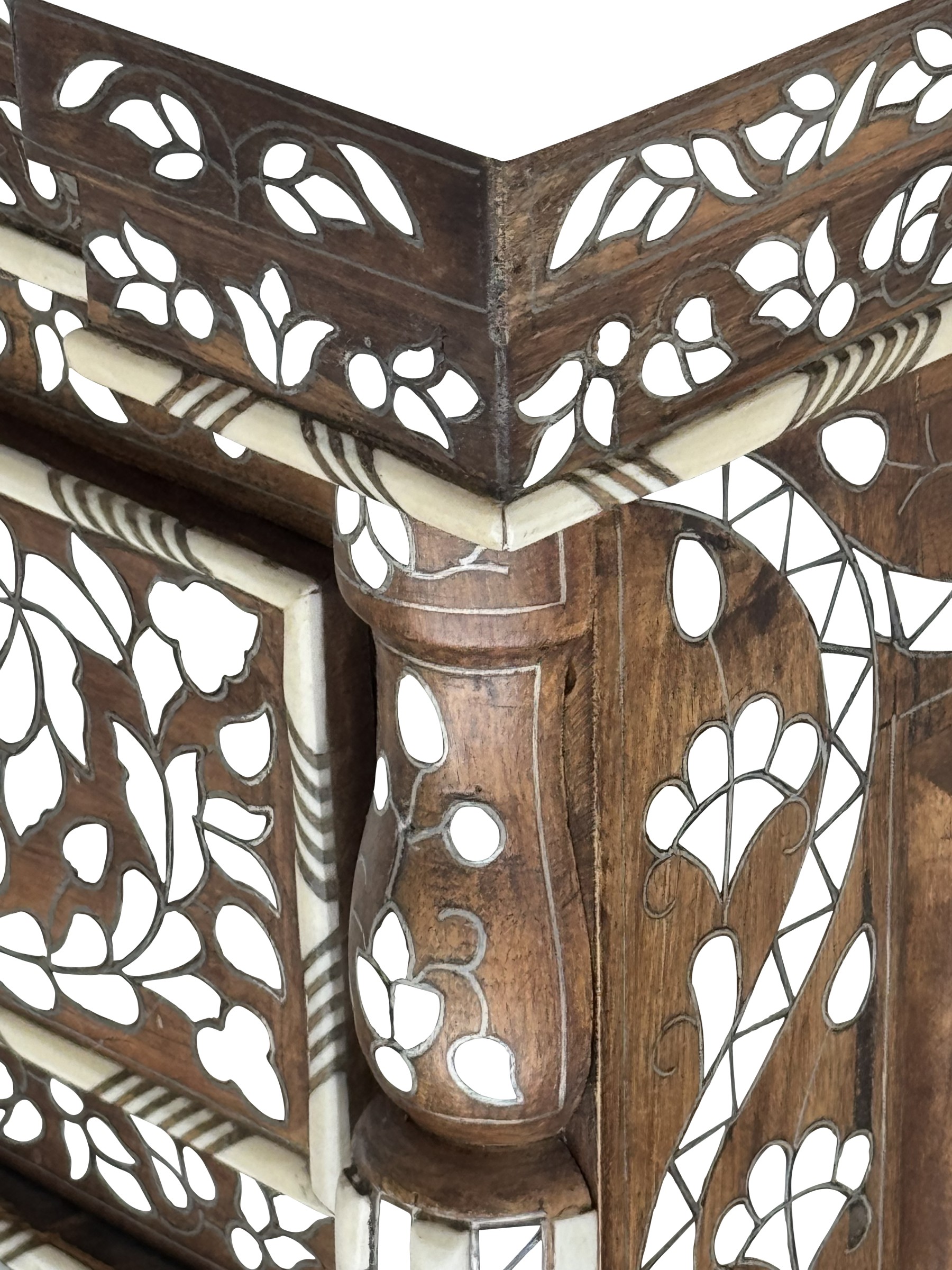 This very special chest is solid wood with a mother of pearl botanical inlay patterning overlay. The top is a beautiful white marble with a subtle brown veining that compliments the wood tones. The drawers have antique style metal pulls. Sophisticated artistry and craftsmanship goes into the detailed botanic pattern on the drawers, top and sides of this delightful chest. Condition in appearance looks almost new - two drawers do not close flush flat and need slight oil adjustment or use as is. The chest comes from a pristine home where it has been excellently maintained - and used decoratively with very lite use. Size 49 L x 23 D x 34.5 H