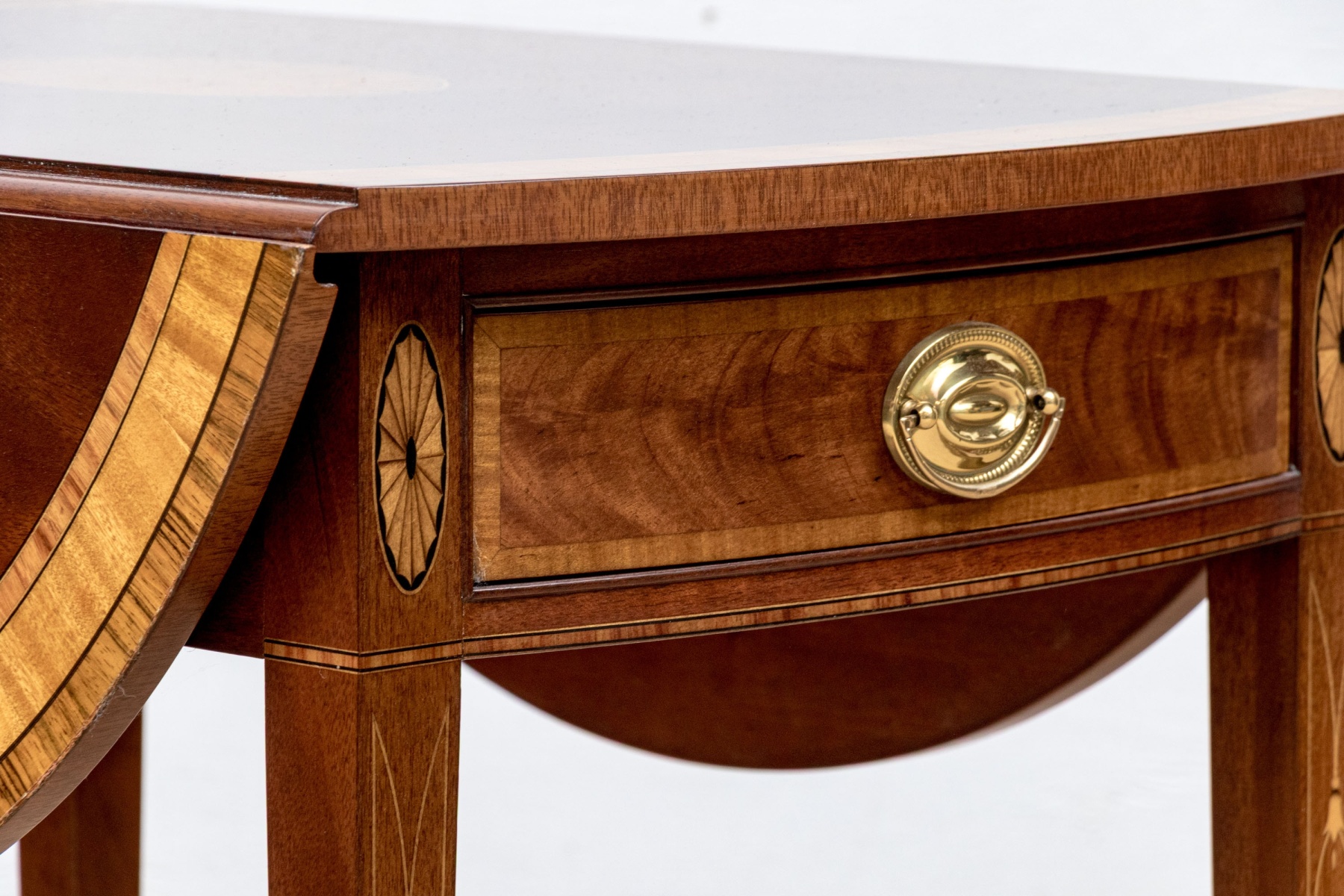 On four square tapered legs with gorgeous inlaid satinwood decoration up the legs. Case with one drawer with oval brass pull. Central oval burled wood veneer with string inlaid trim.