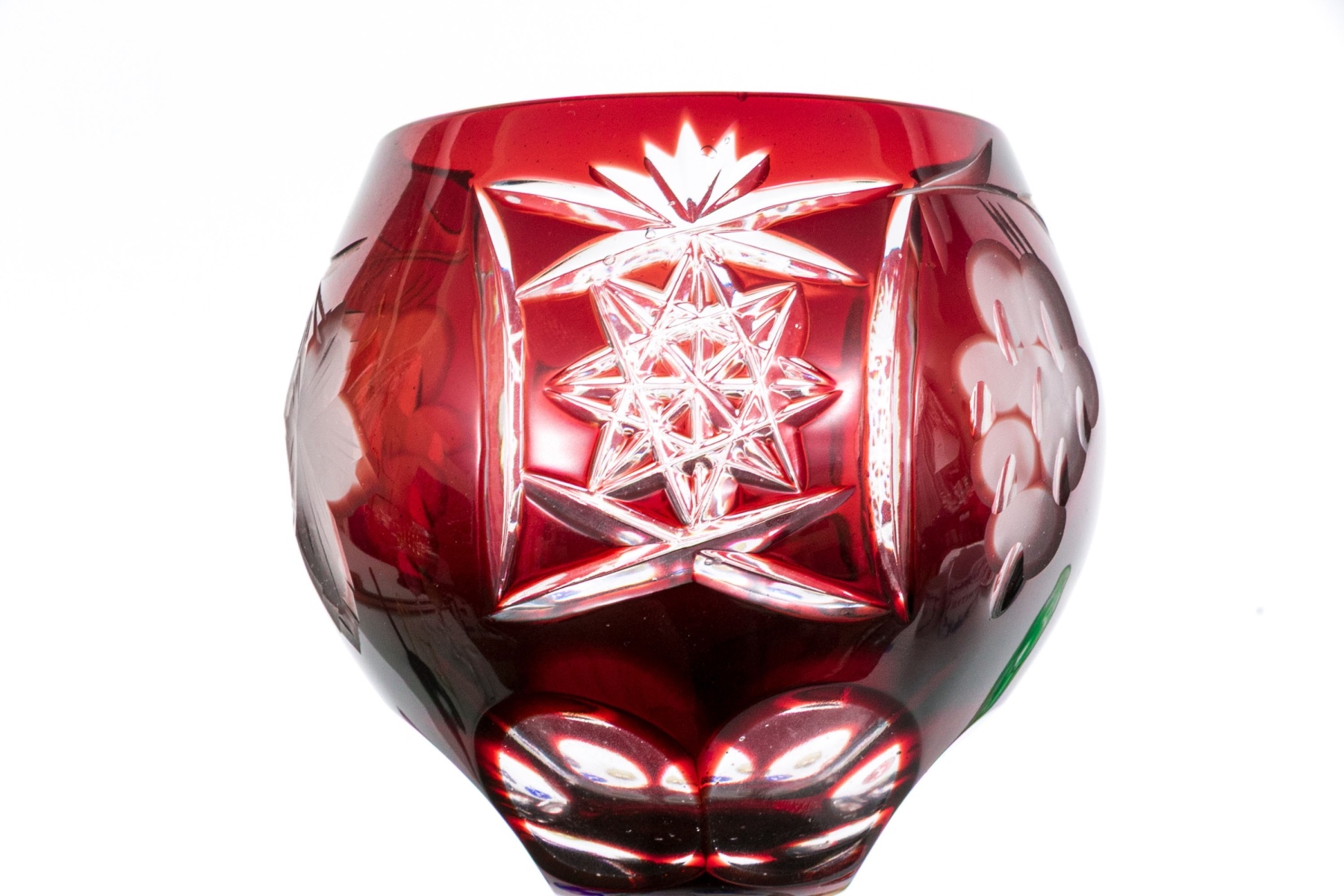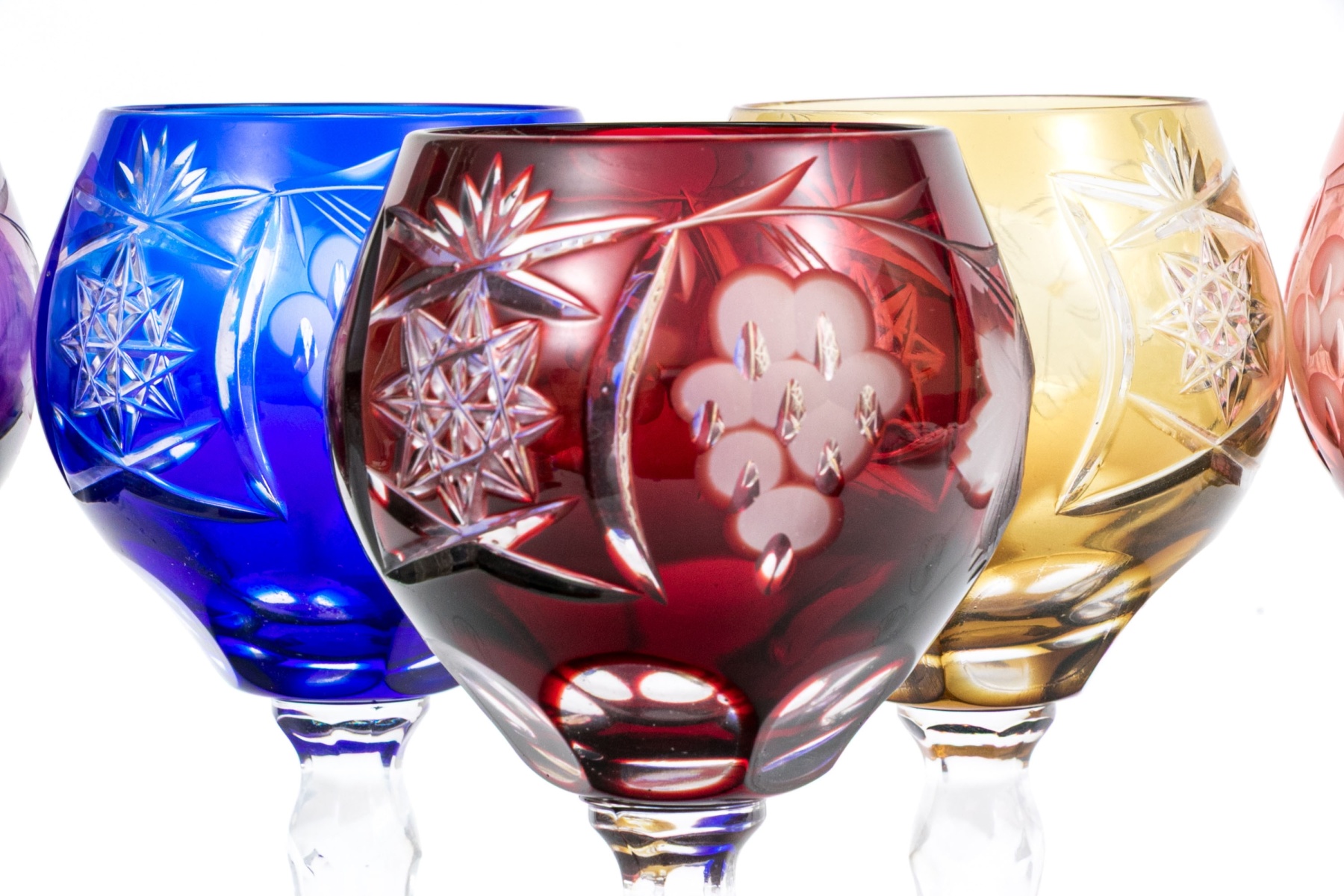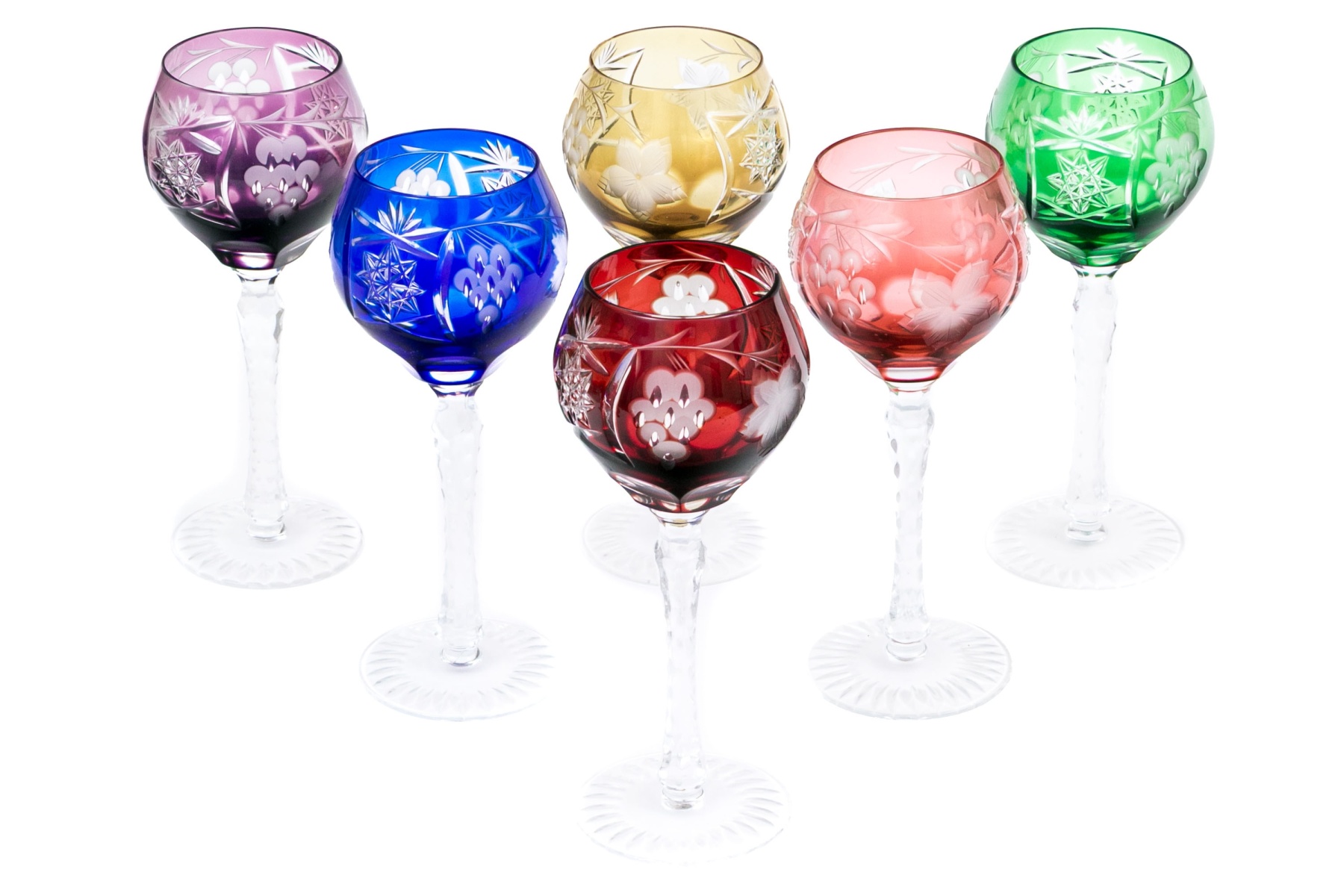 A gorgeous set of six Bohemian style crystal goblets, each with differing colorful hues cut to clear, all with decoration of florals and grape clusters to the bowls, and all stand on elegant translucent stems and foot rings. With colorful casings cut to clear and wonderful optical designs to the stems leading down to circular foot rings.